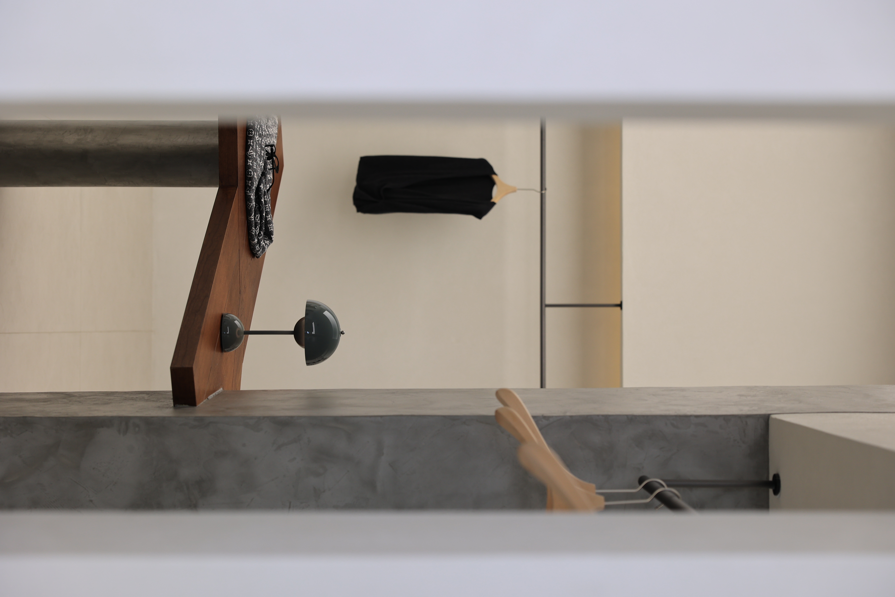 空间意境:灰白色作为本案的主色调,搭配胡桃木色作为点缀,使整个空间具有理性的、高级的商业氛围,内部通过半高隔断围合的形式,打造出自然的客流动线和空间界线,既解决了进店一览无余的问题,又丰富了空间层次,隔断在保证美观的同时,也让空间和空间之间产生了互动。