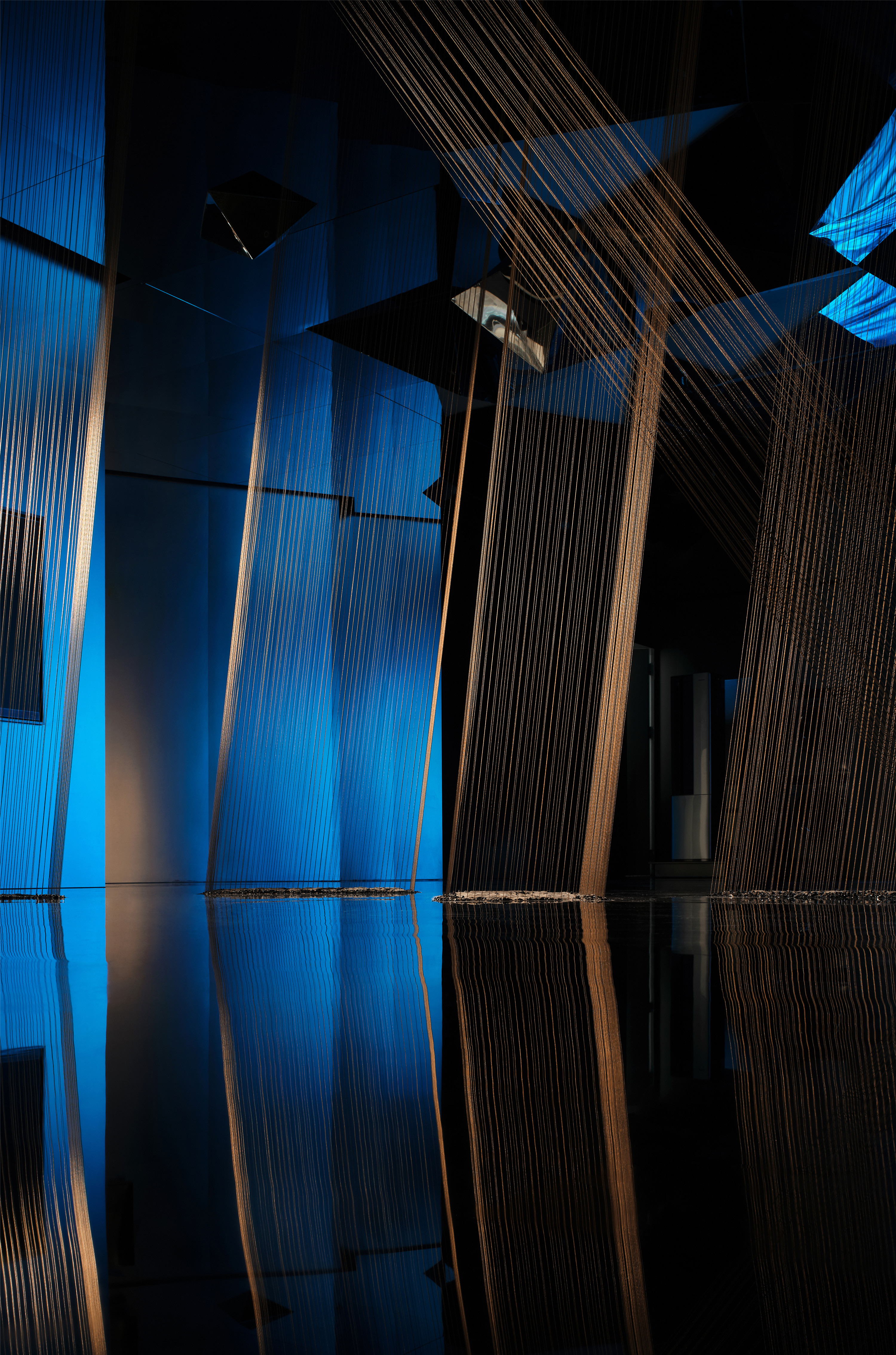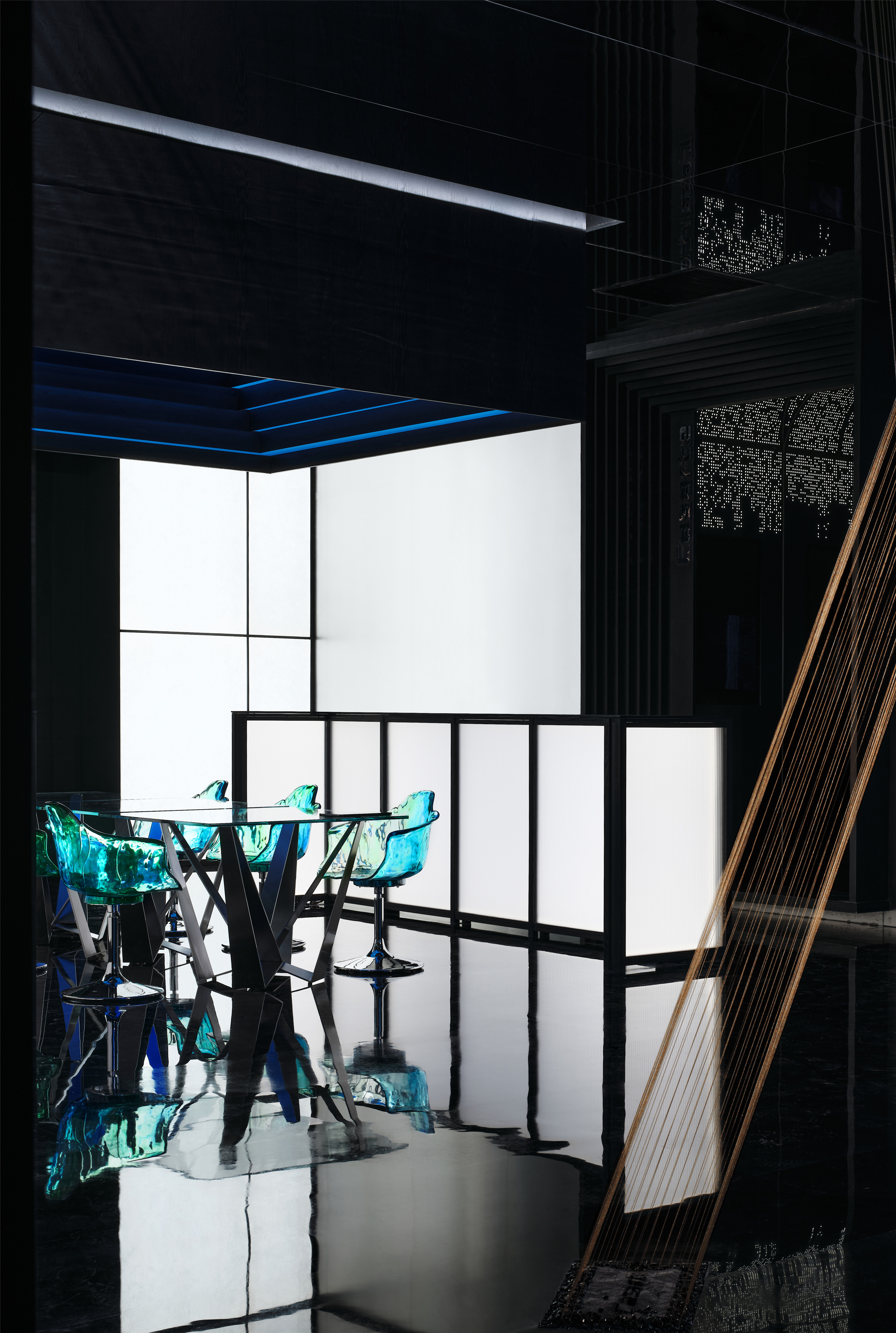 设计选材:未来感科技感以及艺术性的需求,空间有多层次,变幻多的需求,因此材料选择中镜面不锈钢天花的设计和黑色高抛光大理石地面的选择让空间在纵深和延伸方面都有了极好的表现,同时对光的折射起到了梦幻的效果。冰珀板与灯光的结合增加了暗黑色照明多层次的要求,以及似透非透的界面带着典型的东方审美色彩。