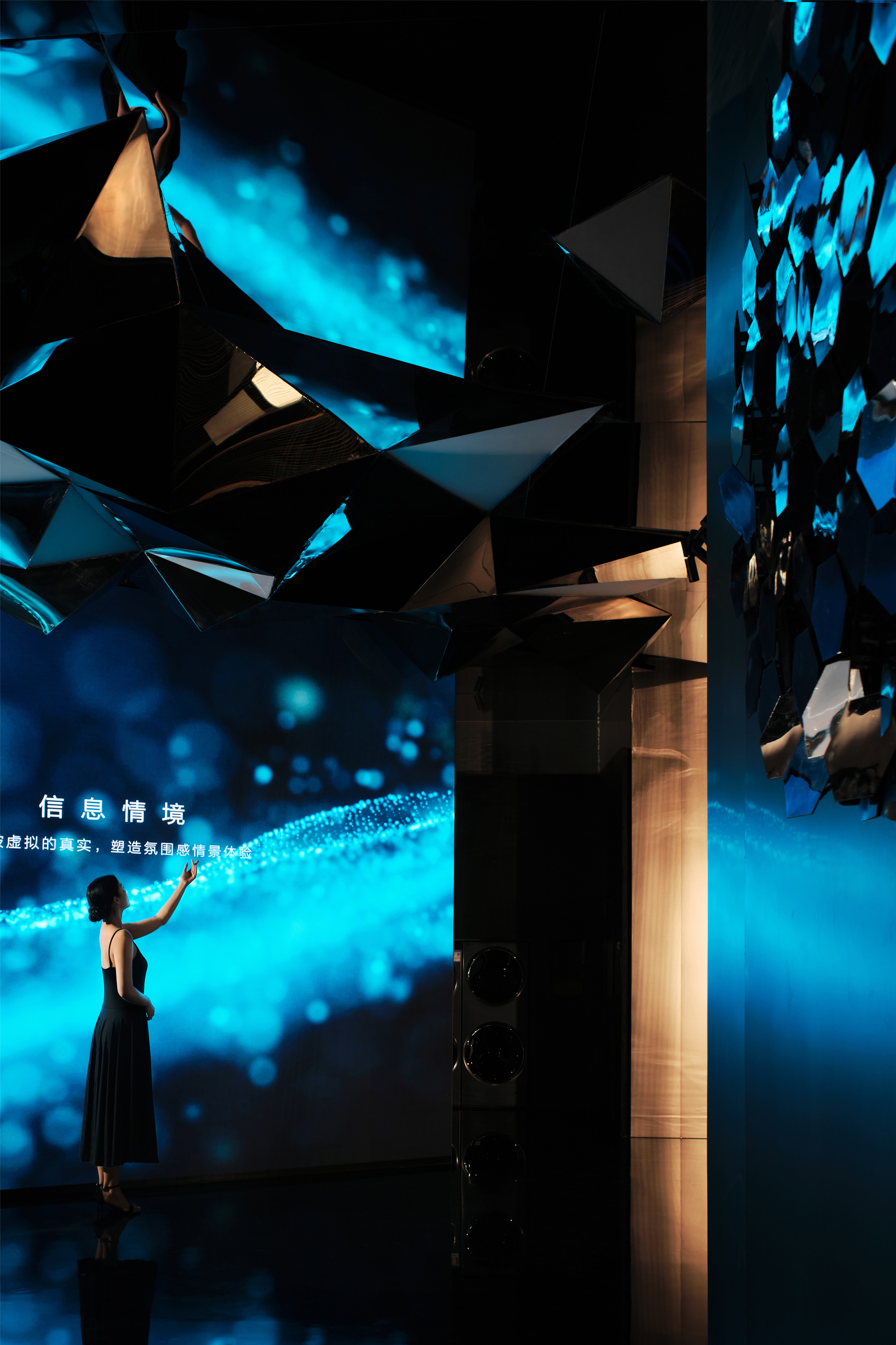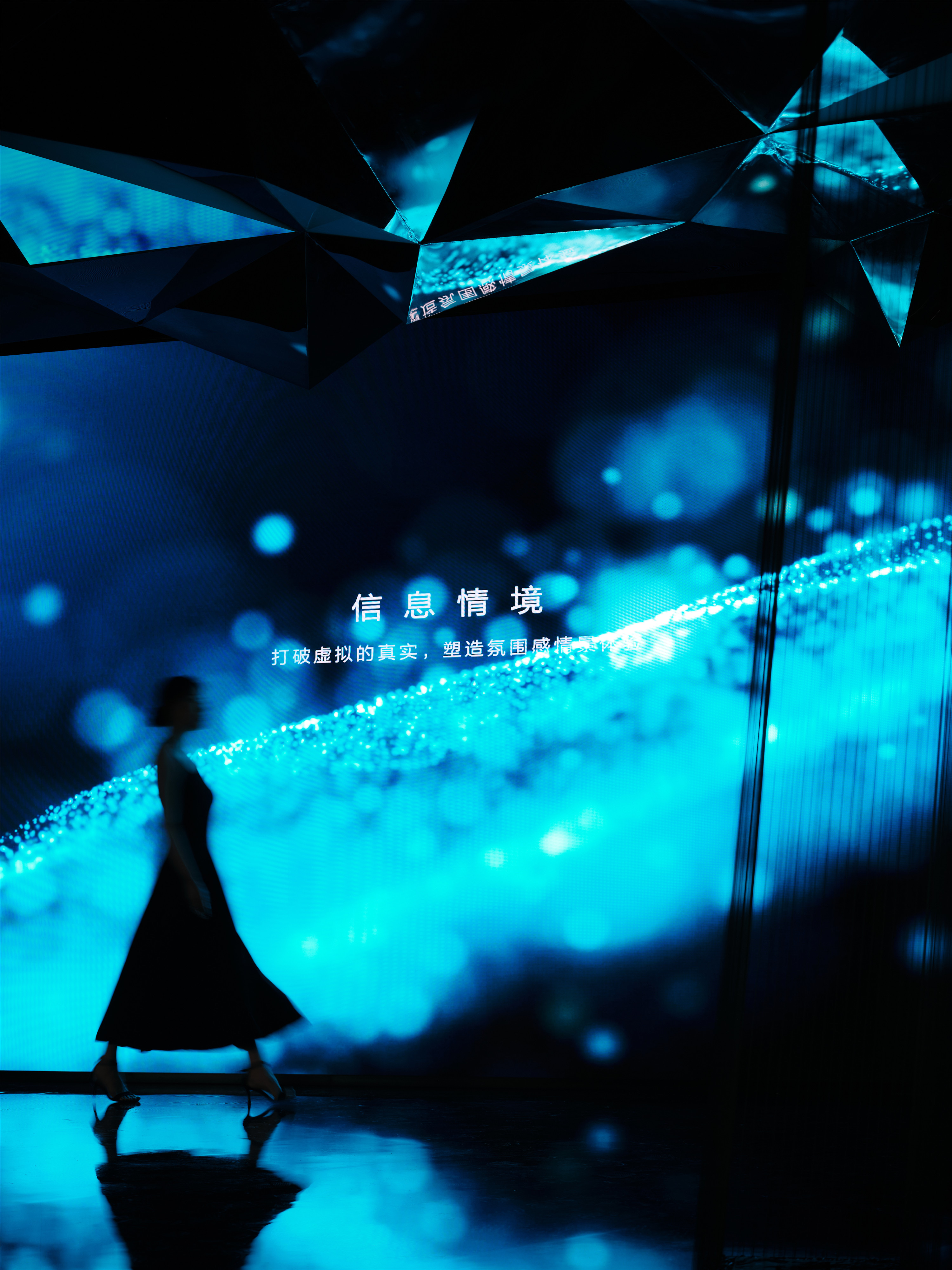 空间意境:本案因外部环境为全新打造的艺术类街区,因此艺术中心内部因卡萨帝艺术家电的本身特点紧扣艺术和科技来表达空间的气质,通过光影视频内容的变幻而塑造完全不同的氛围环境。