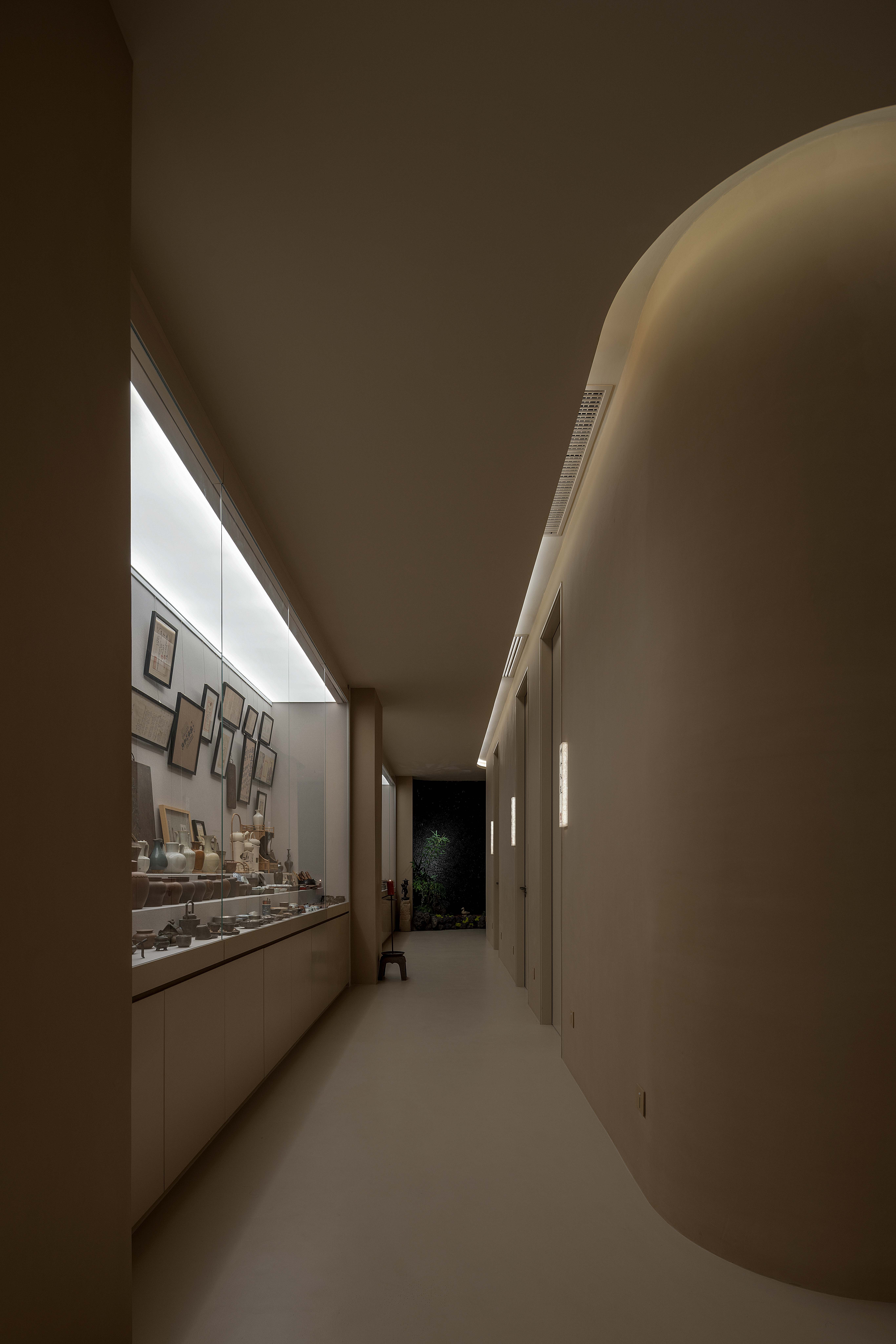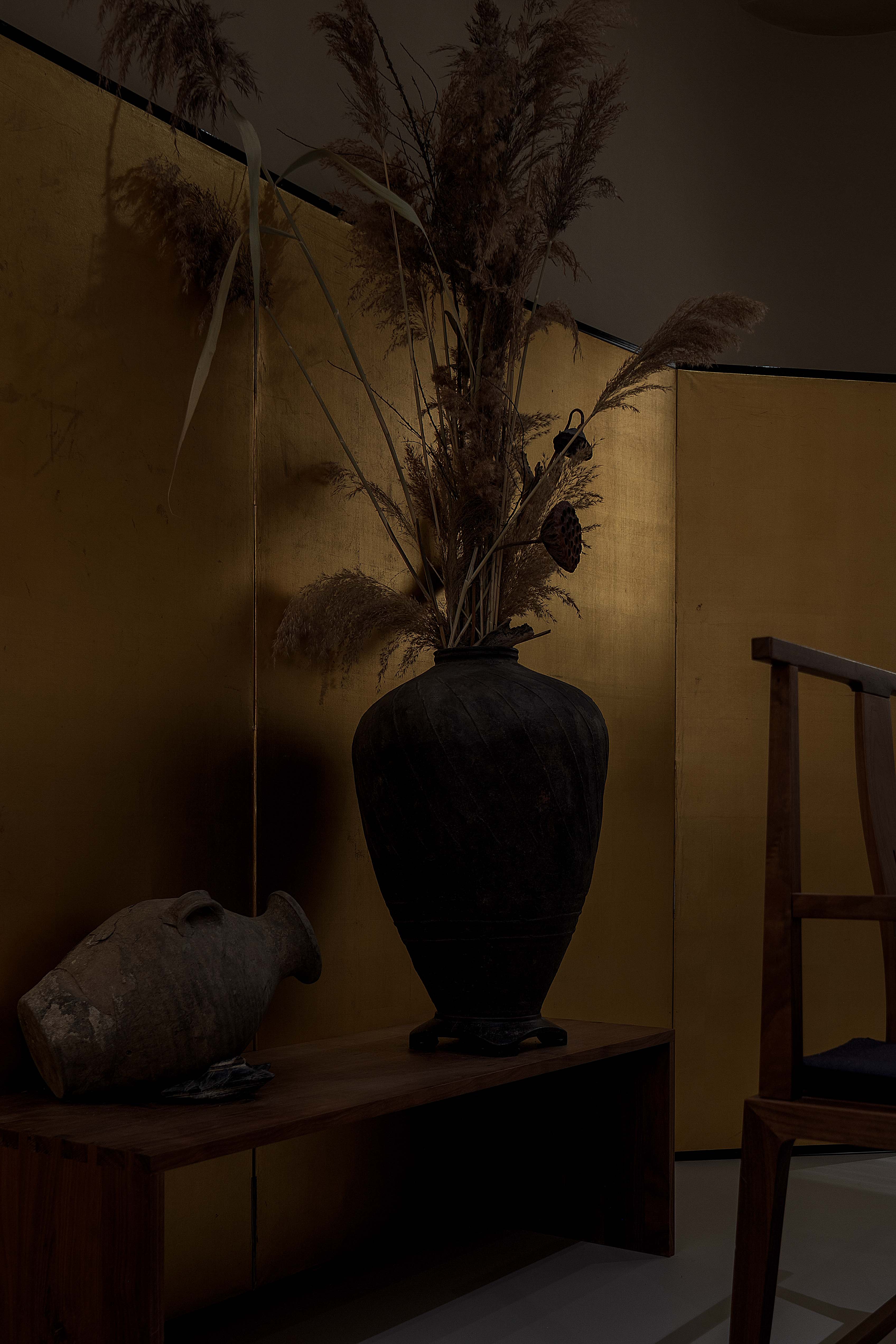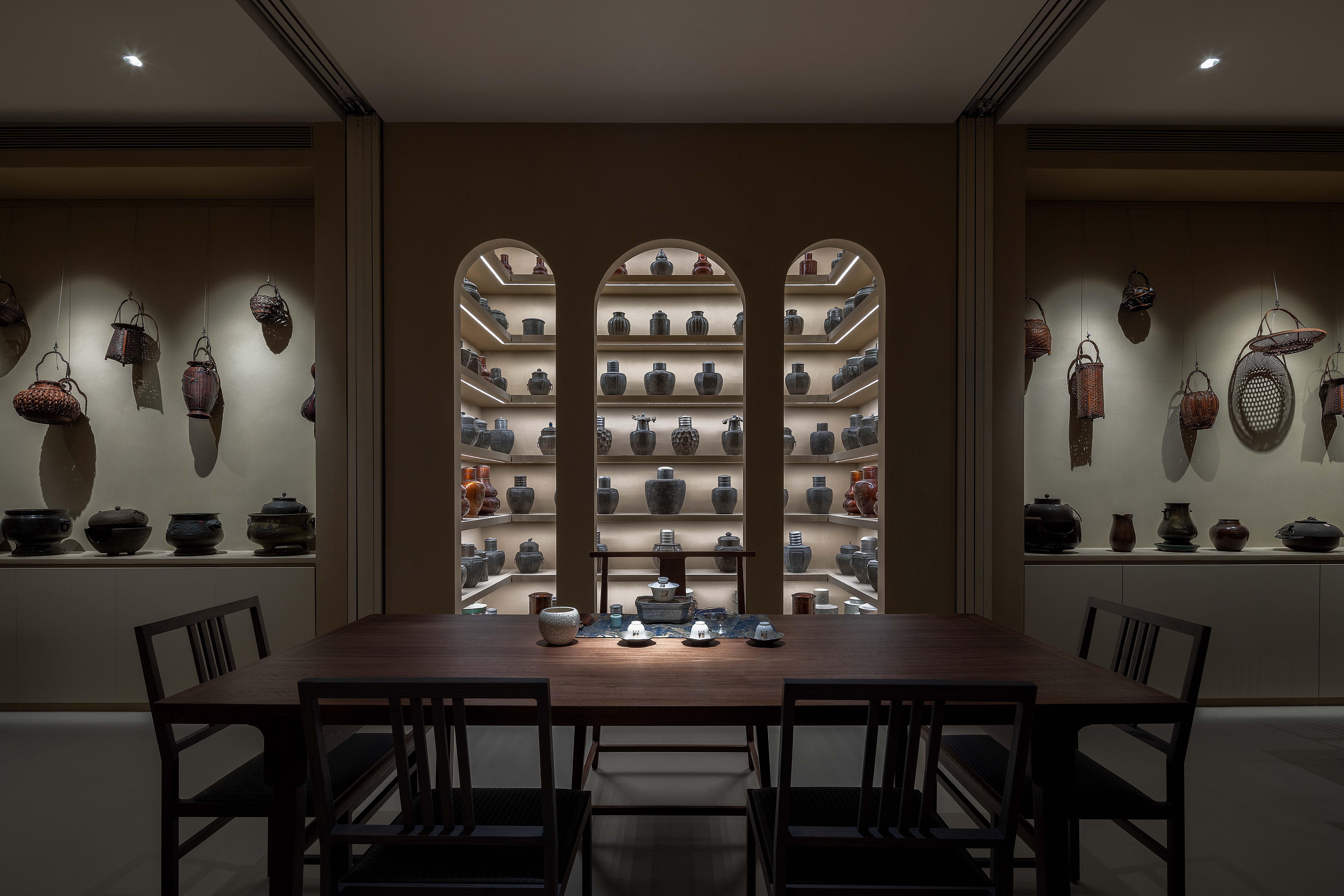 器物是有温度的,随着岁月的流逝,每个老物件都有自己的独有的温度与时间的痕迹,创造一个合适的空间,把甲方的收藏器物放置其中,展现出器物之美,当看到这些老物件的时候,对于设计师而言,设计师打造空间的初心是应该退设计化,尽可能的去弱化空间本身存在的结构落差,而是让整个空间更连贯、自然。让器物在合适的空间中体现本身的美感。器、物与环境的相融合,营造整体的寂静美感。在整体的色调寻找能代表西北的在地色彩--大地色,也是莫高窟里的壁画里的颜色,整个场域的色调是个暖色的基调,让来到这个空间的客人能感受到场域的温度,加上各个老器物的年代感所散发出来的温度,二者