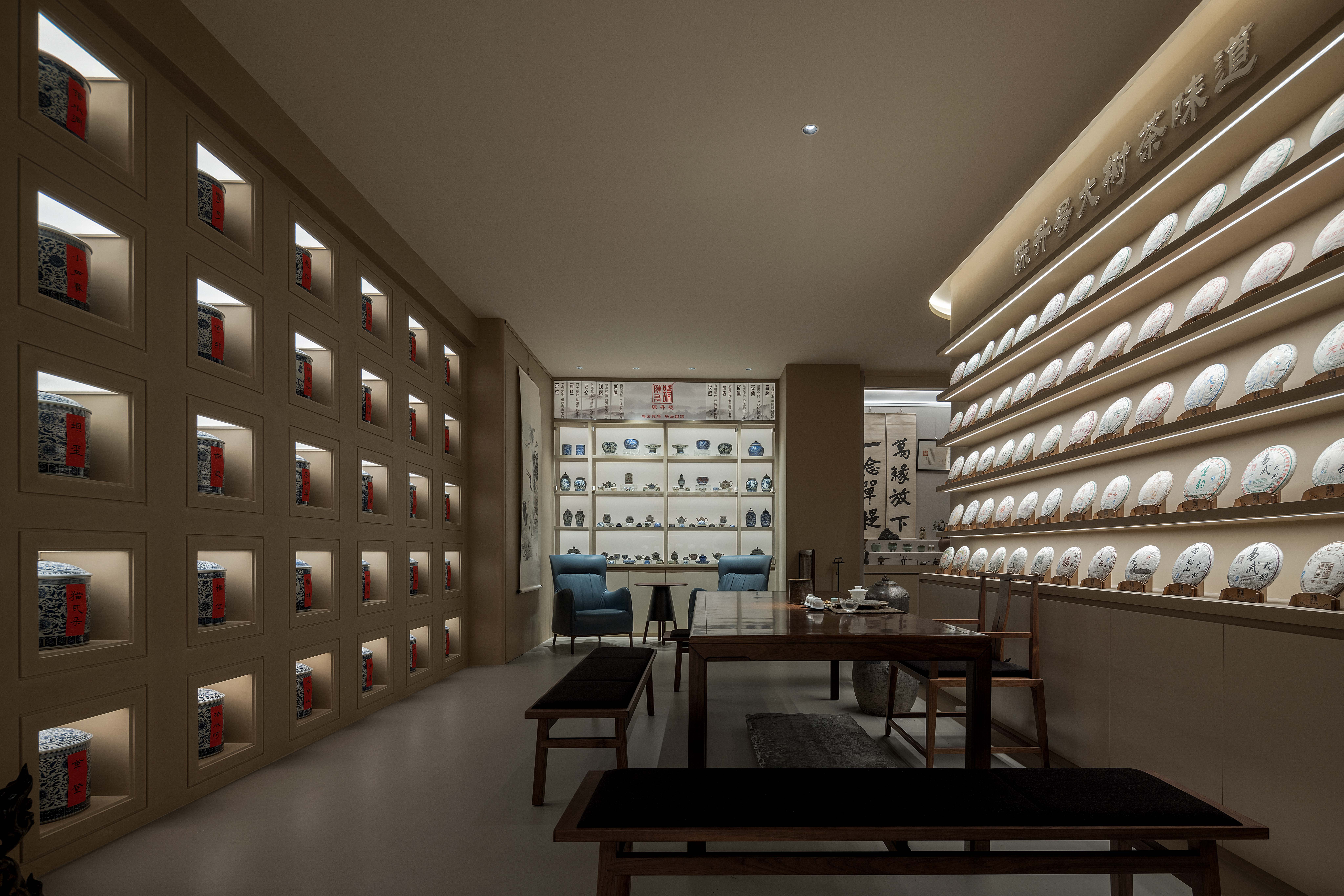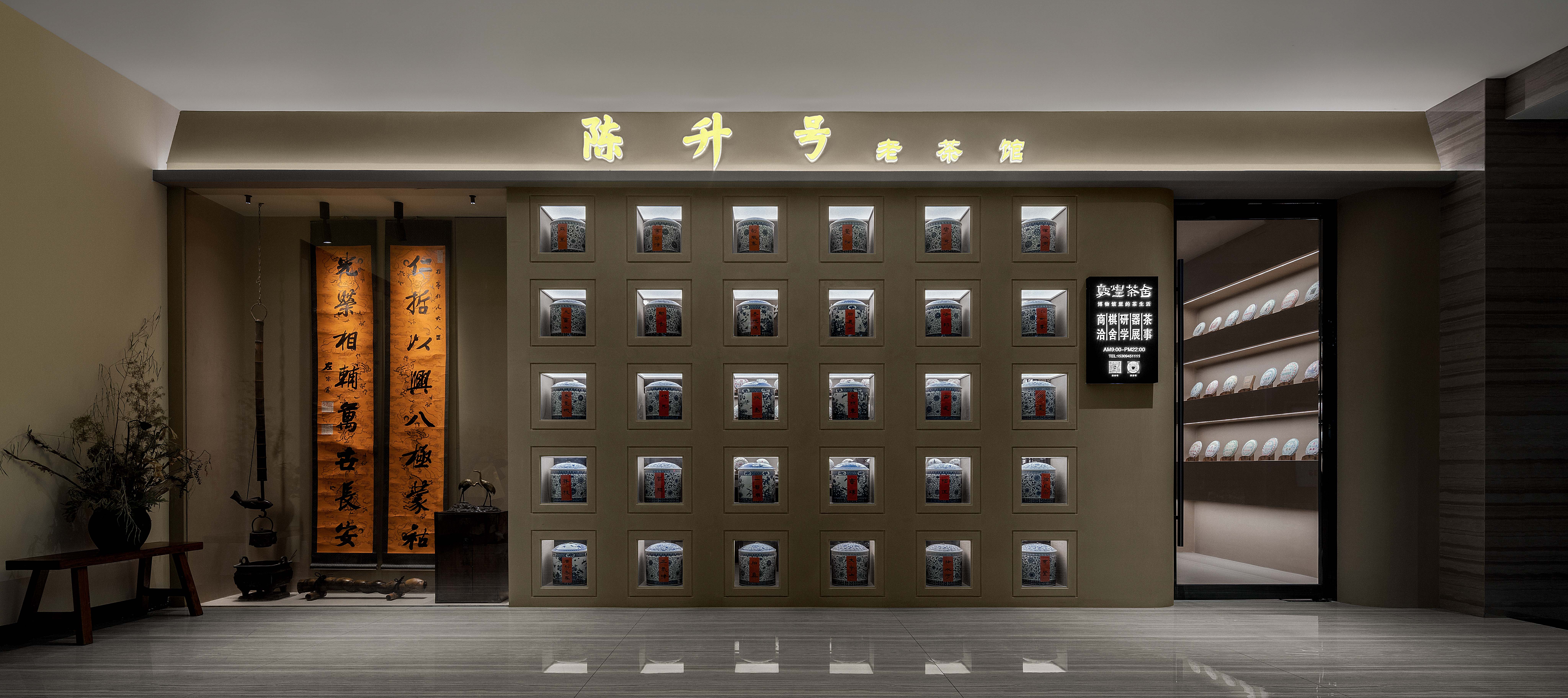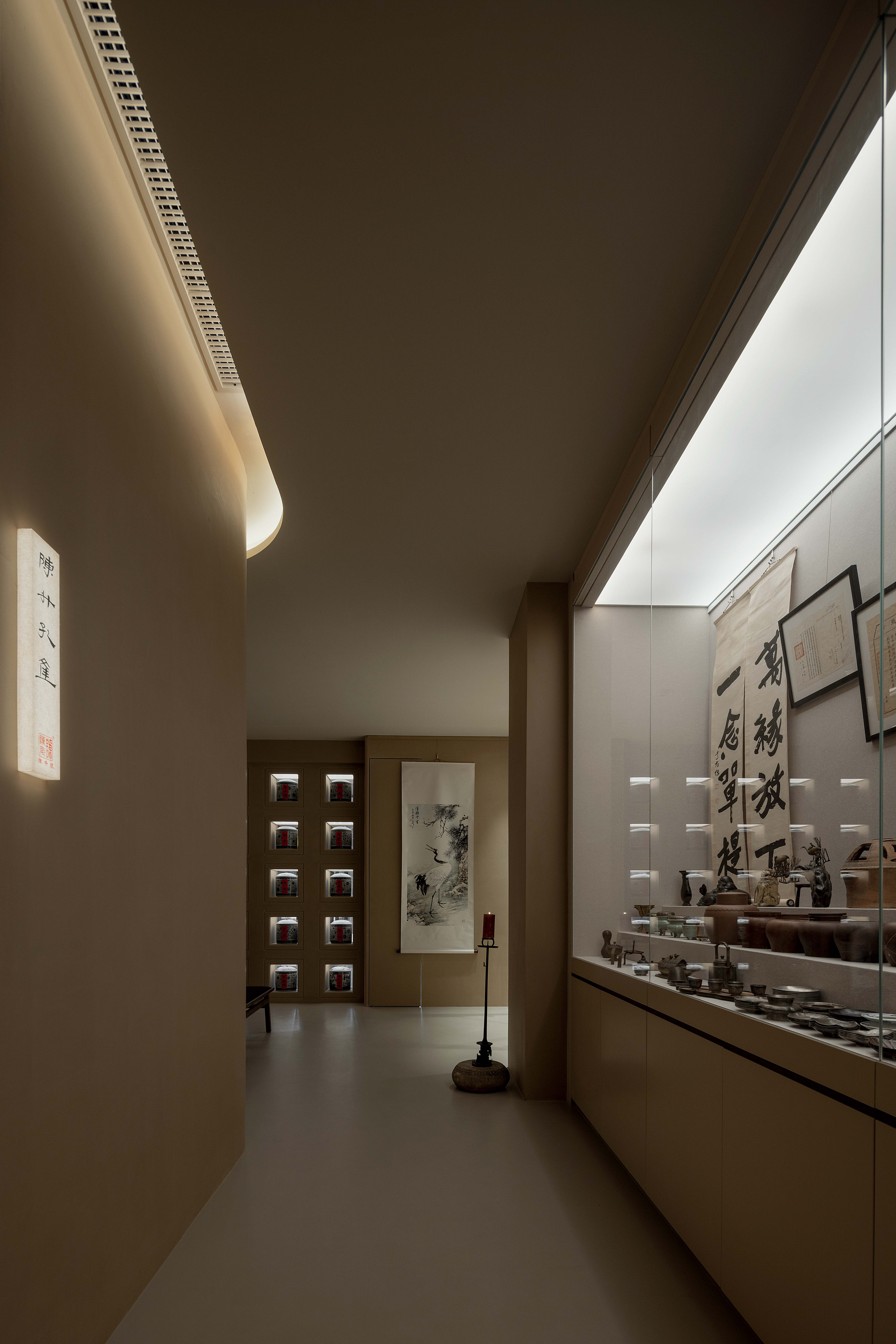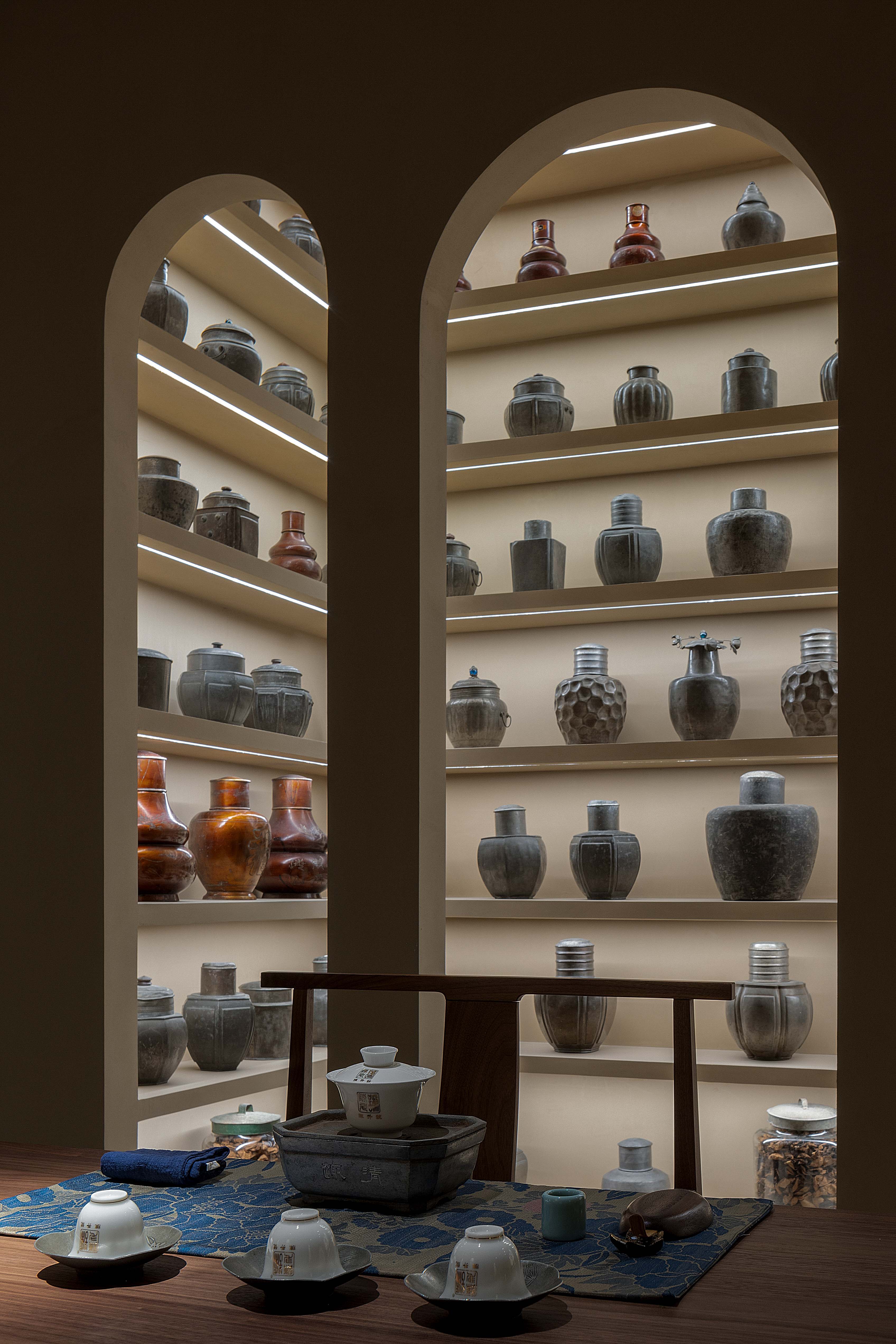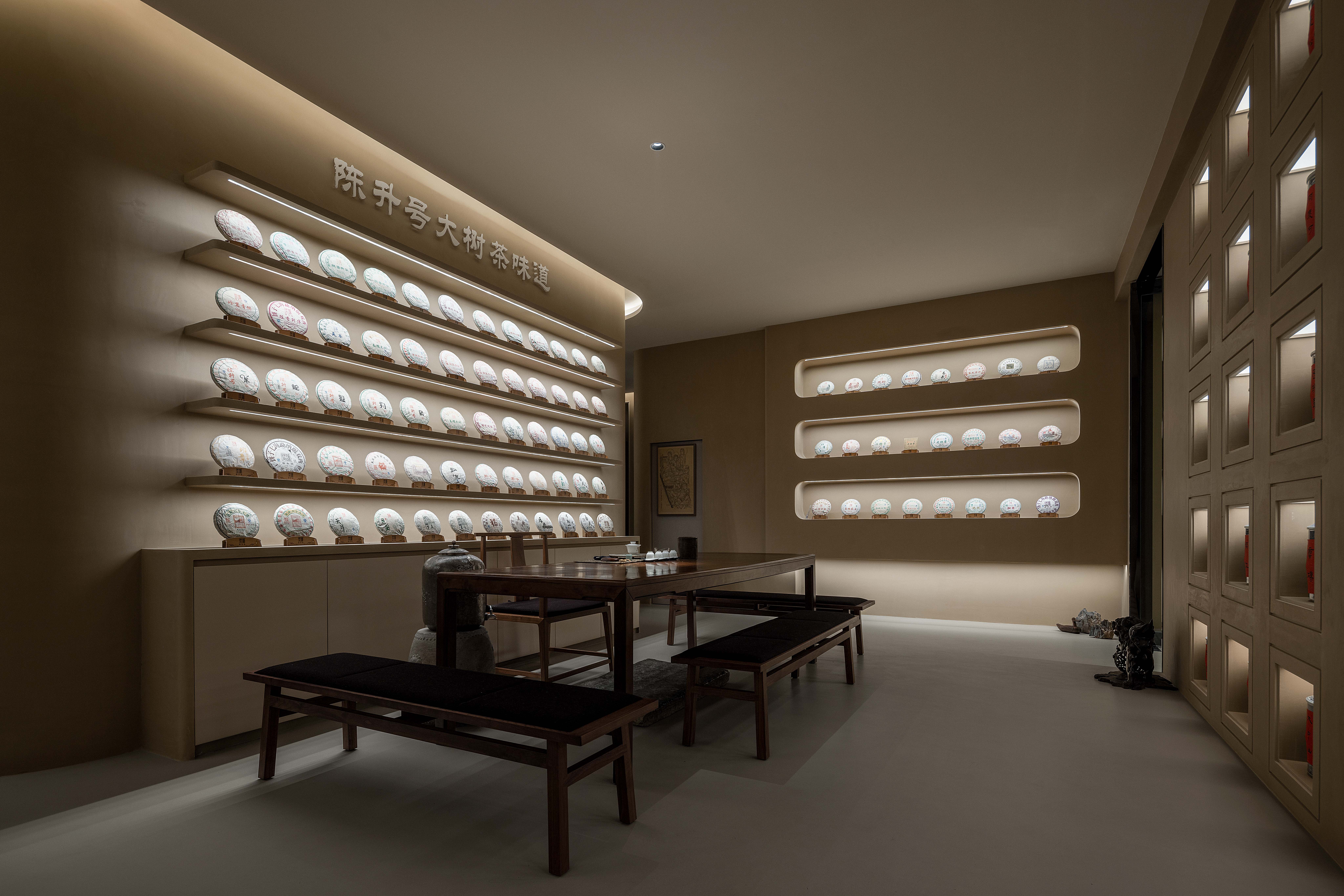 甲方是兰州市陈升号的代理商,做的是品牌茶以及高端茶器。在多年的经营当中,甲方收集了诸多的有关茶的茶道具器皿,多是一些老物件,可以说每件器物都 有甲方的心血在里面。由此我定位为这个有关茶的空间是博物馆里的茶生活,以器做设计,把甲方多年的收藏品和陈升号的品牌产品在一个合适的空间里,合适的位置给展示出来.