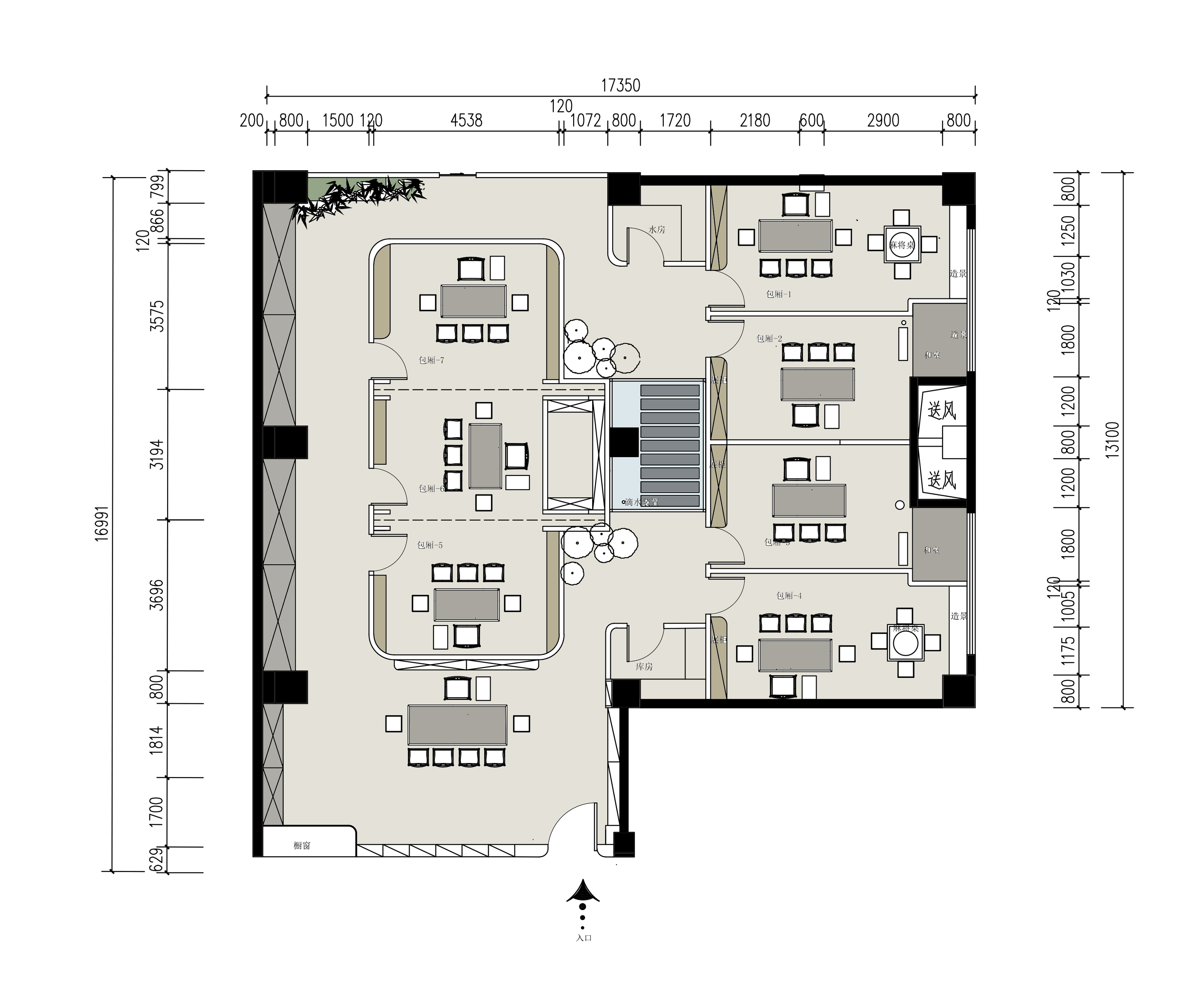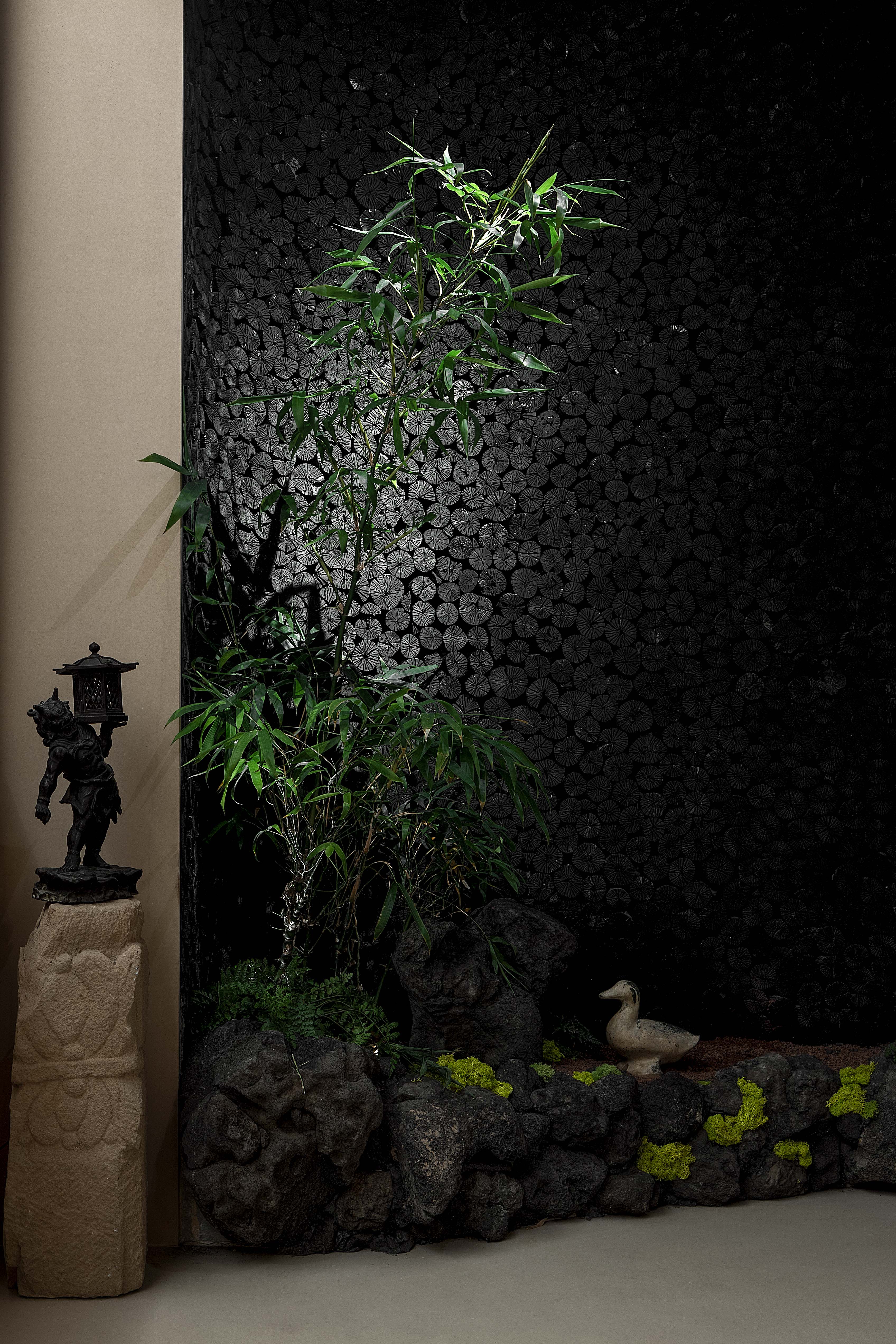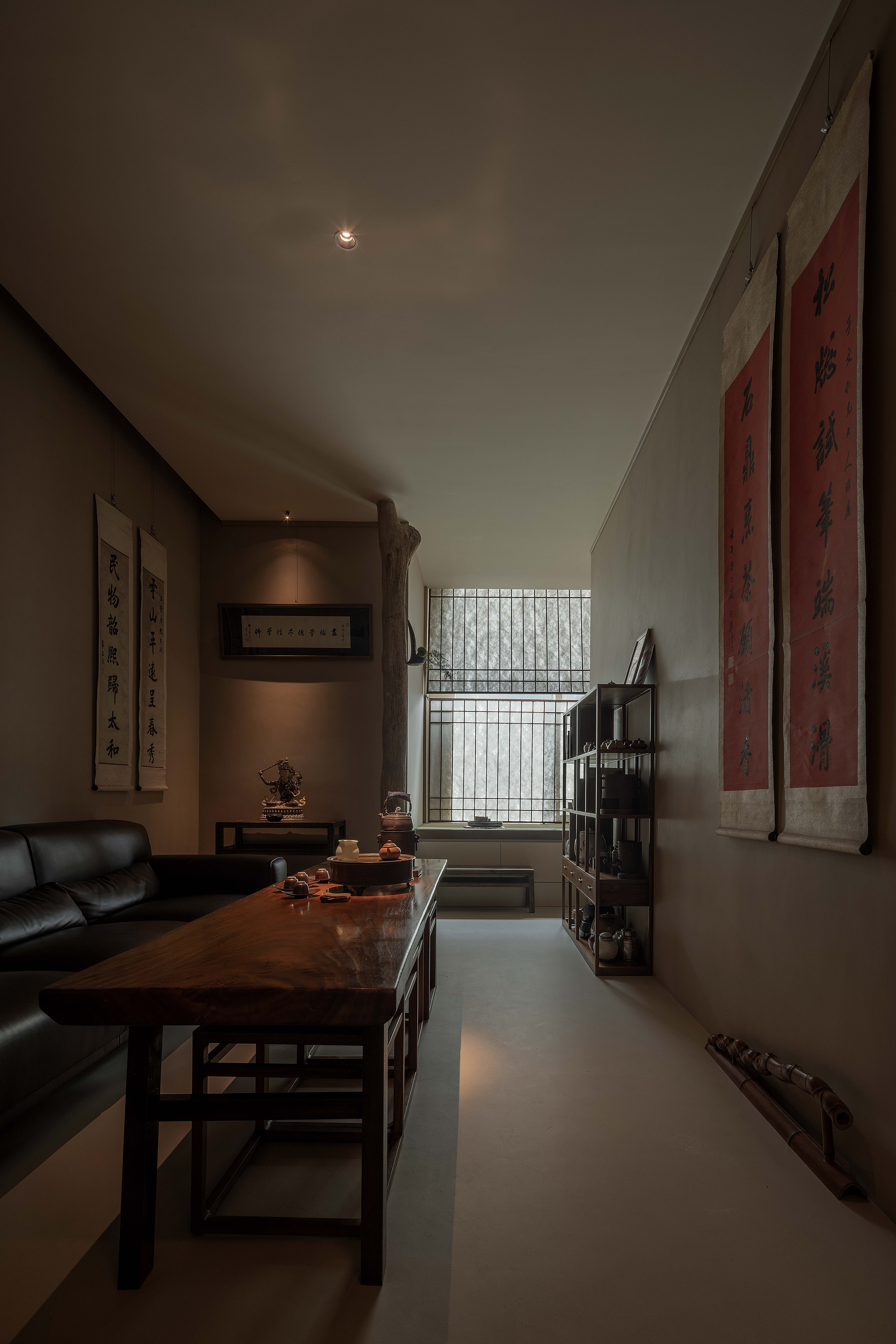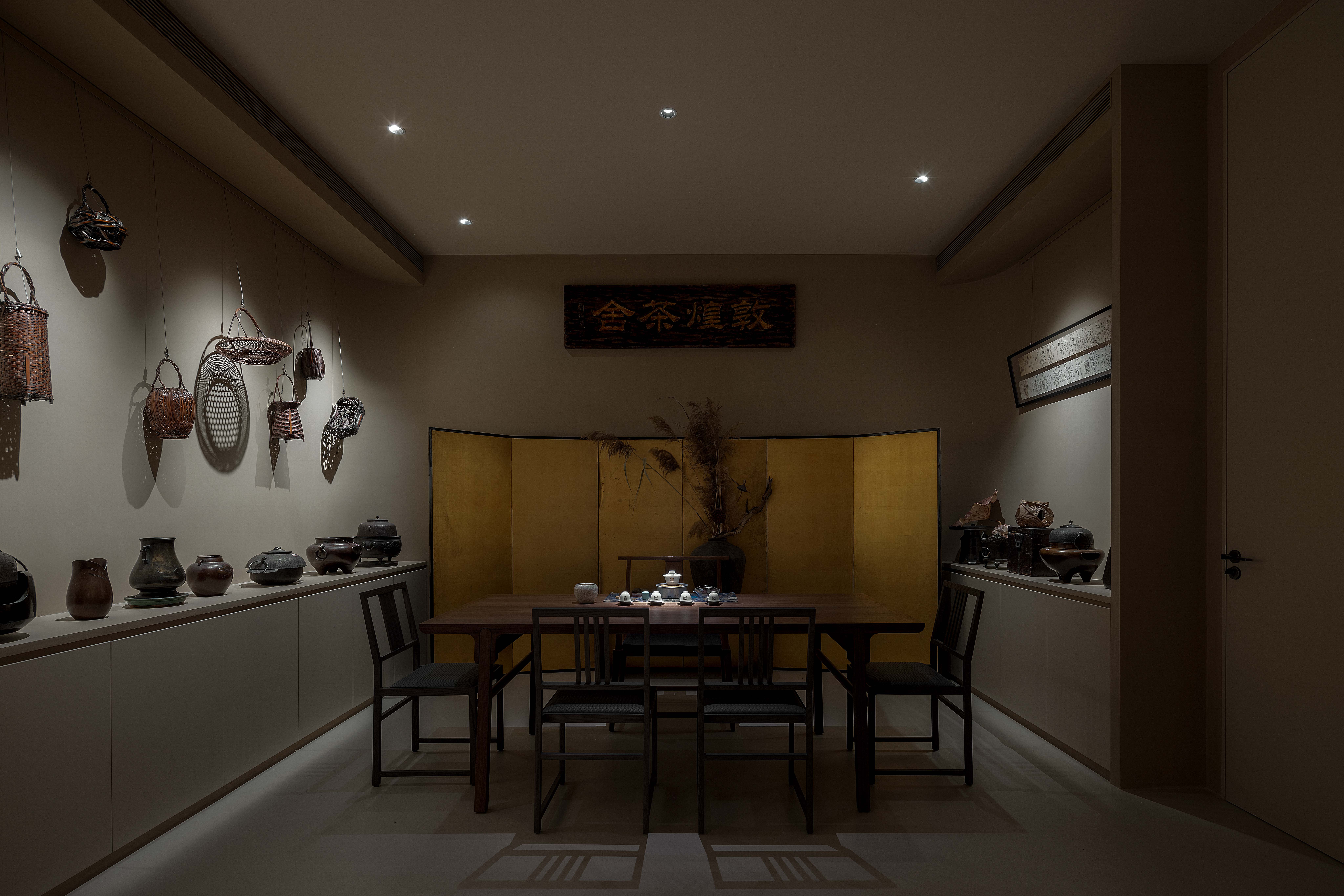 平面布局的设计上做了一个中心大循环的设计,运用园林的设计,一步一景,特制的菊花碳的绿植墙的设计以及水景的让空间的节奏感从进入这个空间的那刻起就有不同的空间带给客人不同的观景感受。商业空间的设计,本着创造最大商业利益的方向,总体设计了7个包厢,以清茶为主要的卖点。为了空间的纯粹性,隐藏了开关,空调,新风,强排系统的出风口,使得整个空间纯粹干净。并且整个灯光的设计也是特别的克制,体现出简约的空间感。步入大厅,寻迹而逐步深入产品展示、茶文化器物展示、包厢与大厅的茶空间融为一体。保持商品的独立性,又不失空间服务于人的本质。展示的产品以序