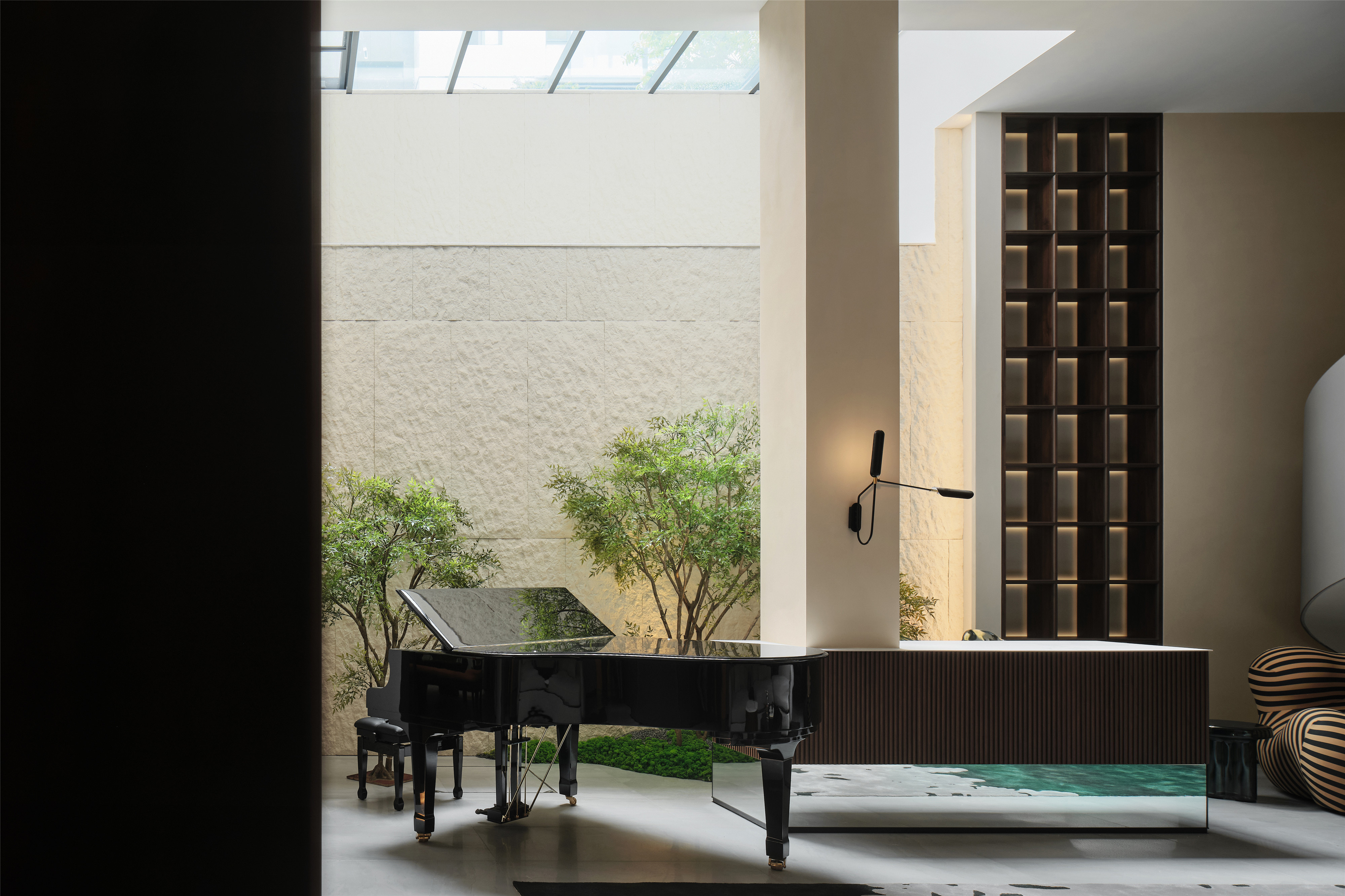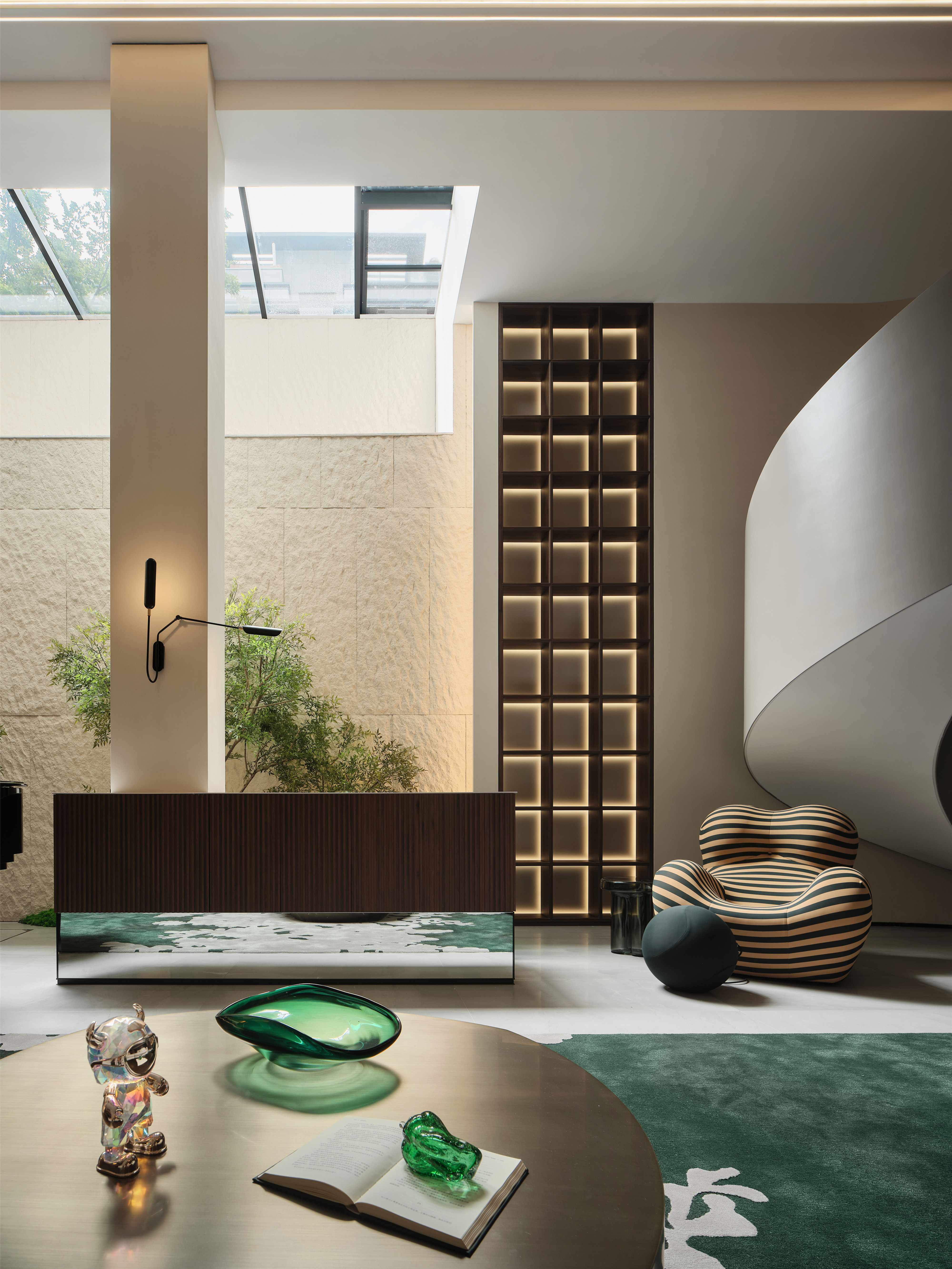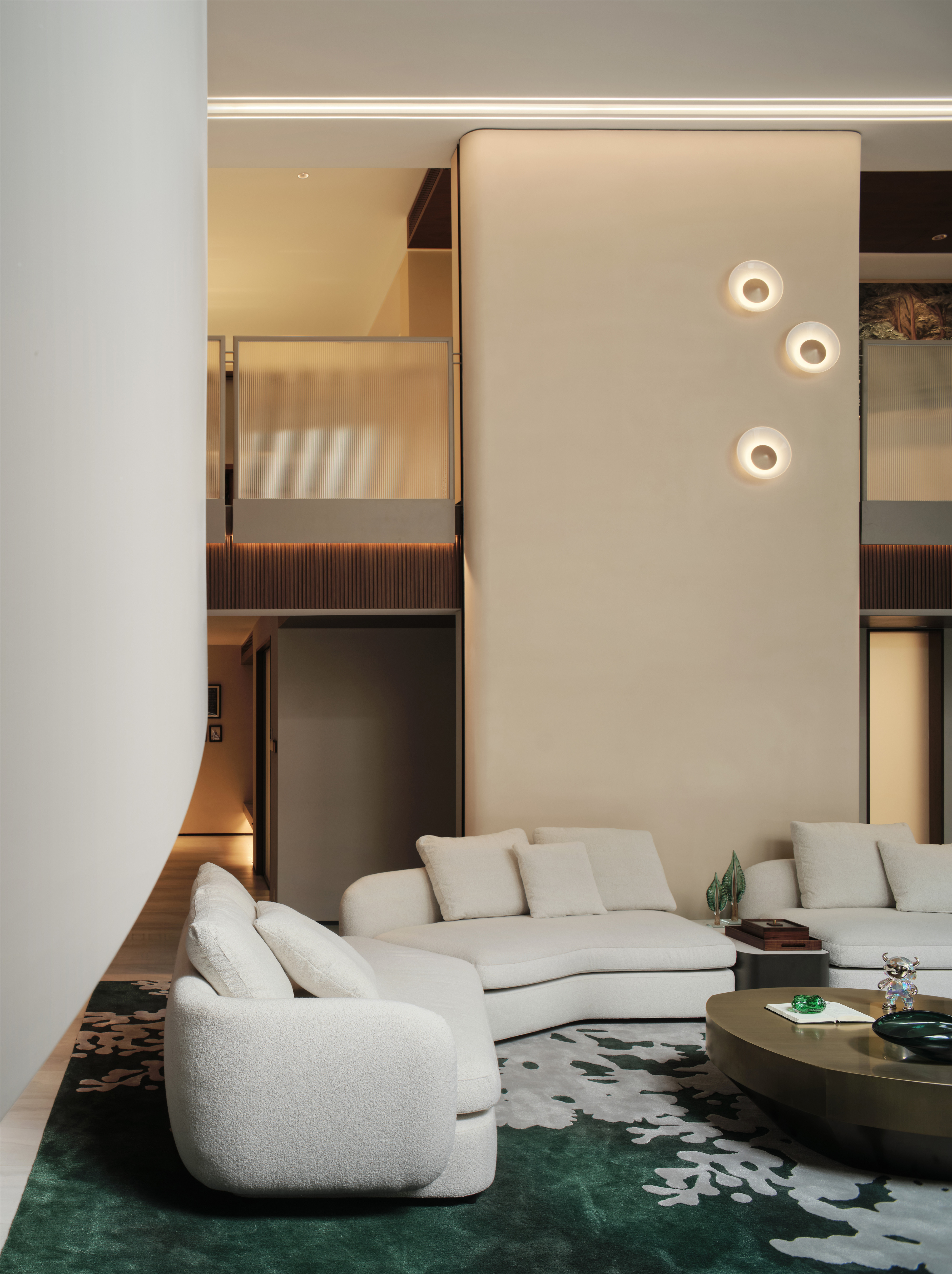 项目定位:本案是一处一层精装修叠墅,地下部分为毛坯,地下面积高达400平米,因此我们在项目设计中将采光和自然当做了全案的重点。