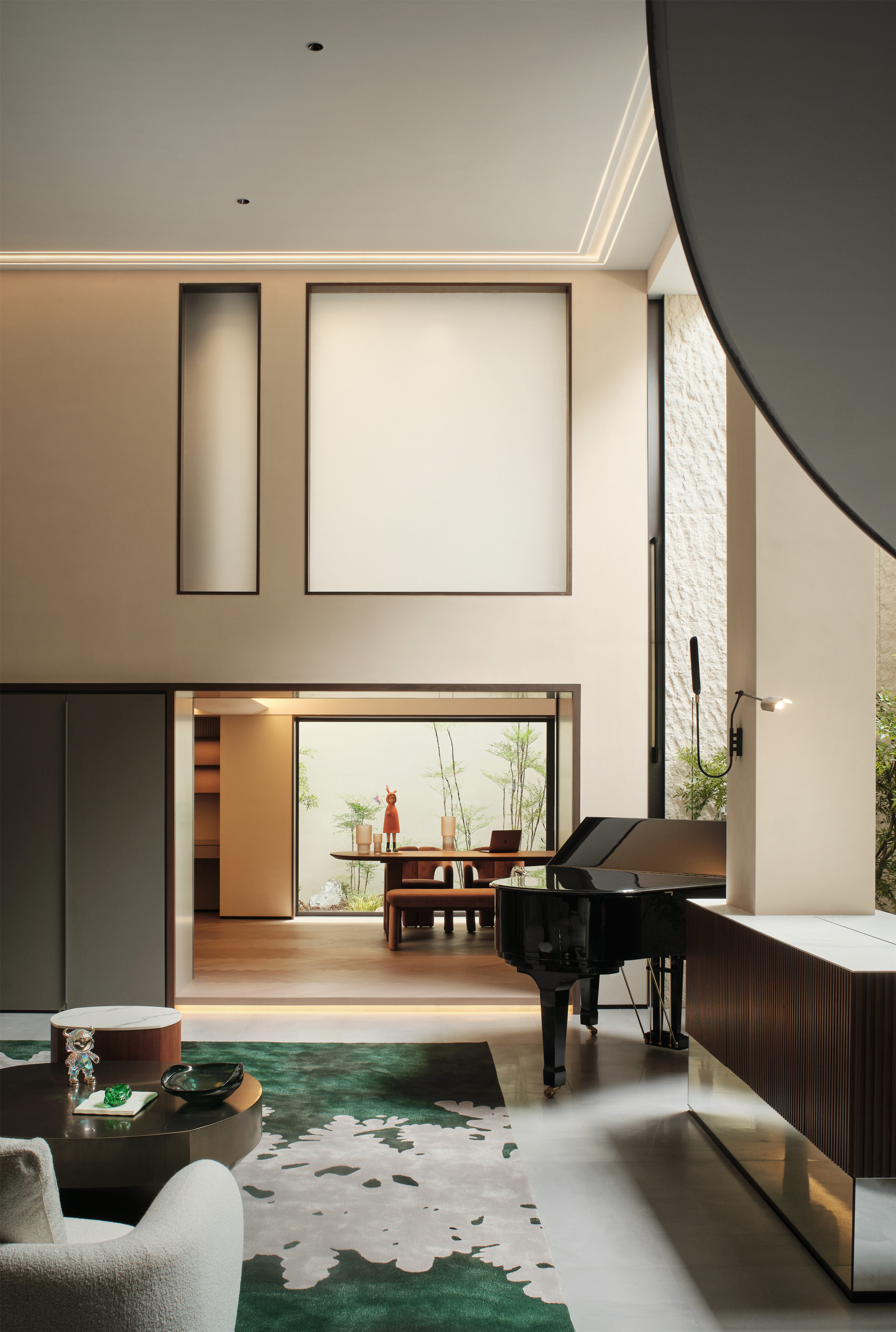 空间布局:空间布局上一方面为了满足大家庭功能独立的使用,同时也需要满足整体接近700平米空间应有的公共空间,同时子女的教育以及学习习惯氛围的养成和营造也是空间中不可回避的问题,因此80平米的挑高空间将整个空间连通起来,光和空气的互济共享,让原本的缺陷不再明显,天井侧壁的下压增大了整个空间的受光面。