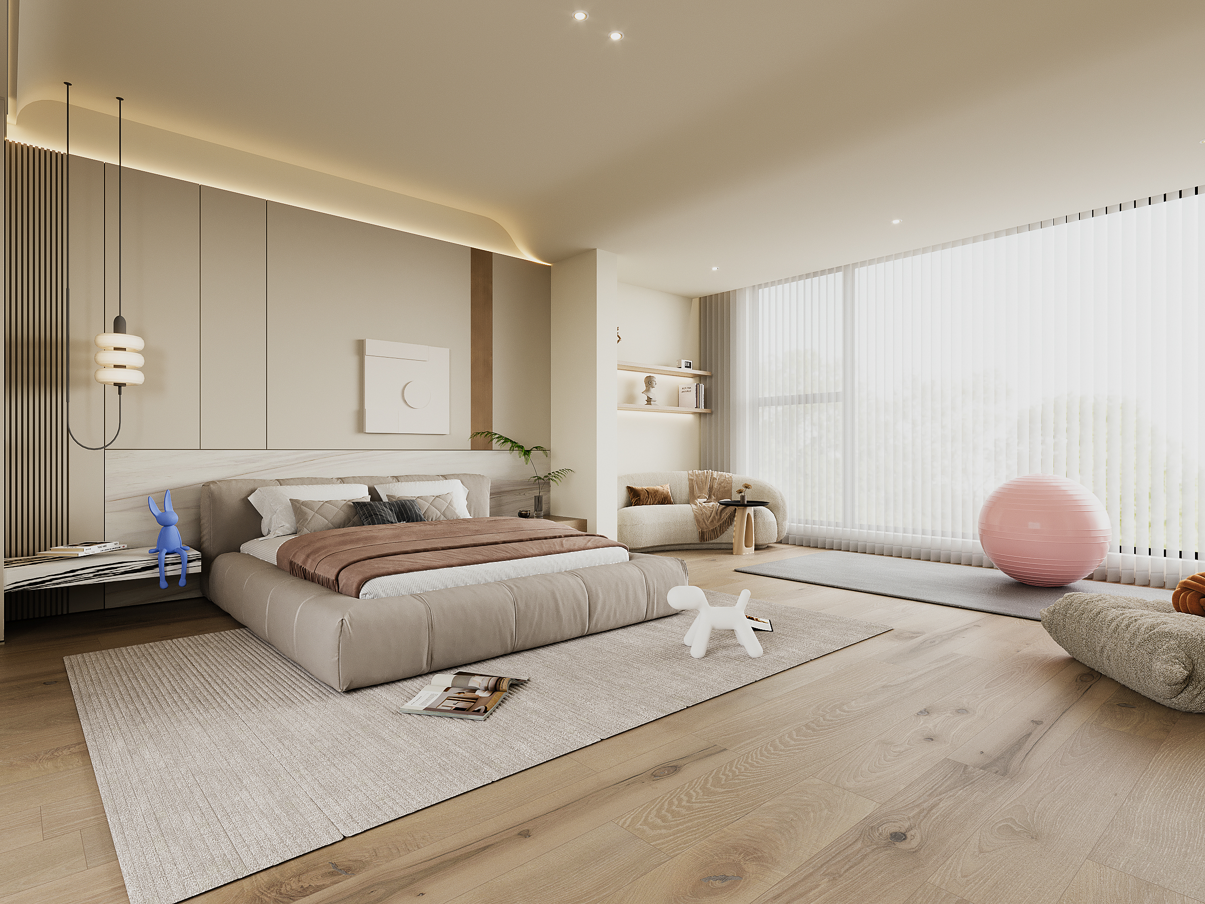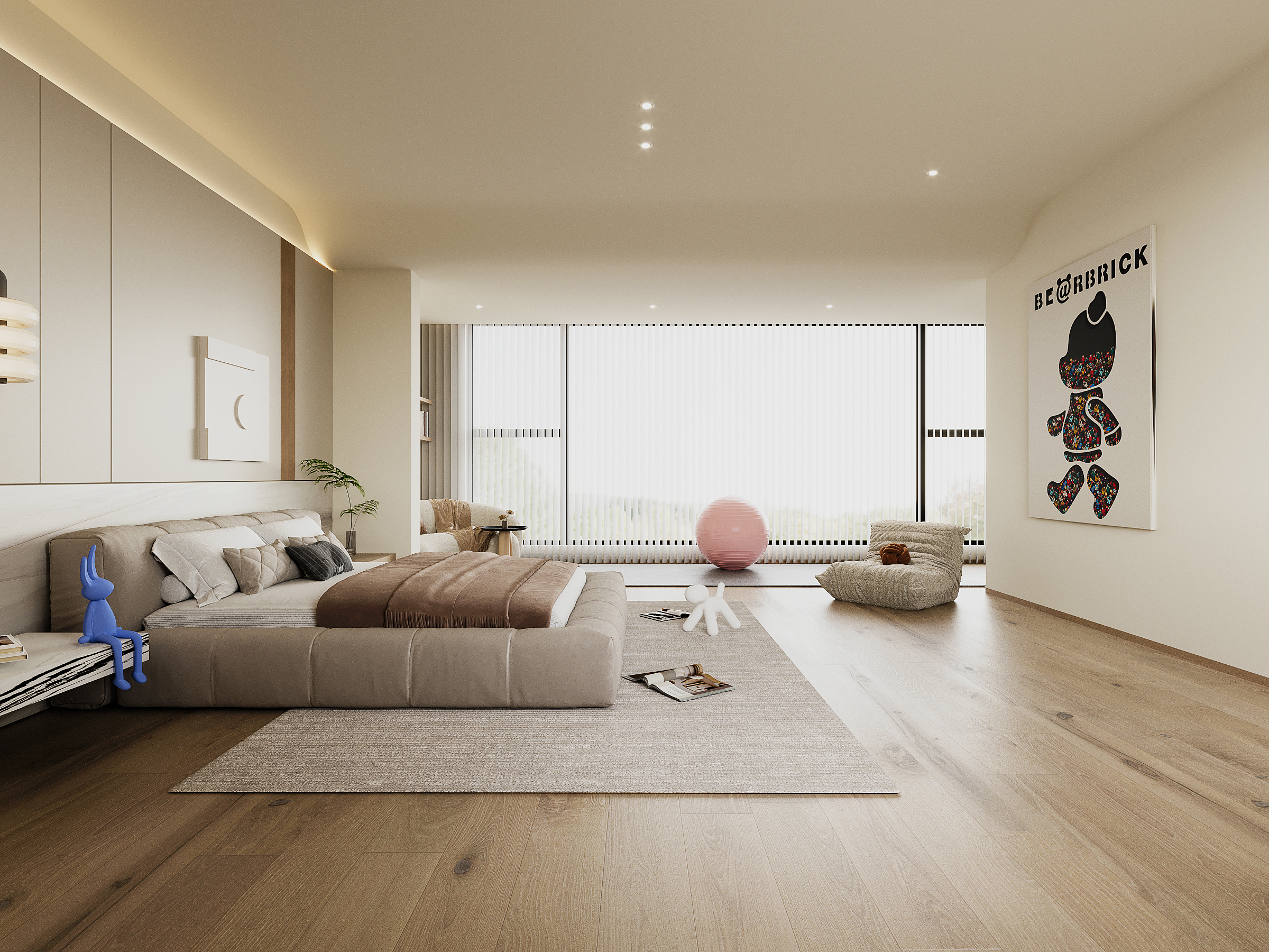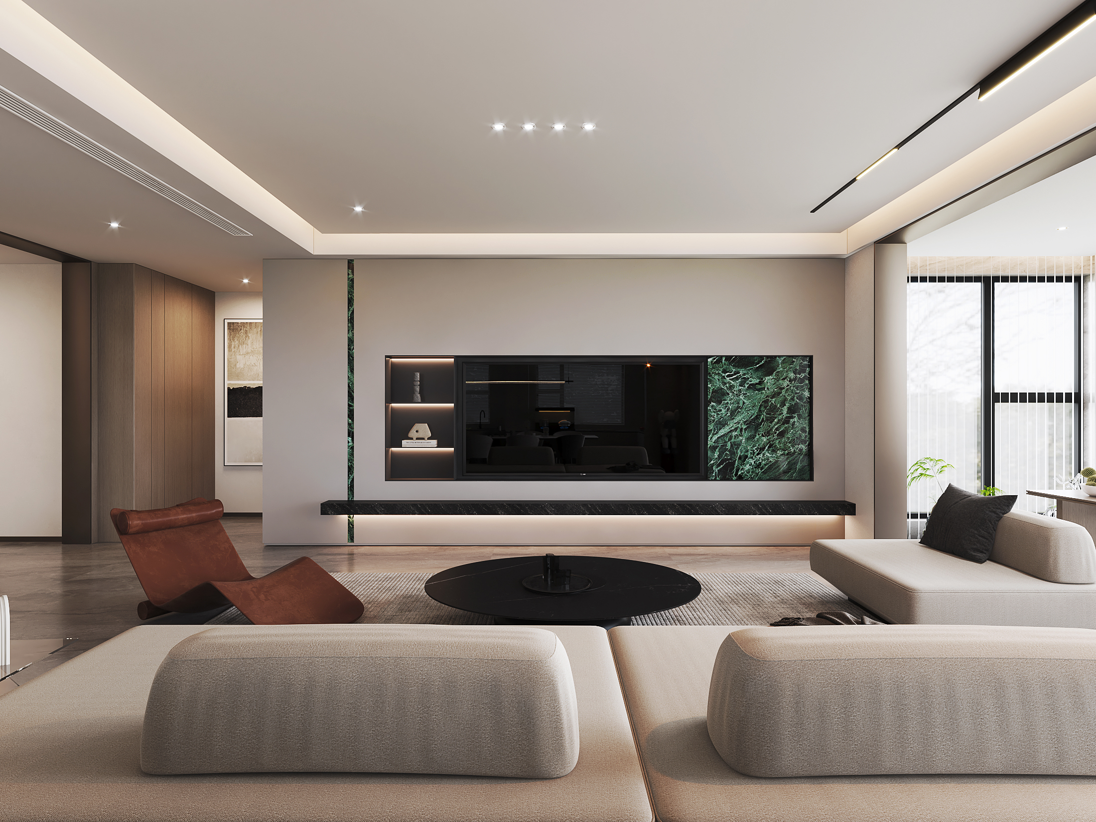 选择主题时,充分考虑业主的喜好、需求和室内空间的功能.确保设计使空间呈现统一、和谐的视觉效果。根据业主的生活习惯和需求,合理规划开放与封闭空间、动线和布局。考虑采光、通风和视野,搭配相应的辅助色,使色彩在满足审美需求的同时,也能调节情绪,电视背景墙的石材材质使得与整体风格协调,让其成为空间亮点。
