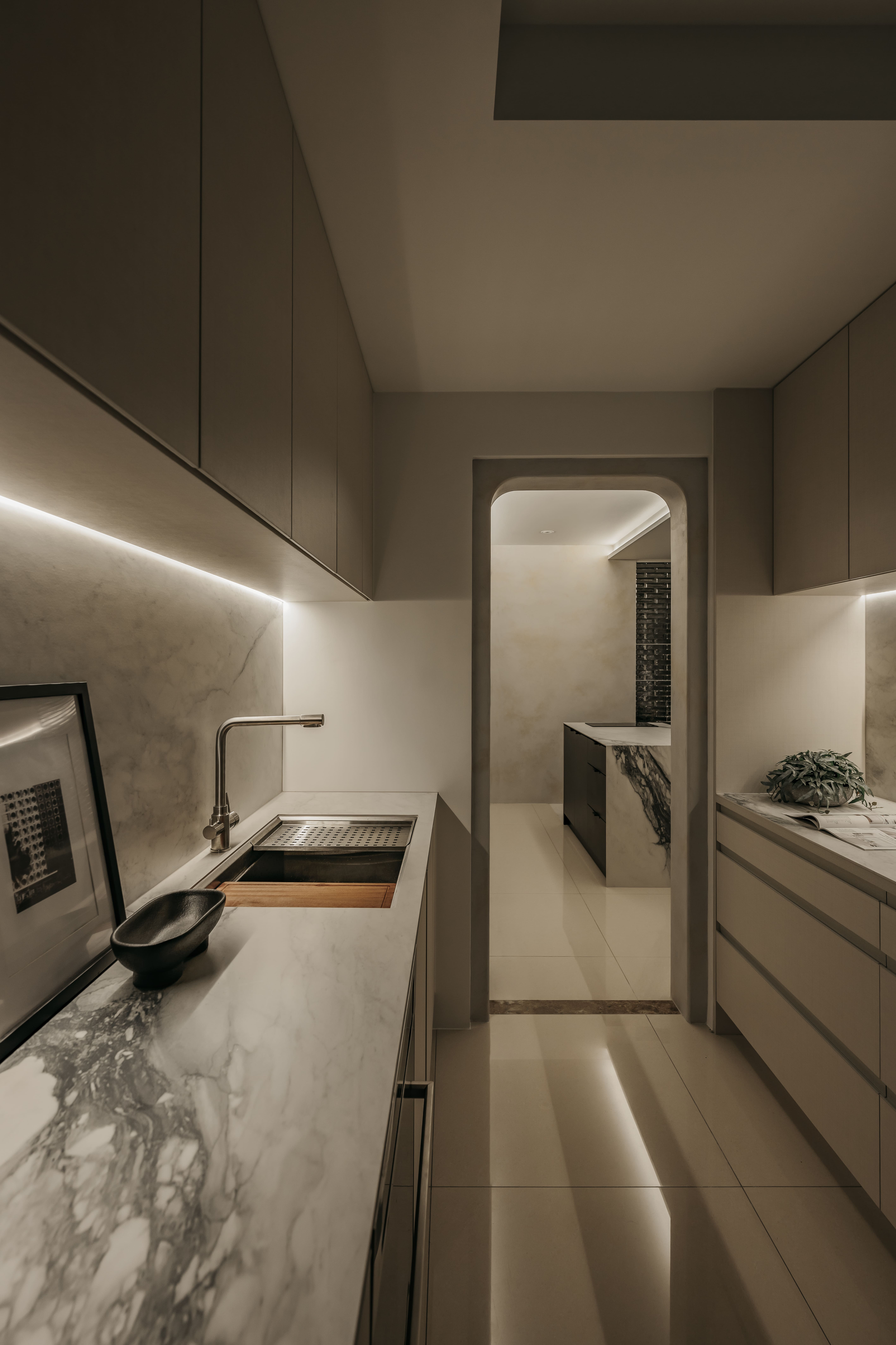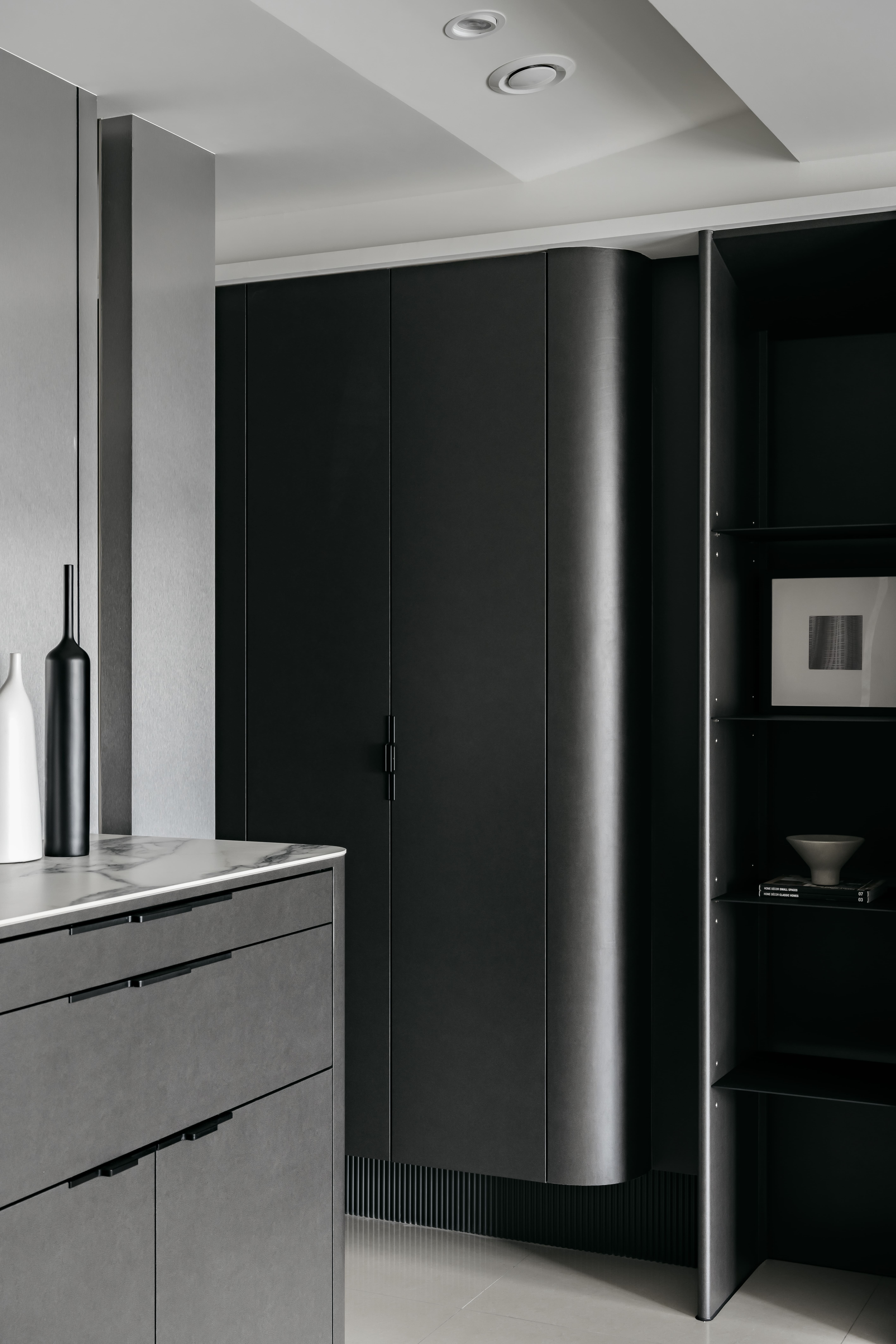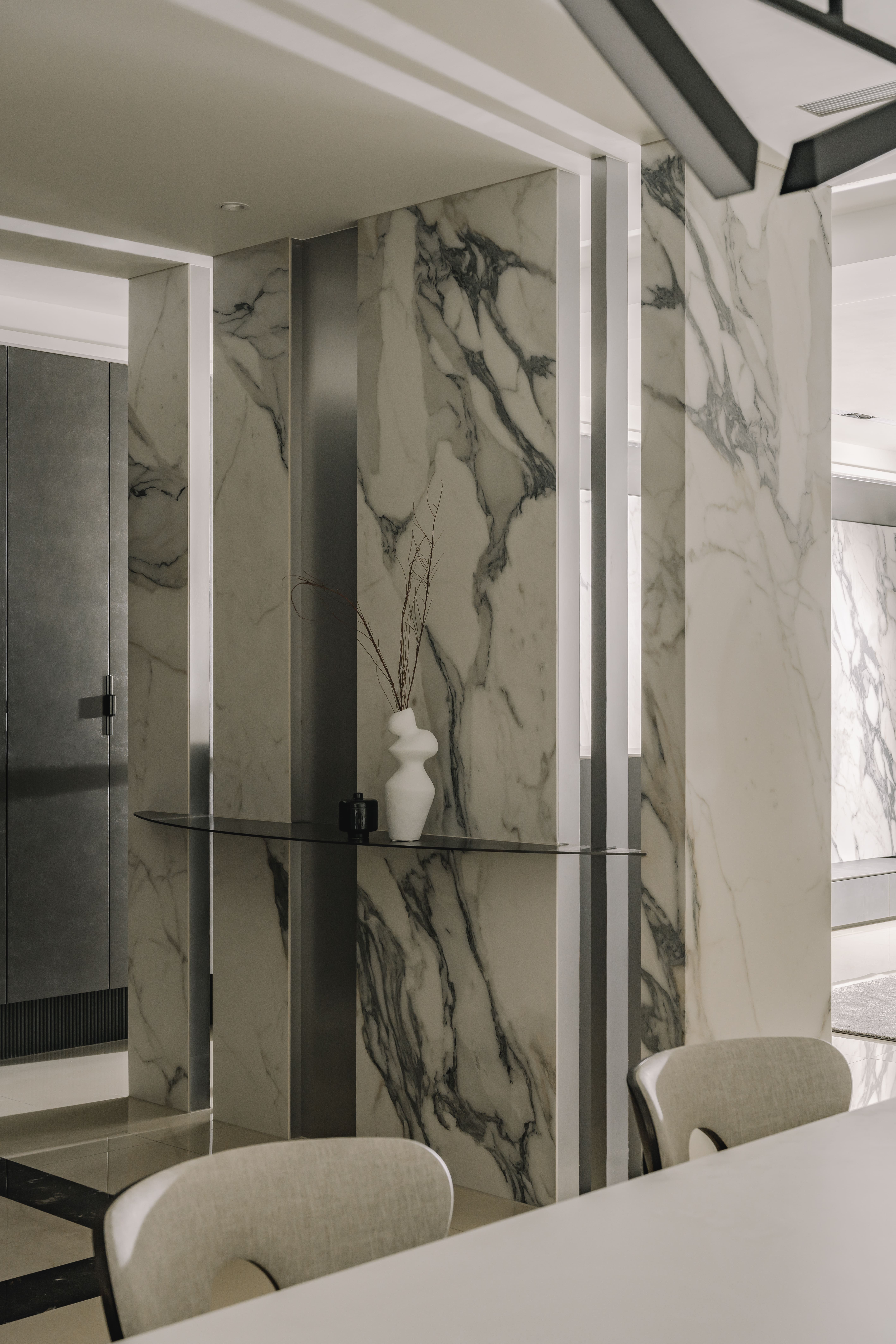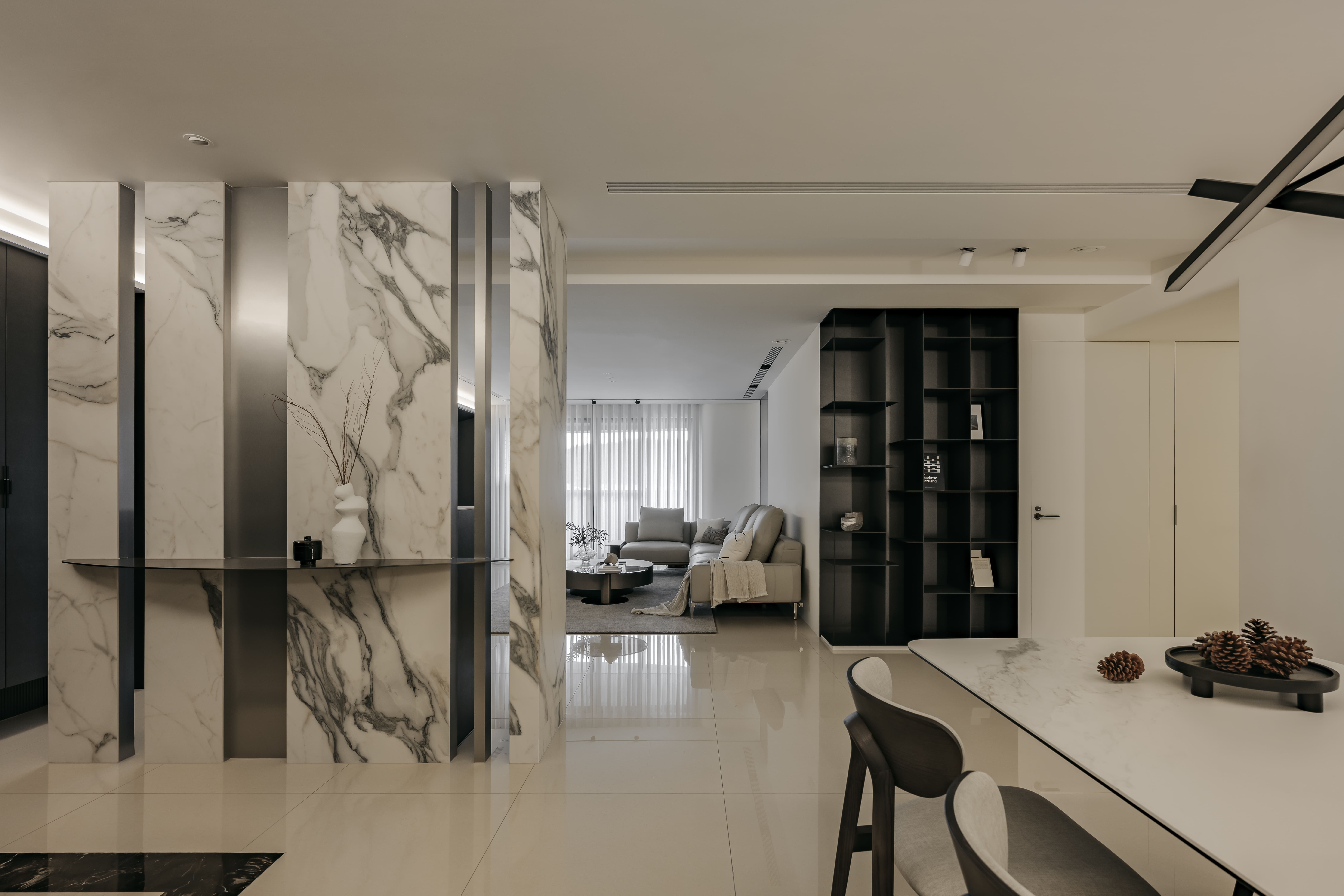 以黑白概念為基調,大理石與不鏽鋼貼附牆體,保有線性穿透。電視牆與玄關櫃同立面,連結黑色收納櫃與鐵件展示櫃,虛化厚重牆感。延伸至餐廚,水光波玻璃磚創造冷冽美感,金屬燈具點綴,注入戲劇性魅力。