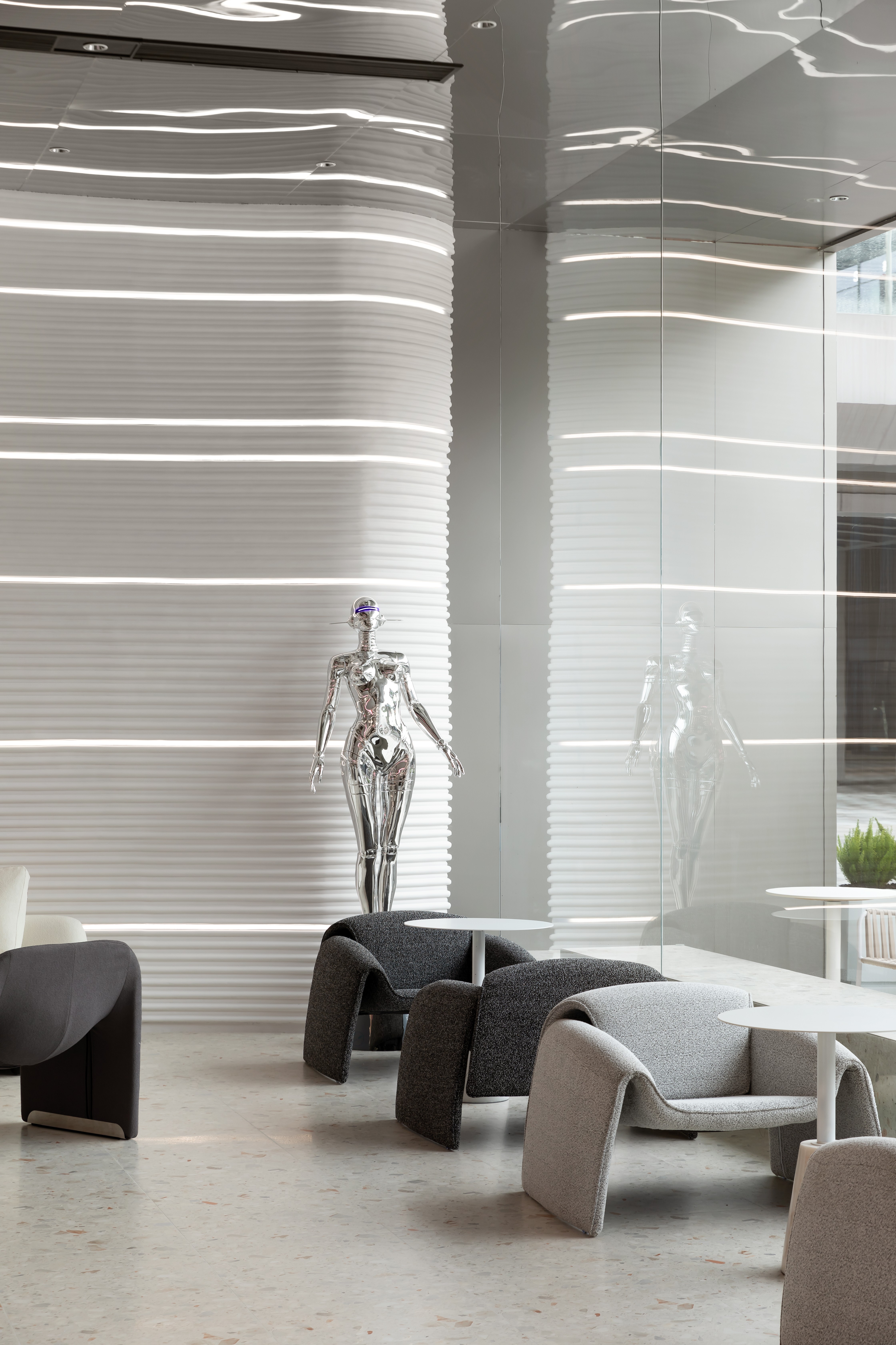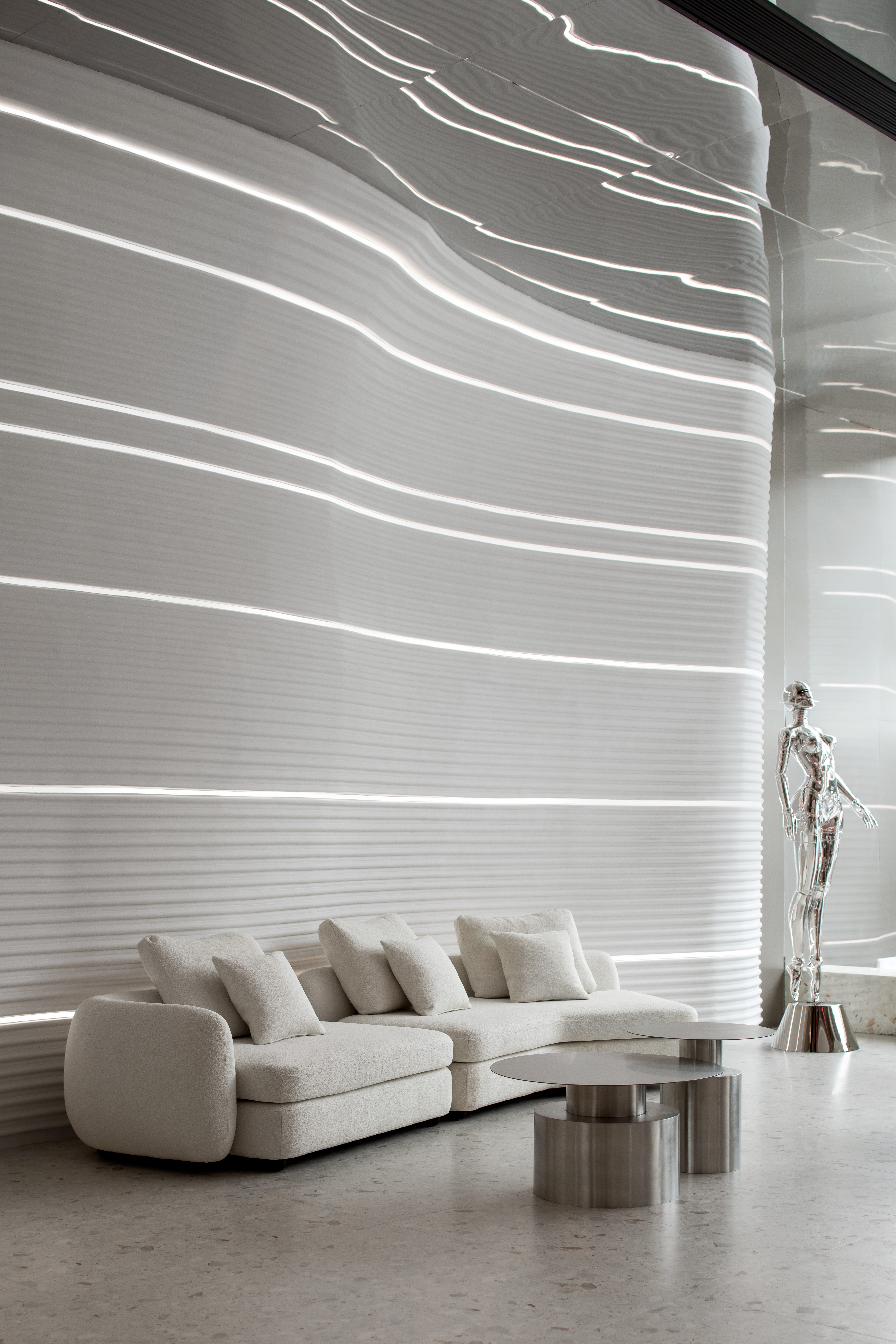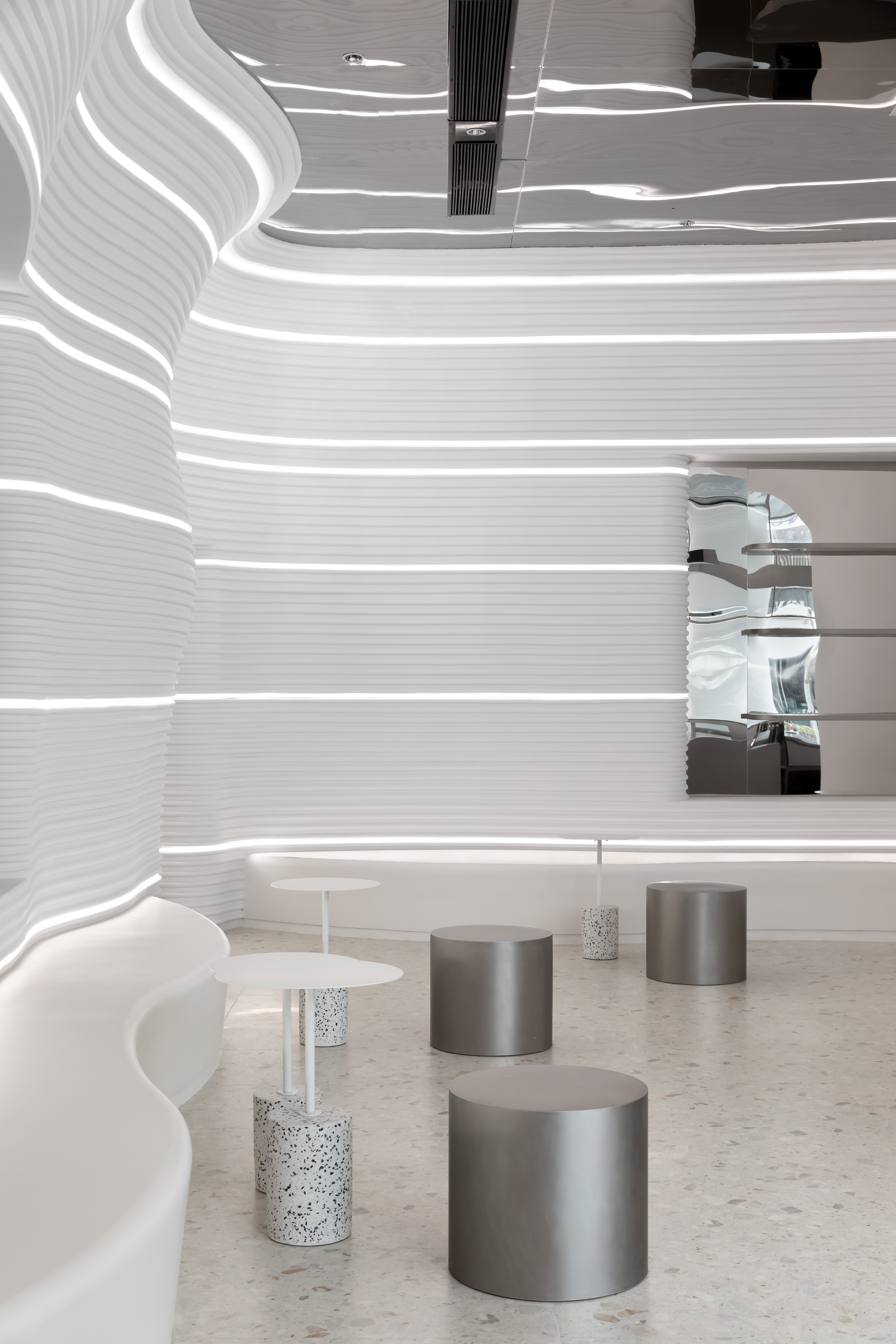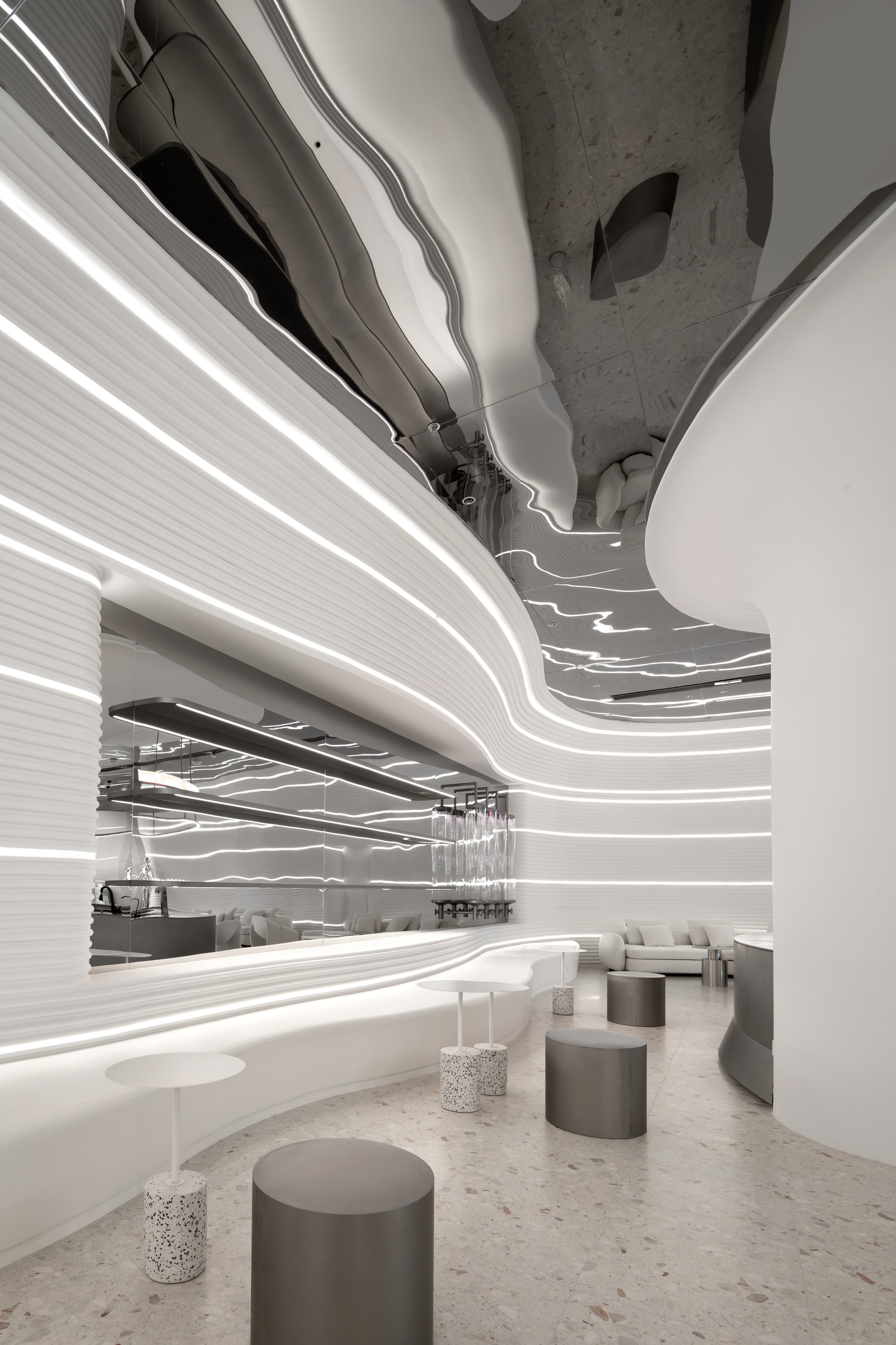 浅灰色的水磨石地面,银灰色哑光的不锈钢吧台,墙面采用特殊GRG工艺材质,不同的材质质感与光影,为空间构建出丰富的如同黑白电影般的质感。
