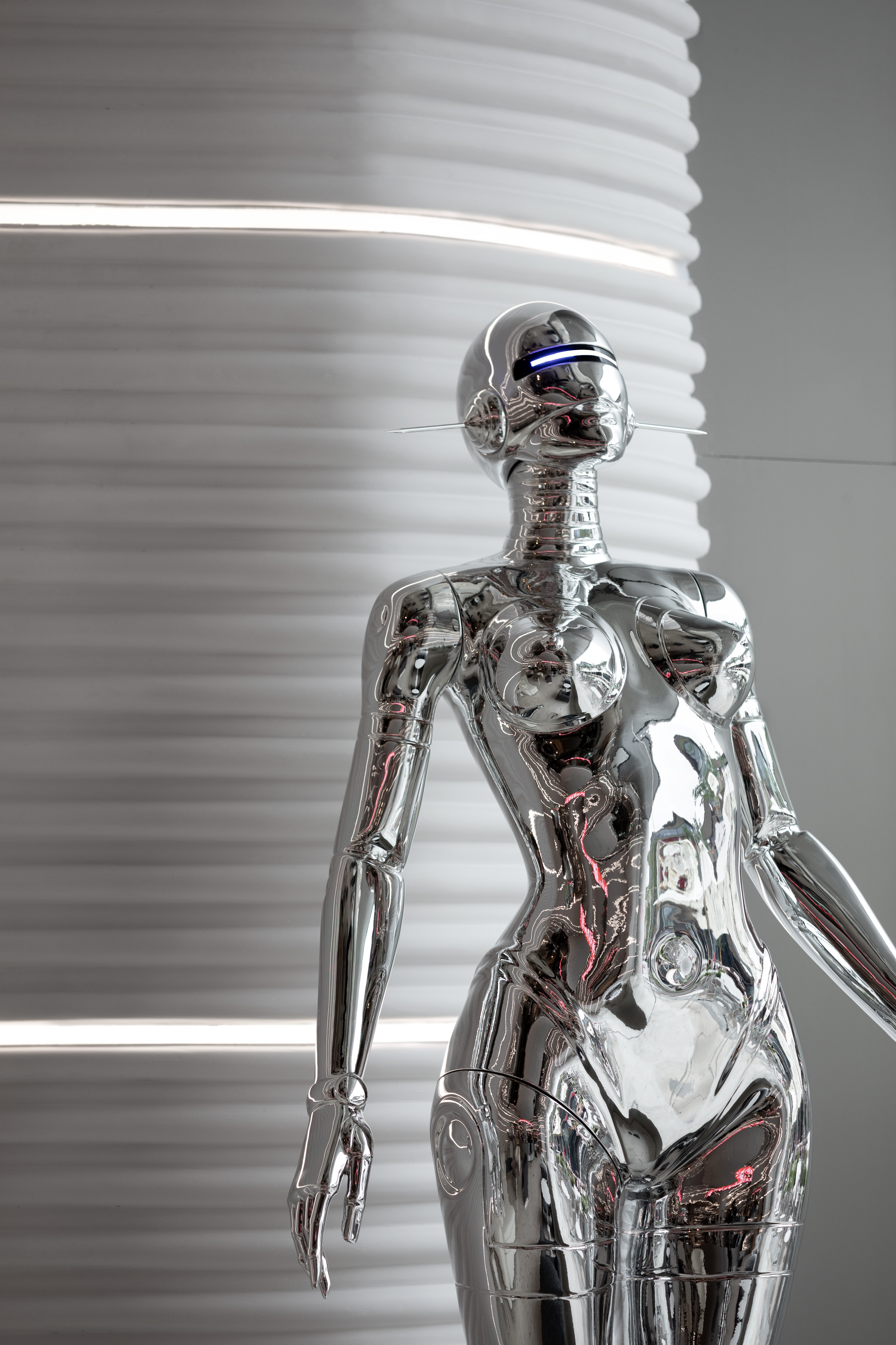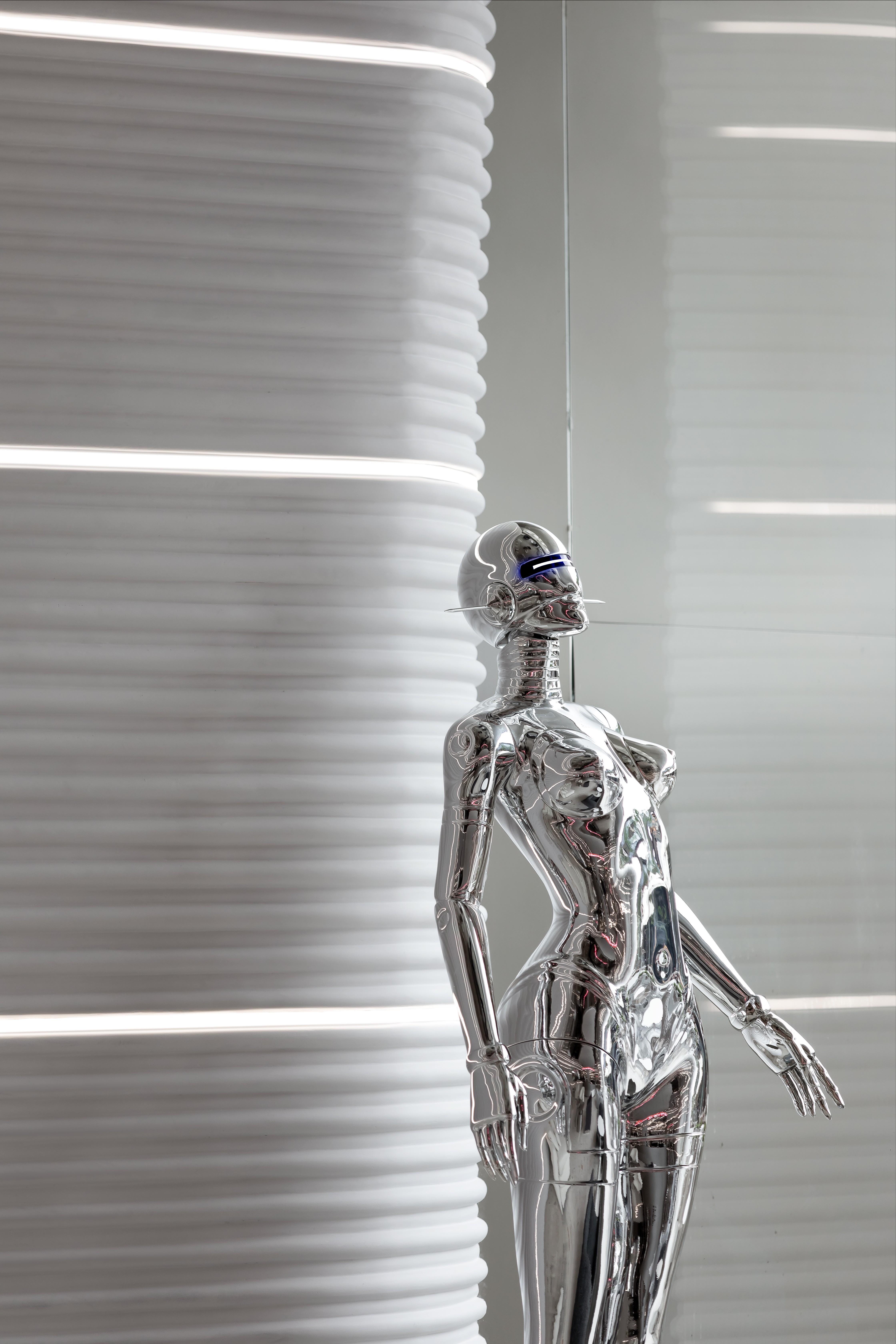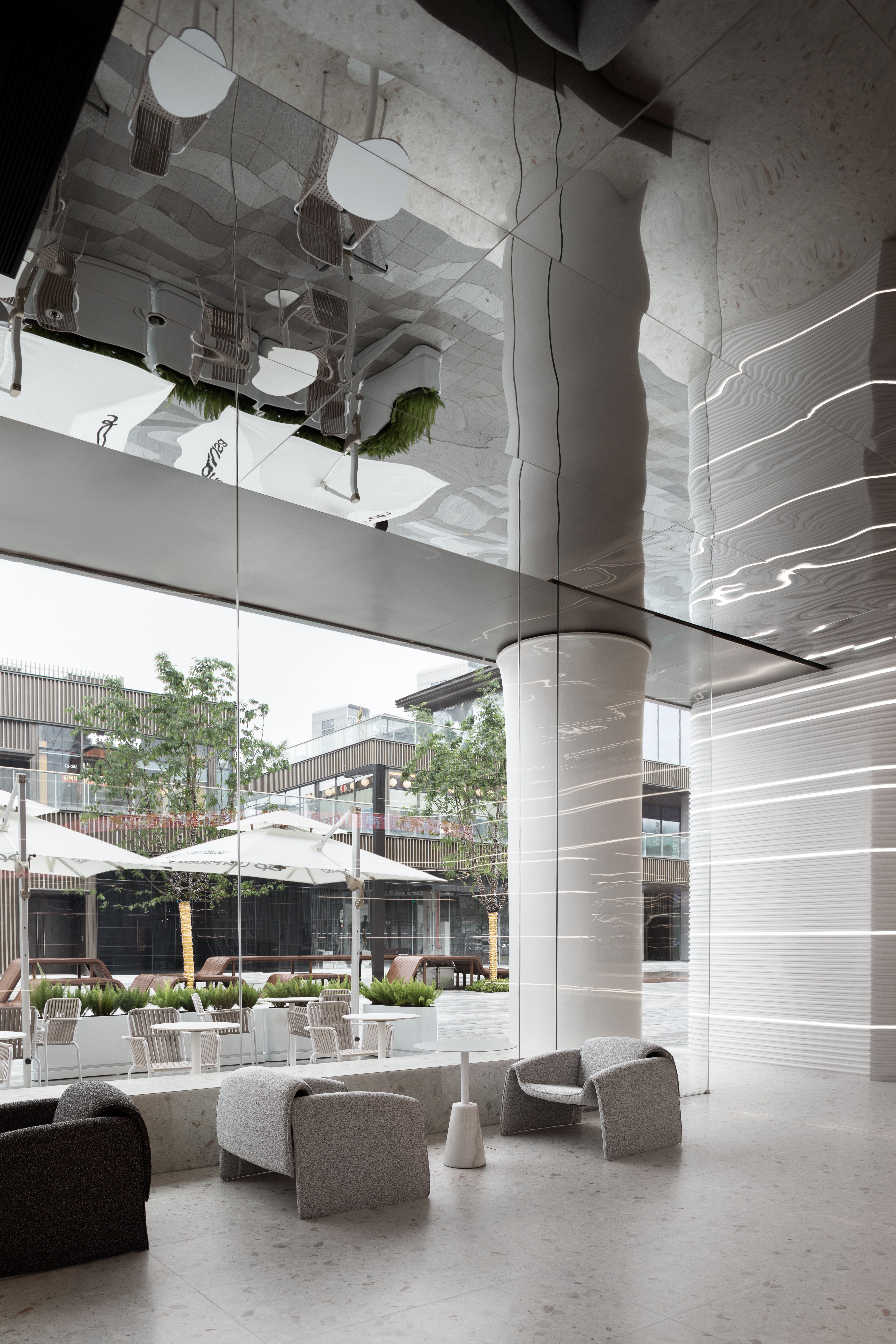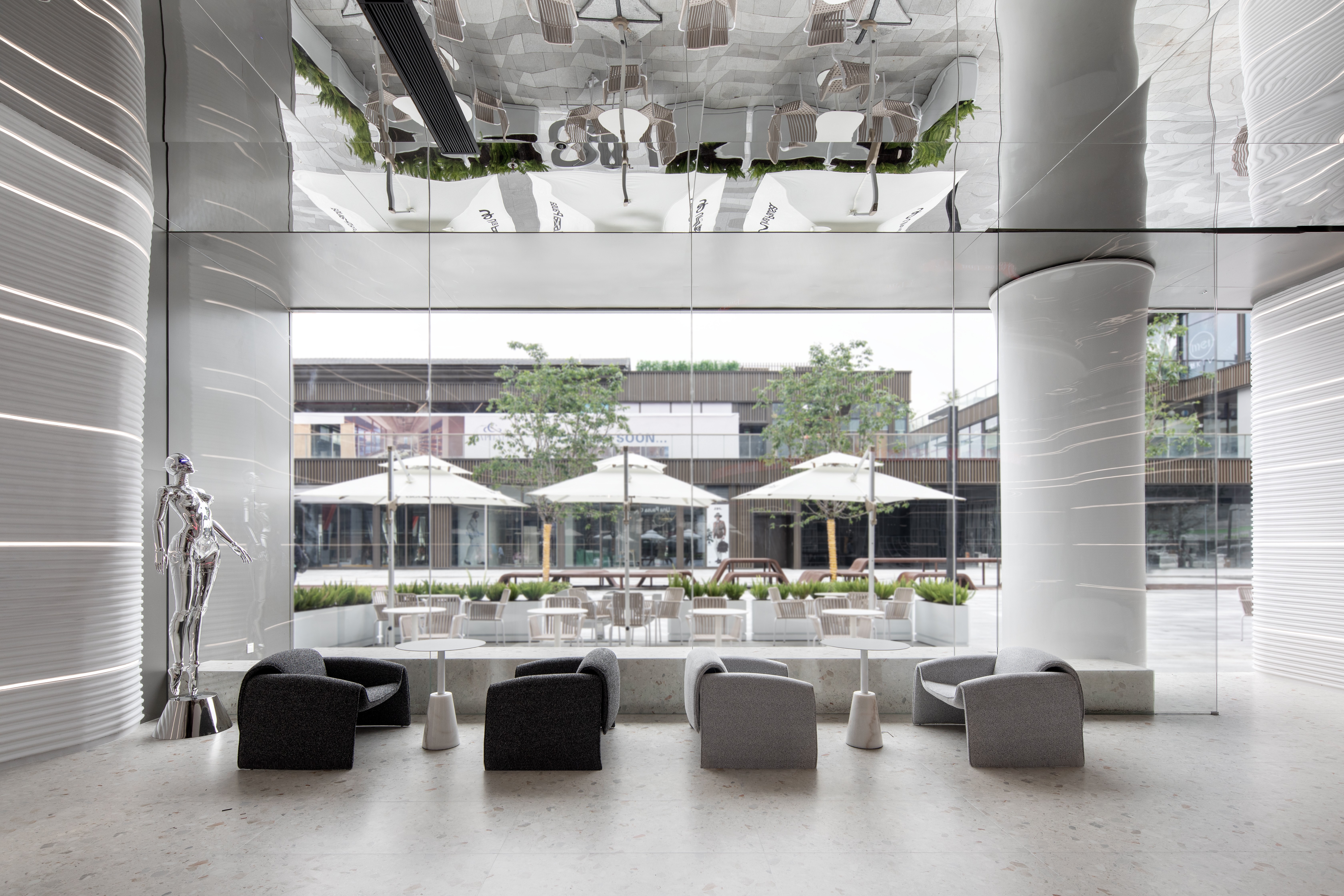 浅灰色的水磨石地面,银灰色哑光的不锈钢吧台,墙面采用特殊GRG工艺材质,不同的材质质感与光影,为空间构建出丰富的如同黑白电影般的质感。