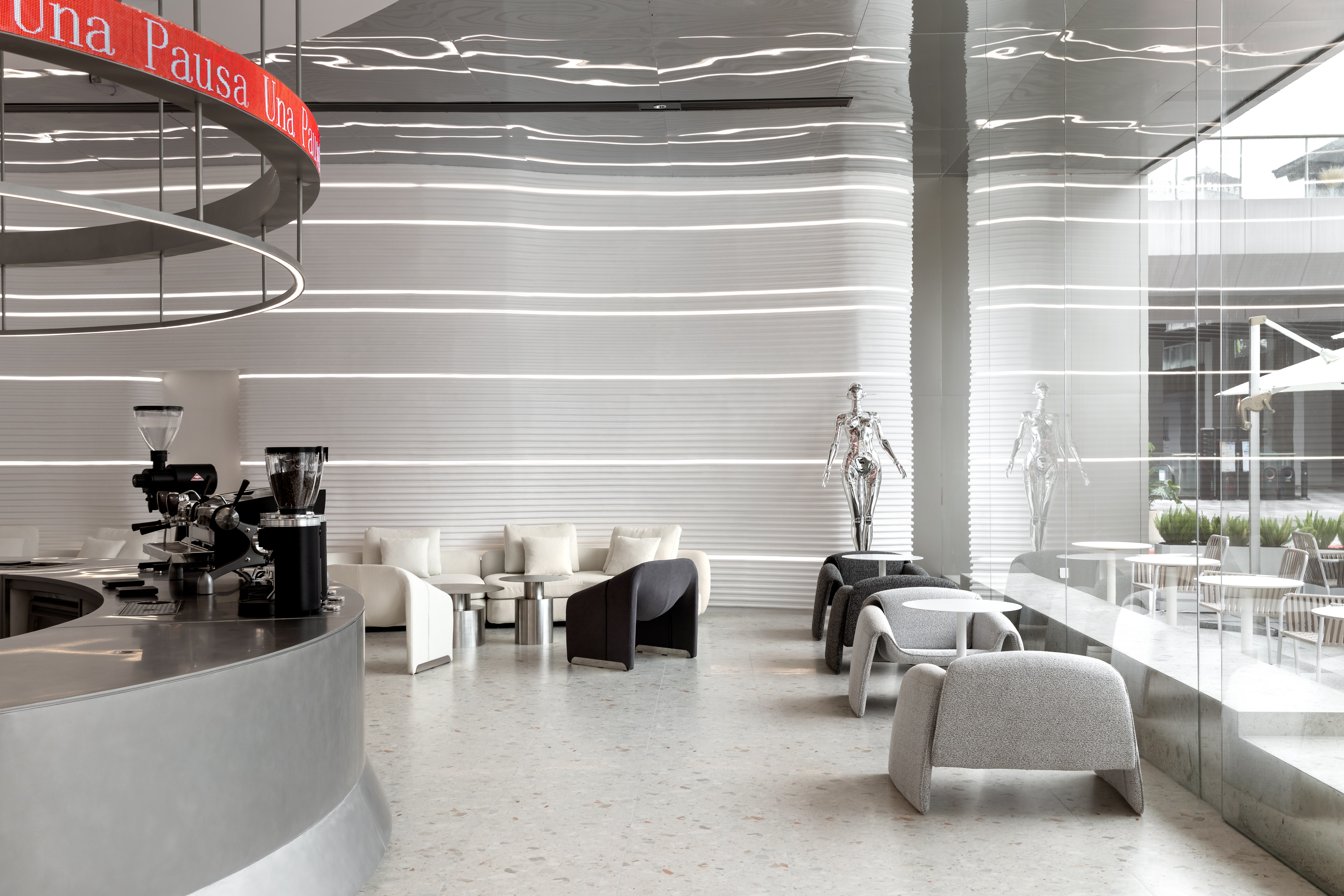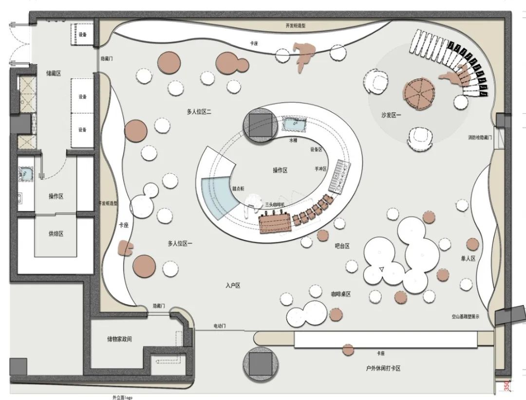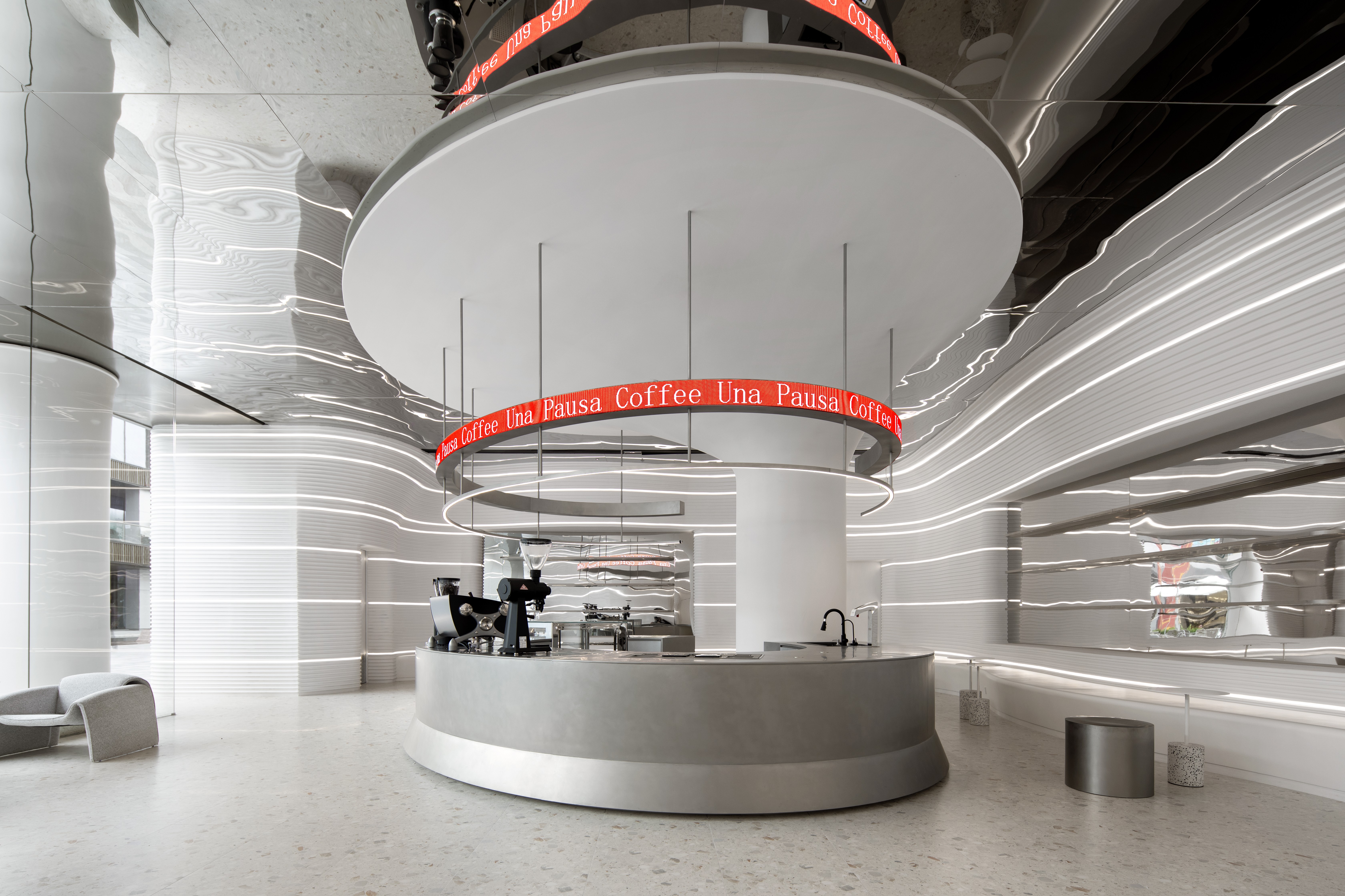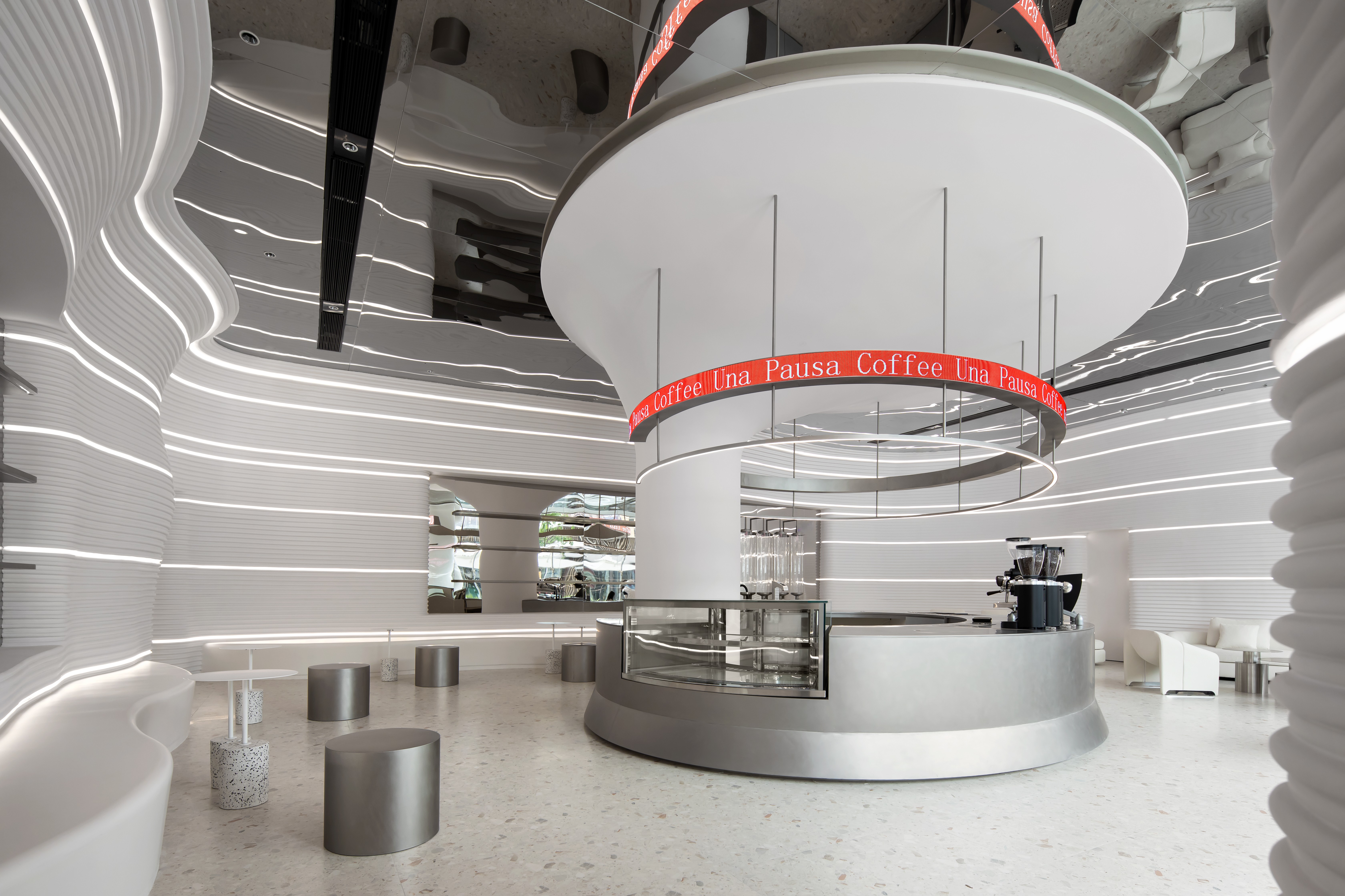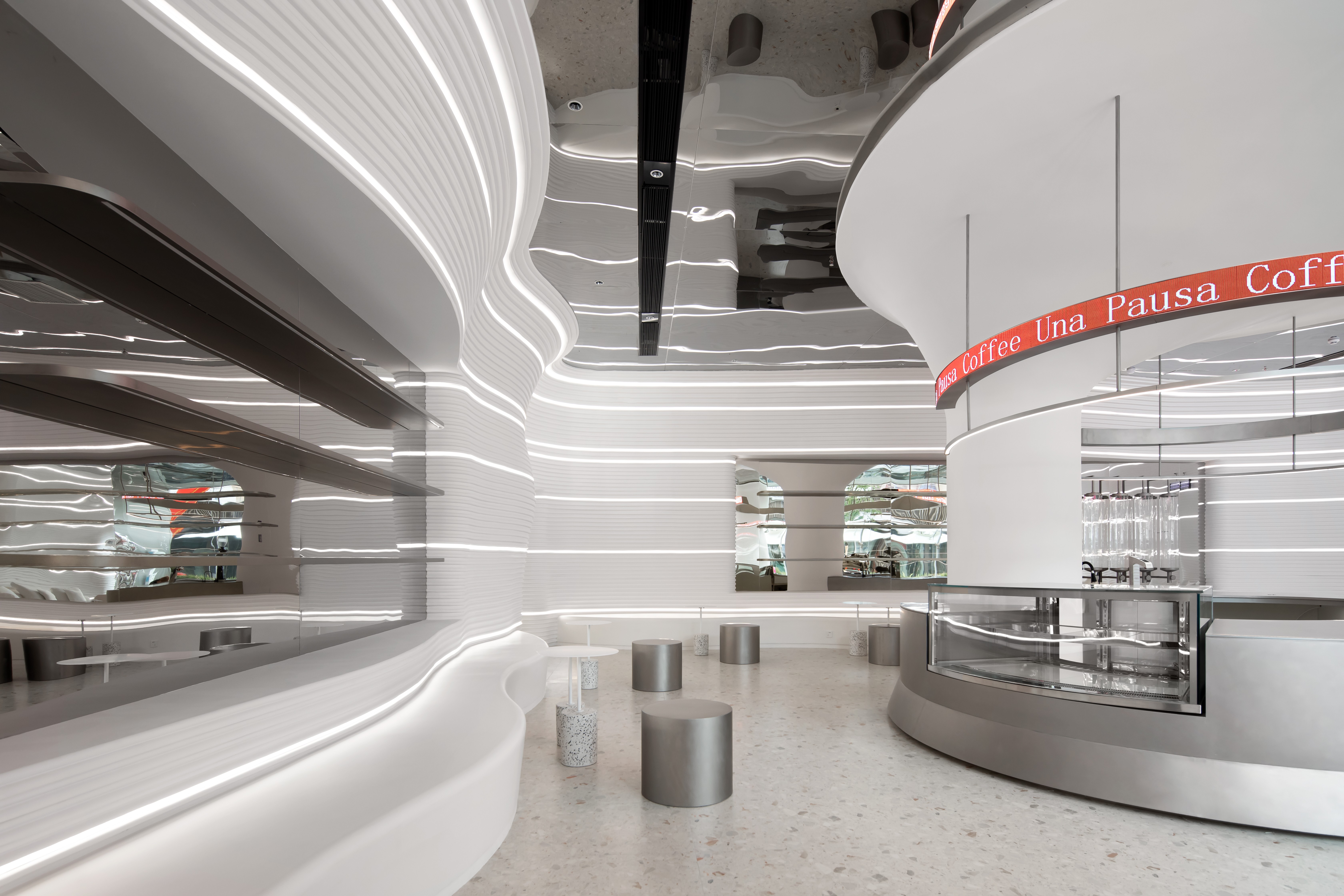 在满足空间整体视觉基调上,让咖啡厅更具科技感与沉浸感。