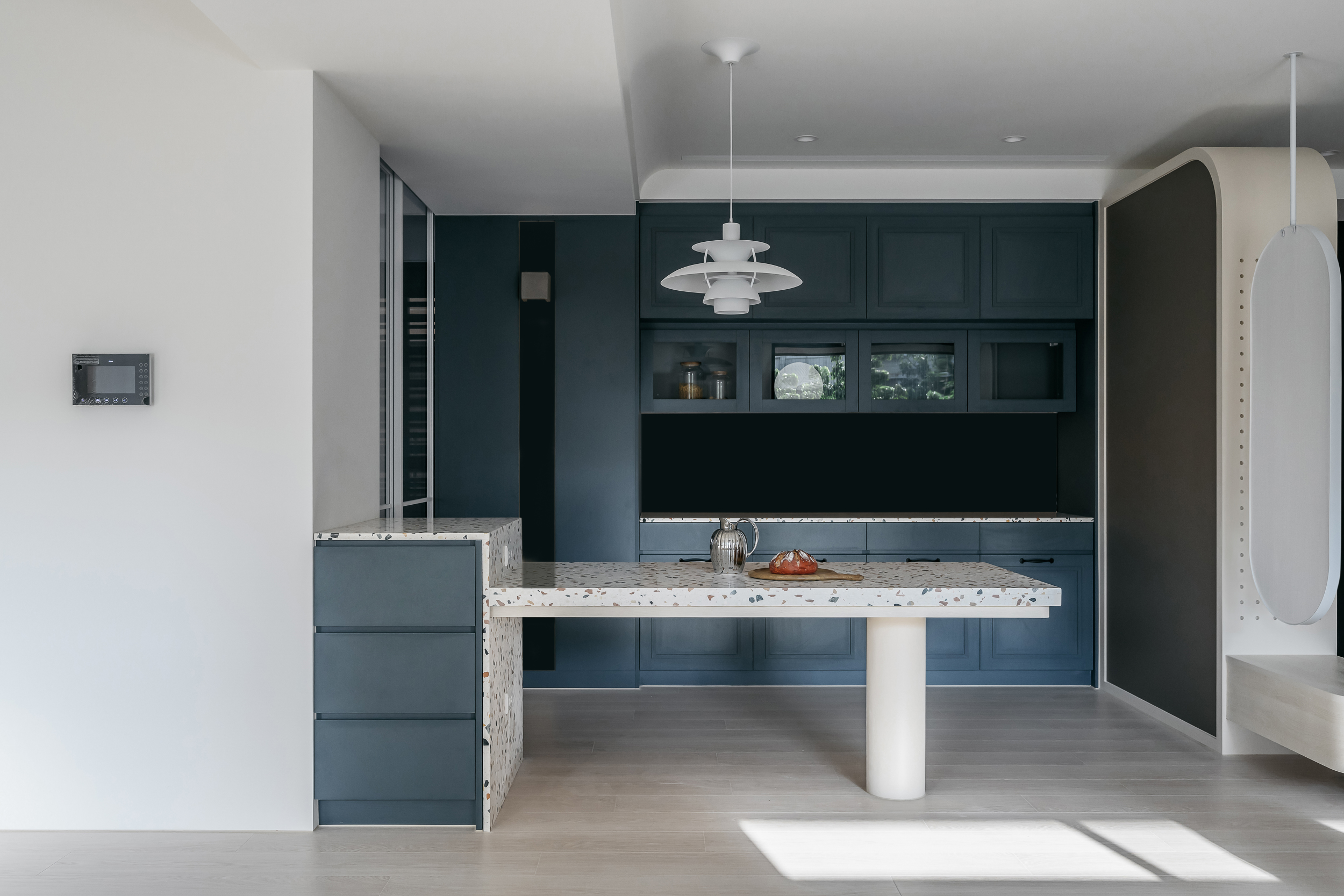 设计选材:入室後的玄關以花磚地坪鋪陳,明確落塵區,沿牆面規劃的大面落地黑鏡將收納機能隱於立面之下,維持清爽的門面。大面落地窗引入自然採光與景色,形塑日系透明感氛圍,木質電視牆整合多樣收納,為空間增添溫潤的視覺與充足的實用機能。餐、廚空間選用低調有質感的莫蘭迪藍鋪陳,添抹豐富的視覺層次。
