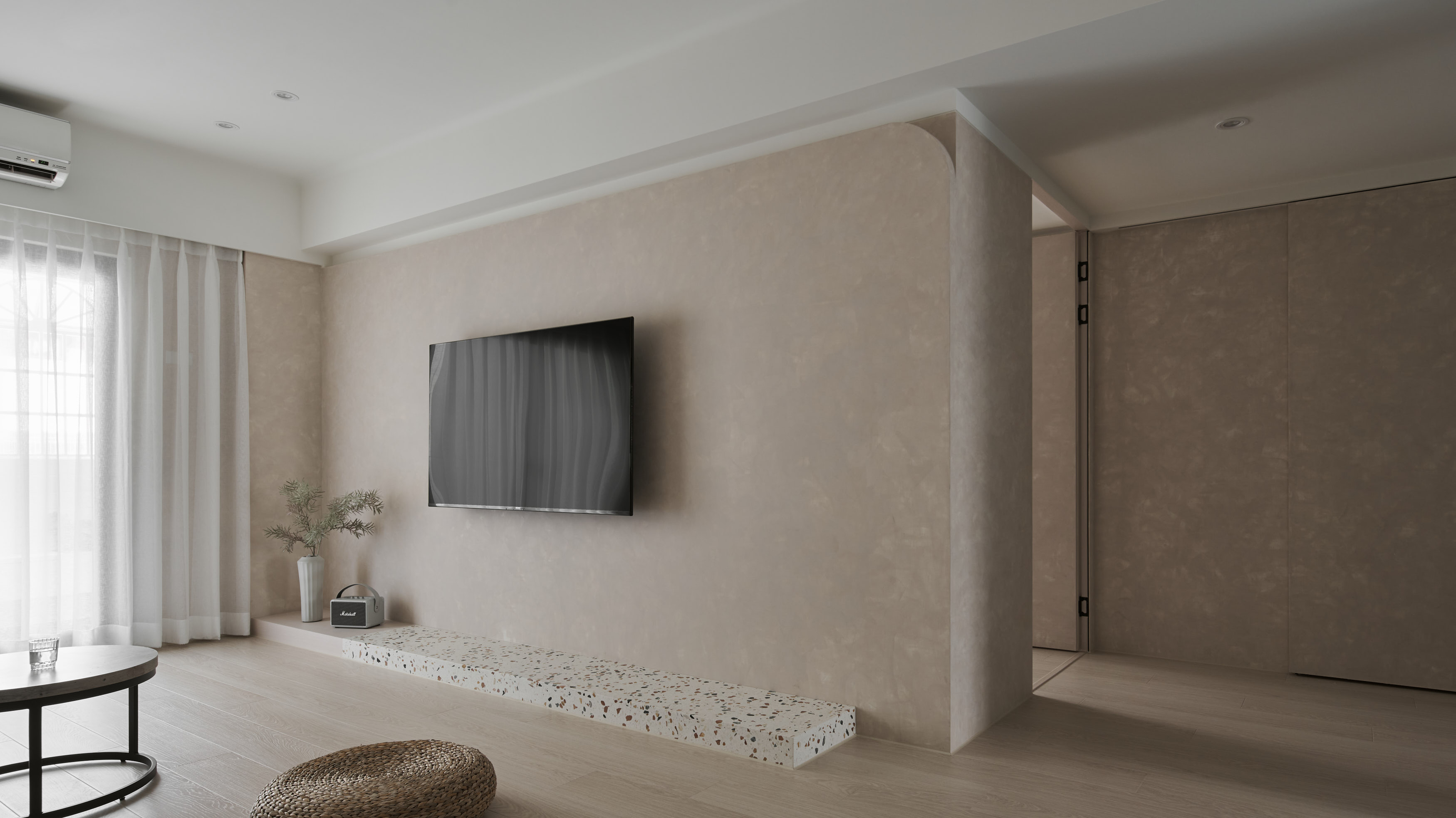 空间意境:電視牆的弧線講述著家庭的那份和諧,繽紛的水磨石播放著家人間歡愉的笑聲。小細節注入了靈魂,點亮角落,點亮了那份愛。在凝聚家庭的公共領域大膽的用粉色及深灰藝術塗料,用衝突的配色來融合兩個世代的生活。