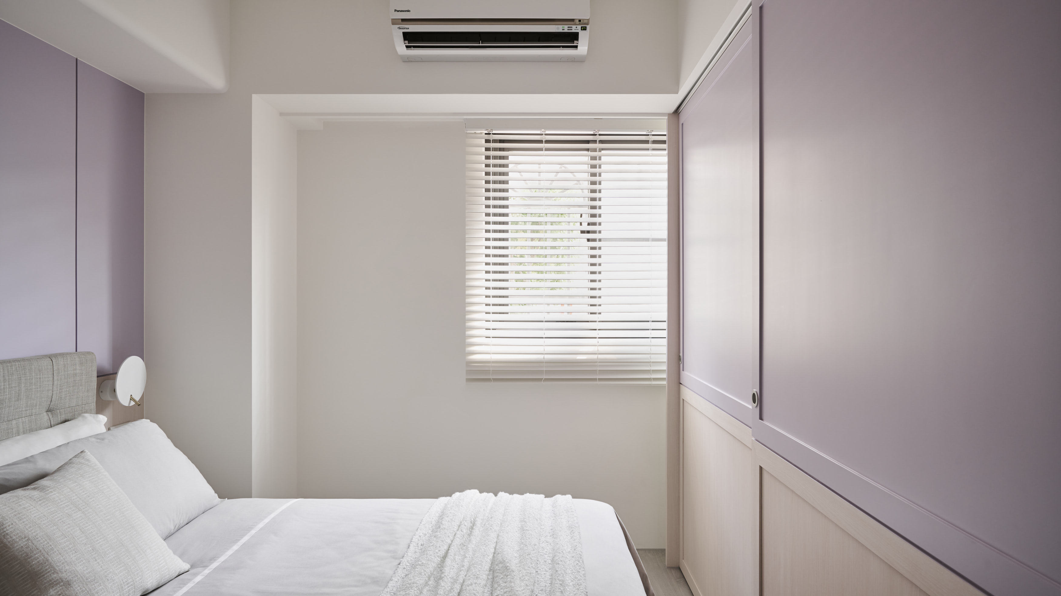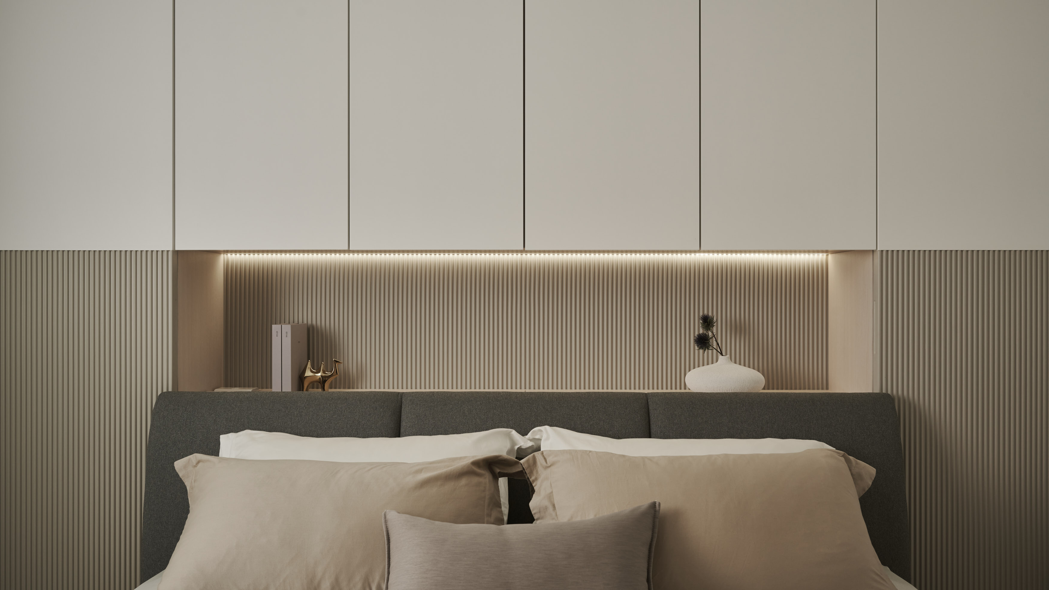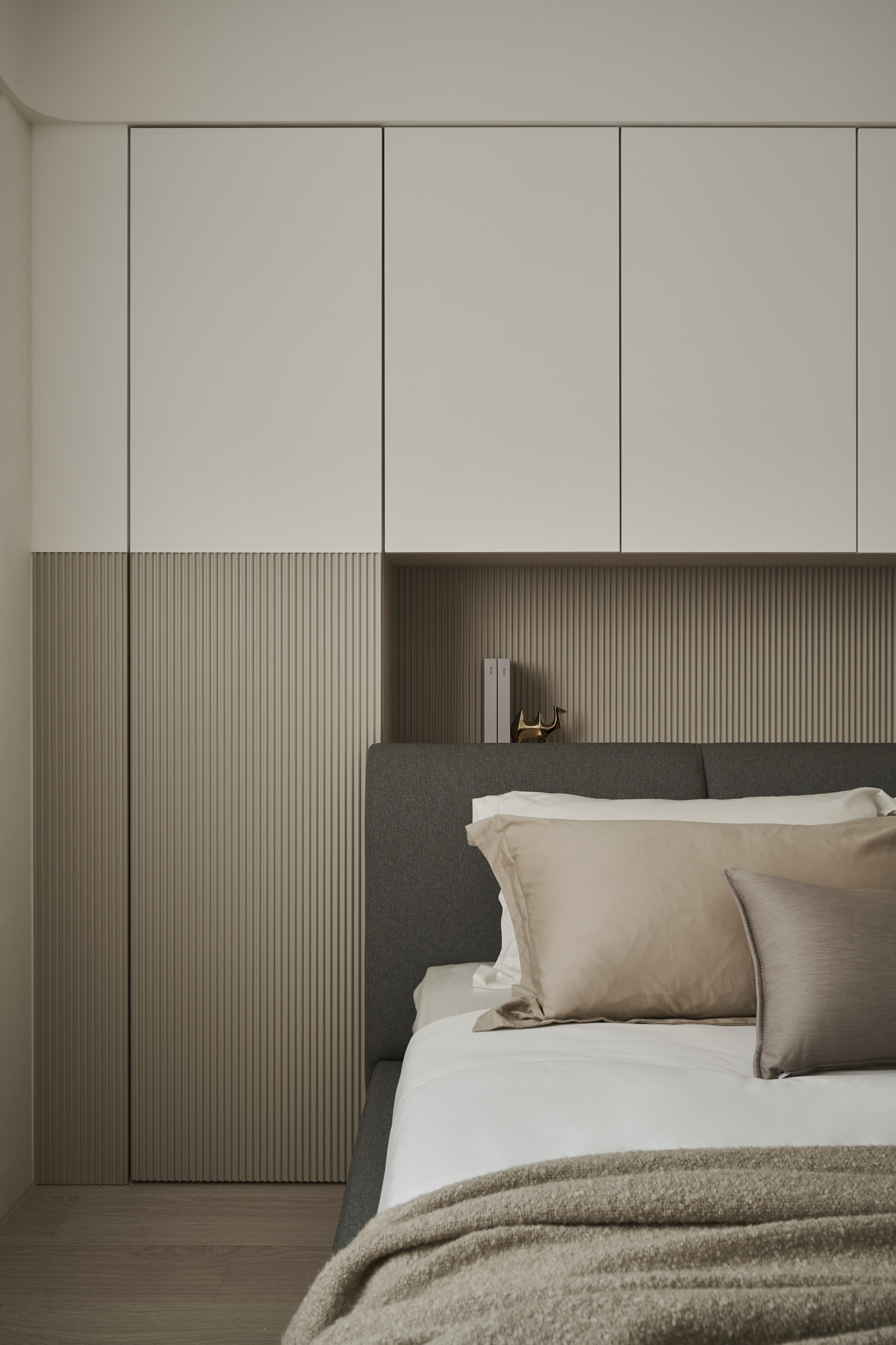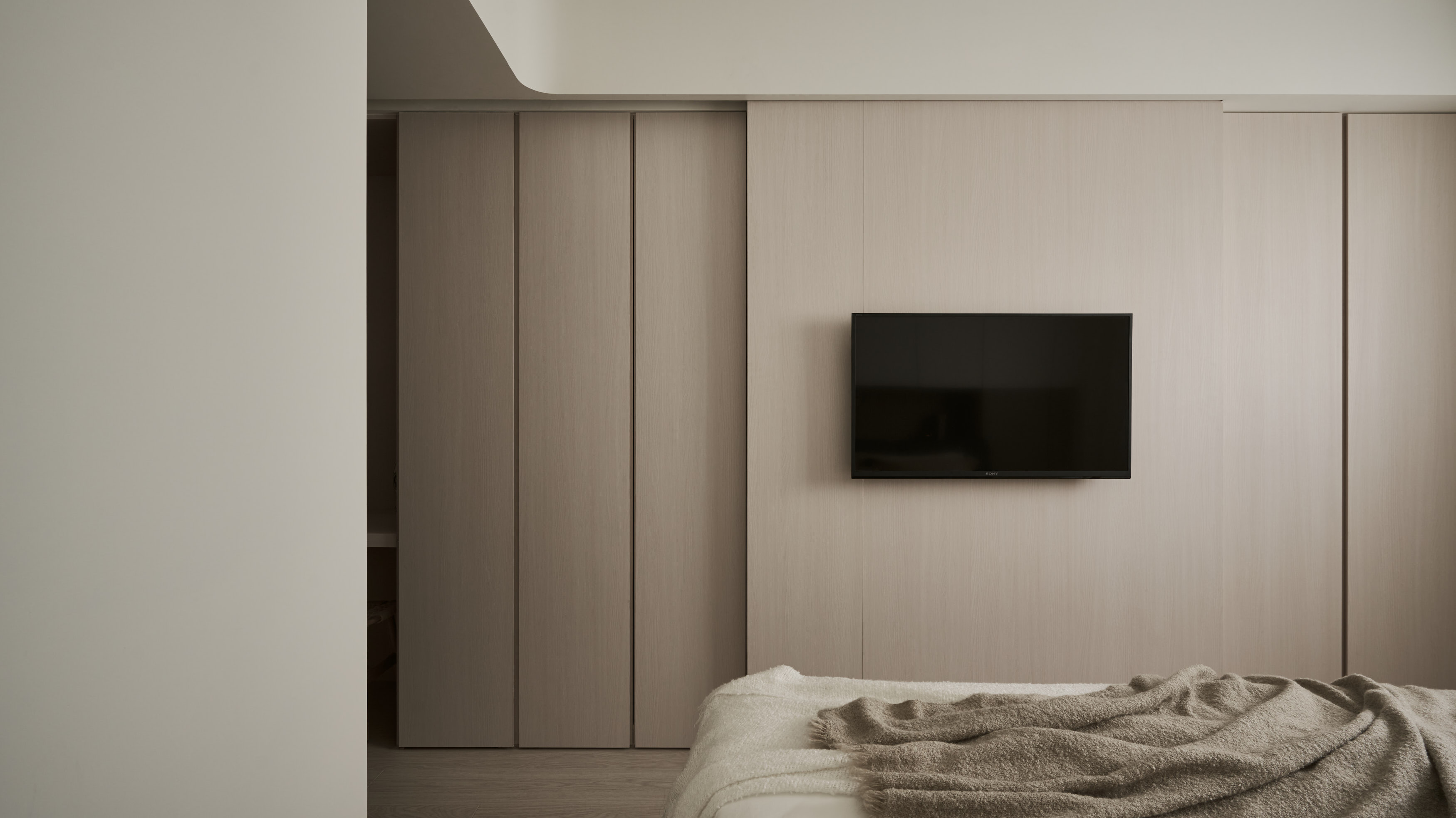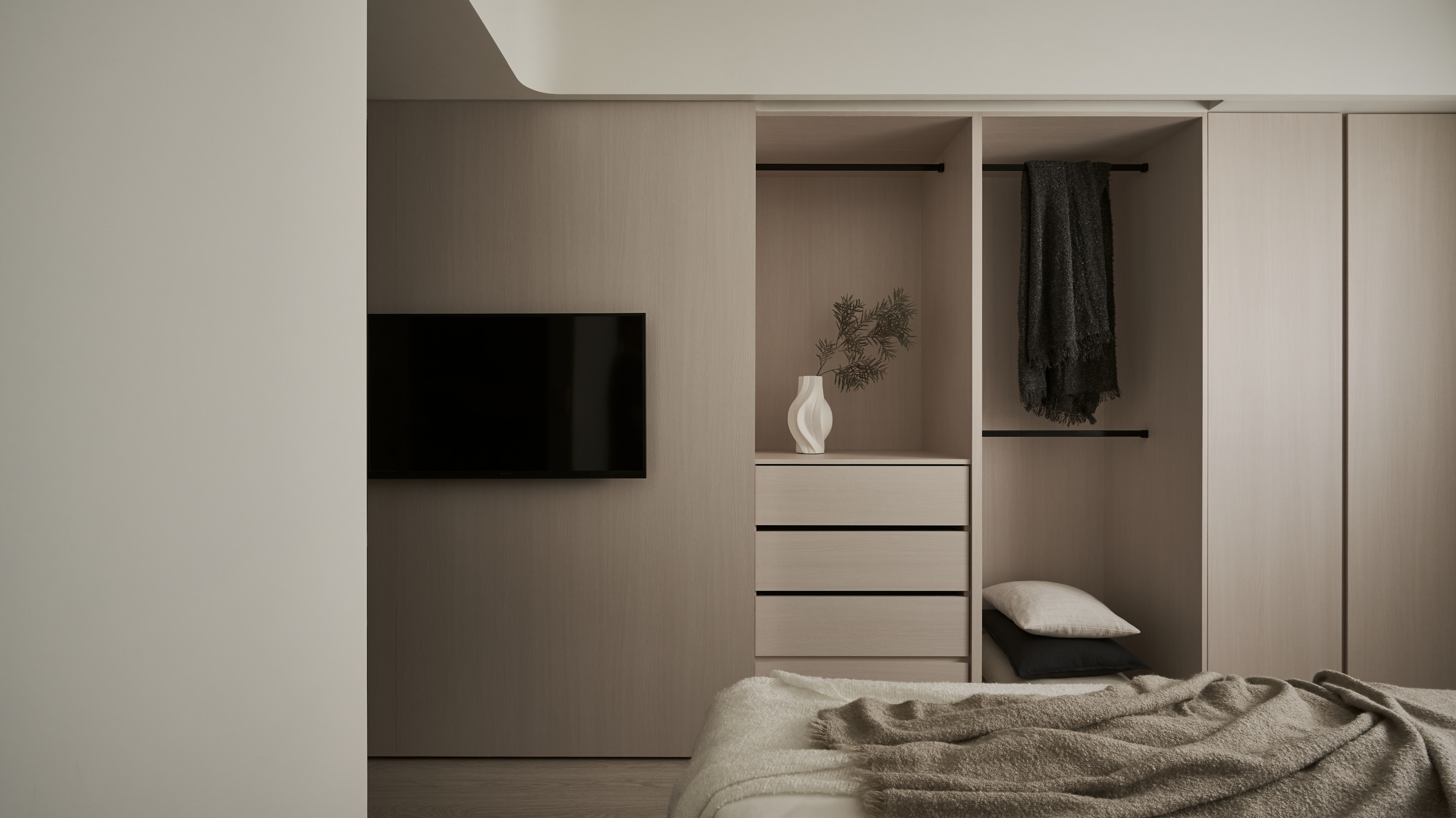 用户体验:主臥空間存在一只大樑,順勢在底部鋪排櫃體,並融入電視牆設計、化妝台空間,透過一體成型的流暢畫面,讓人完全忘記結構的壓迫感,又獲得所需的生活機能。