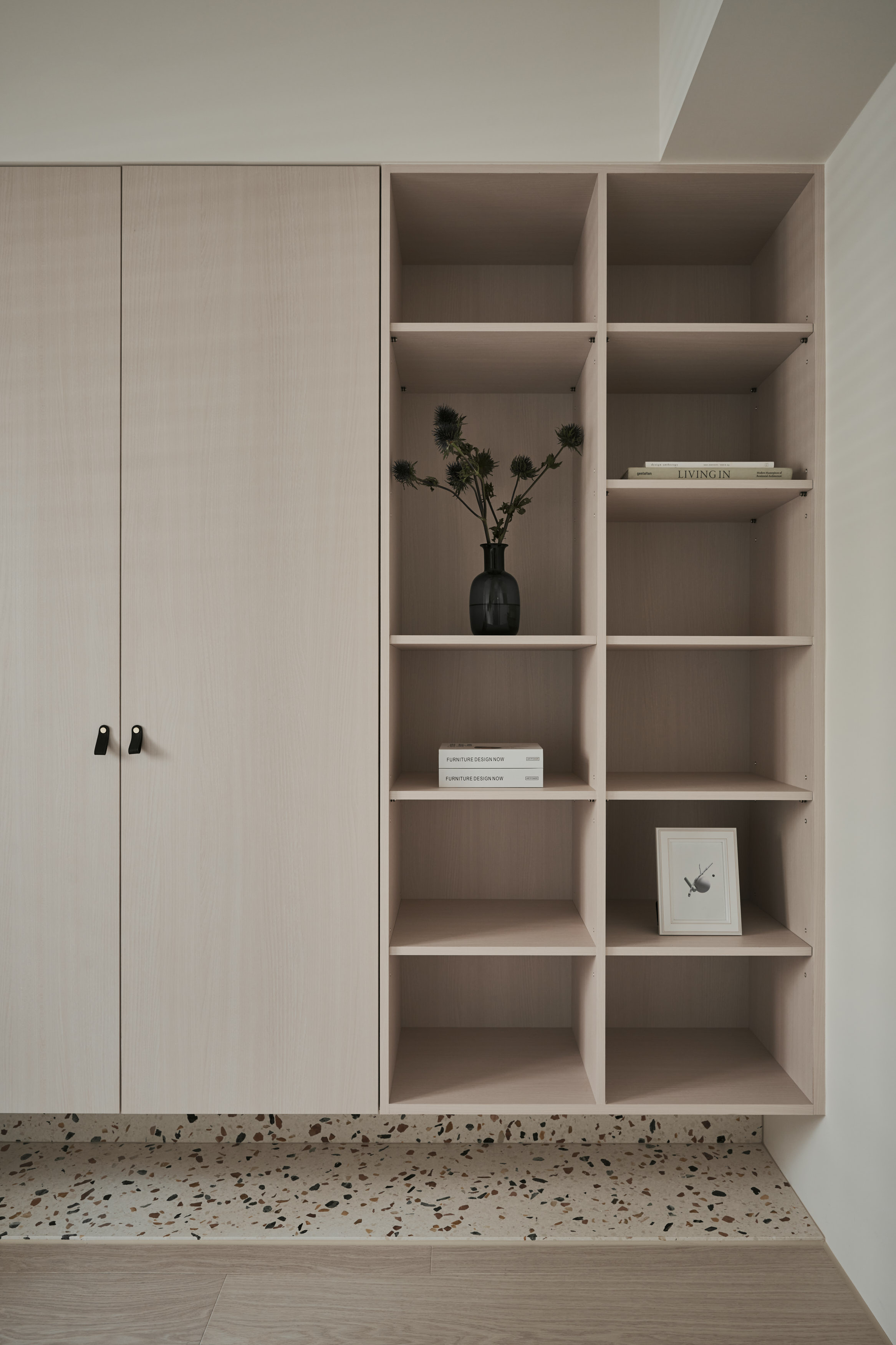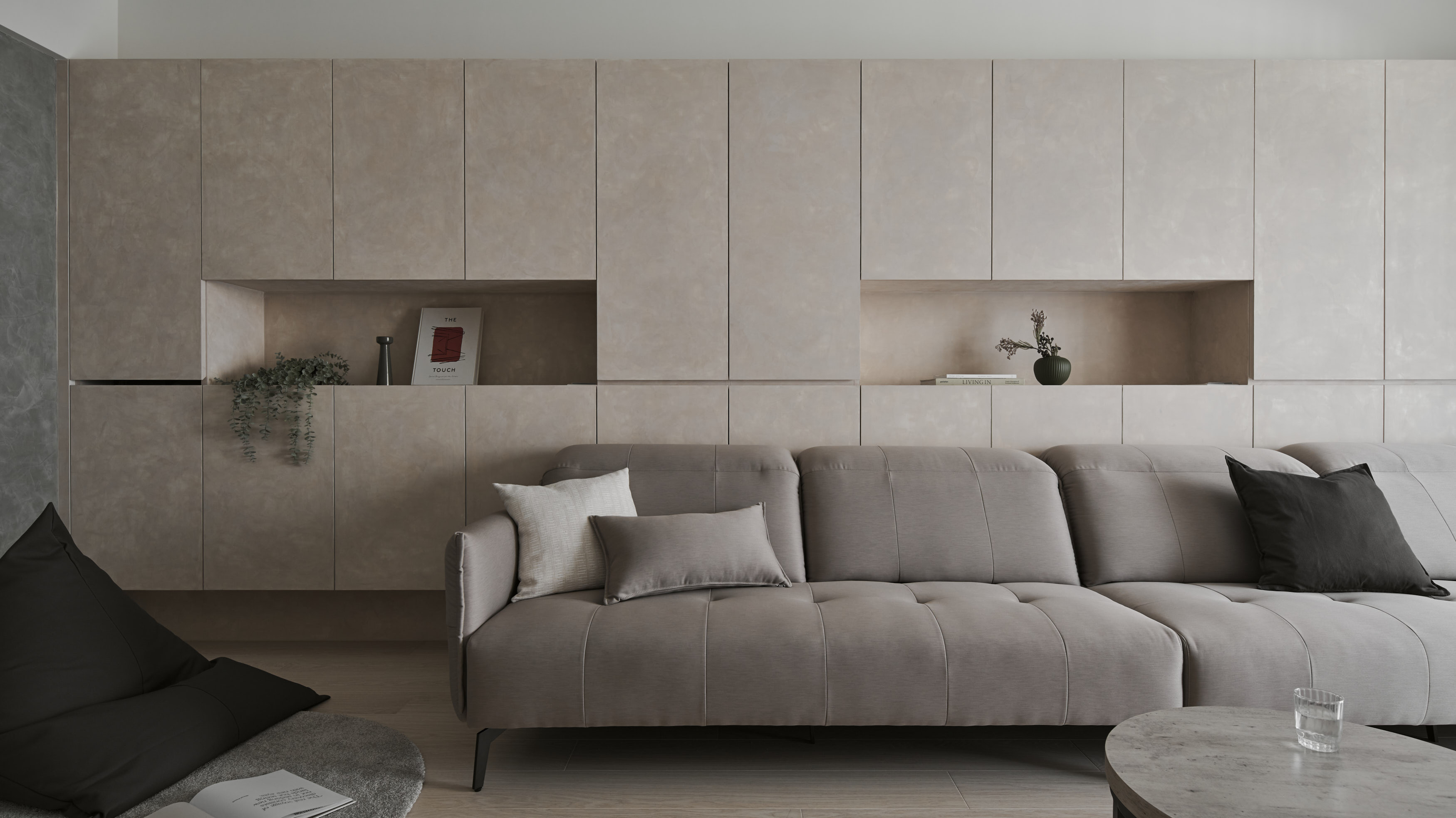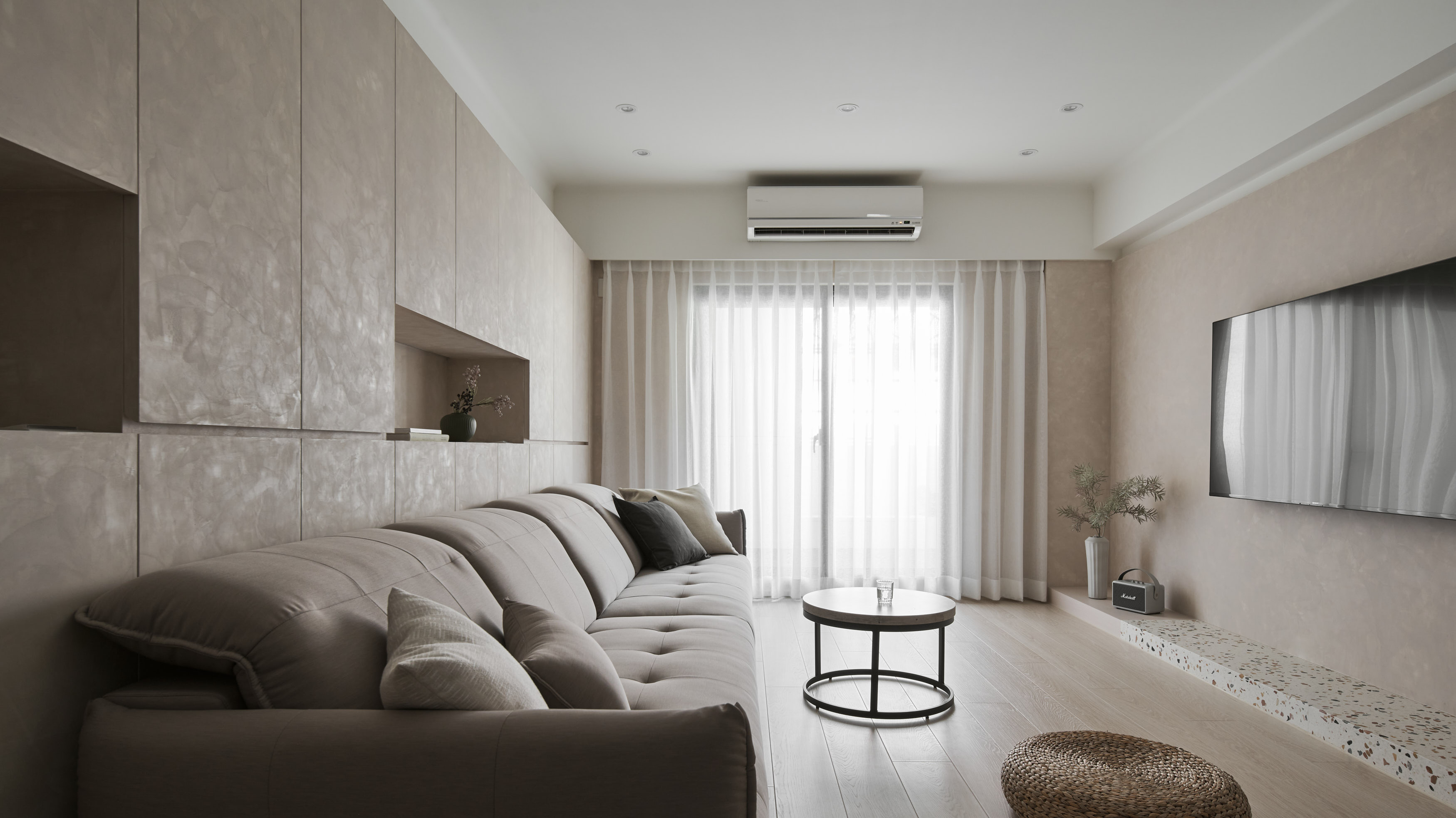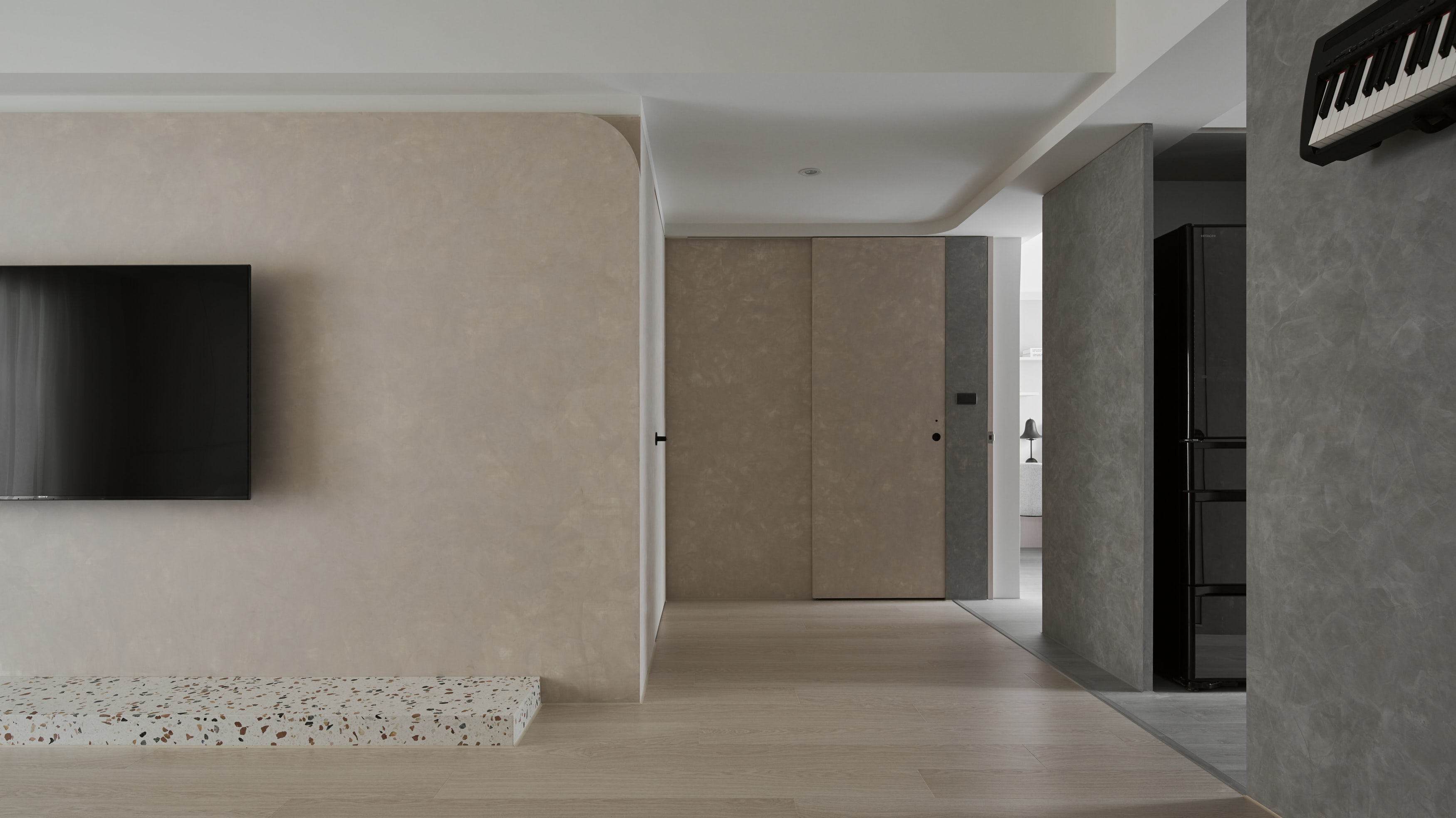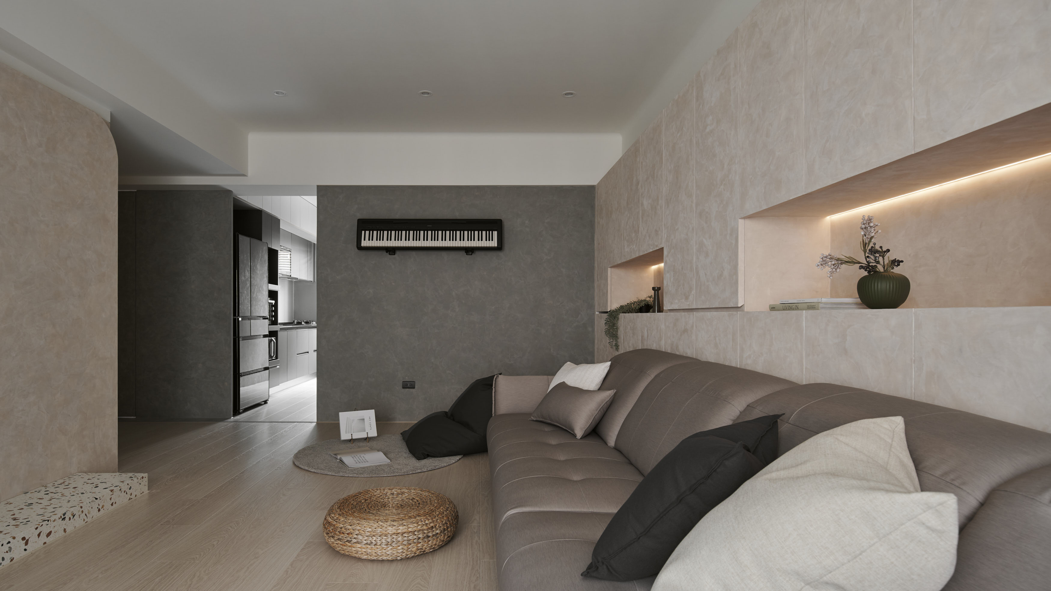 设计选材:電視主牆奶茶色塗料搭配水磨石檯面,營造復古和諧氛圍。廚房區域立面簡約展示,電子琴成為亮點,灰階調和原奶茶色,特殊紋理延伸,打造平衡和諧的雙色設計,不與設備衝突。