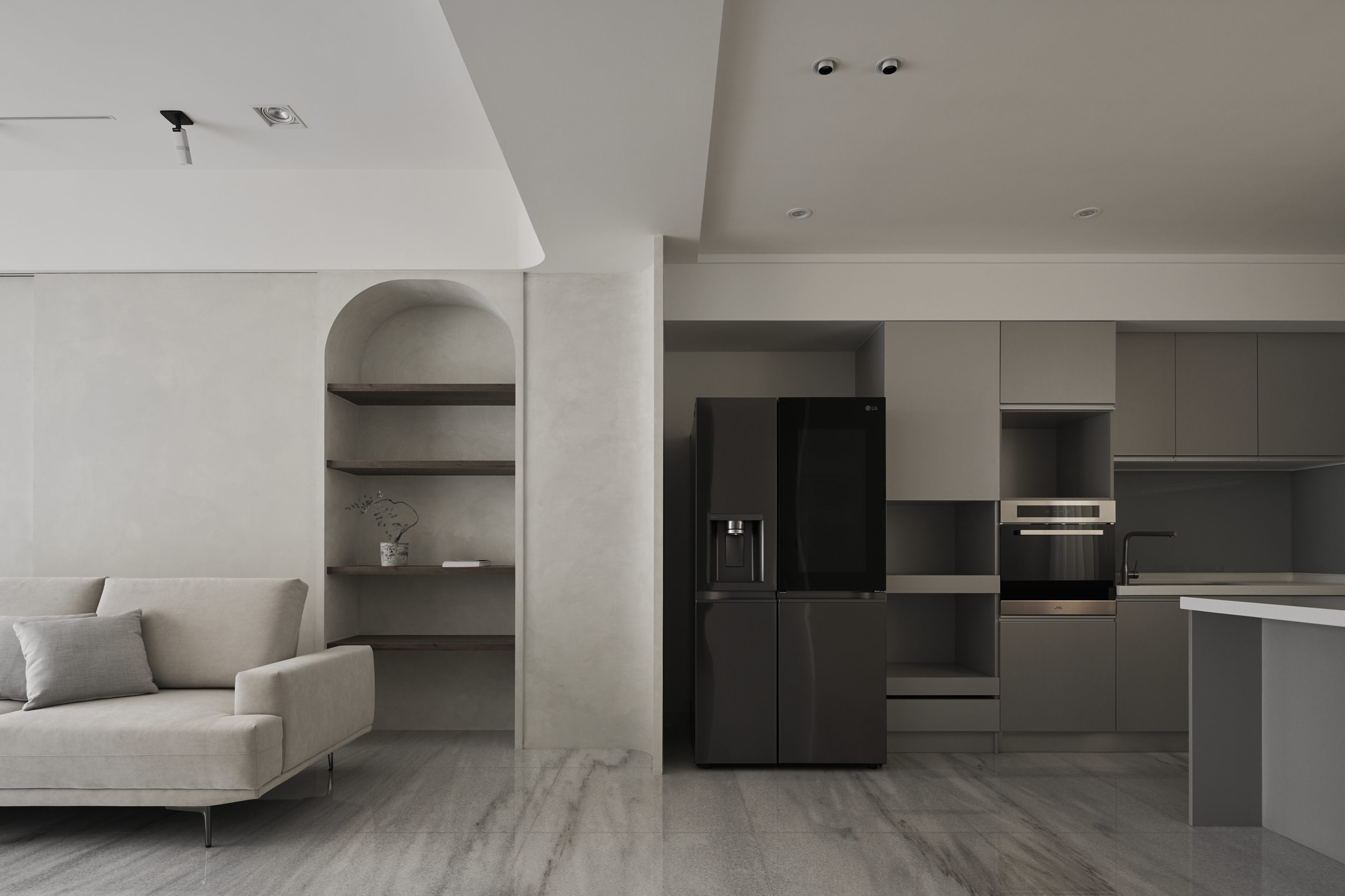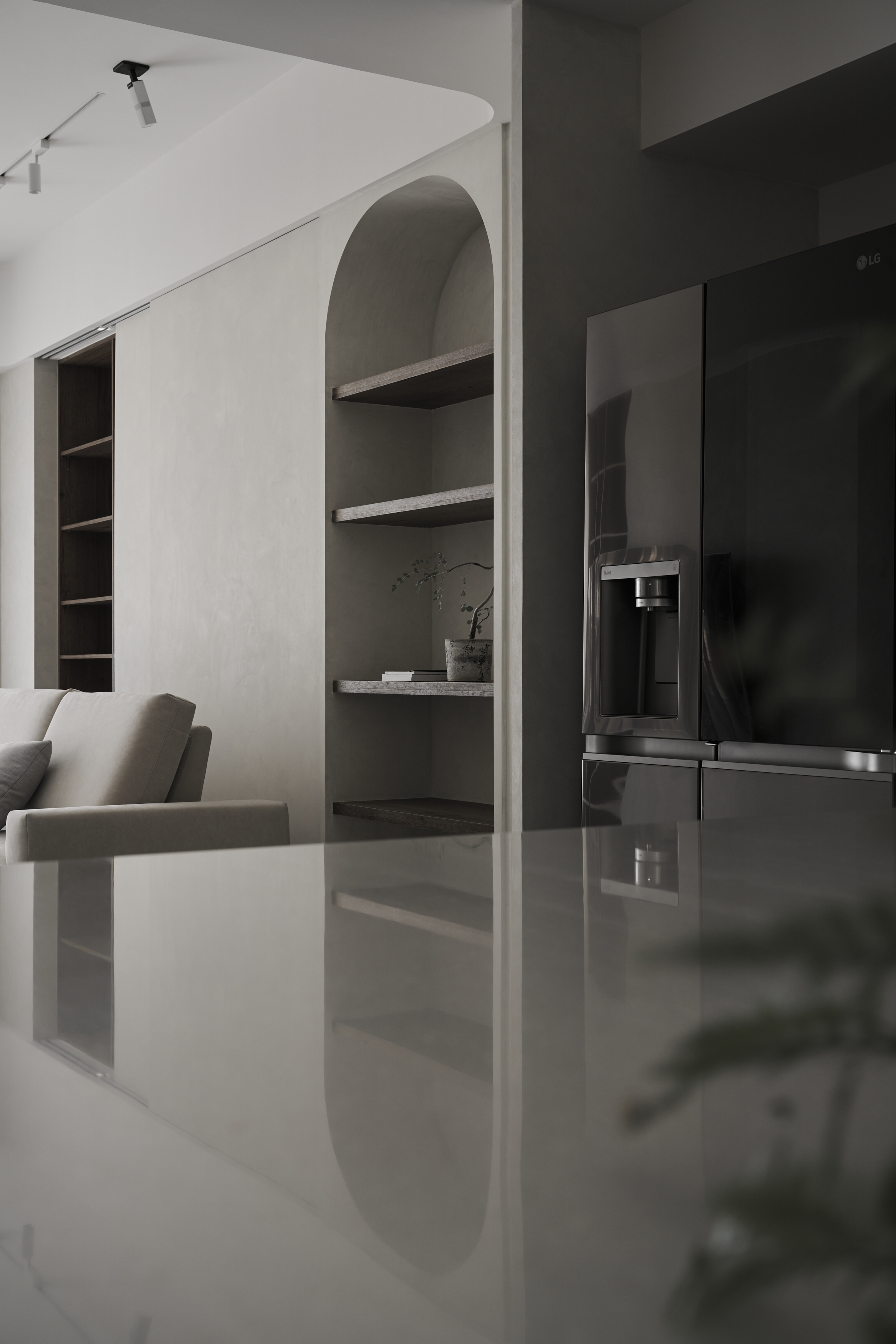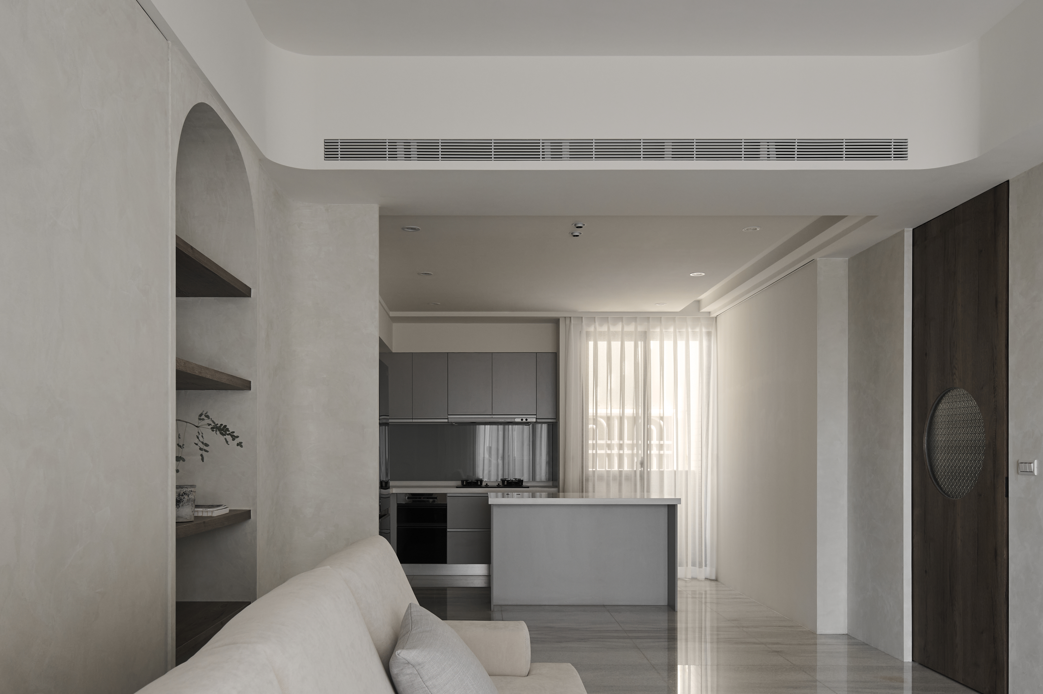 设计选材:公領域以灰調特殊漆鋪陳,透過沉穩色調為簡約、靜謐的居家氛圍奠定基礎沙發邊半弧形壁龕以木質為材,挹注日式侘寂語彙,而天花軌道燈挑高空間感,最後再搭配紗簾過篩的柔和光線,整體視覺更加溫潤