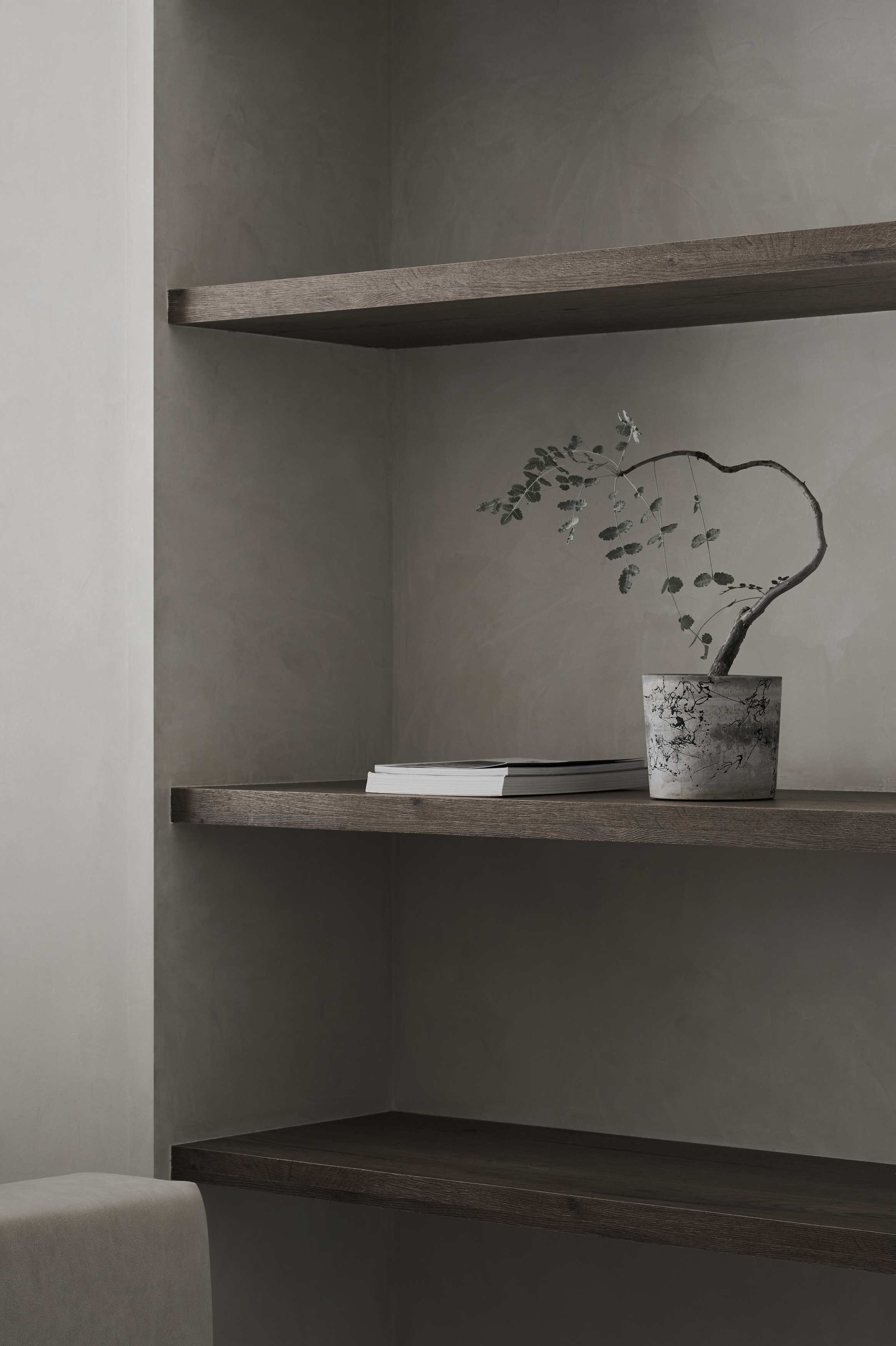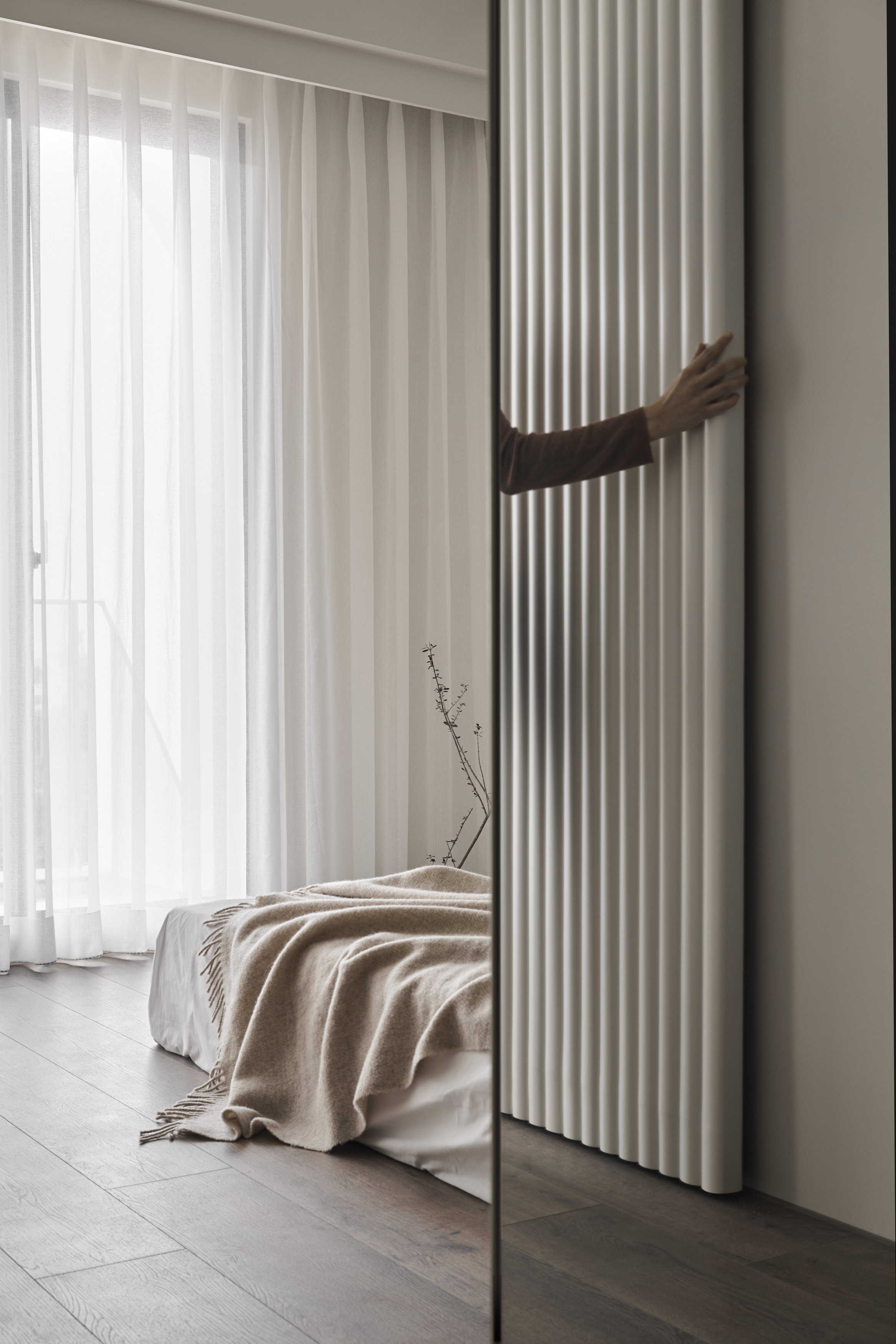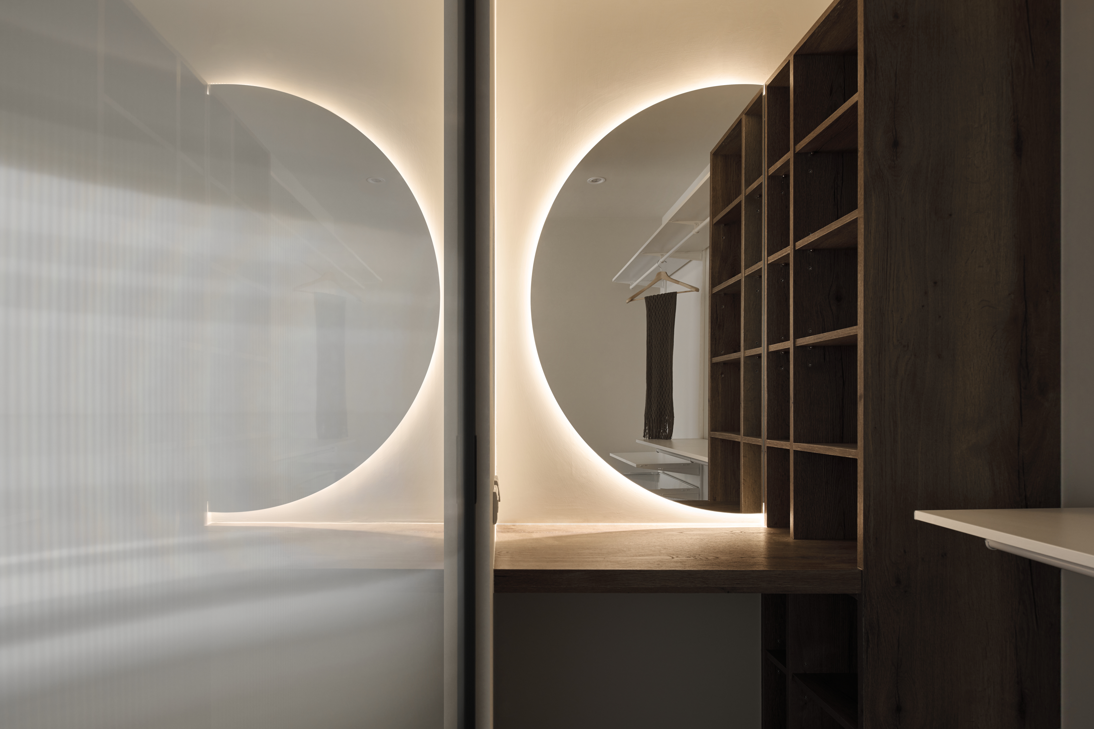 设计选材:公領域以灰調特殊漆鋪陳,透過沉穩色調為簡約、靜謐的居家氛圍奠定基礎沙發邊半弧形壁龕以木質為材,挹注日式侘寂語彙,而天花軌道燈挑高空間感,最後再搭配紗簾過篩的柔和光線,整體視覺更加溫潤