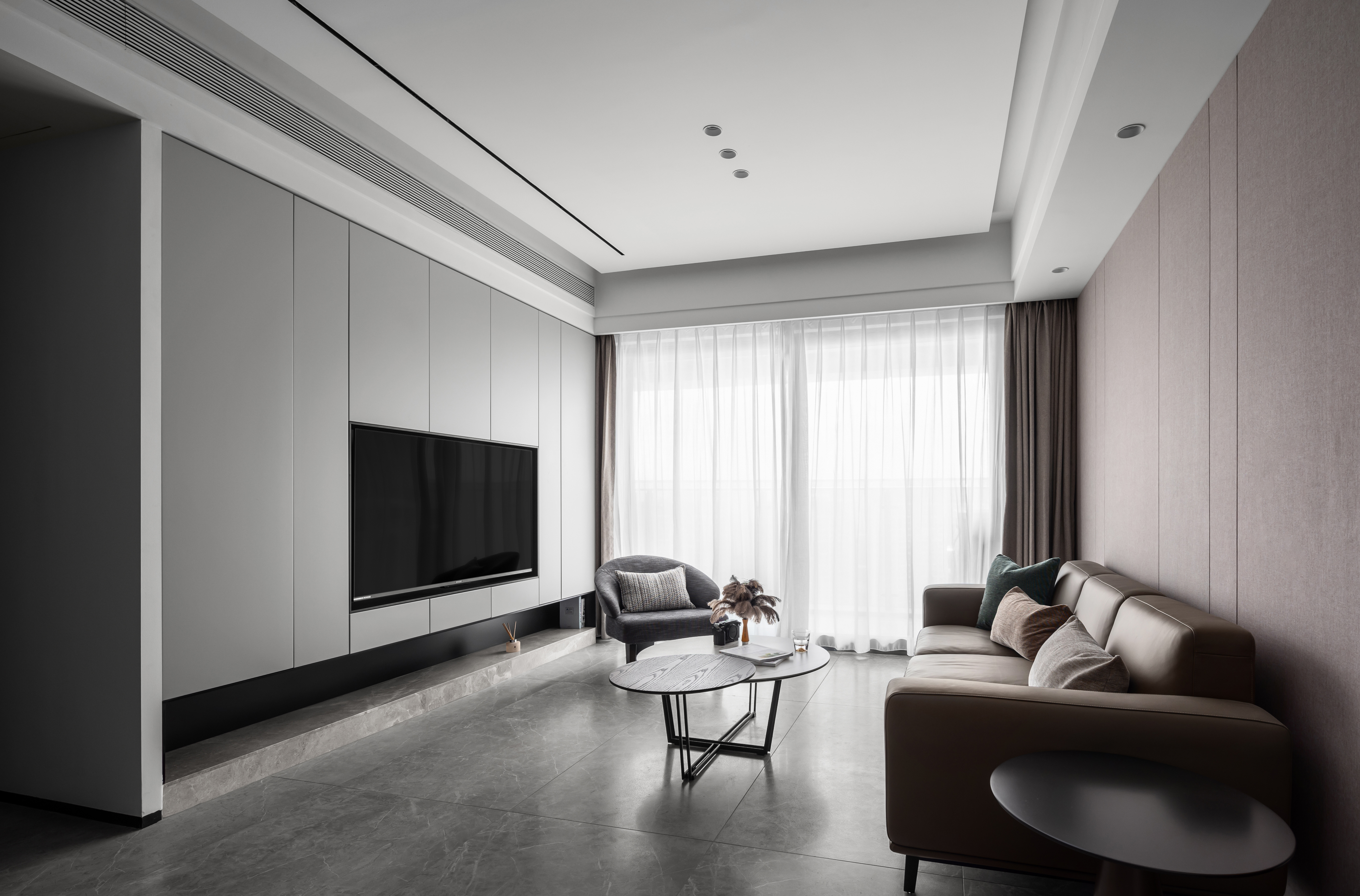 项目定位:黑白是光的两极,是日与夜,是至明与至暗。灰色作为黑白过渡,既有白色的优雅,又具黑色的高级。以折中的灰色做主调,用简洁的表现手法,帮助人们摆脱繁琐、复杂,空间也由此产生静心、启扉、拭目之效。