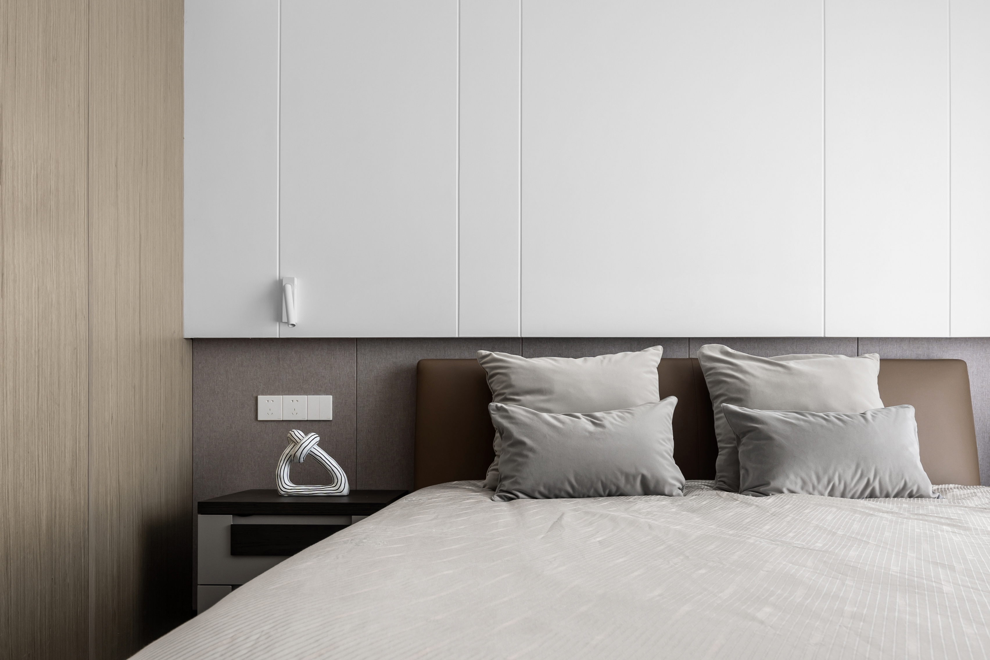 设计选材:刷漆的石膏板搭配硬包材质做出背景墙,墙面上下分段设计,材质与色彩的对照,形成层次感更加丰富的空间形貌。大尺幅窗户视觉上拓宽主卧格局,充分将阳光、绿植引入,实现居住空间与自然空间的互通共融。
