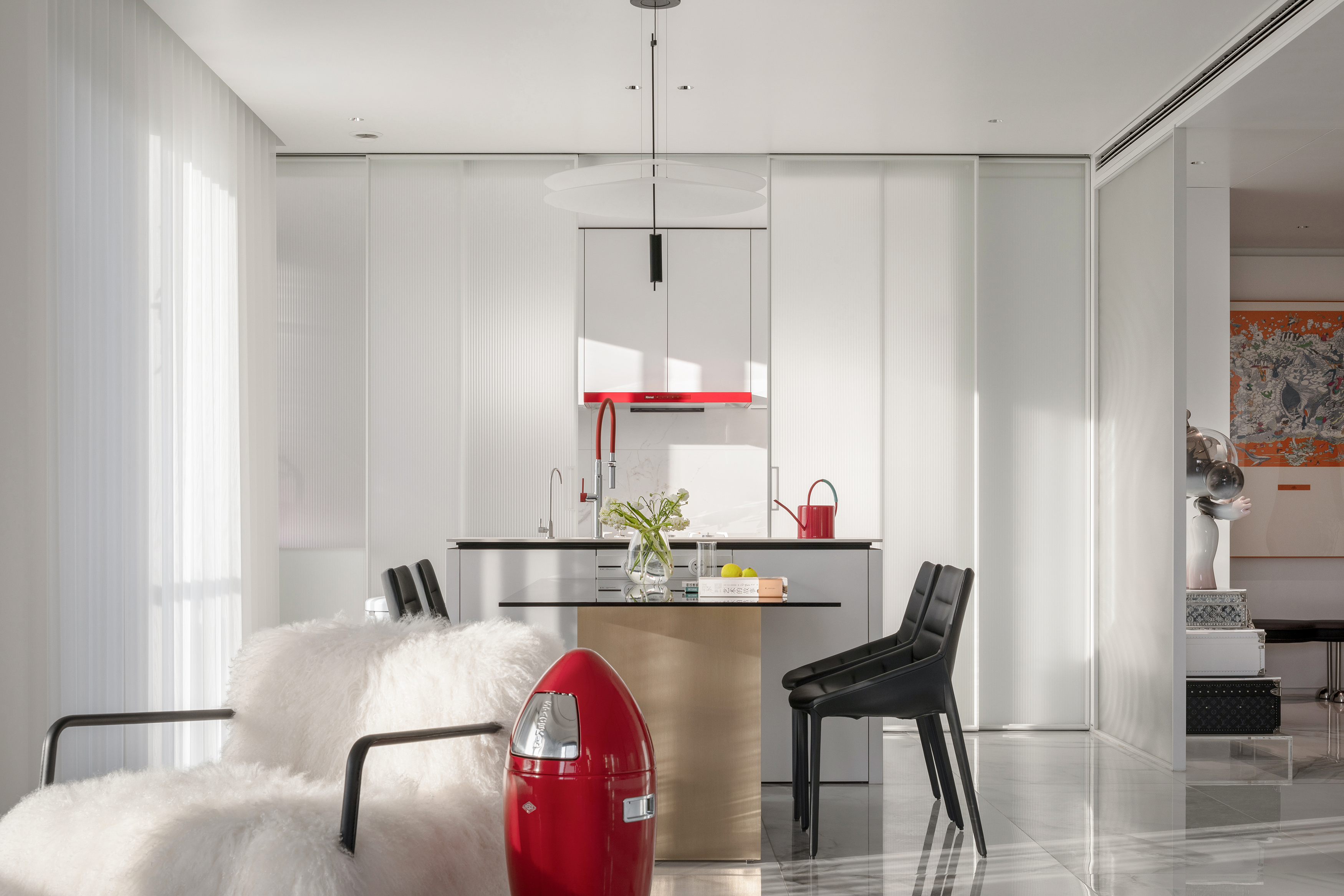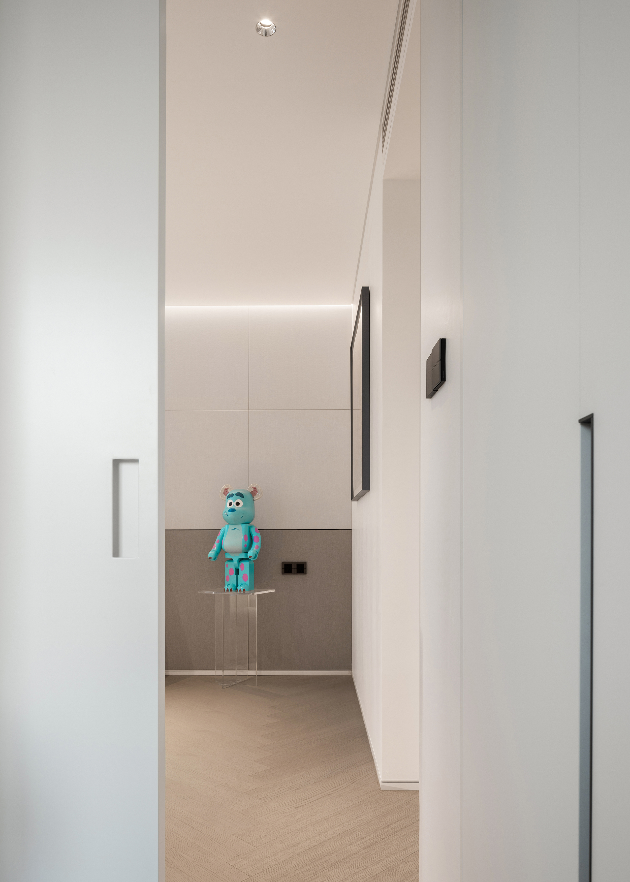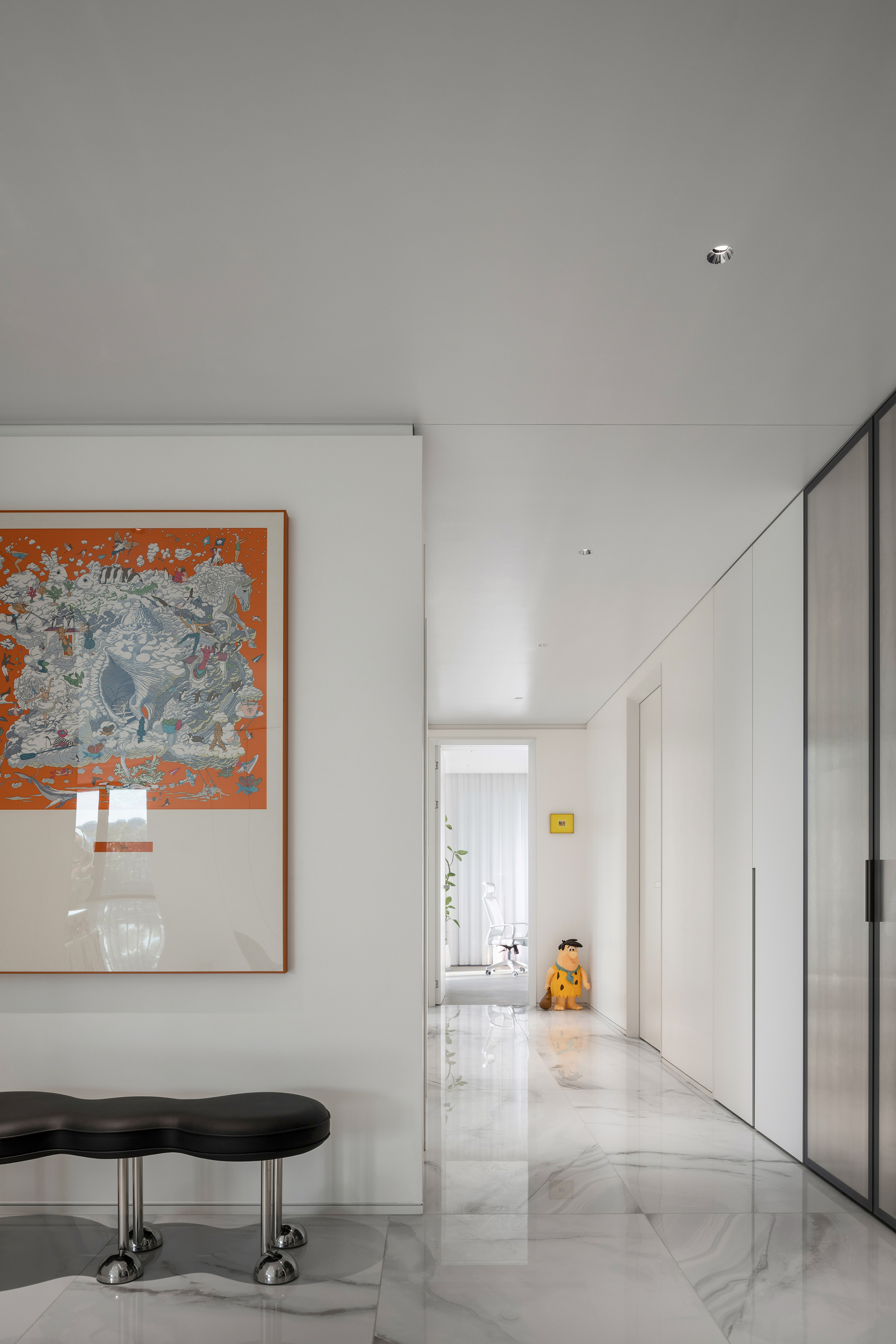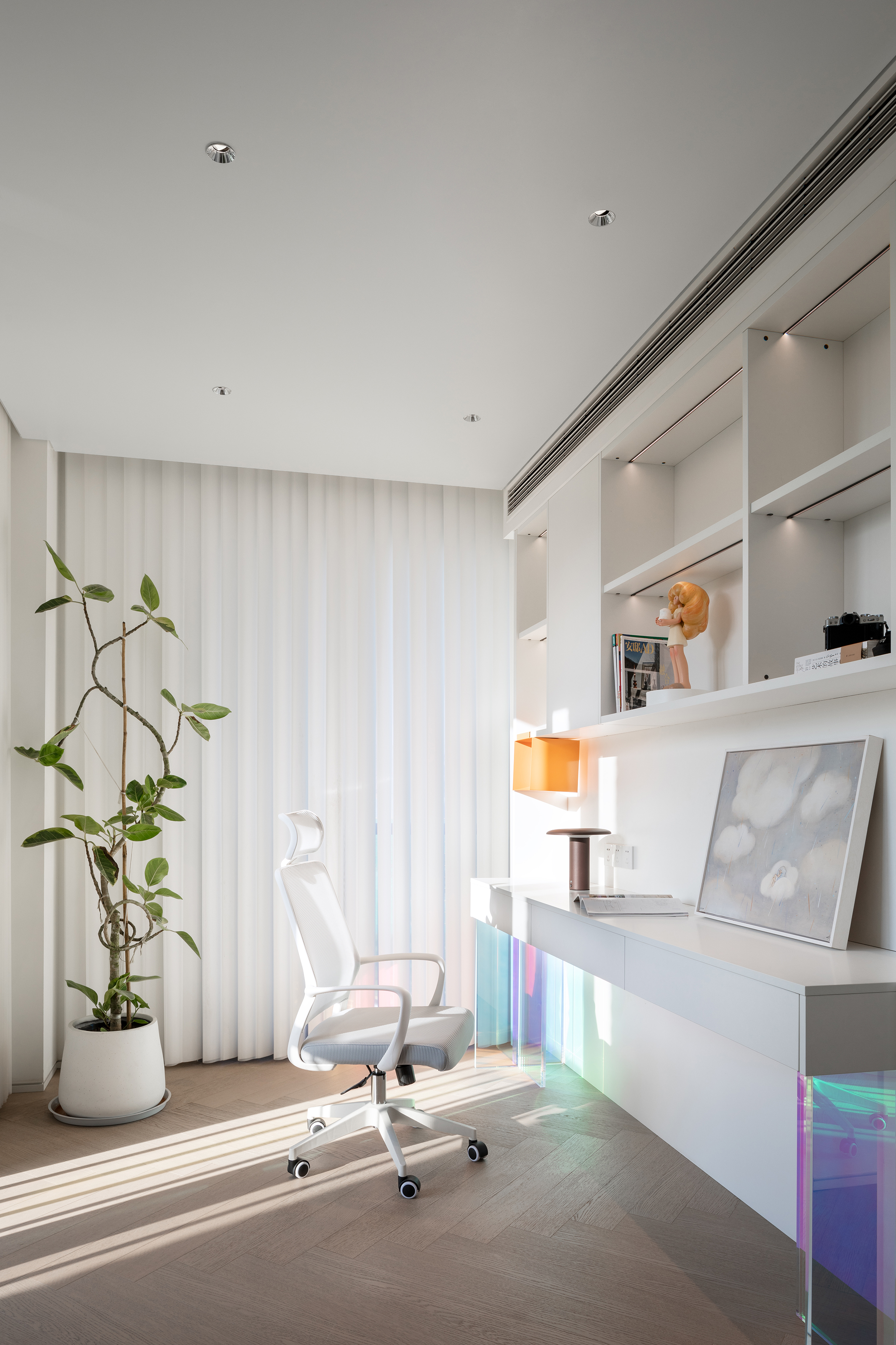 空间白色为基调,以光为主要元素,融入空间里面。以一抹抹艳丽的颜色,洒入空间,让空间有起伏,有节奏,有变化。