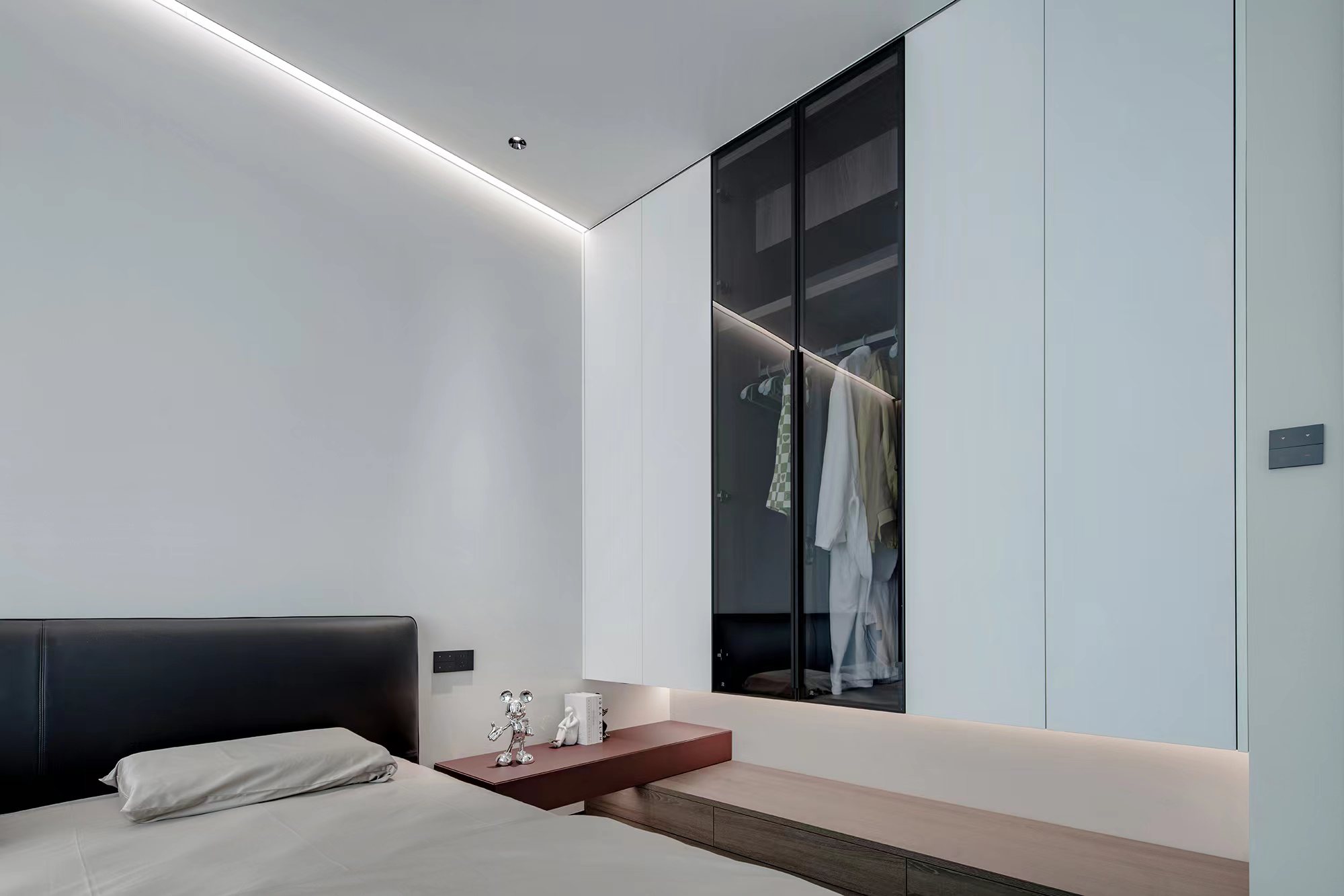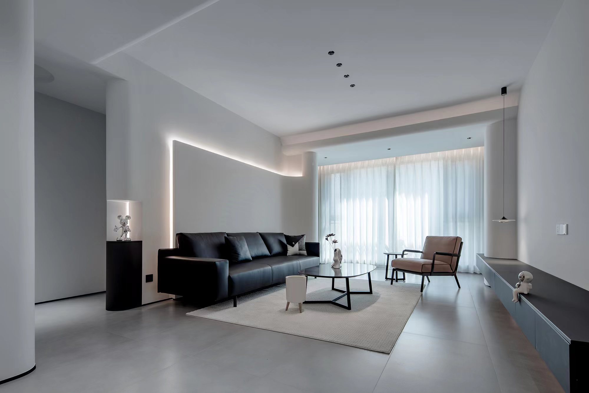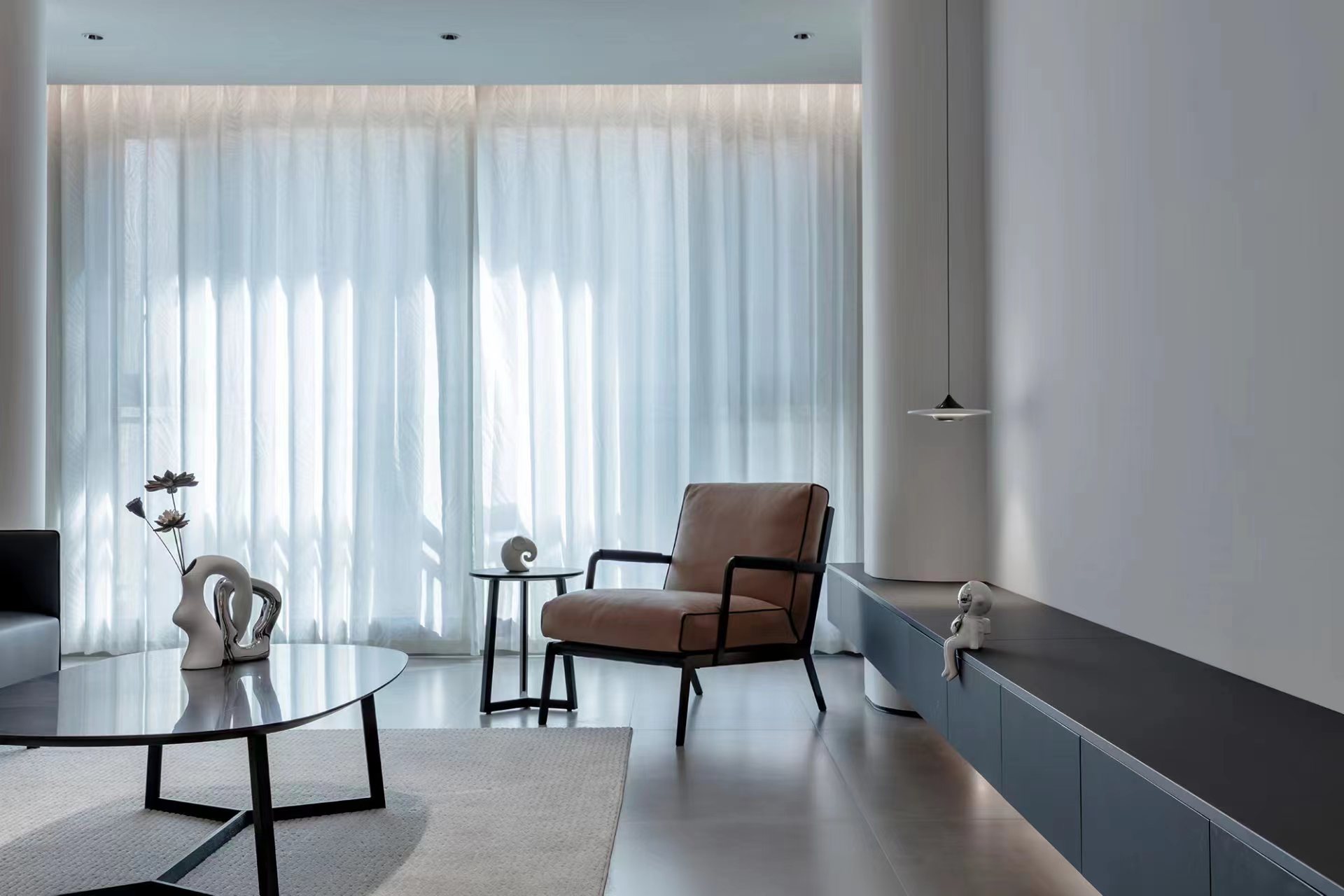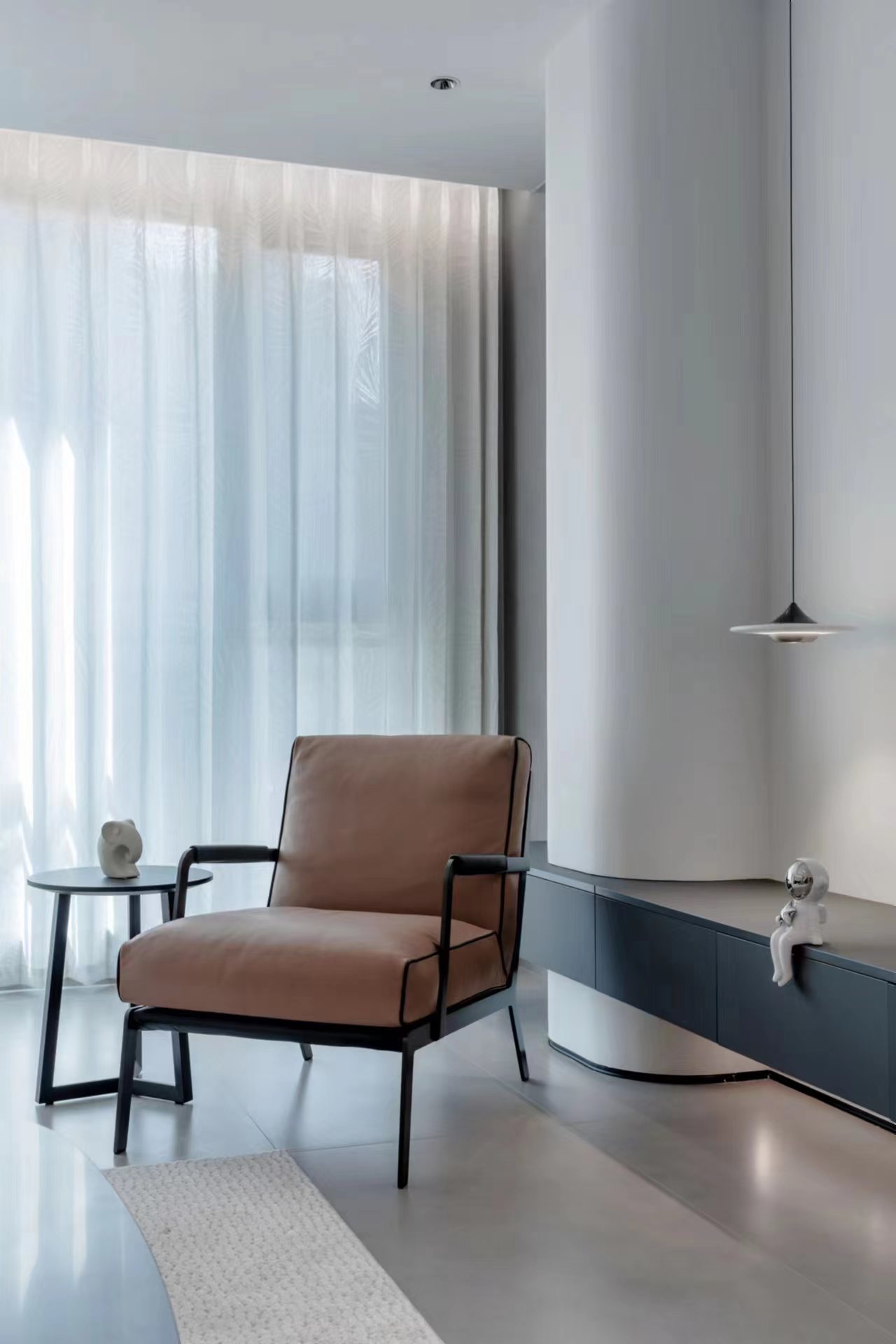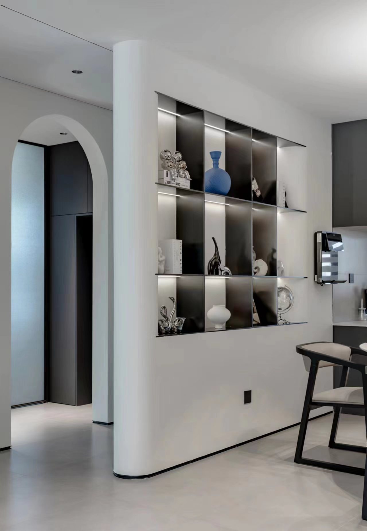 空间布局:我们从业主需求出发,应用曲面弧线减弱空间的压迫感,通过改造扩大空间利用率,增加储物空间,在定制及家具我们都做了系统性设计,达到空间干净,储物大,又不失简约的美感