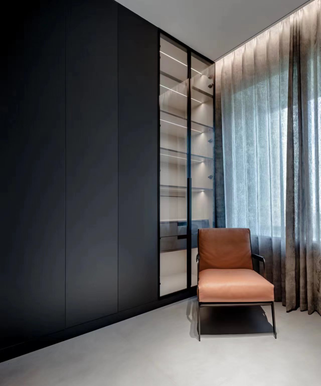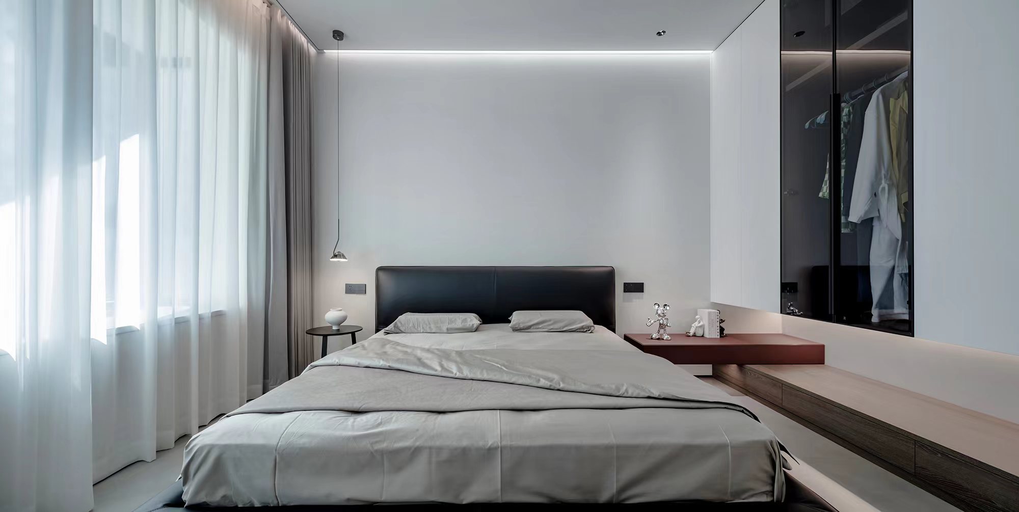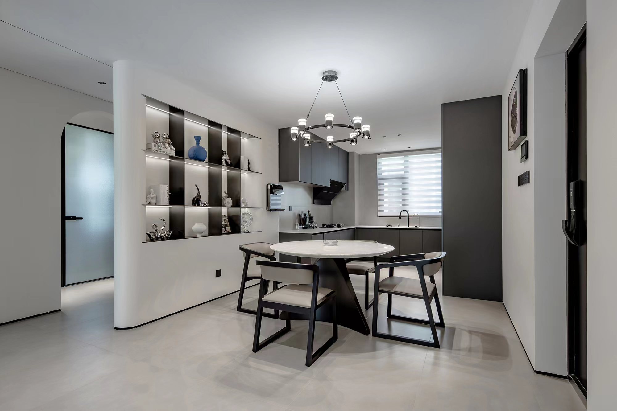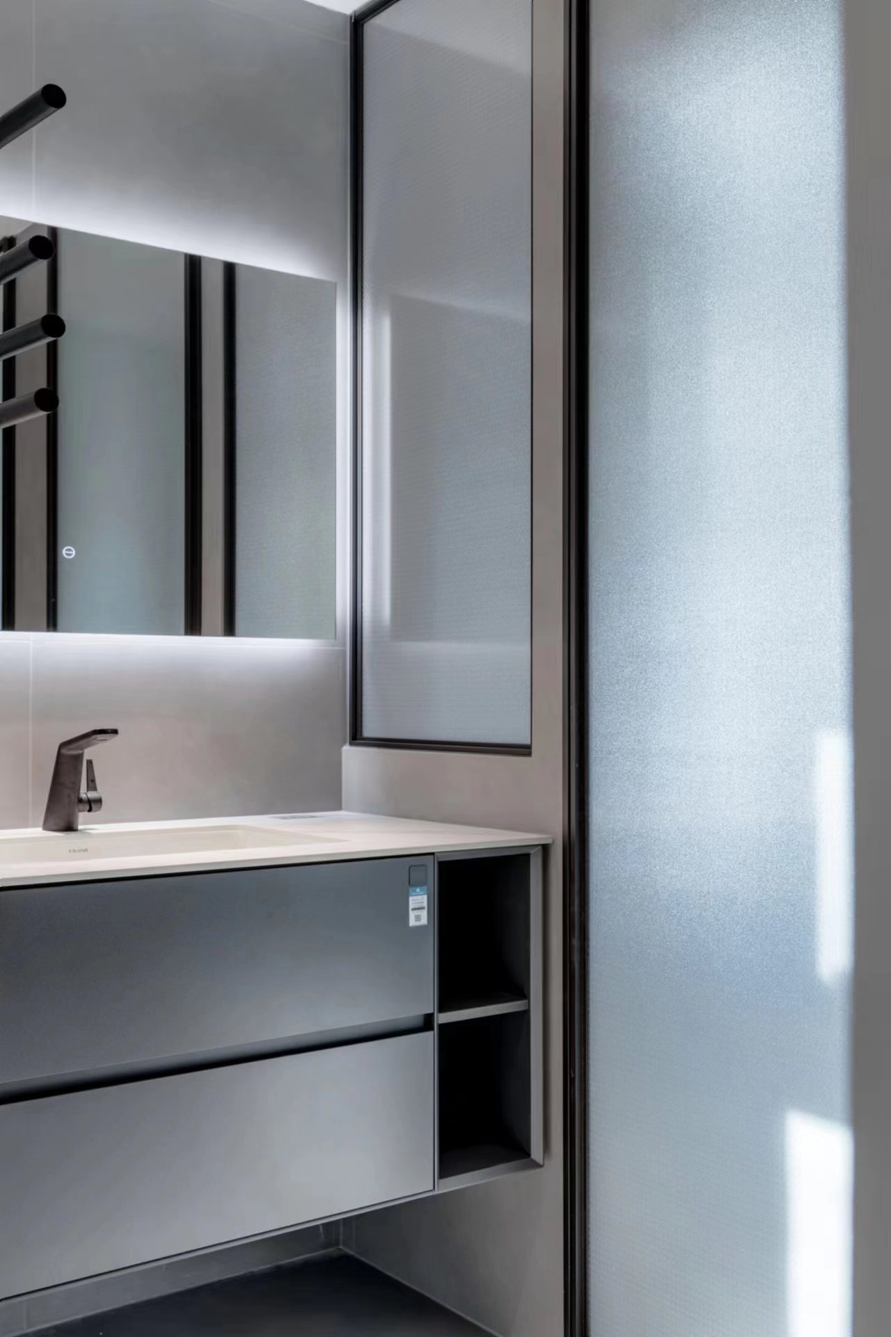 空间布局:我们从业主需求出发,应用曲面弧线减弱空间的压迫感,通过改造扩大空间利用率,增加储物空间,在定制及家具我们都做了系统性设计,达到空间干净,储物大,又不失简约的美感