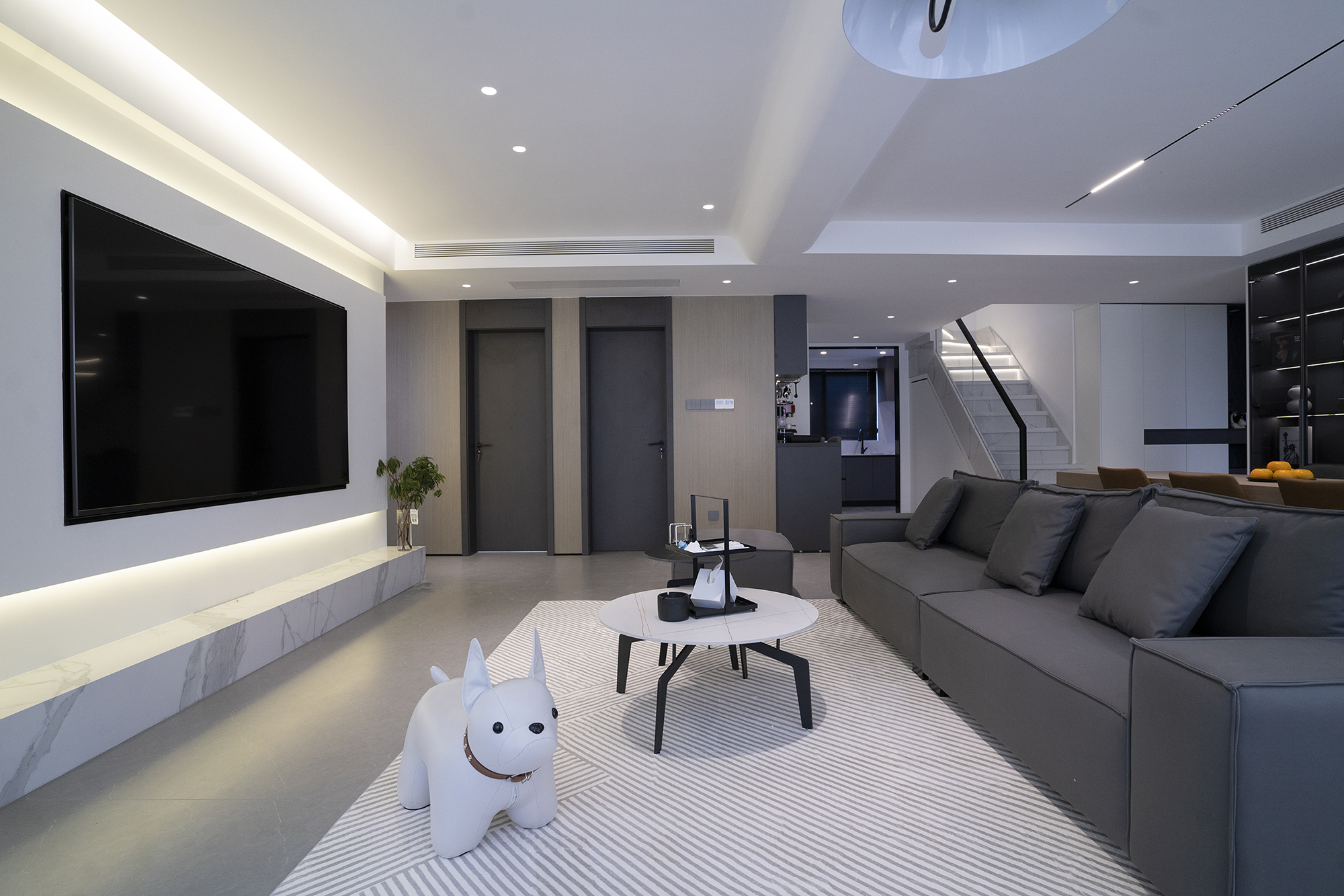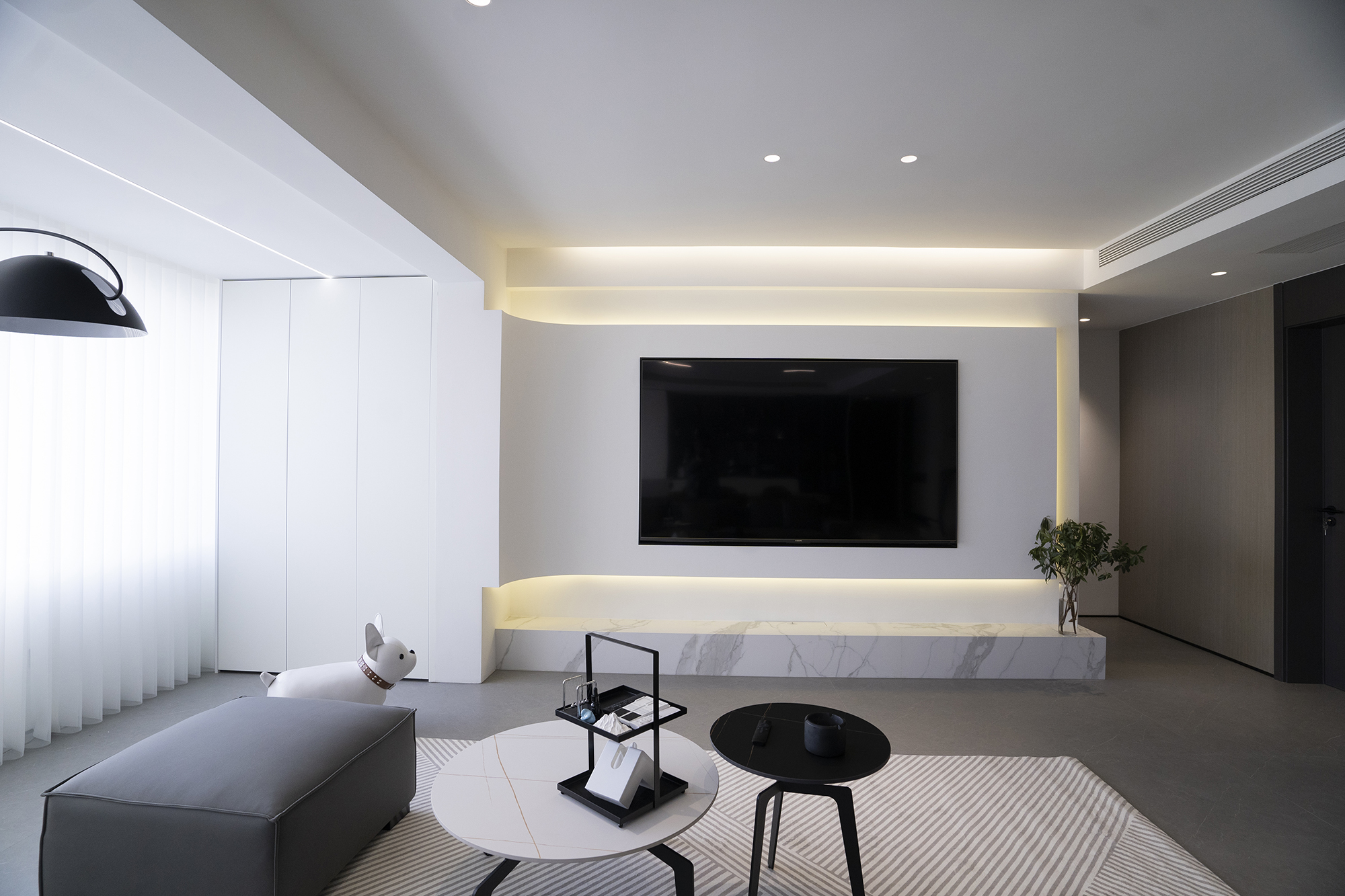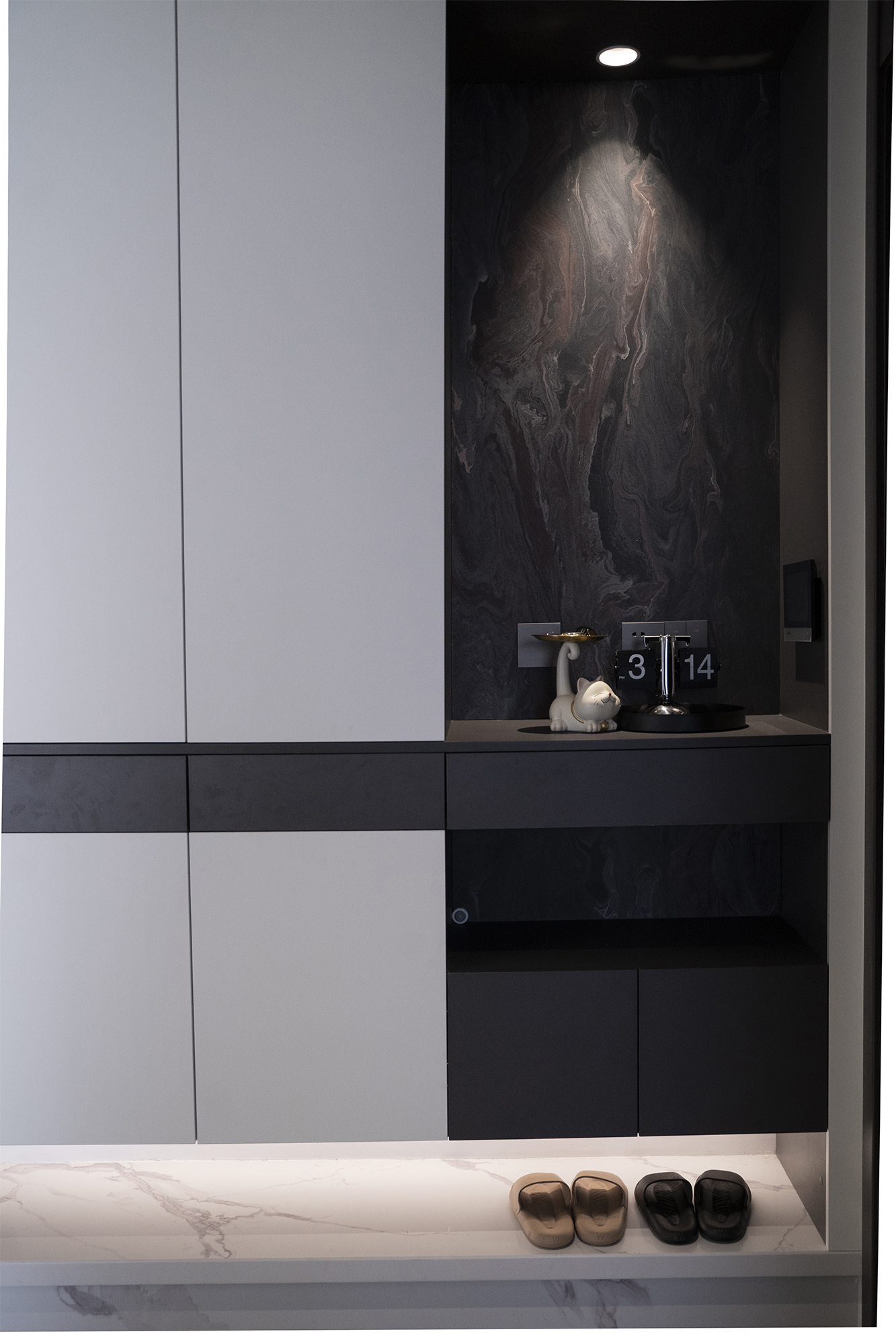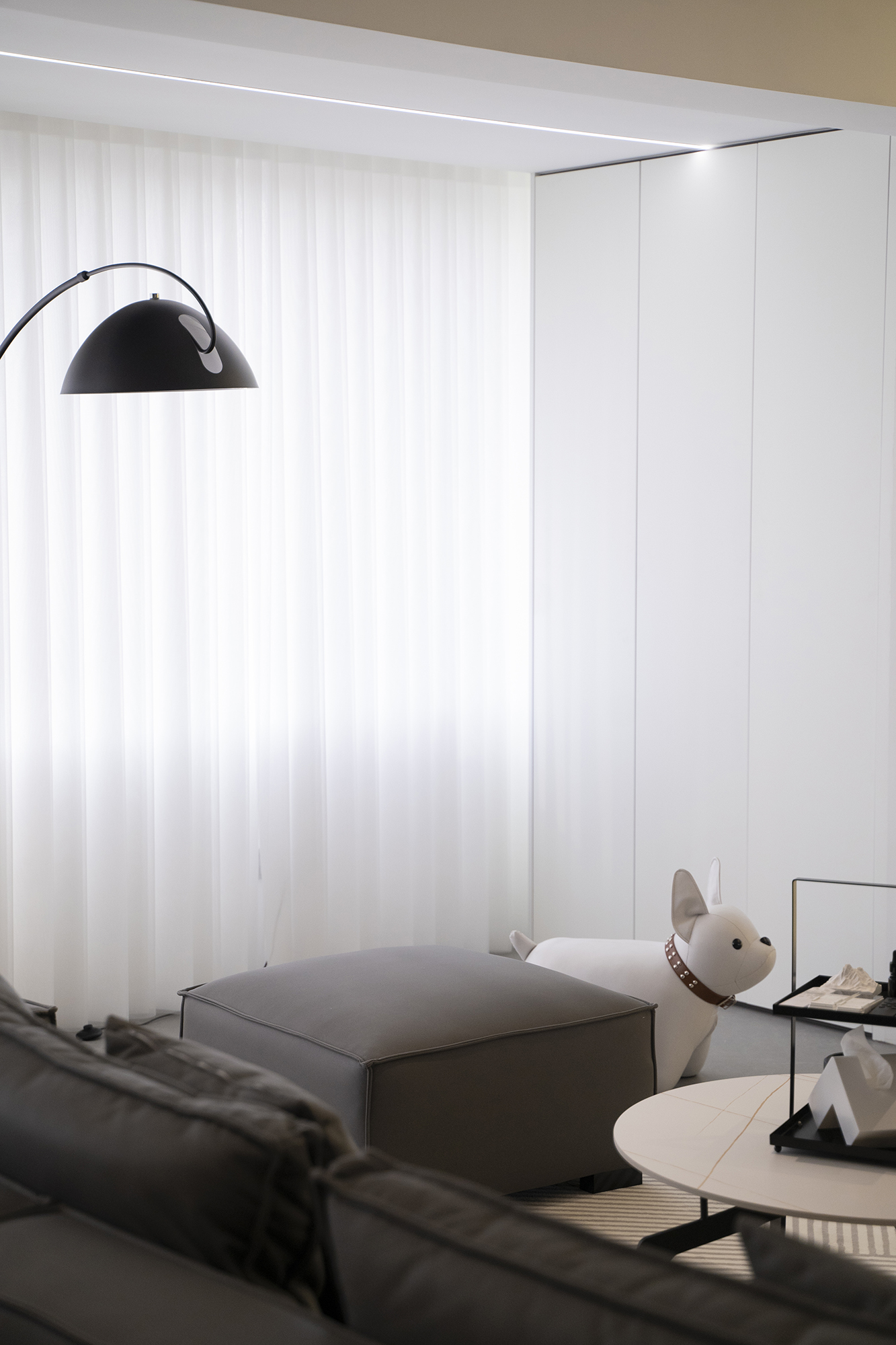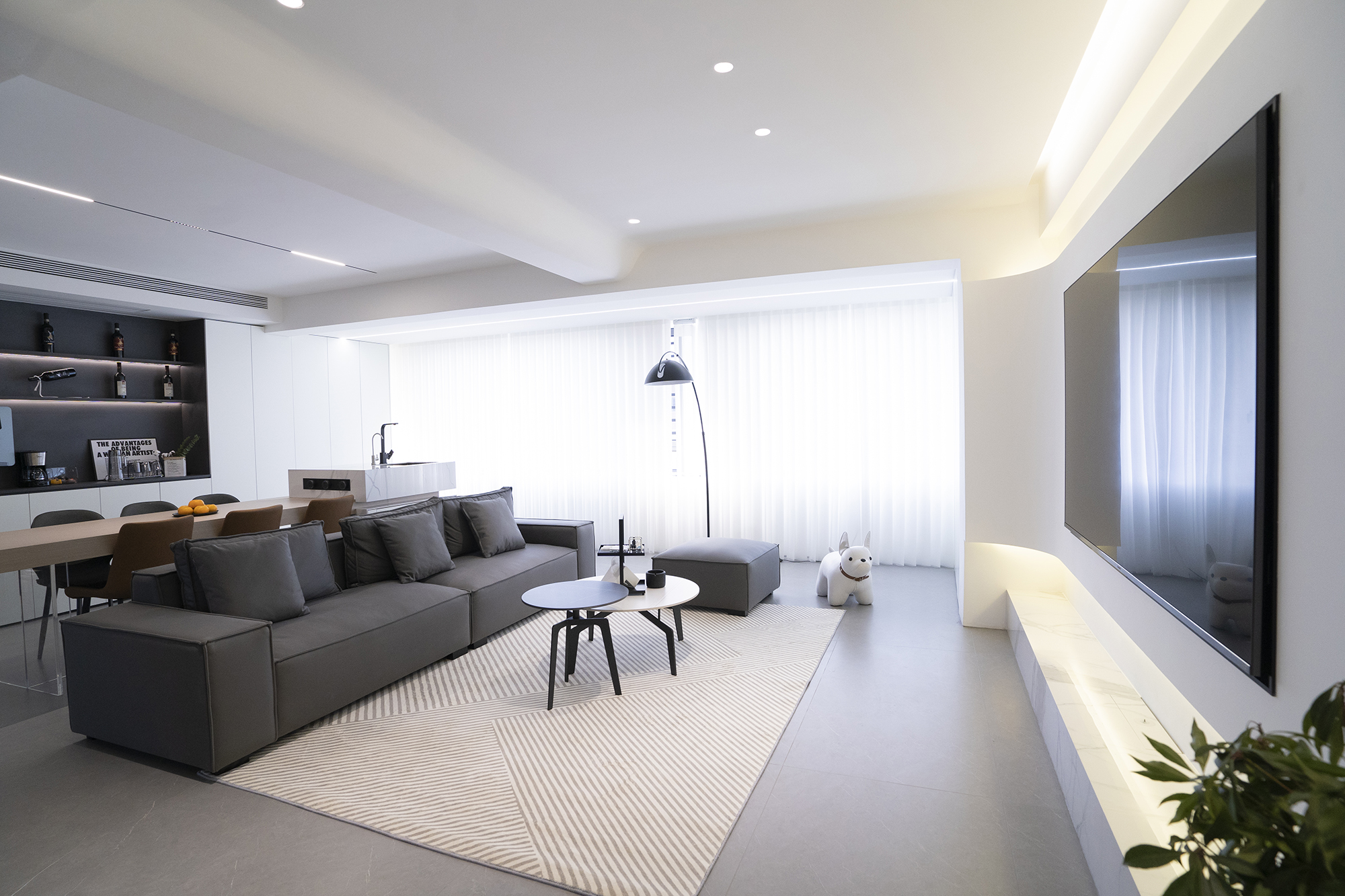 空间意境:干净、简单是业主的诉求。设计中运用点、线、面的穿插,让整个空间层次有度;整体空间以黑、白、灰为主基调,搭配少量木纹,使得整个空间粗中有细。多元的材质,细腻的表达,质感与氛围感十足。