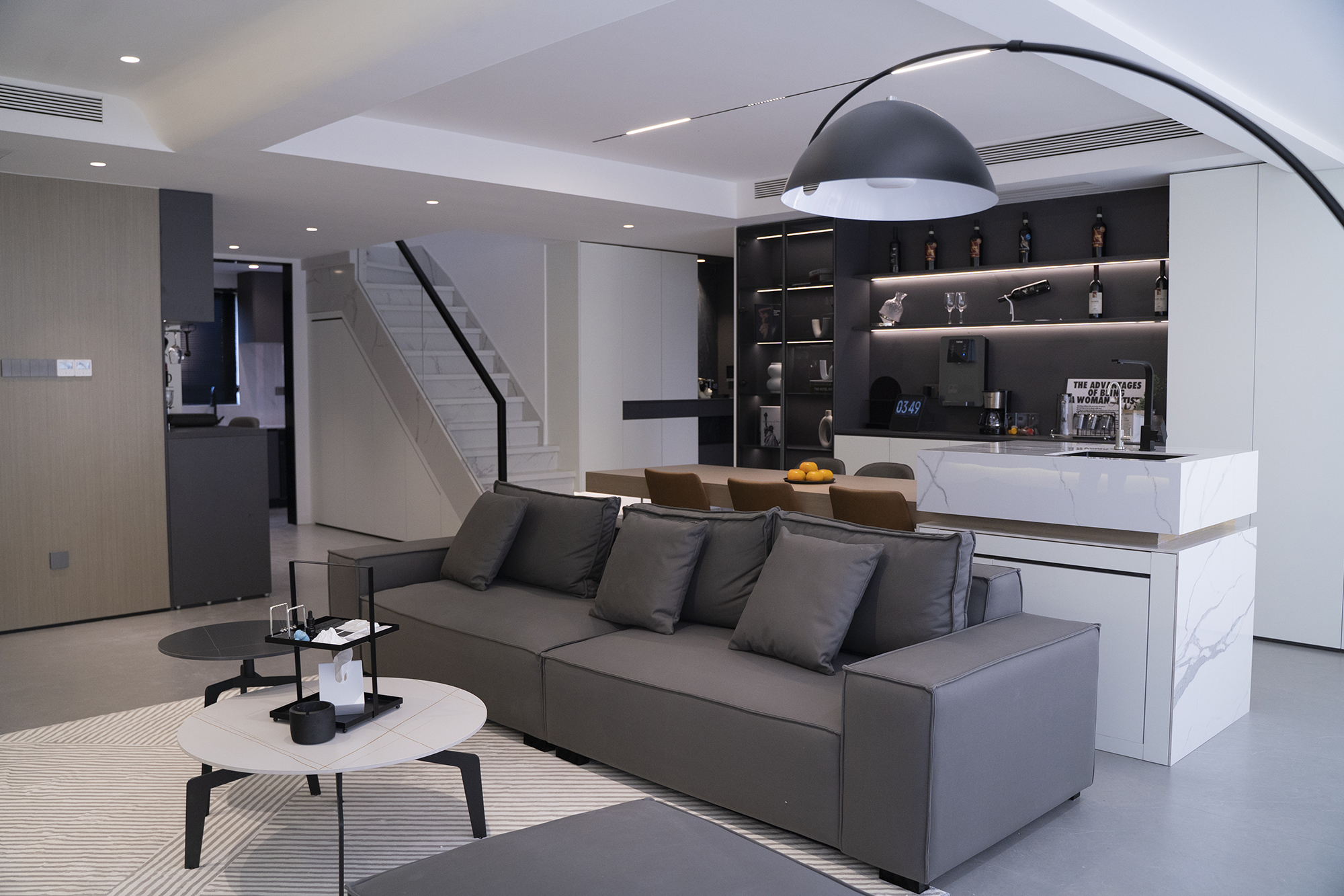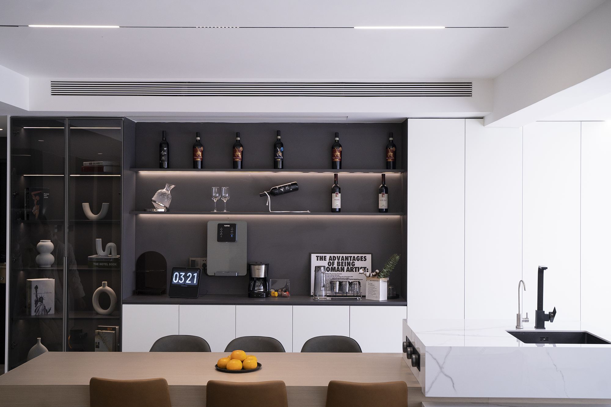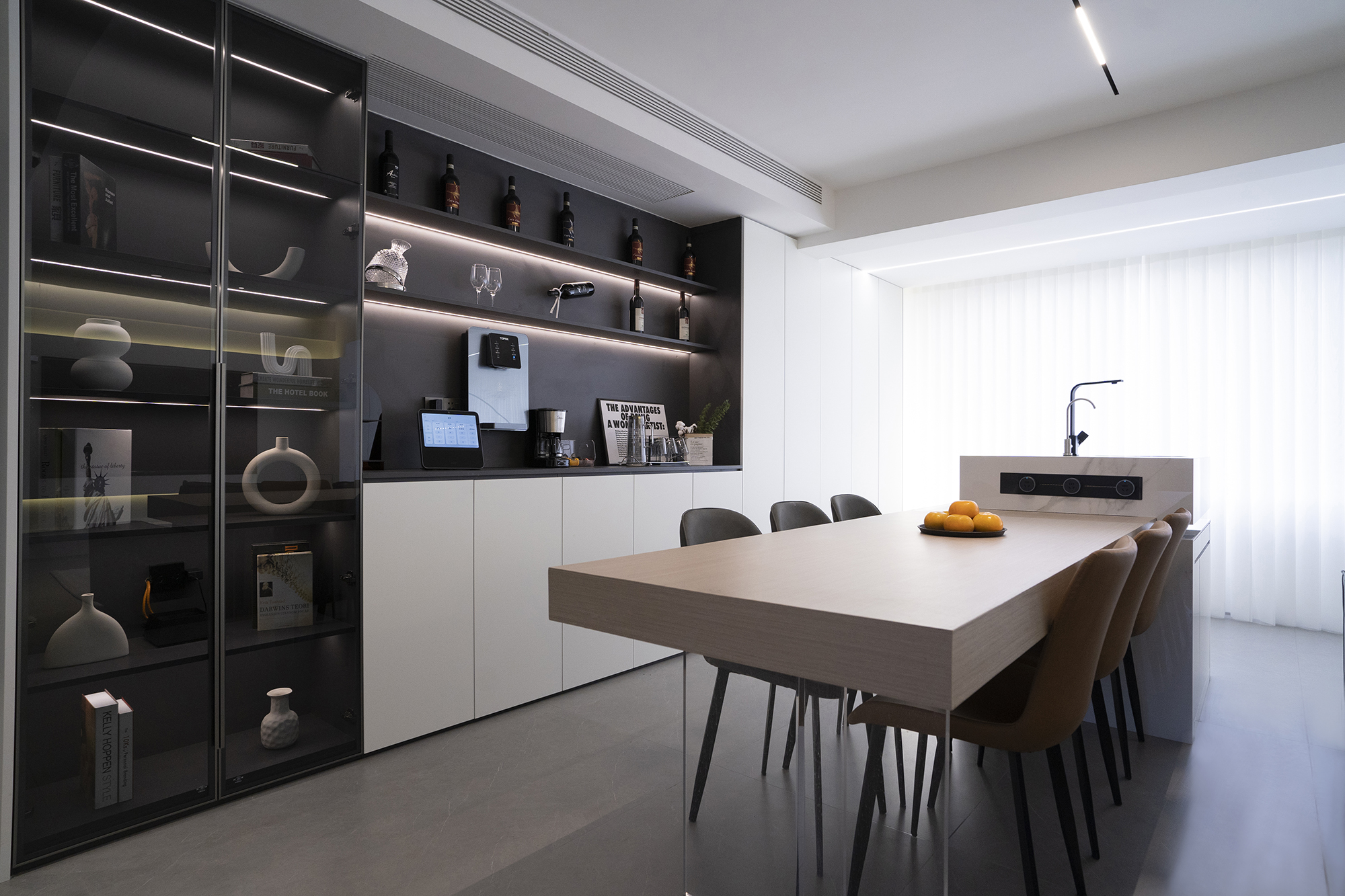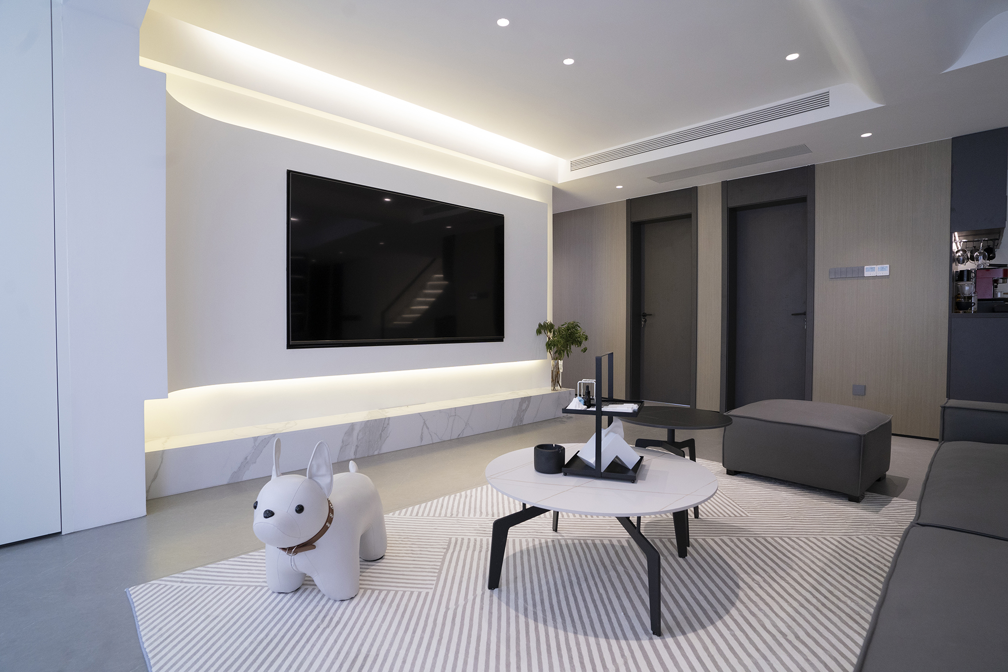 空间意境:干净、简单是业主的诉求。设计中运用点、线、面的穿插,让整个空间层次有度;整体空间以黑、白、灰为主基调,搭配少量木纹,使得整个空间粗中有细。多元的材质,细腻的表达,质感与氛围感十足。