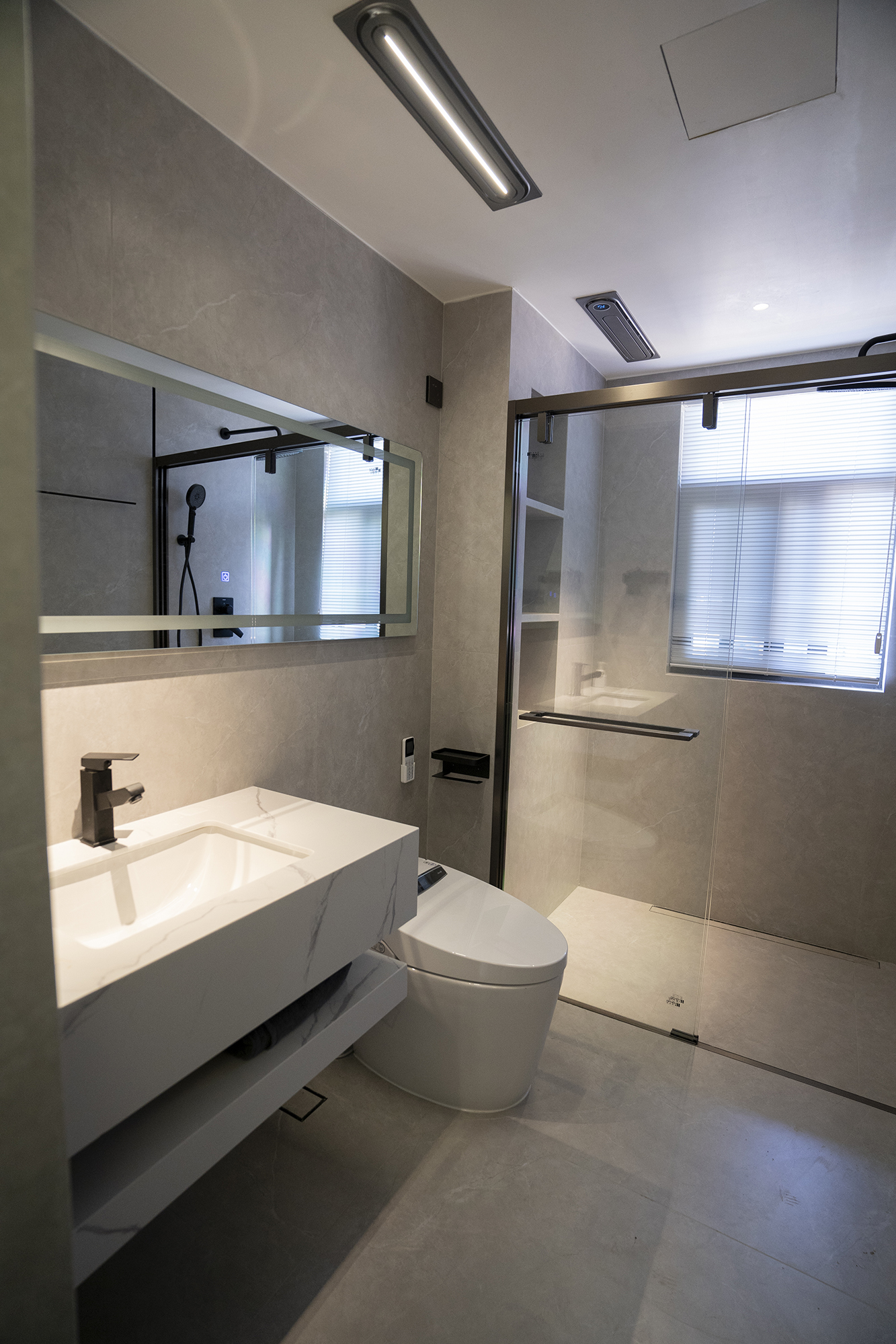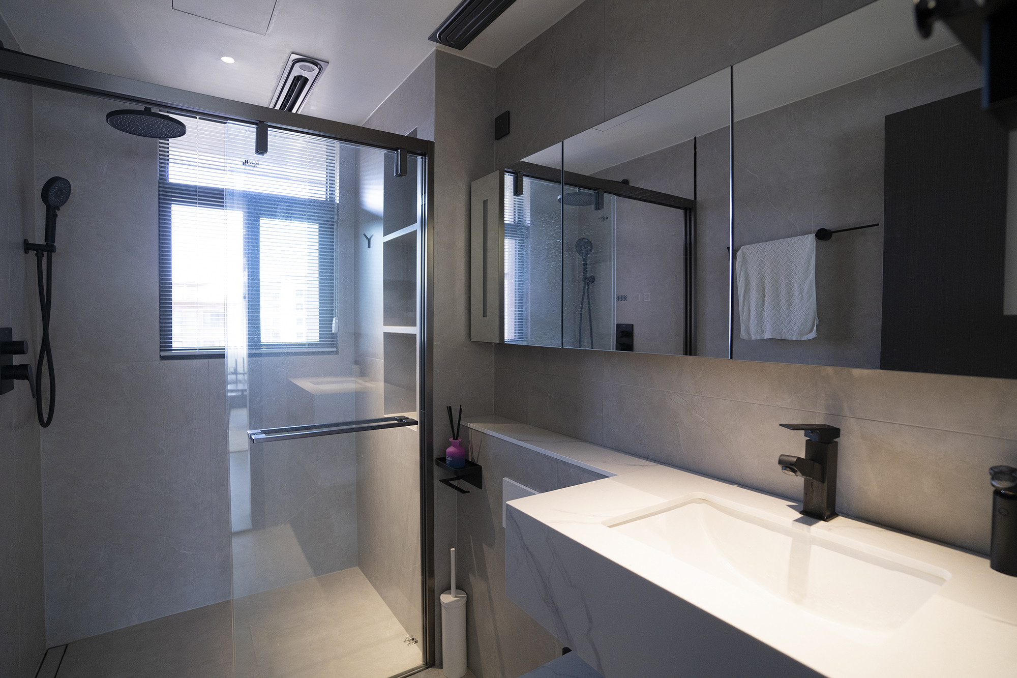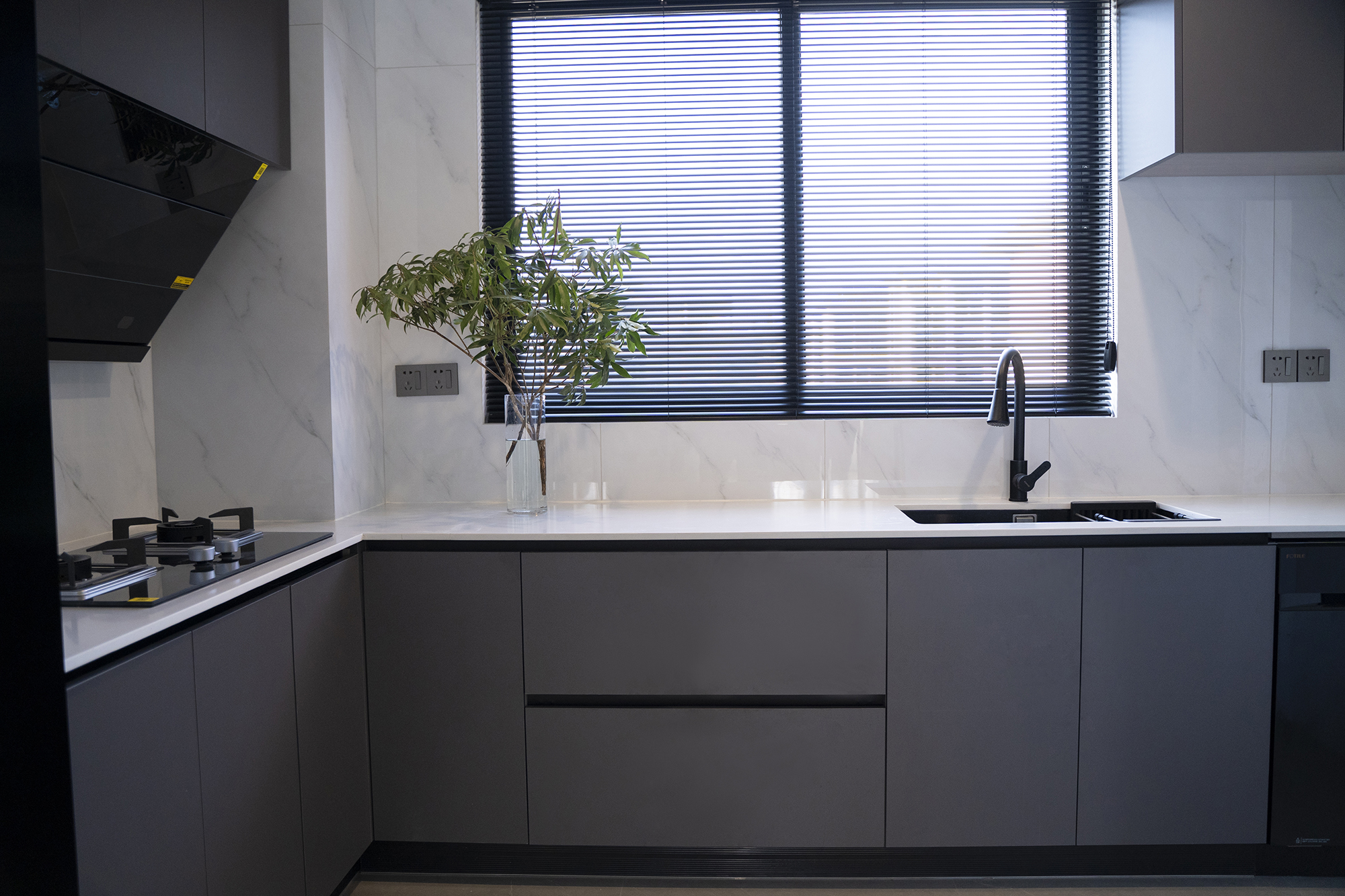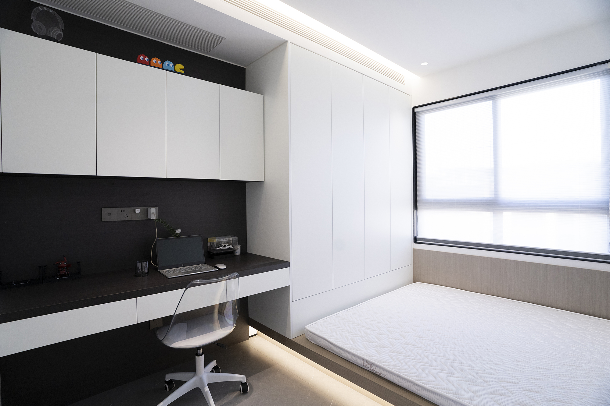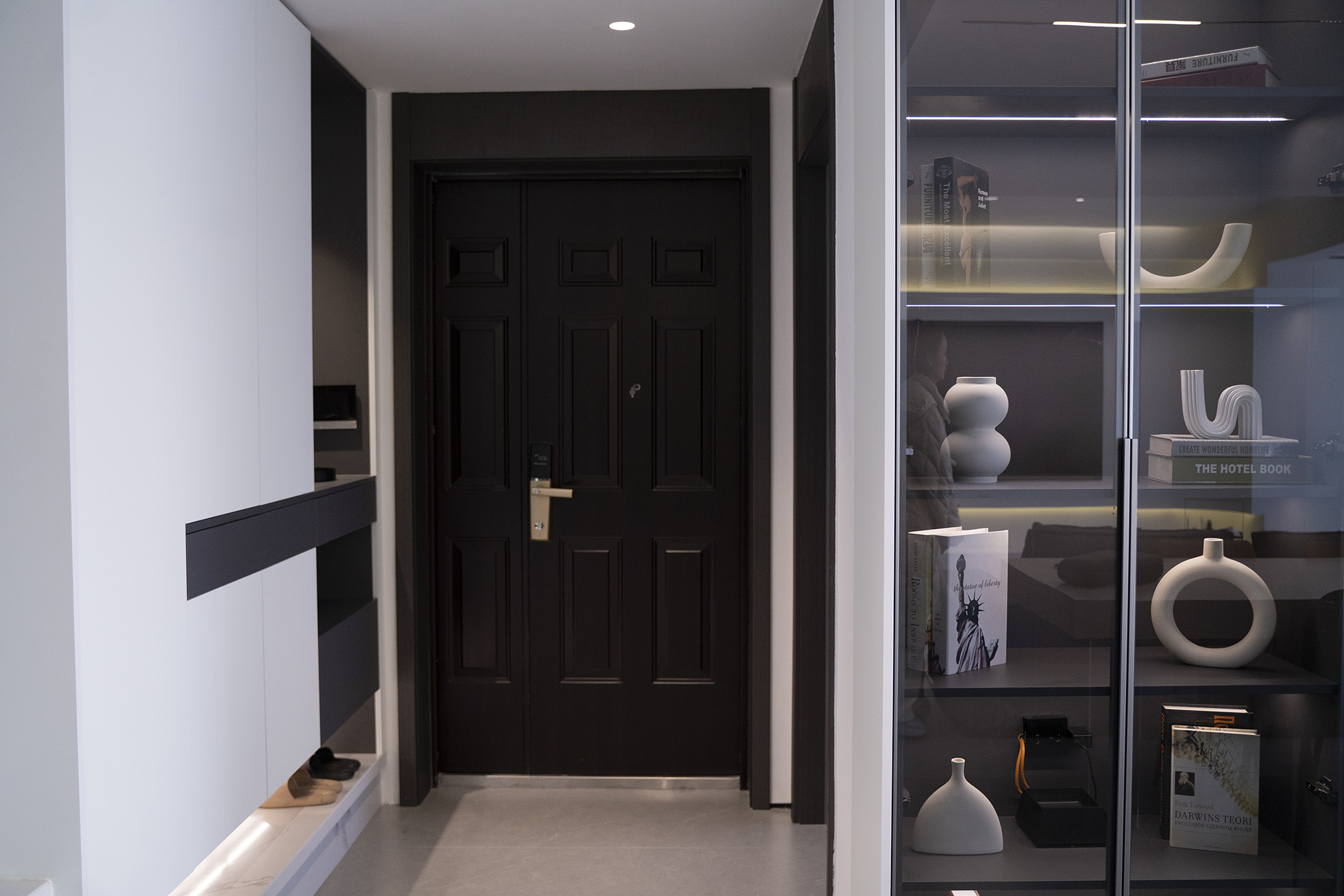 空间意境:干净、简单是业主的诉求。设计中运用点、线、面的穿插,让整个空间层次有度;整体空间以黑、白、灰为主基调,搭配少量木纹,使得整个空间粗中有细。多元的材质,细腻的表达,质感与氛围感十足。