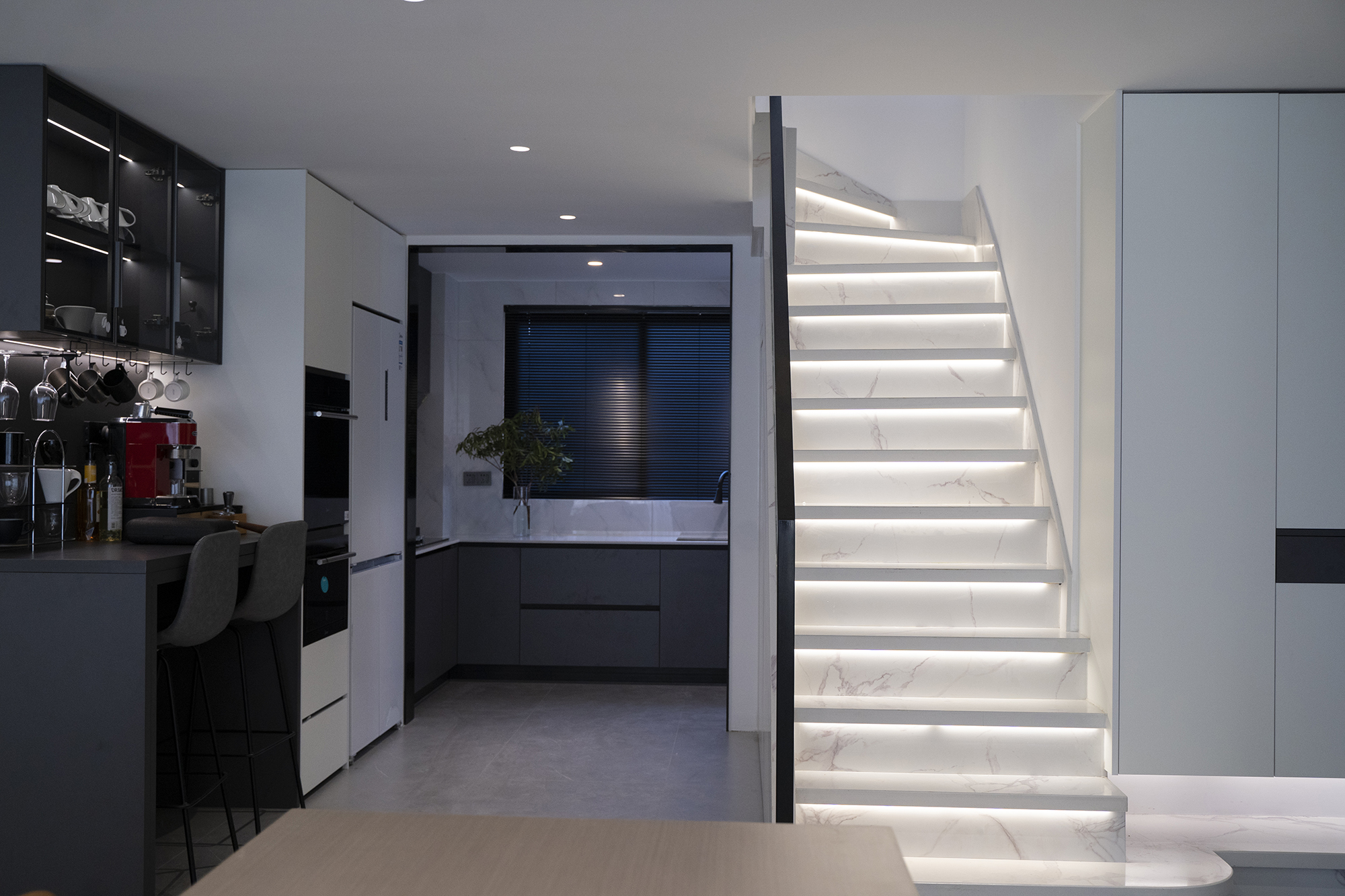 空间布局:户型设计四房改三房,将原来餐厅的区域设计成楼梯间+咖啡角,拆掉的一个房间划分成会客厅,原本户型客厅区域作为餐厅使用,竖厅变横厅,使得公共区域视觉感受大平层的既视感。多元的灯光组合,让空间的照明方式更加灵动多变,可以对应不同的生活场景。