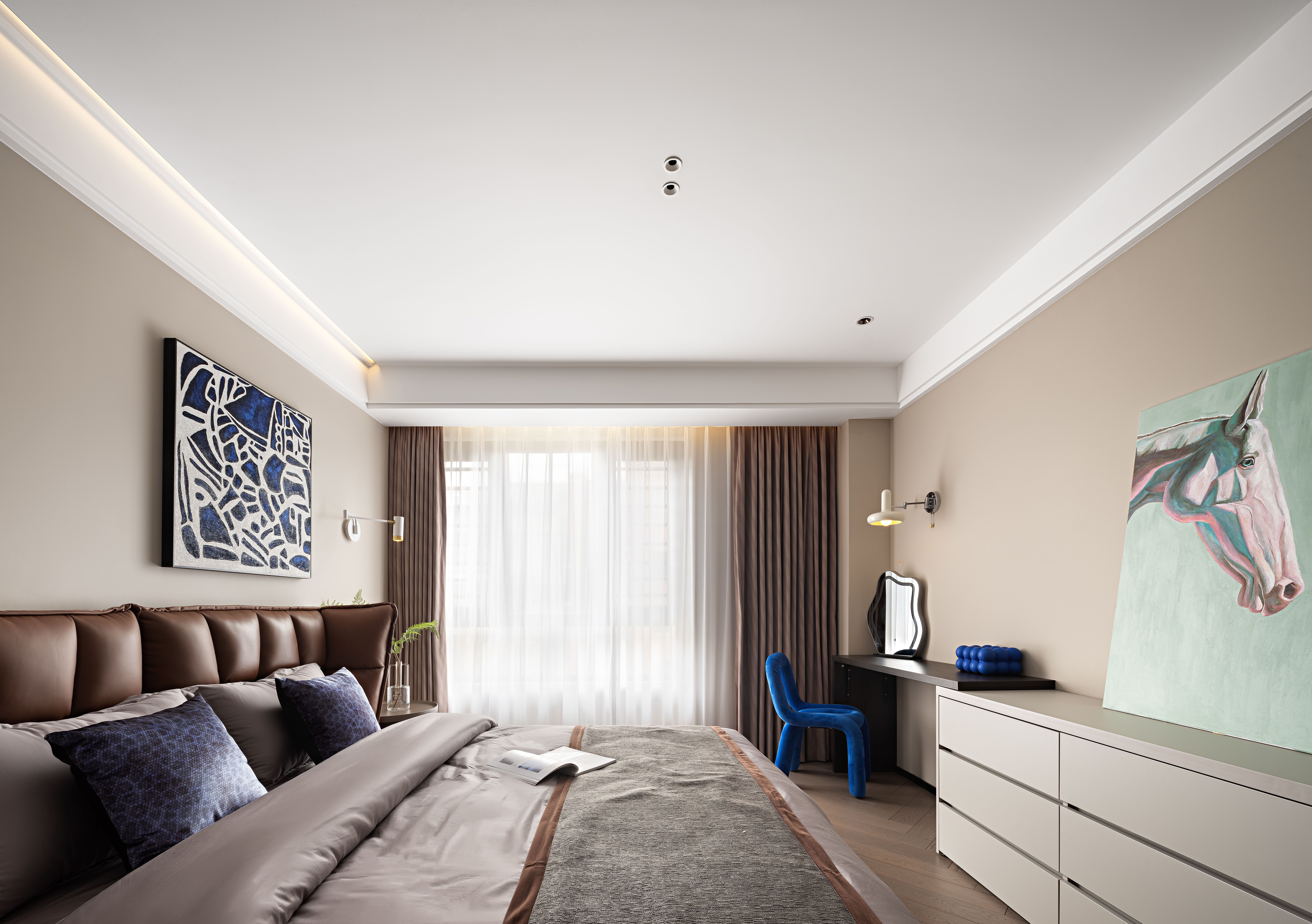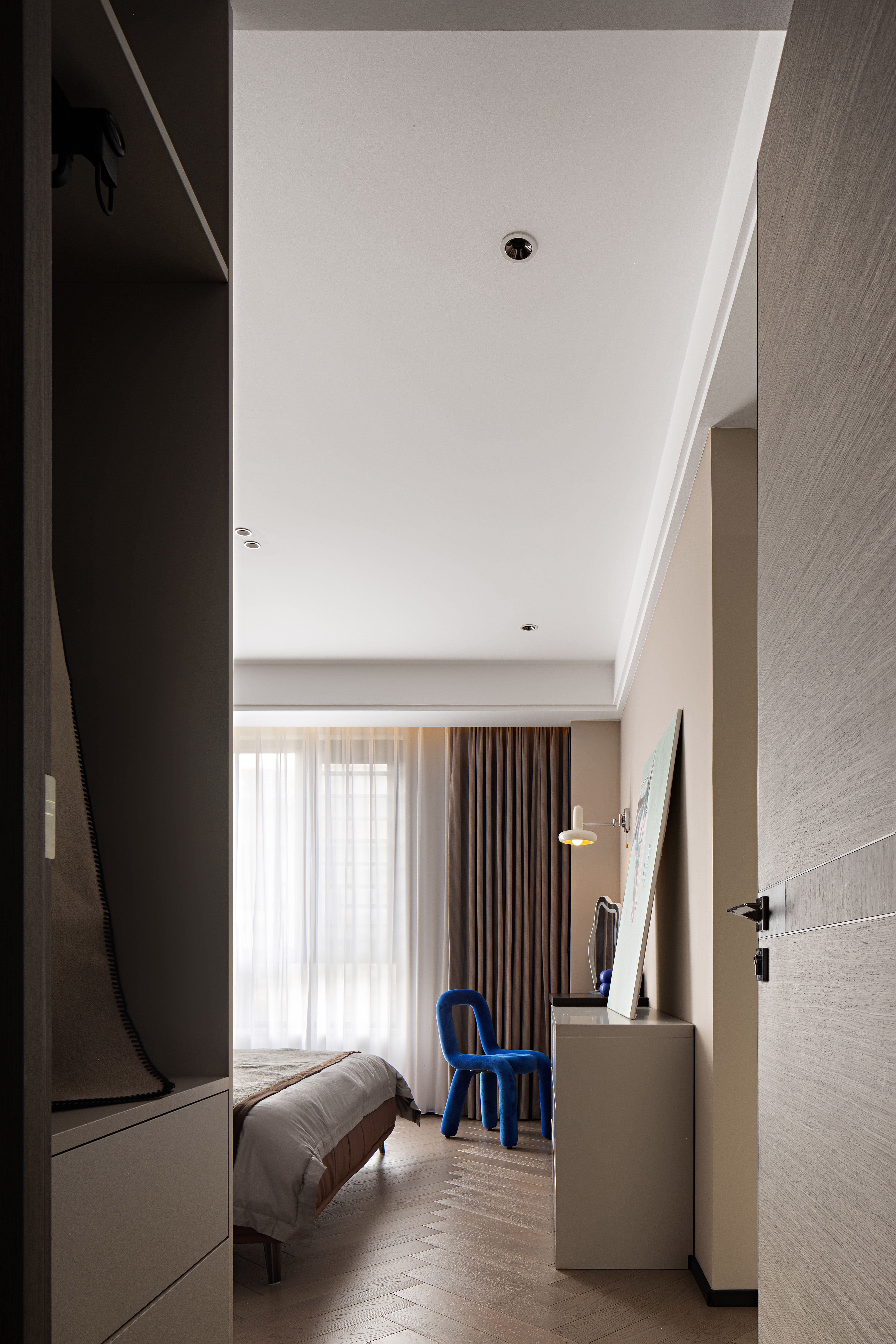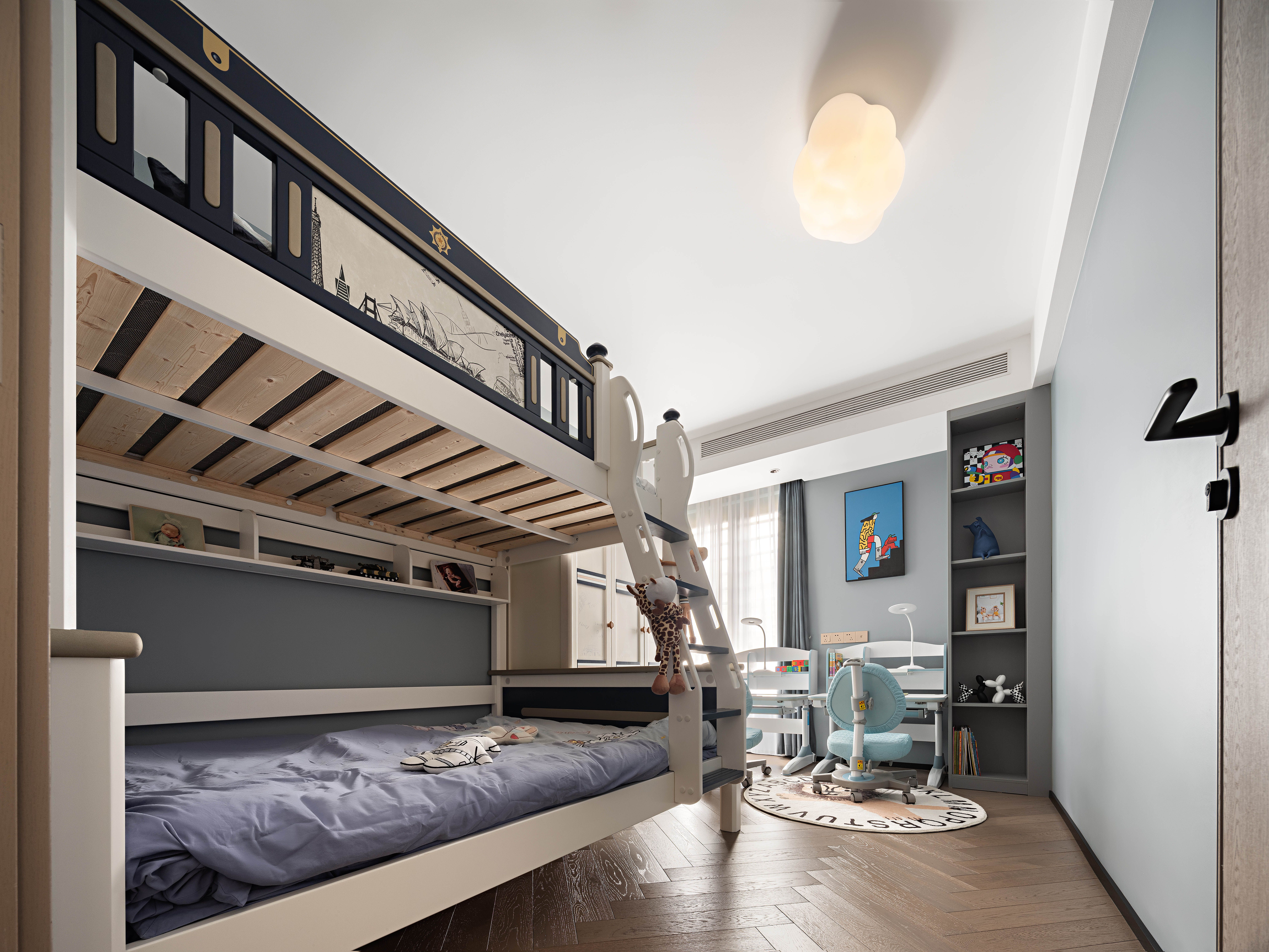 空间意境:入户玄关及电视墙充足的收纳空间设计作为其空间设计重点.极简的柜板和红色的小可爱物件点缀软装,让空间更赋予灵动和朝气.空间软装配饰上选用一家四口的生肖融入软装搭配作为空间和居住者的感情纽带.双胞胎儿子房间挂画精选“天天向上”.在色彩上,红色及黄色点缀色互补呼应.提亮了空间中的空间蓝天白云.寓意孩子在生活学习上都天天向上,步步高升.巧遇*美拉德色系、克莱因蓝及红色的对比碰撞渲染了空间的时尚色彩.