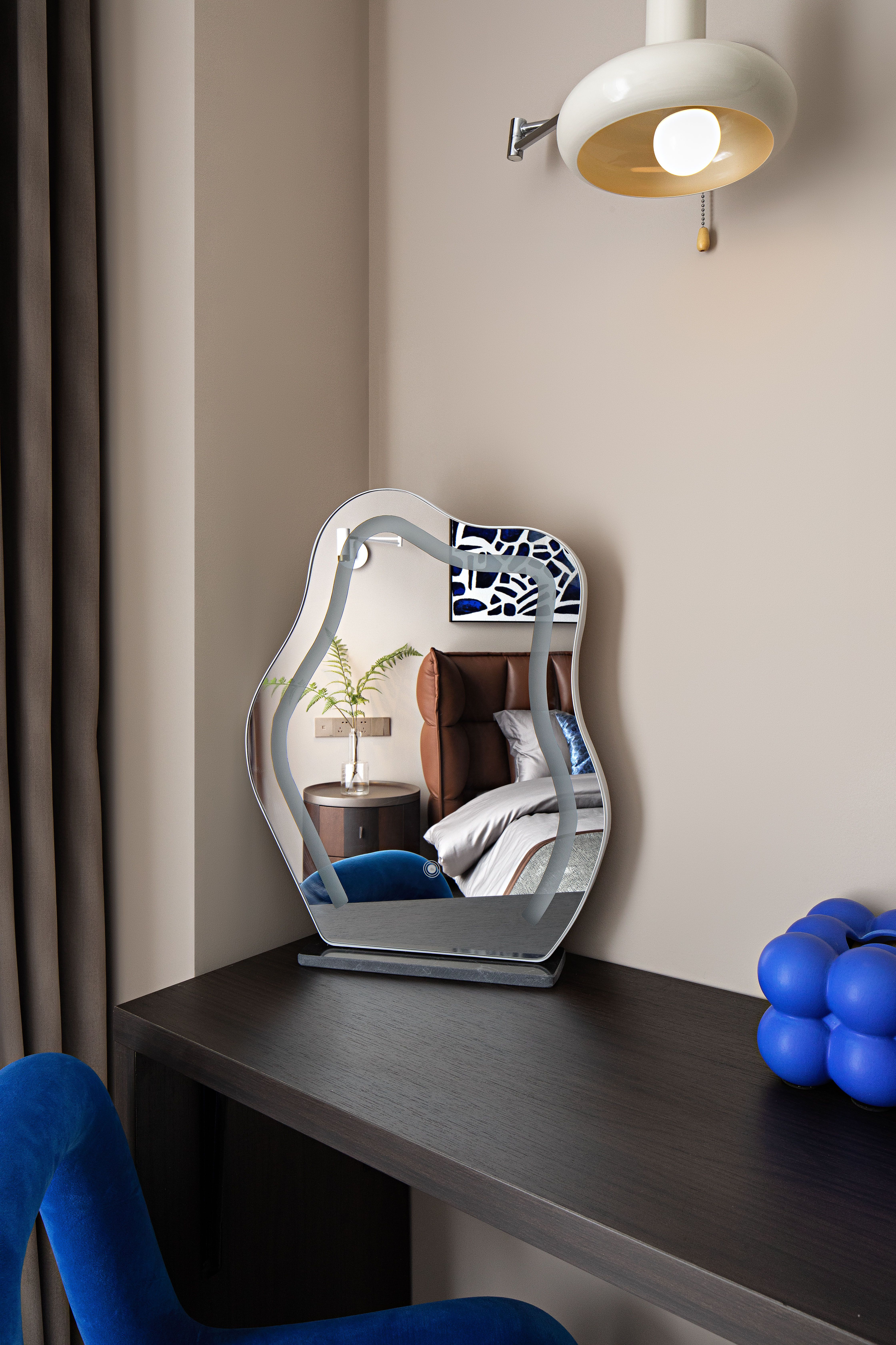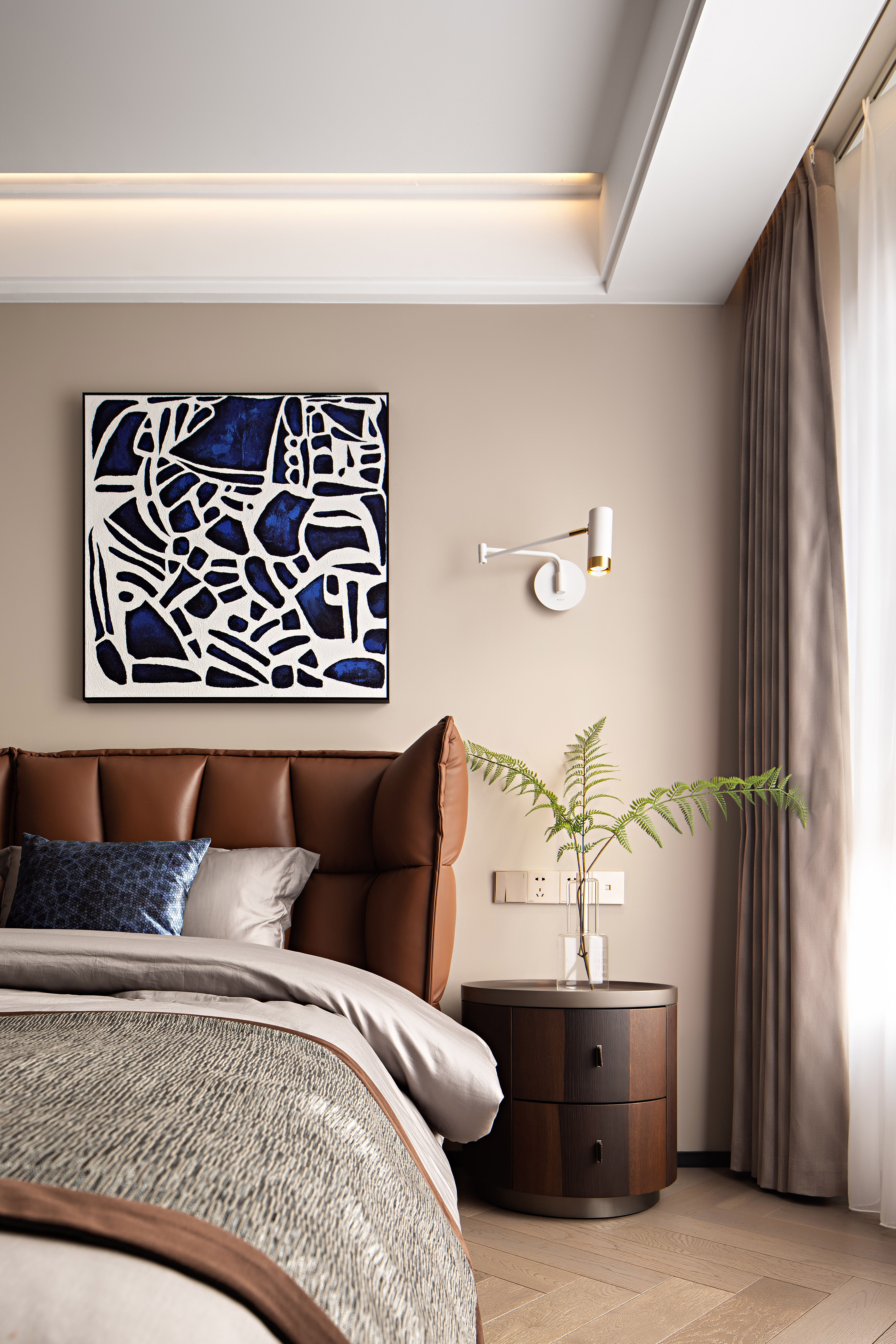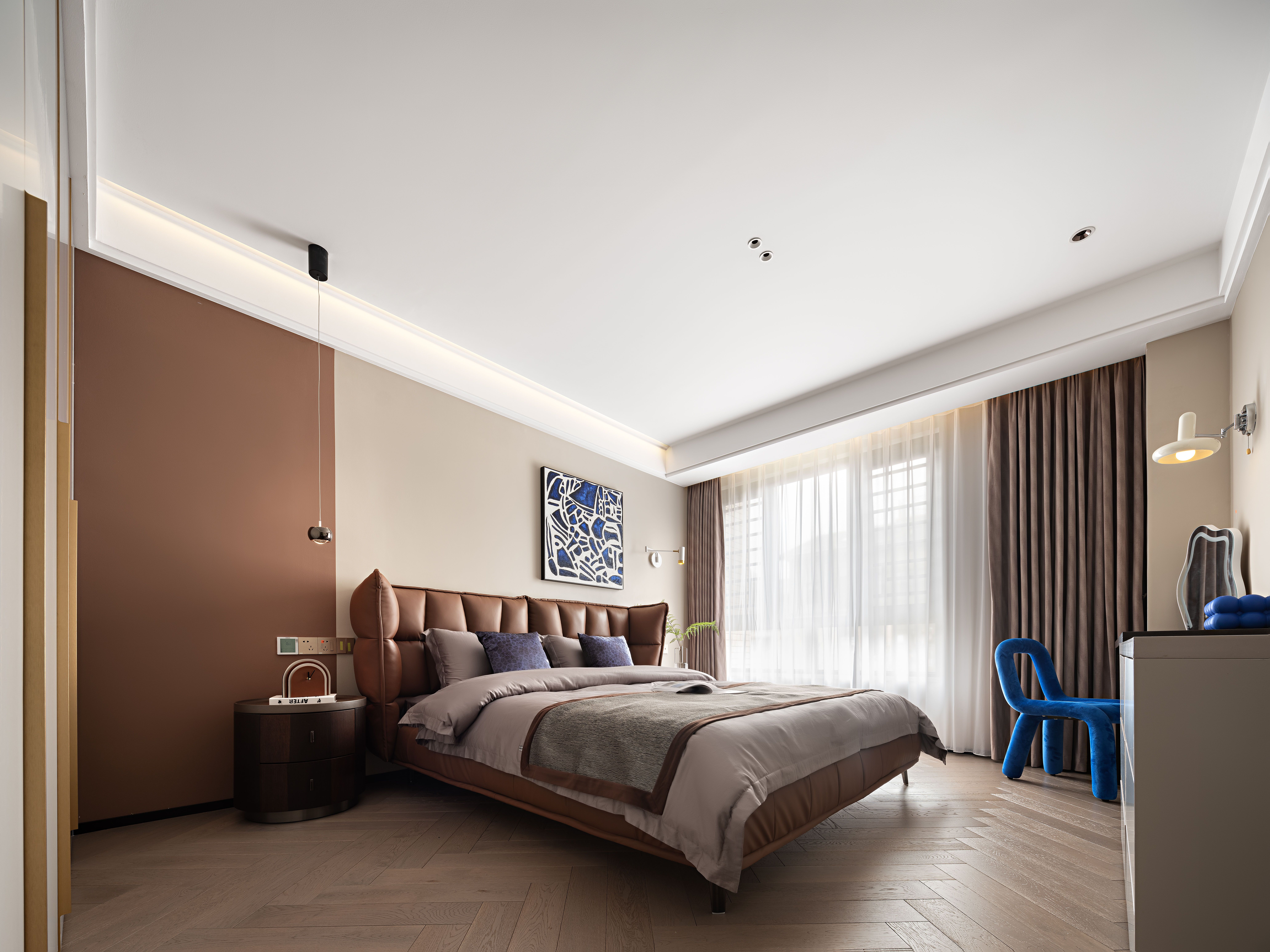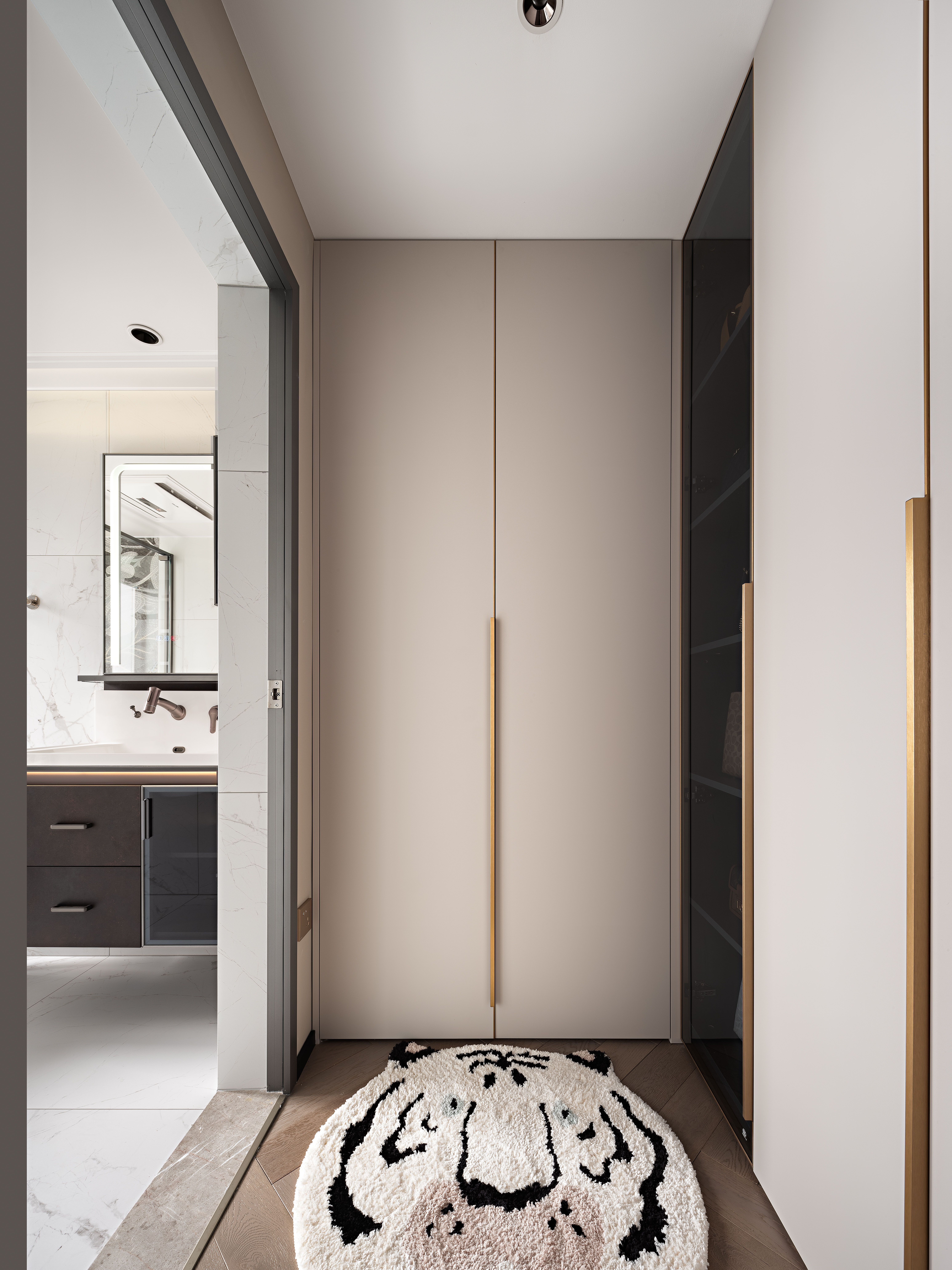 空间意境:入户玄关及电视墙充足的收纳空间设计作为其空间设计重点.极简的柜板和红色的小可爱物件点缀软装,让空间更赋予灵动和朝气.空间软装配饰上选用一家四口的生肖融入软装搭配作为空间和居住者的感情纽带.双胞胎儿子房间挂画精选“天天向上”.在色彩上,红色及黄色点缀色互补呼应.提亮了空间中的空间蓝天白云.寓意孩子在生活学习上都天天向上,步步高升.巧遇*美拉德色系、克莱因蓝及红色的对比碰撞渲染了空间的时尚色彩.