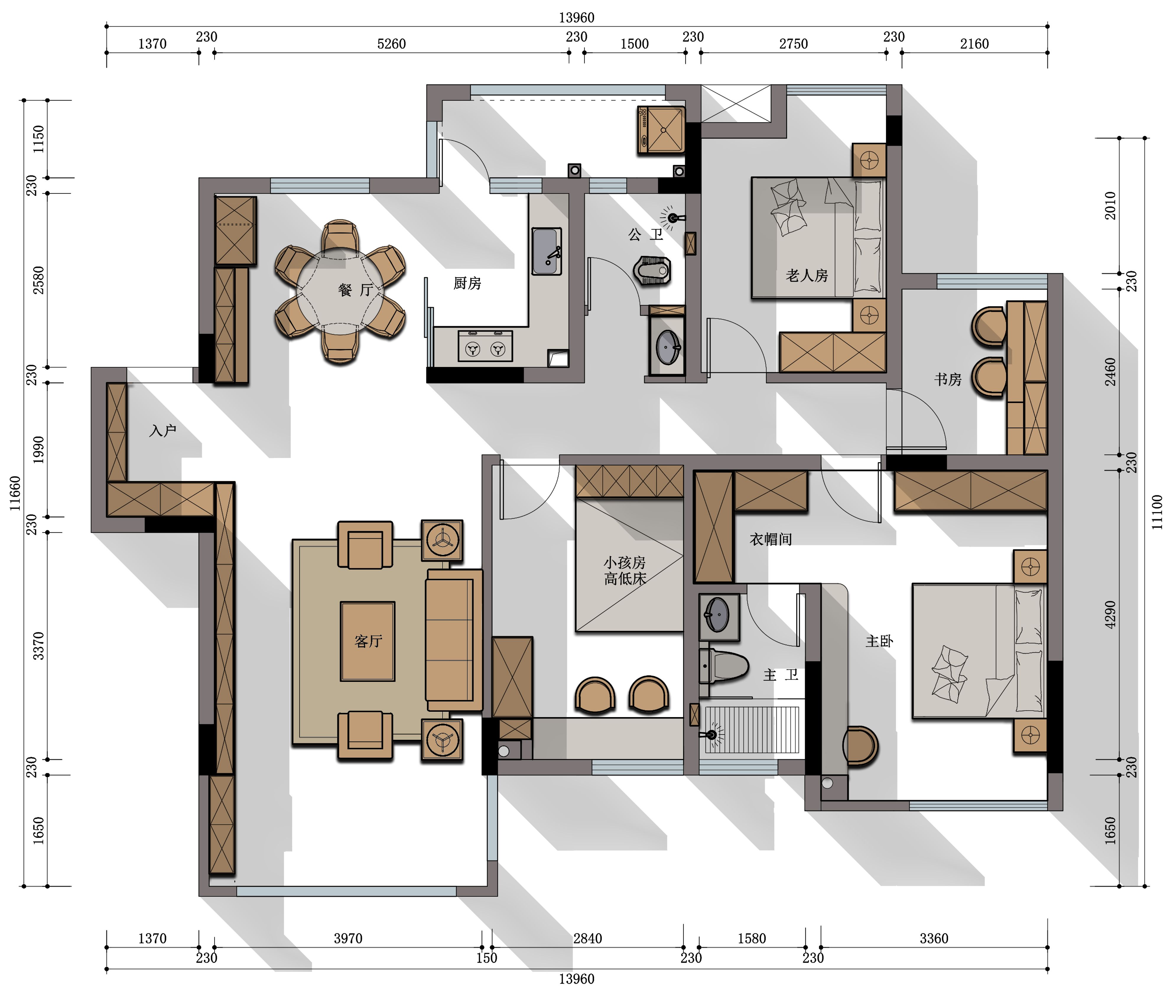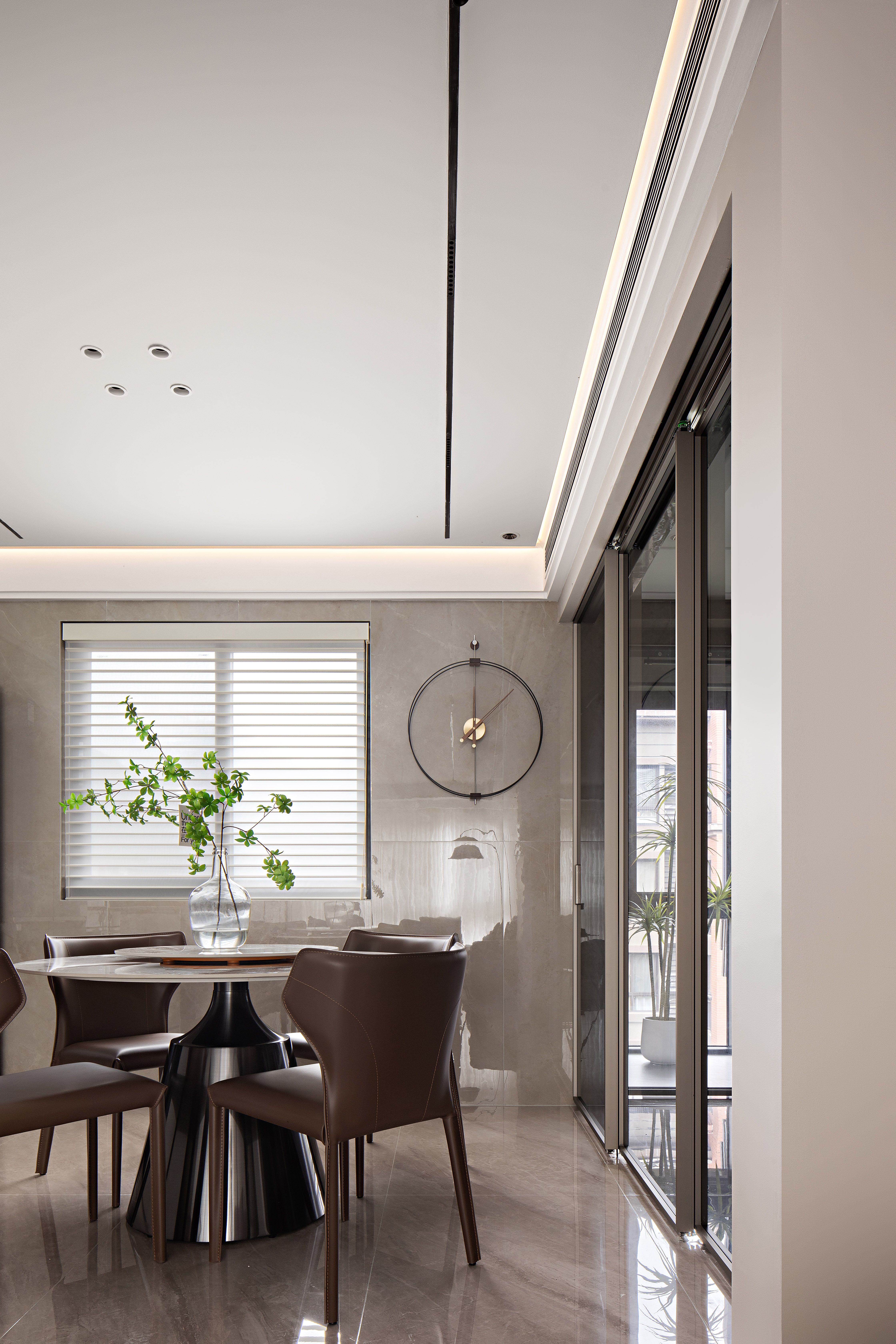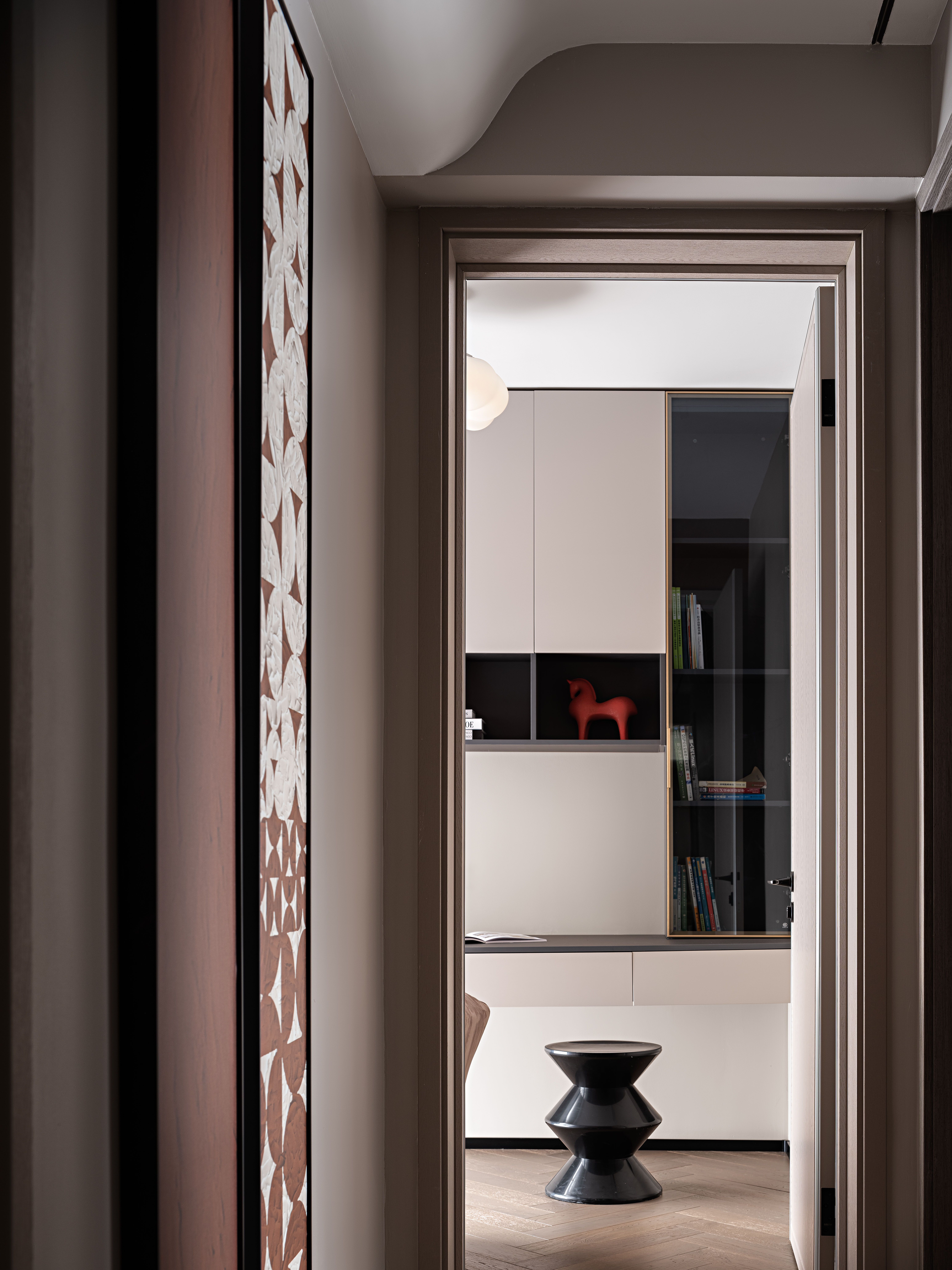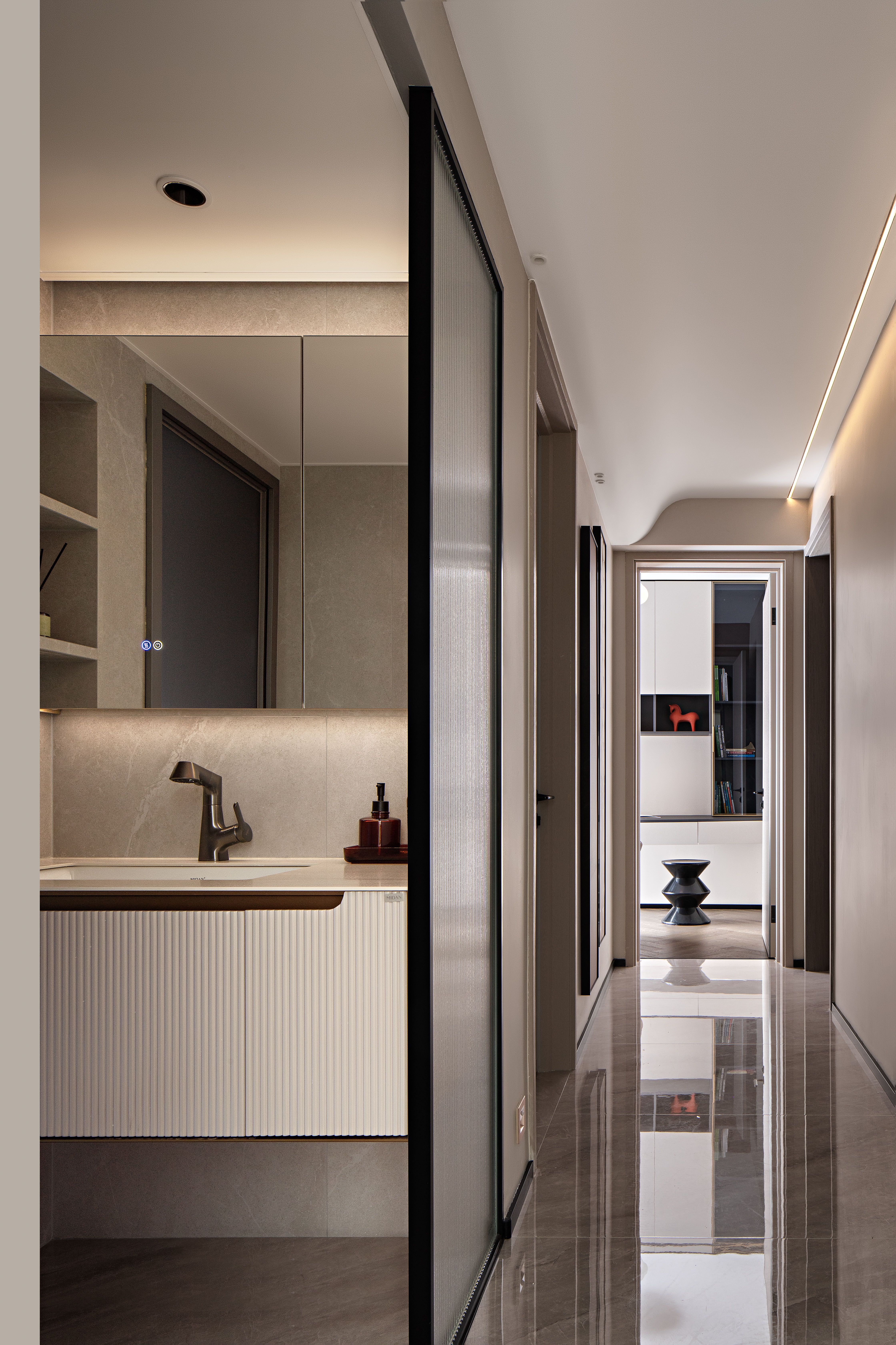 独立的入户,打通后的阳台让客厅显得更通透,去茶几化设计,给孩子们释放了开阔的活动空间,餐厅餐边柜补充了厨房的使用.公卫干湿分区解决了三代同堂的高峰期使用.小书房的保留满足了男业主大学老师的备课独立小空间和孩子们错开作业的需求.整体空间布局服务于居住者.