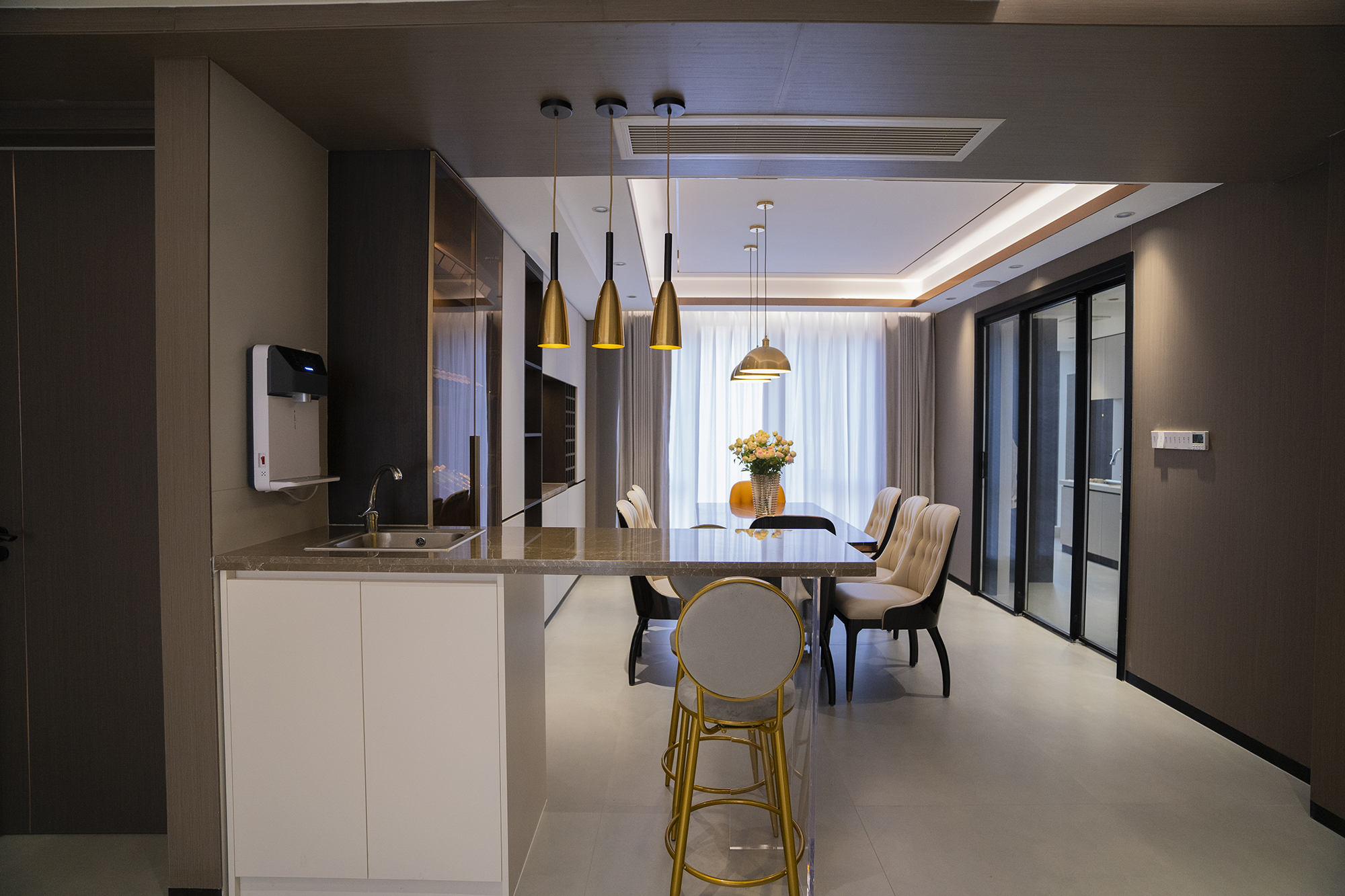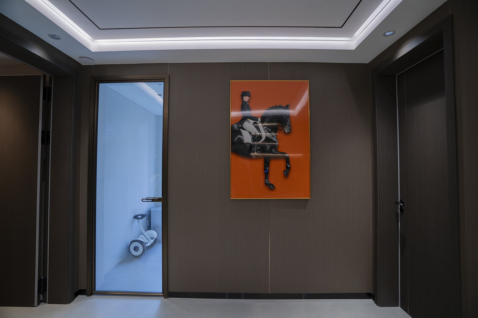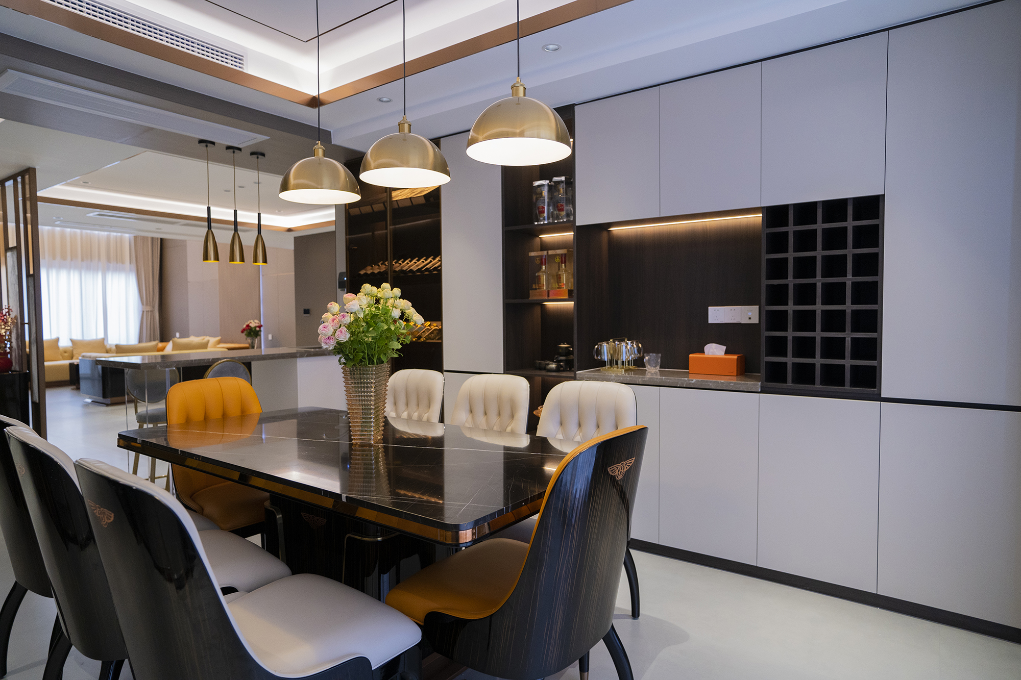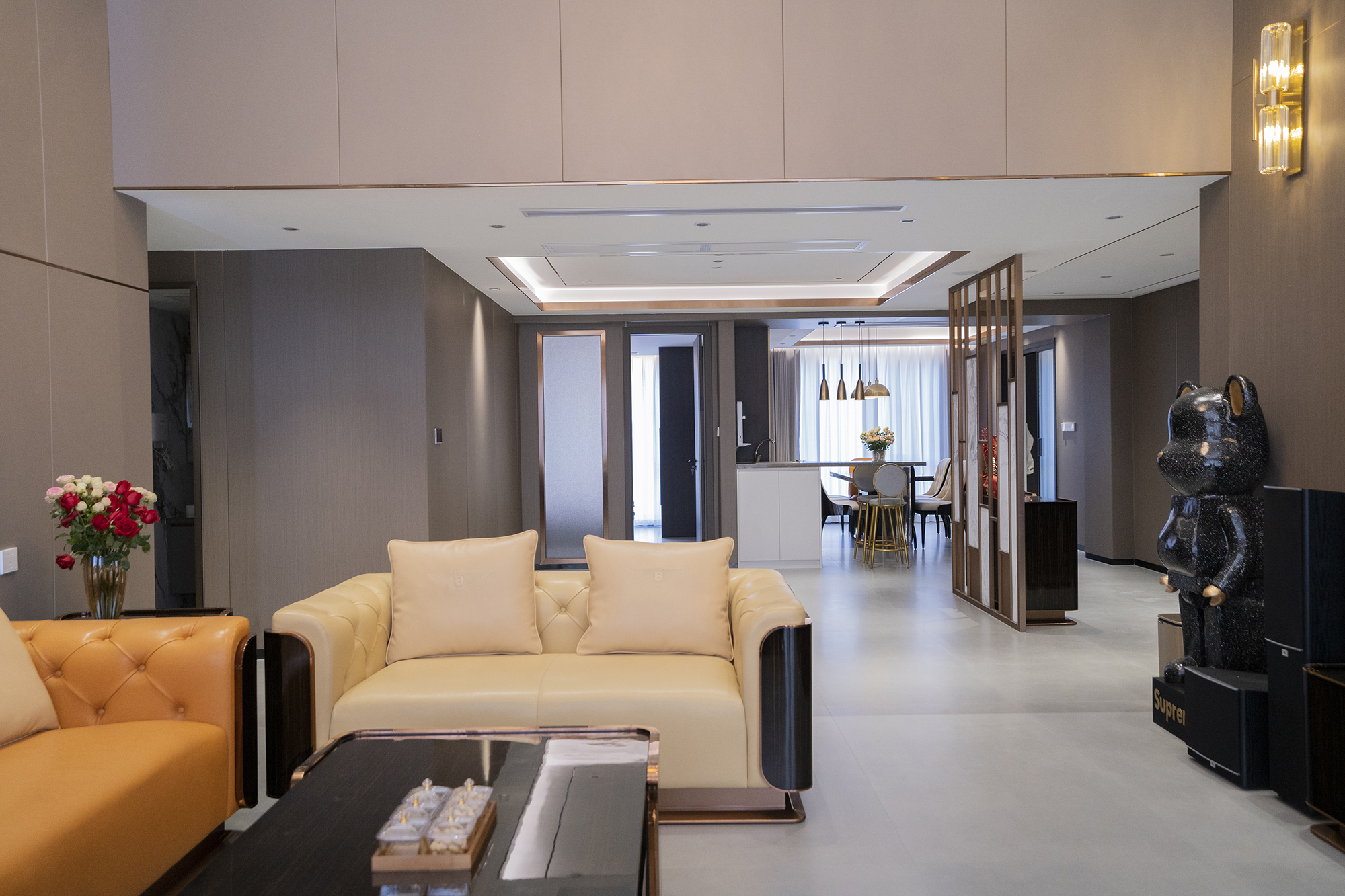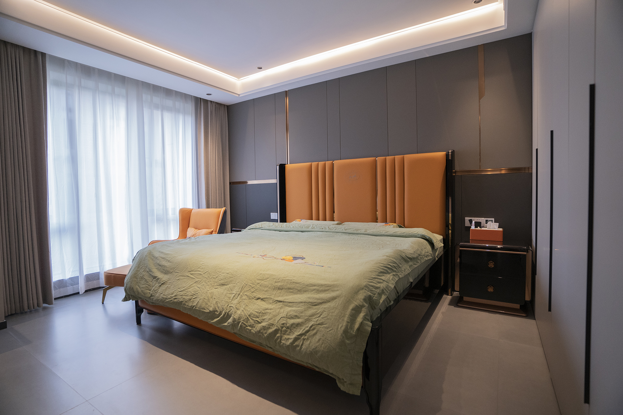 空间意境:本案设计以轻奢风格为主,精致、奢华是屋主的诉求。色调以大面积灰色与金色对比,再以爱马仕橙色作为点缀,从而营造出极致绚丽、高贵自显的空间氛围。材料选择上,石材、木质、金属,不同材质的组合,彰显质感与精致。爱马仕橙,清新而夺目,像是夕阳映照下的海面,又像是壁炉里流淌的火焰,像是狂欢前的期许,又像是灿烂后的宁静。