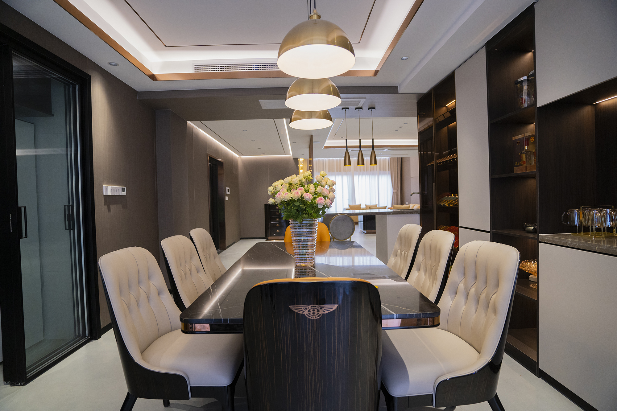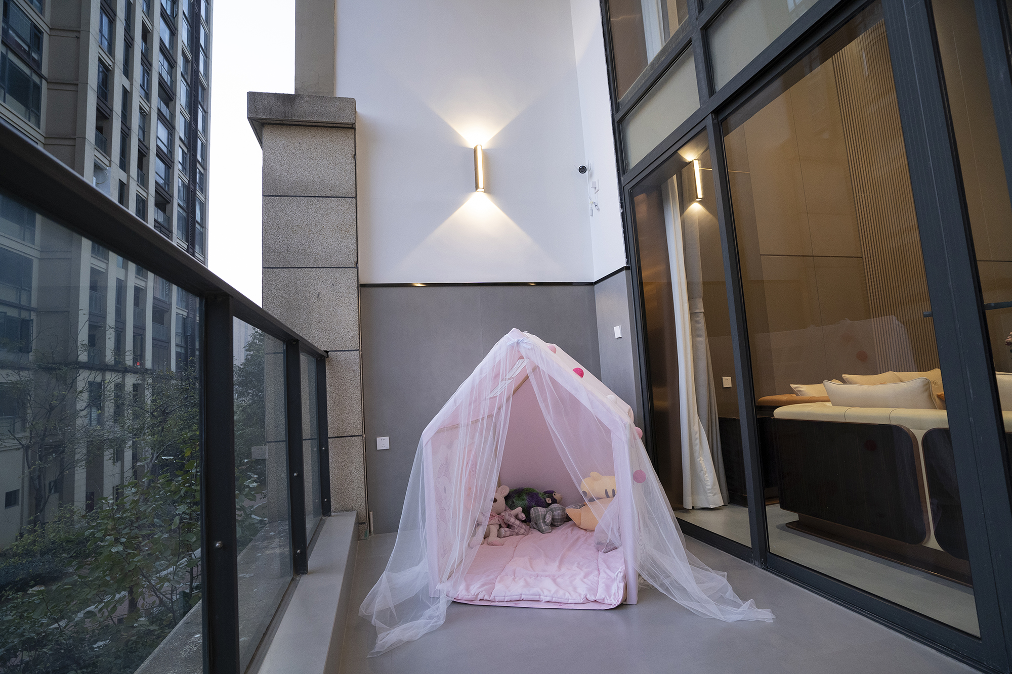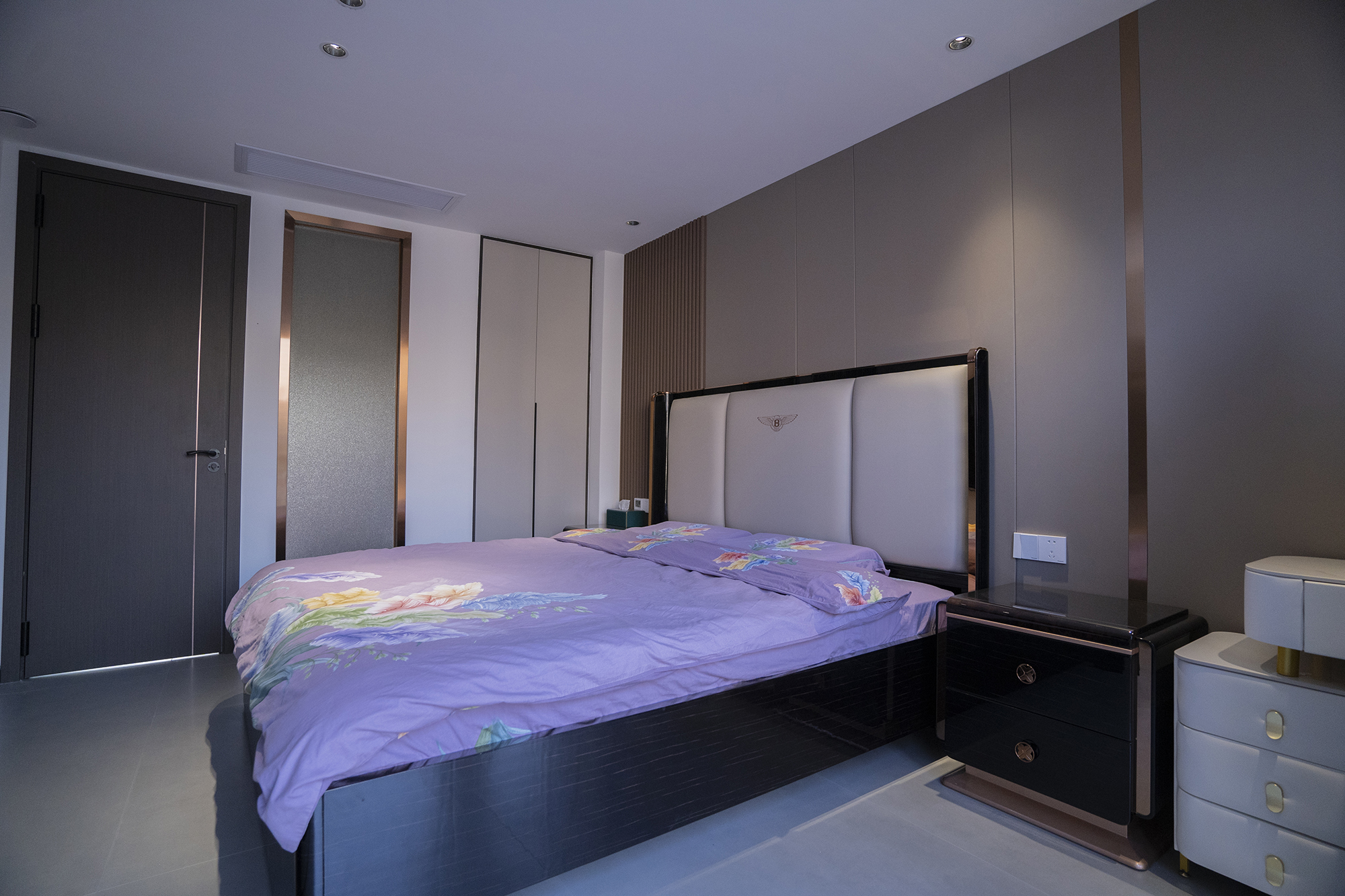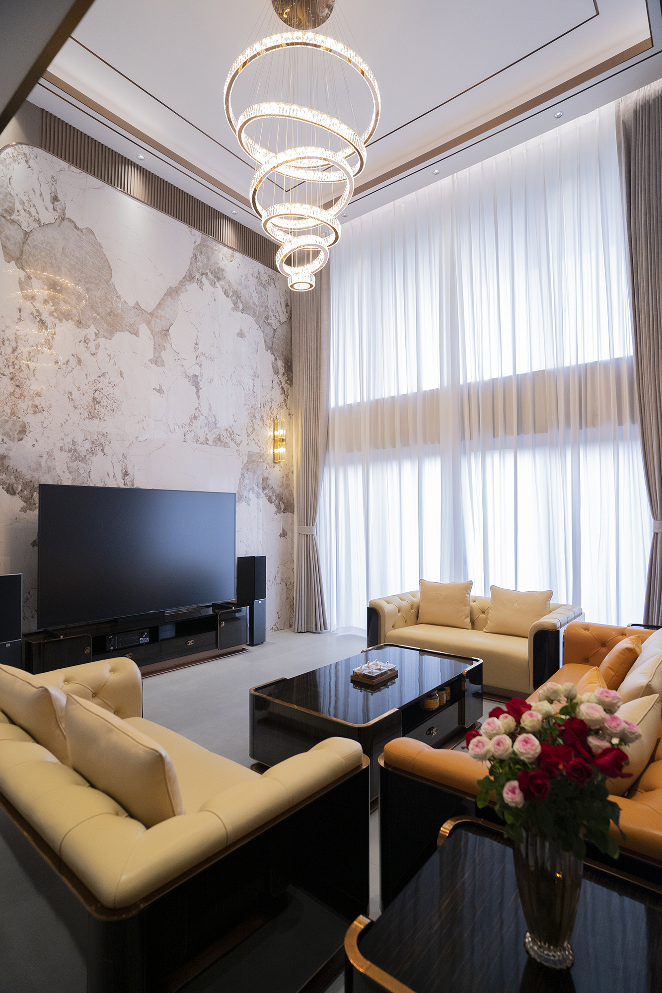 空间布局:户型结构上保留了该户型会客厅挑高5.8米的空间特点,整个空间非常的气派;空间布局共有5卧室、4卫生间、1洗衣房、1储物间、1会客厅、2过厅、1餐厅、1阳台、1鞋帽间、1厨房,满足了本案业主常住人口五口之家的日常居住需求;公共区域设计尽量开阔,留给小朋友更多的娱乐空间;阳台同样也保留了挑高的空间,本案位于二楼,室外绿树成荫,开放式的阳台能更好让居住者亲近自然,感知四季变化。多元的灯光组合,让空间的照明方式更加灵动多变,可以对应不同的生活场景。