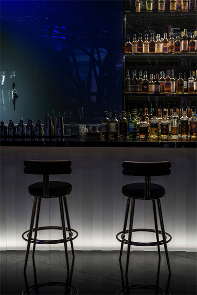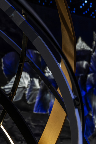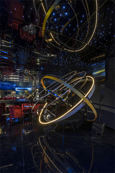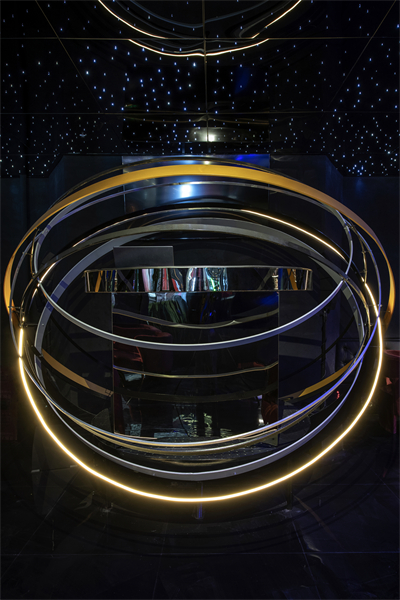 设计选材:金属和镜面以及艺术装置,形成纵向体量,将内部空间完美展示。