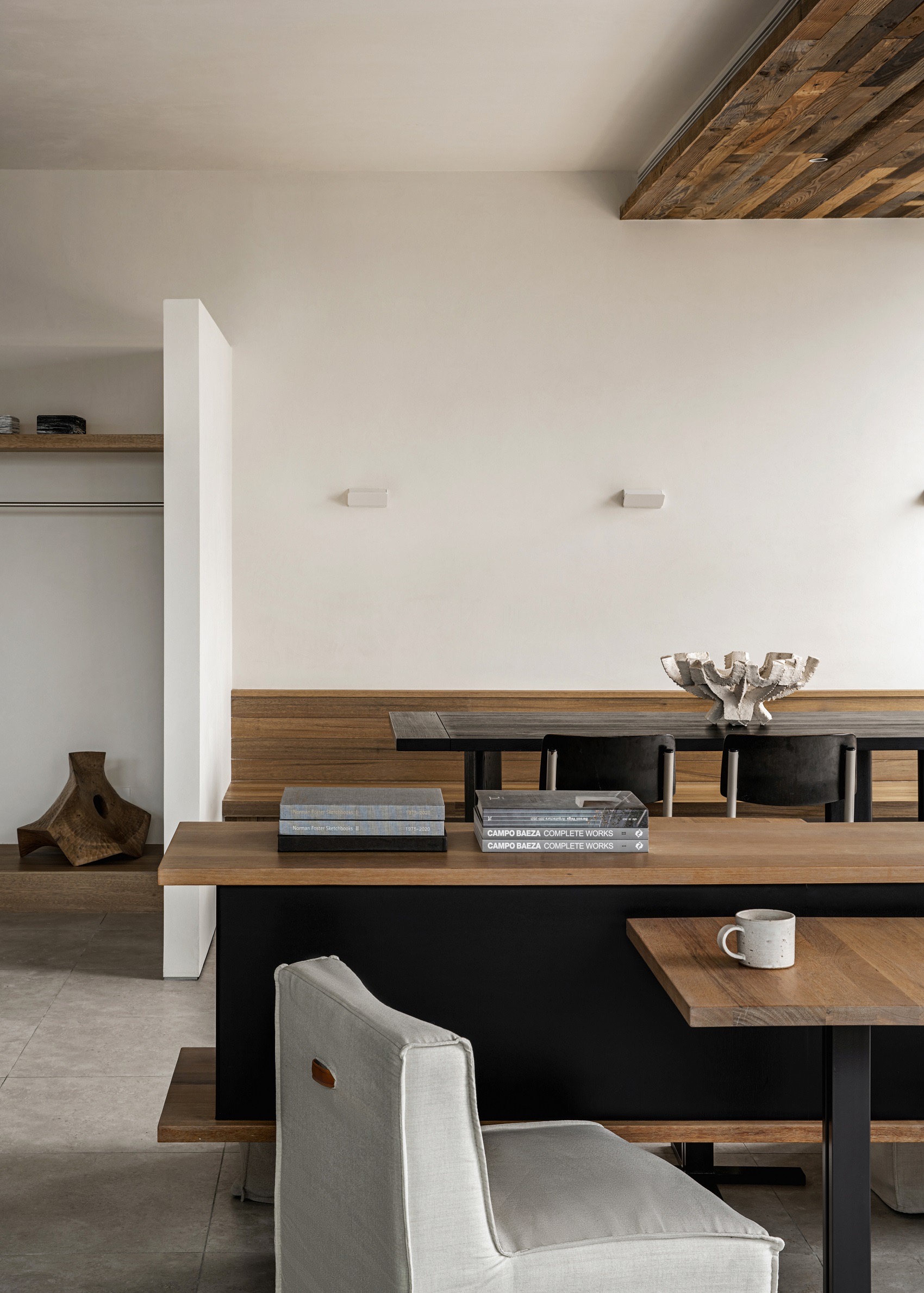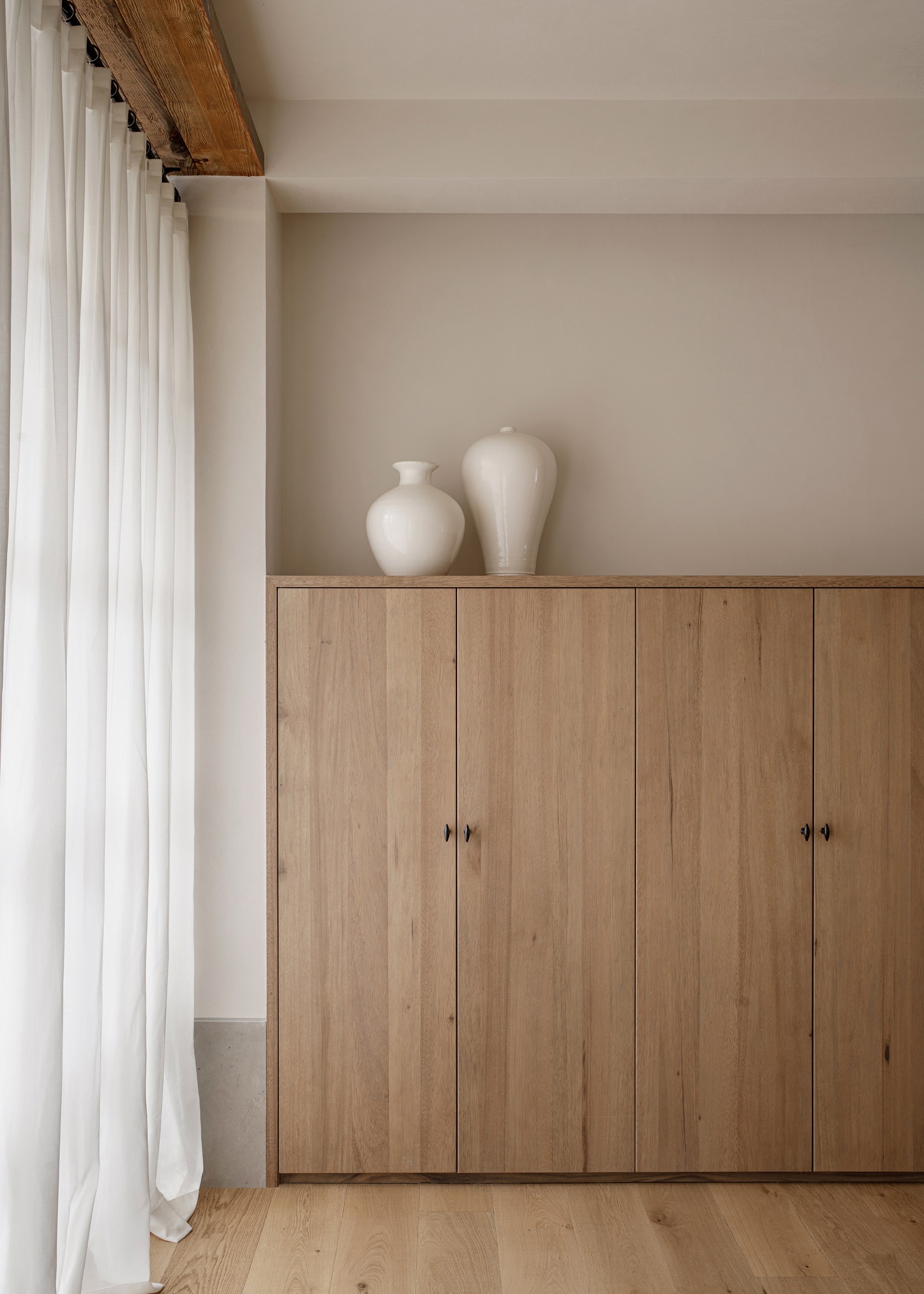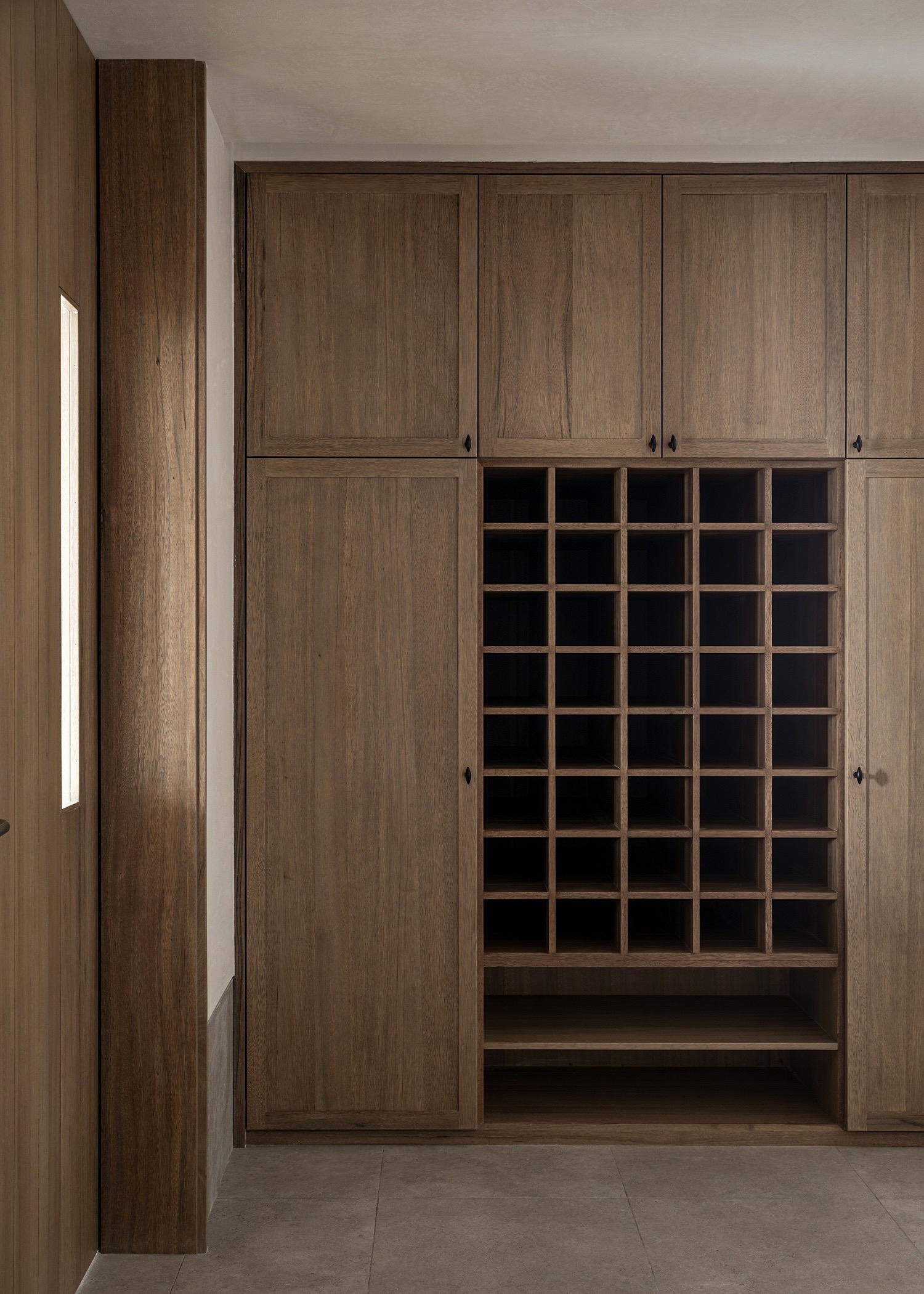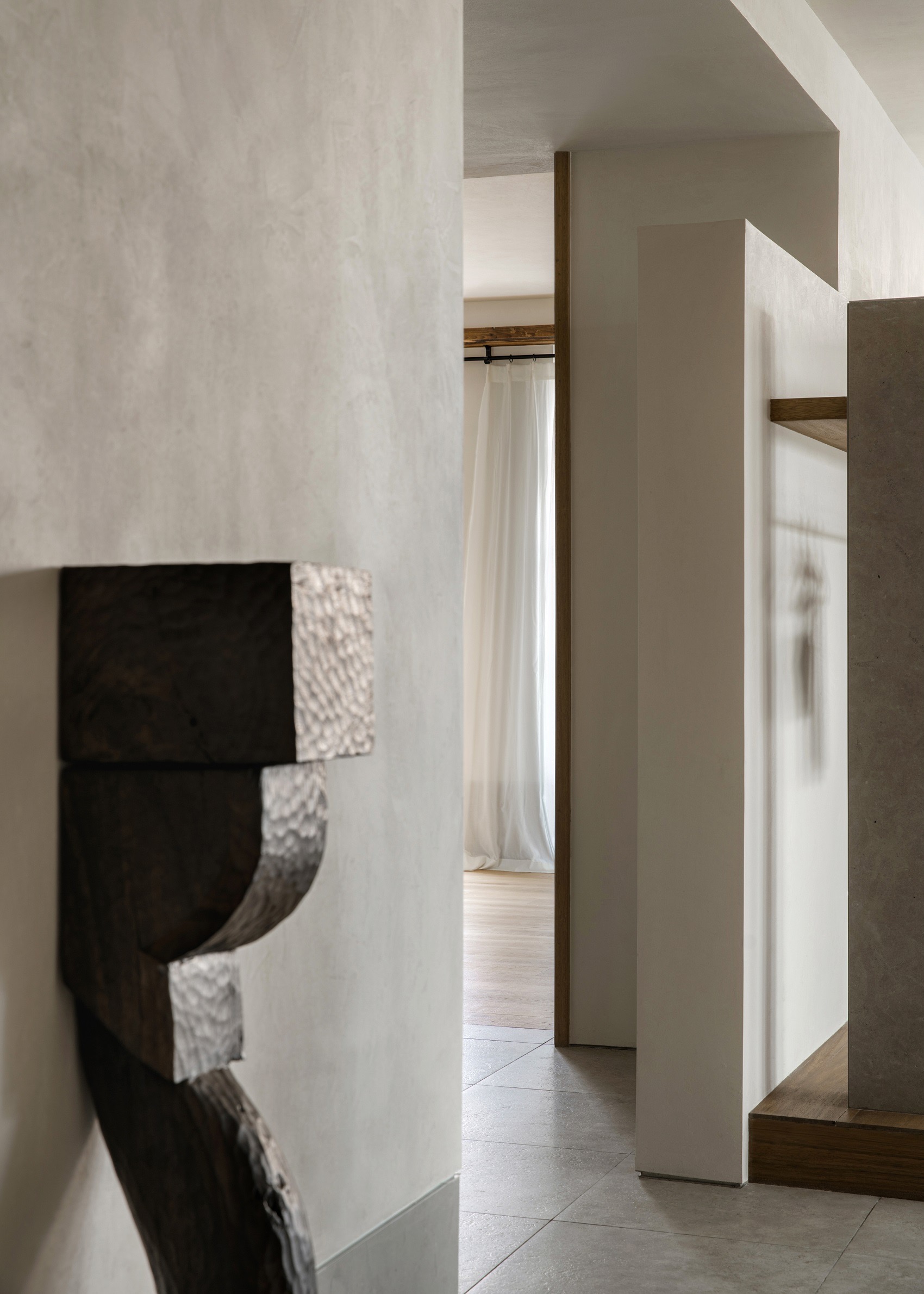 门厅是由外及内的过度,木料的味道开始弥漫。大门留出横窗,透过玻璃窥探内部,却不是一目了然,反而激起探索的兴趣,给思绪的漫步留出空间。 -