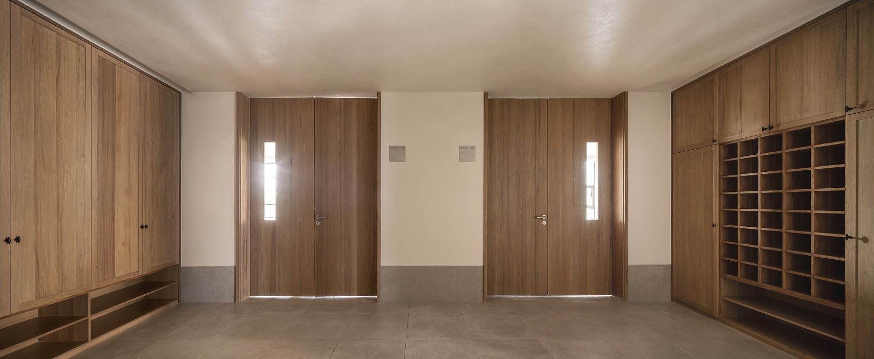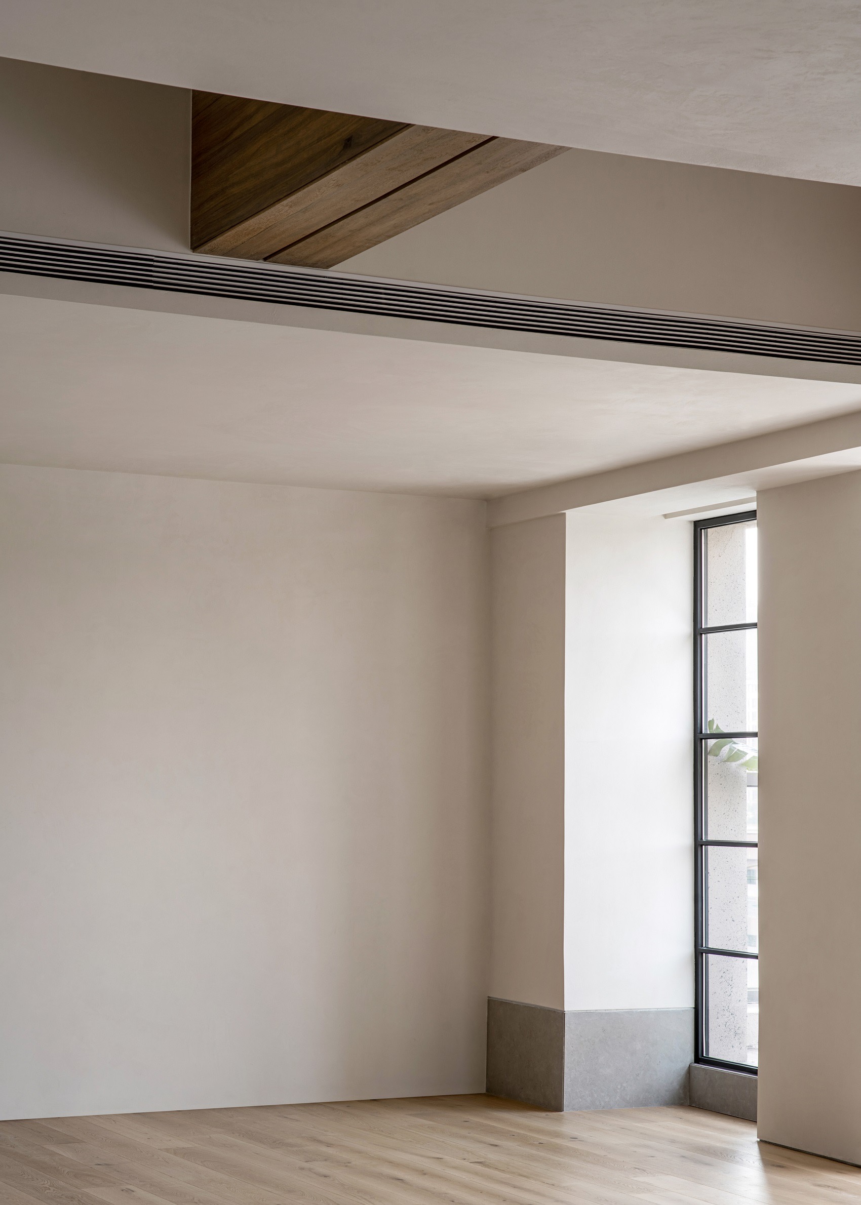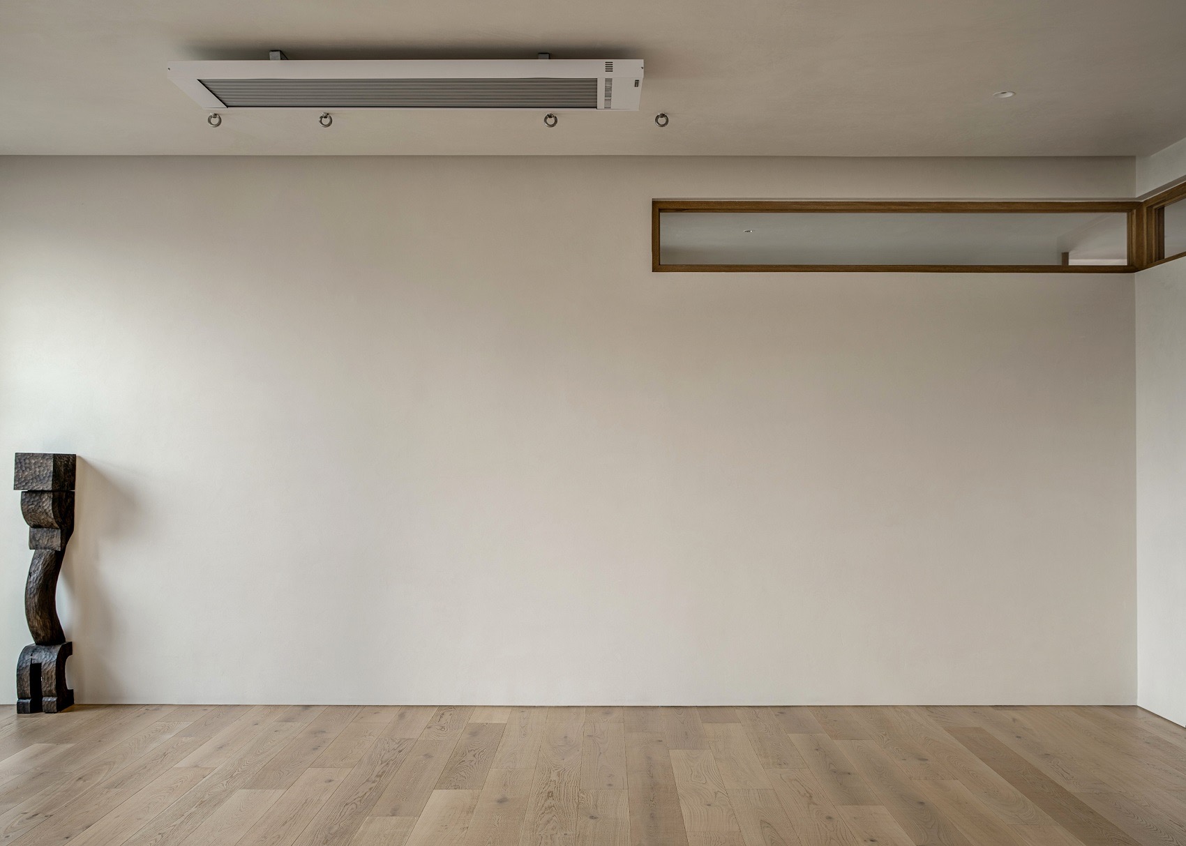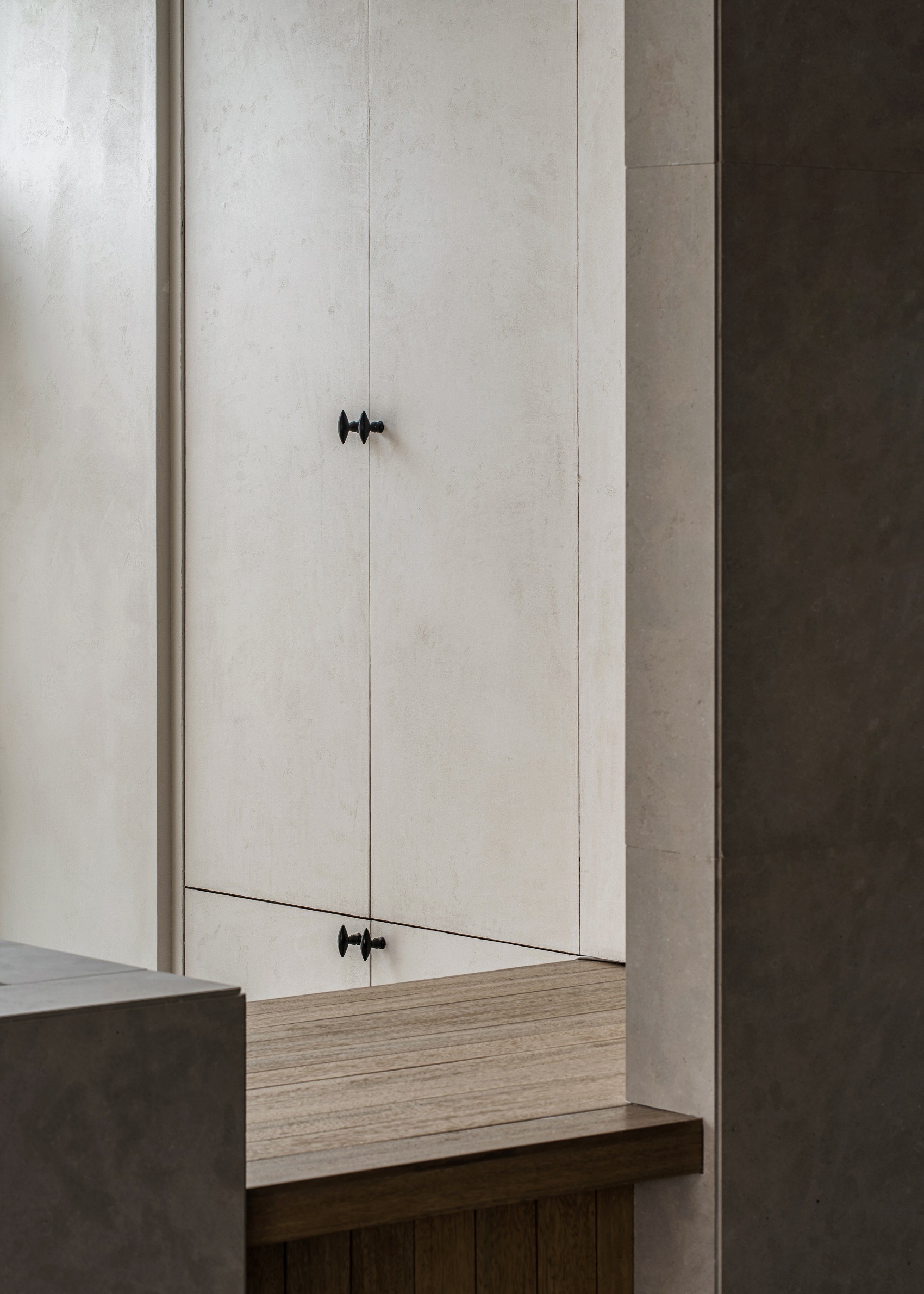 门厅是由外及内的过度,木料的味道开始弥漫。大门留出横窗,透过玻璃窥探内部,却不是一目了然,反而激起探索的兴趣,给思绪的漫步留出空间。 -
