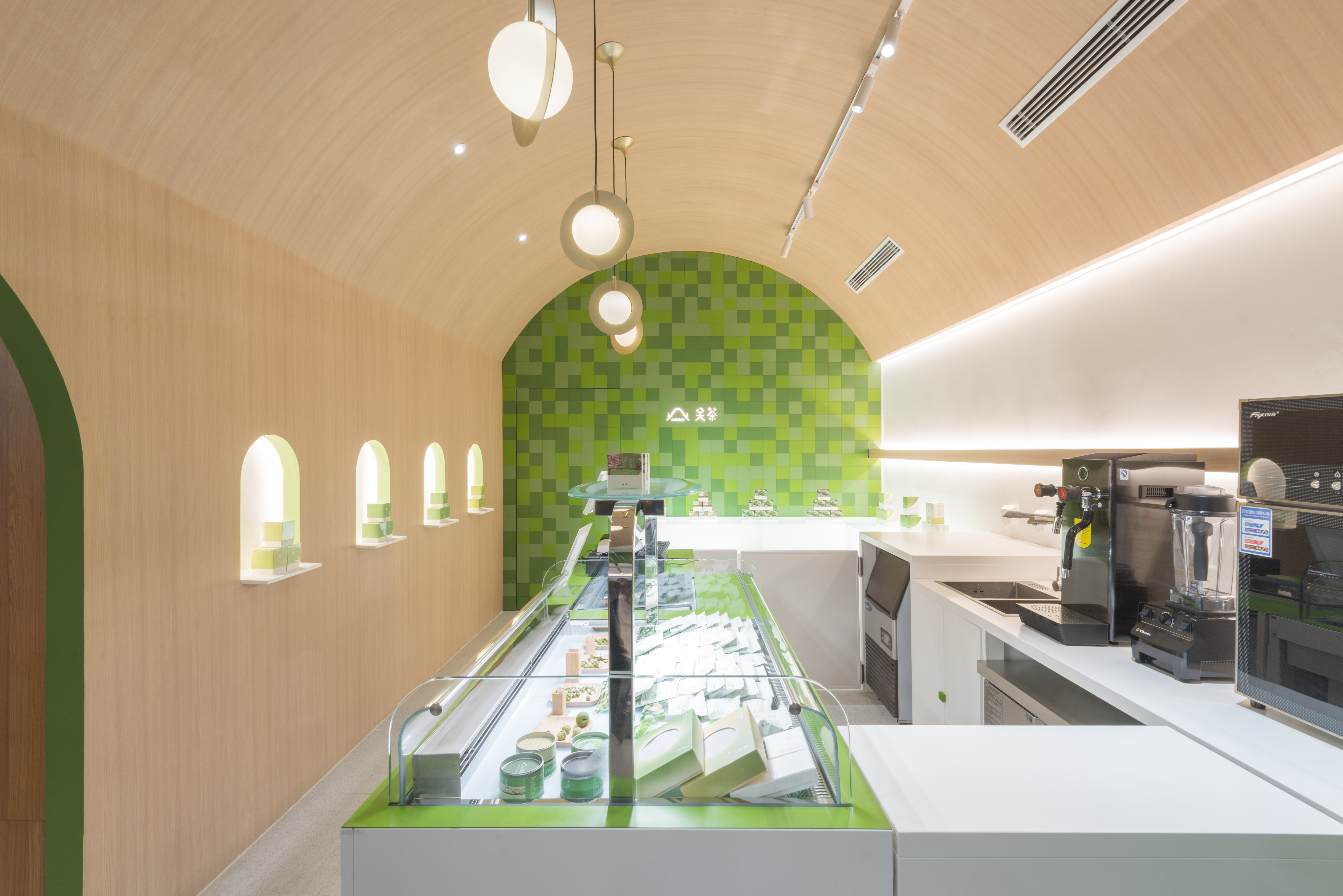 We extracted the green from the brand color as spatial main chromatic system and combined with white to create a simple and modern space atmosphere. And “matcha green” with three different color scale, through the plane typesetting, created a very visual characteristic “matcha green block" wall. Different green also symbolizes that different concentration of matcha has different properties.