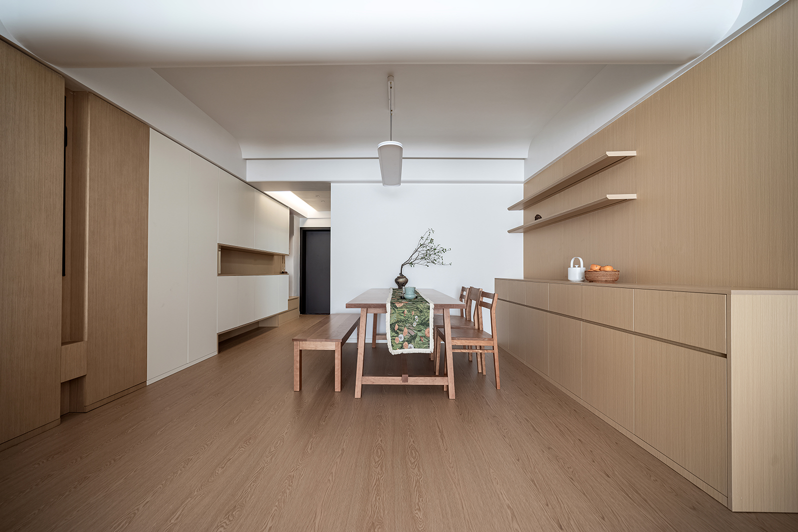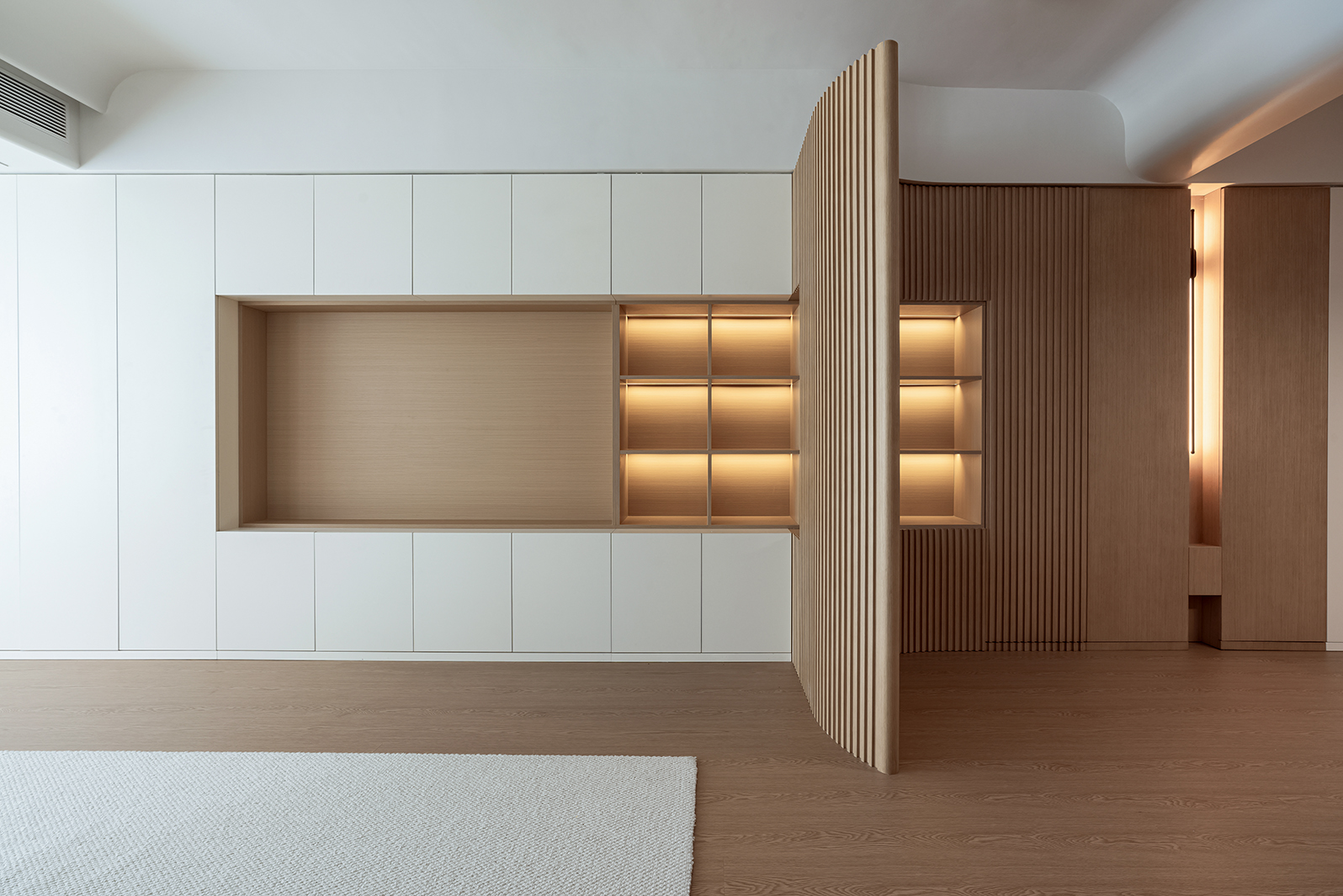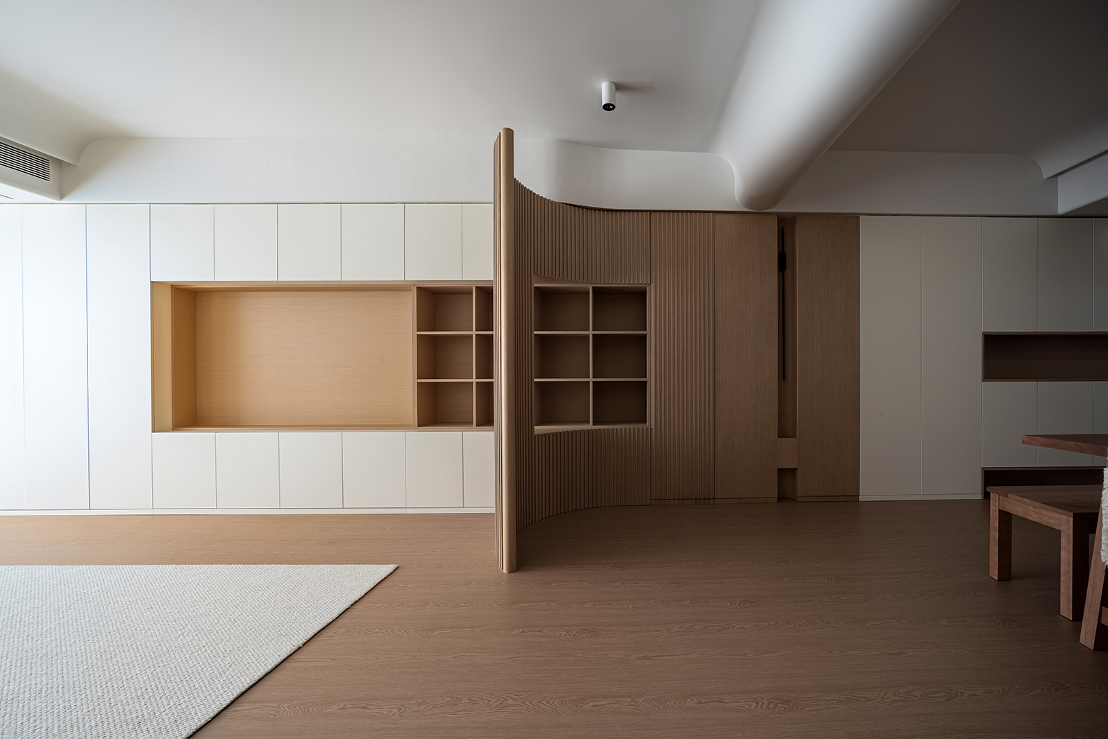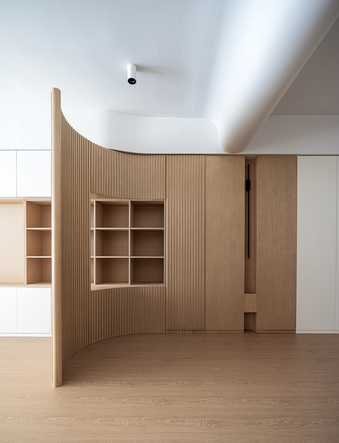整体空间的材质看似单一,却蕴藏着无限的可能,满足强大的收纳功能,以及简约清爽的视觉效果