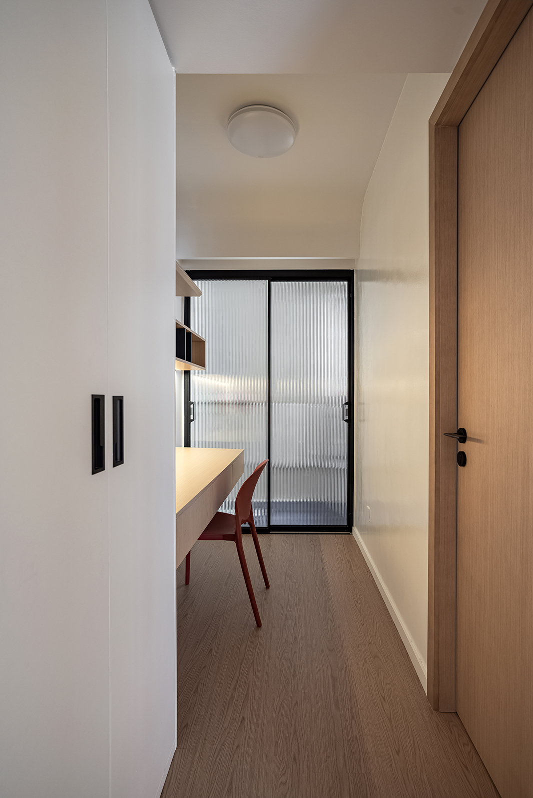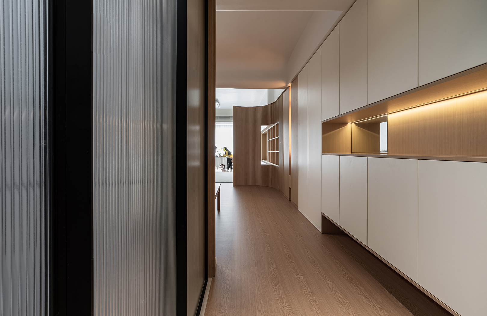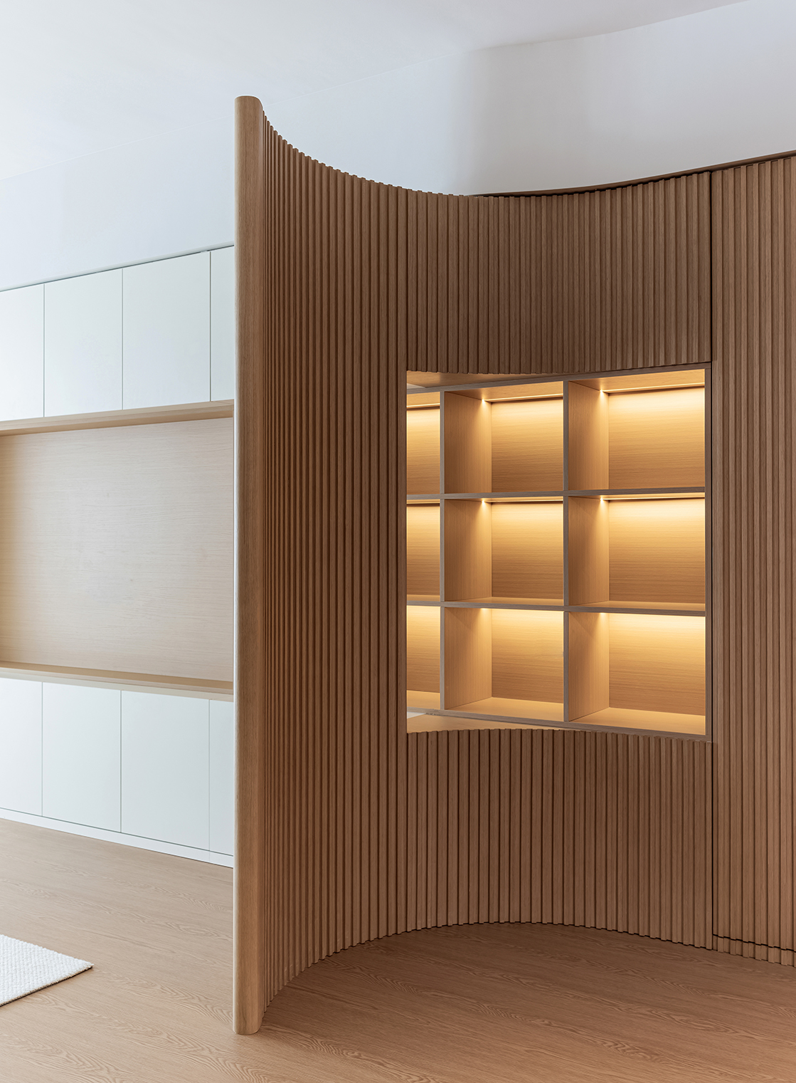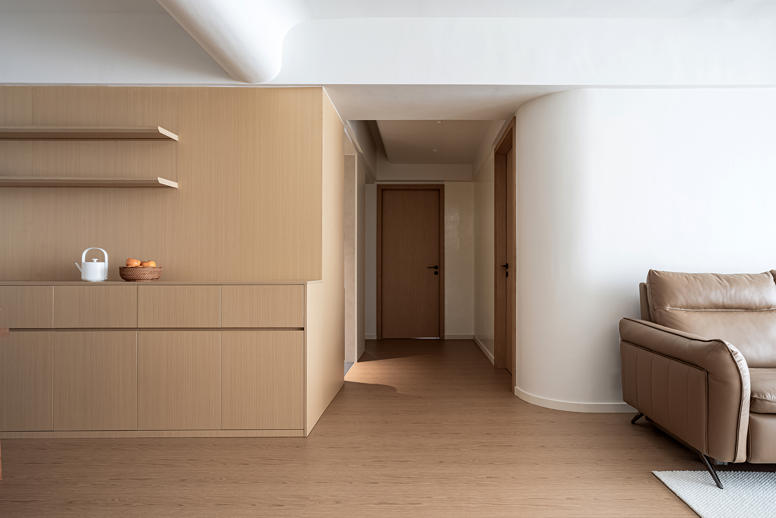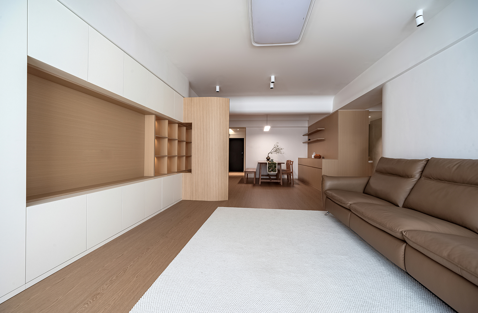 整体空间的材质看似单一,却蕴藏着无限的可能,满足强大的收纳功能,以及简约清爽的视觉效果