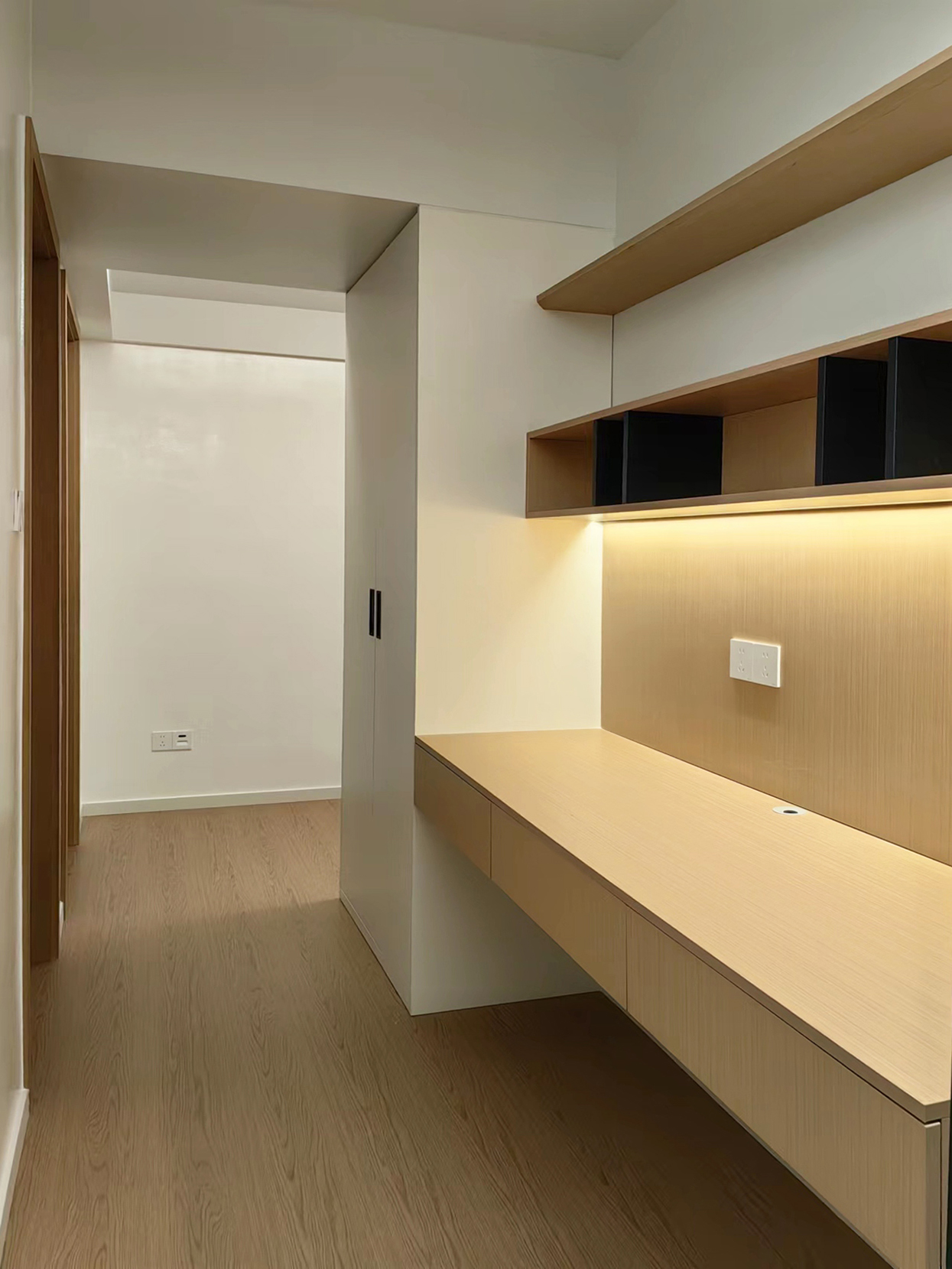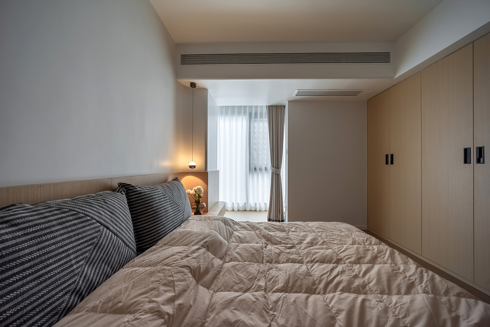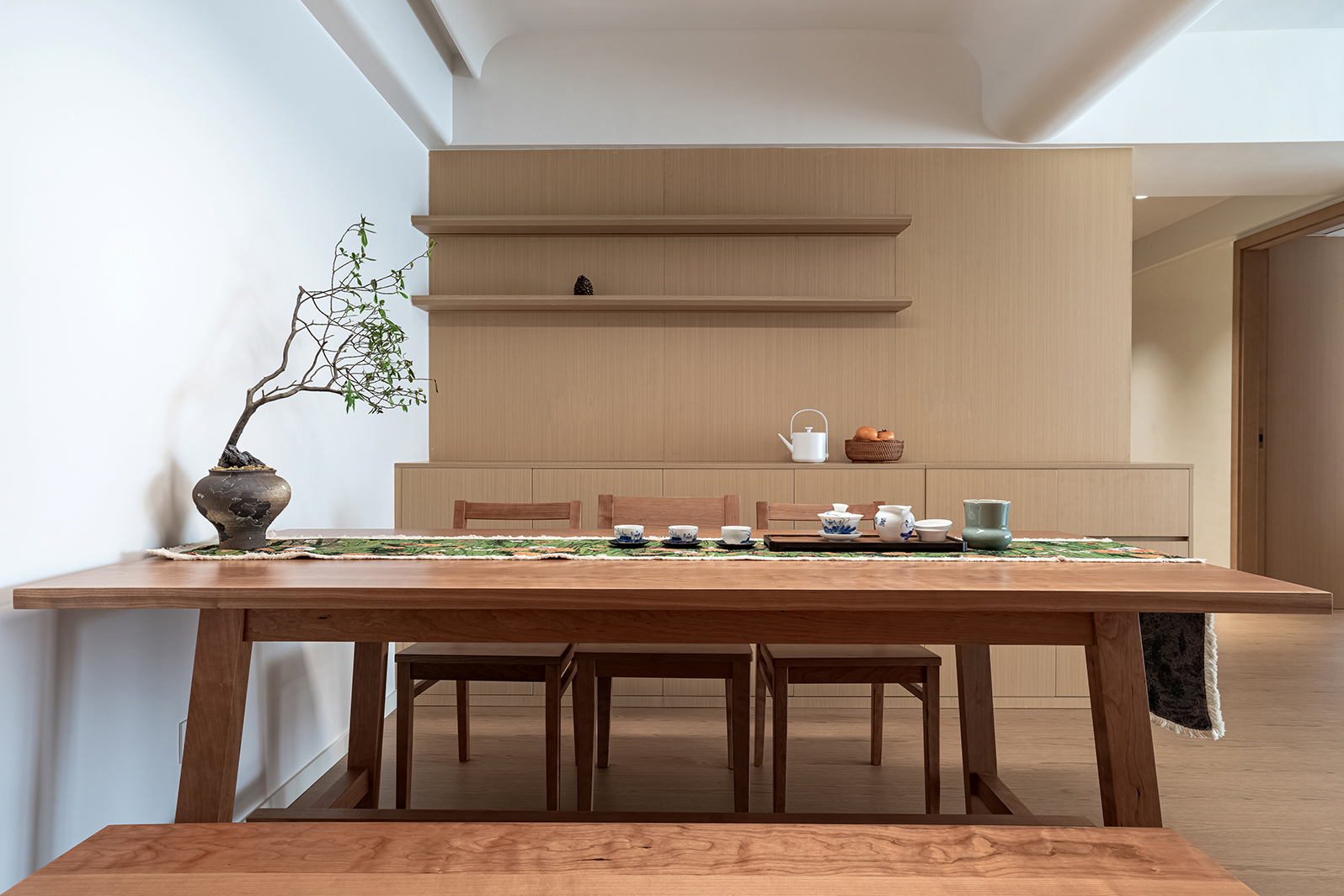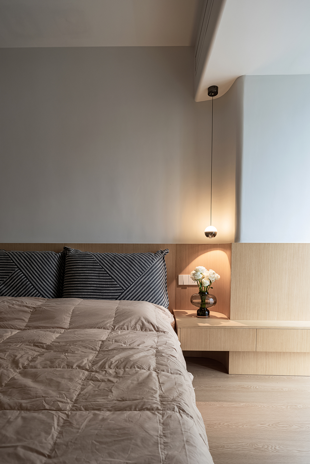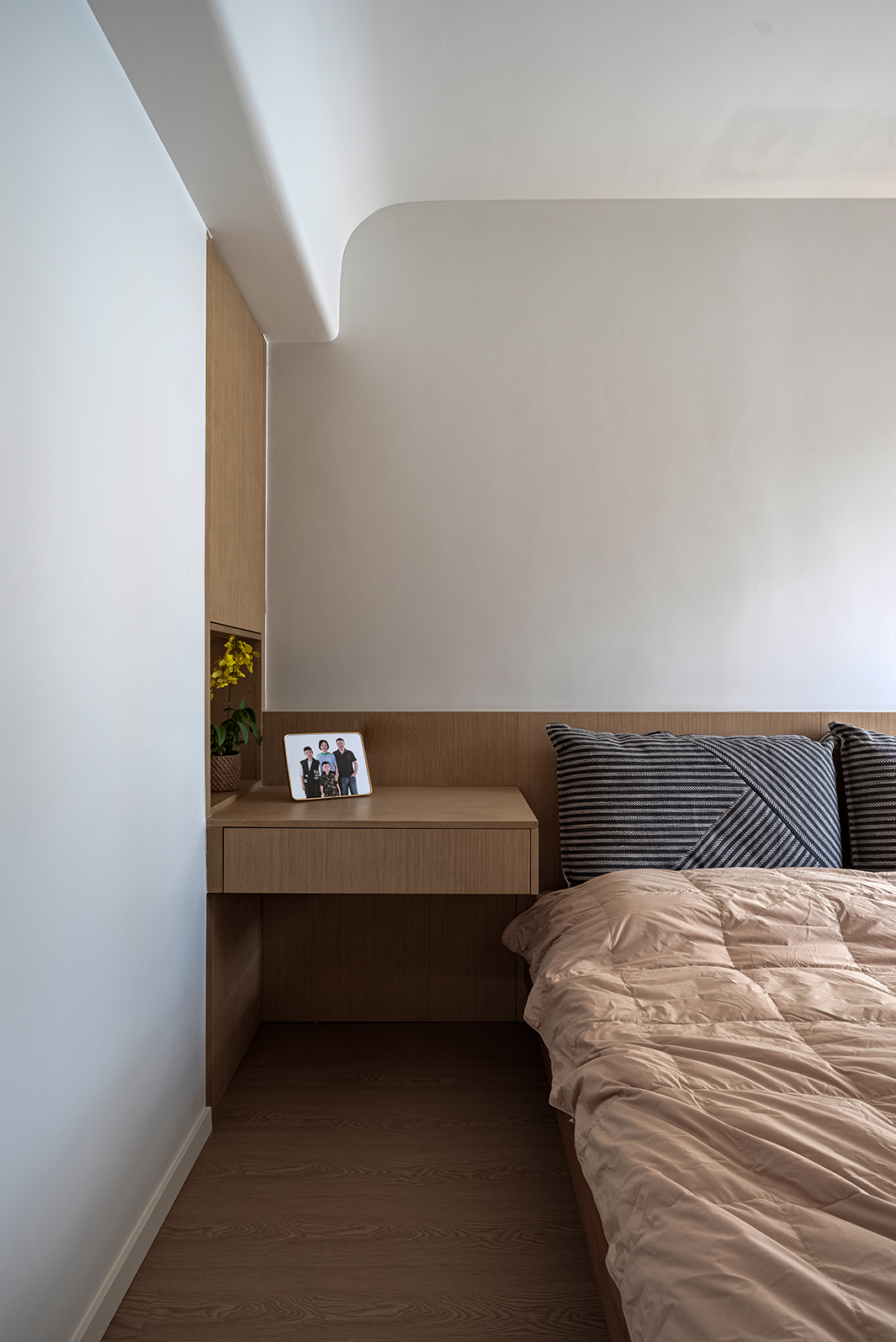 整体空间的材质看似单一,却蕴藏着无限的可能,满足强大的收纳功能,以及简约清爽的视觉效果