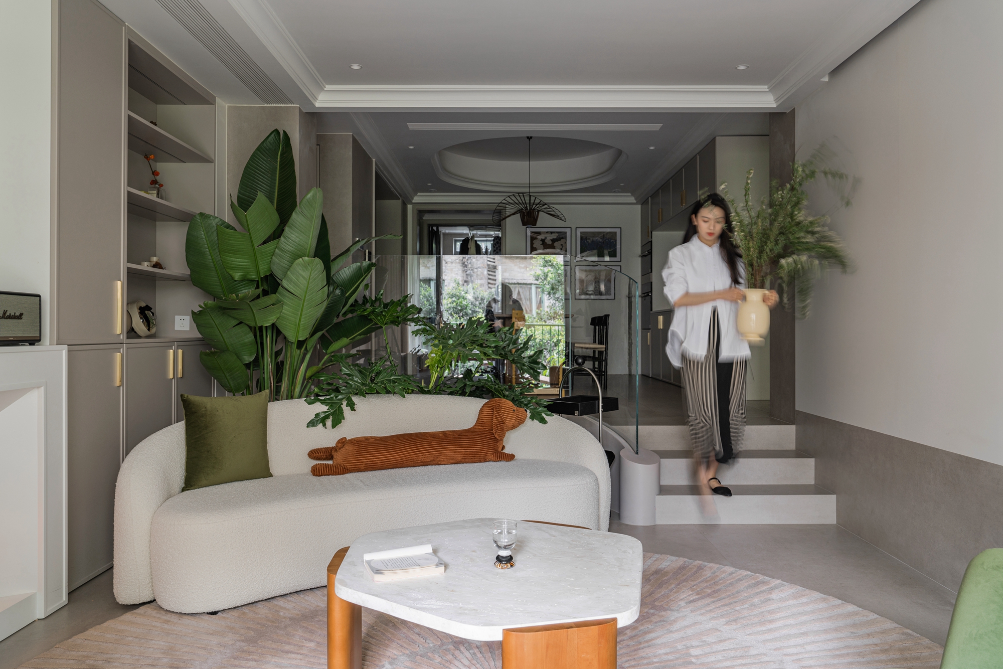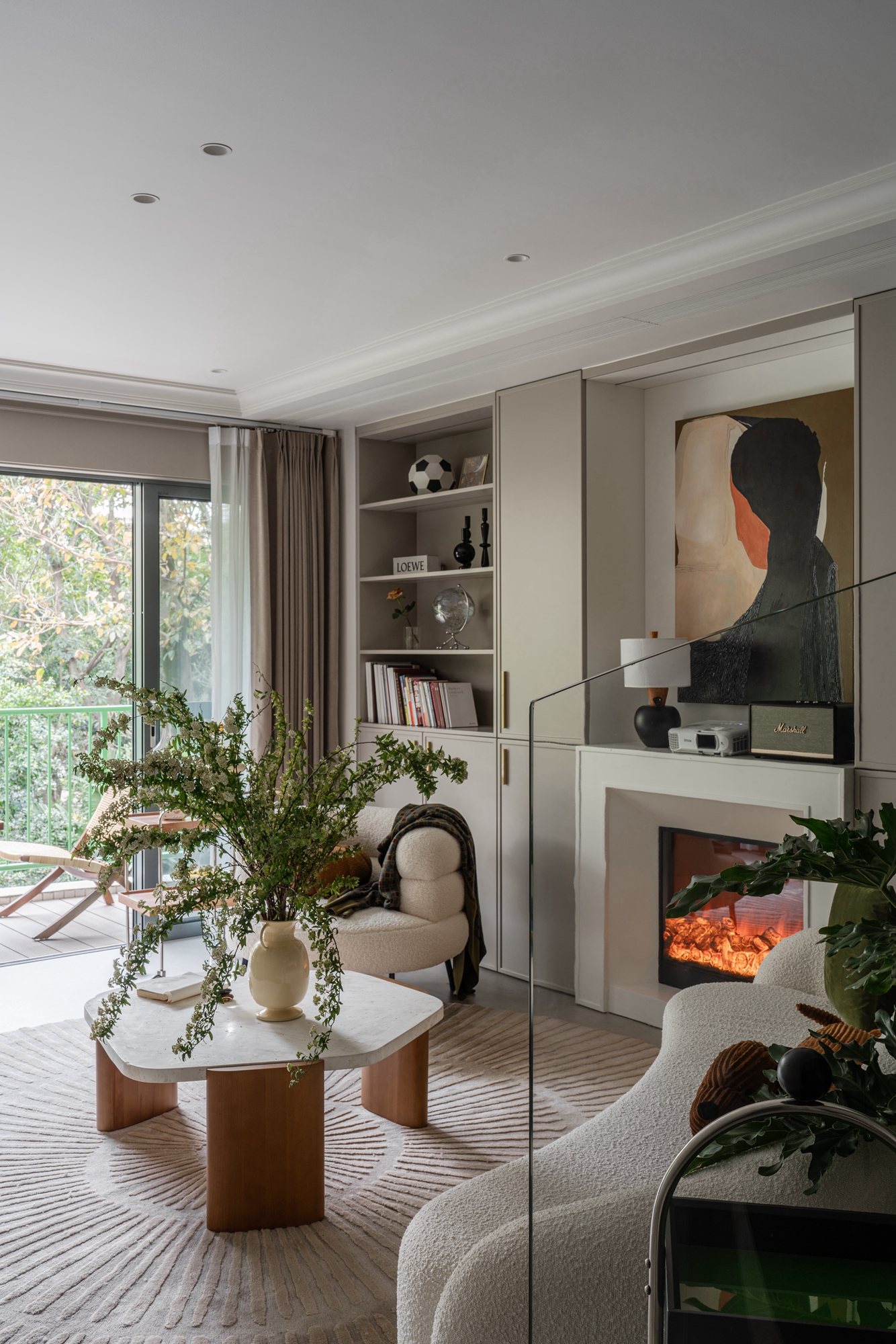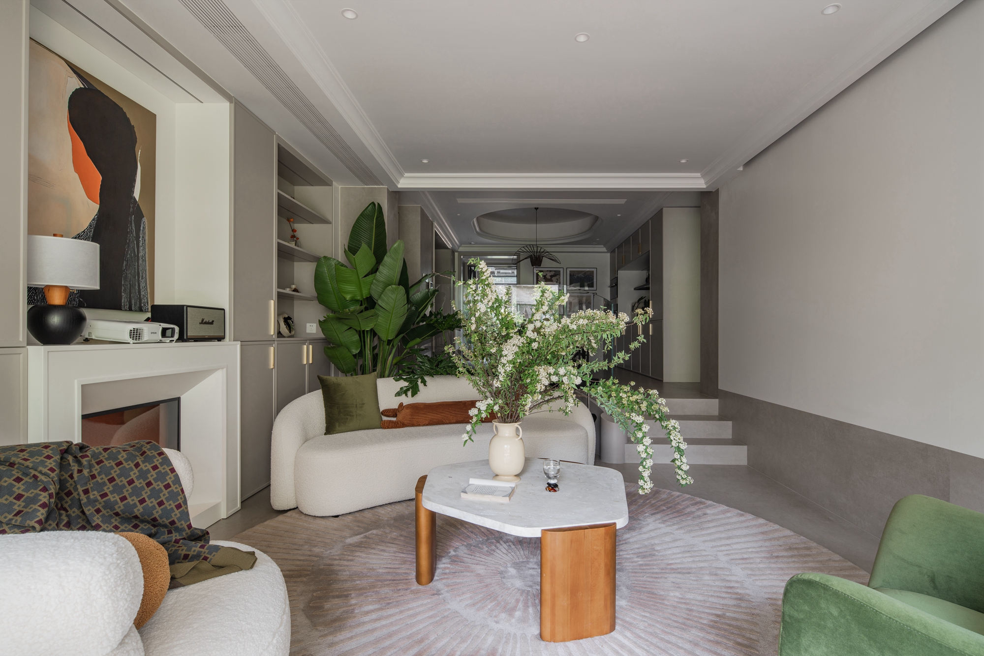 用弧形沙发以壁炉为轴进行围合,用投影代替电视改变观影方式,用绿植点缀打造氛围感客厅。