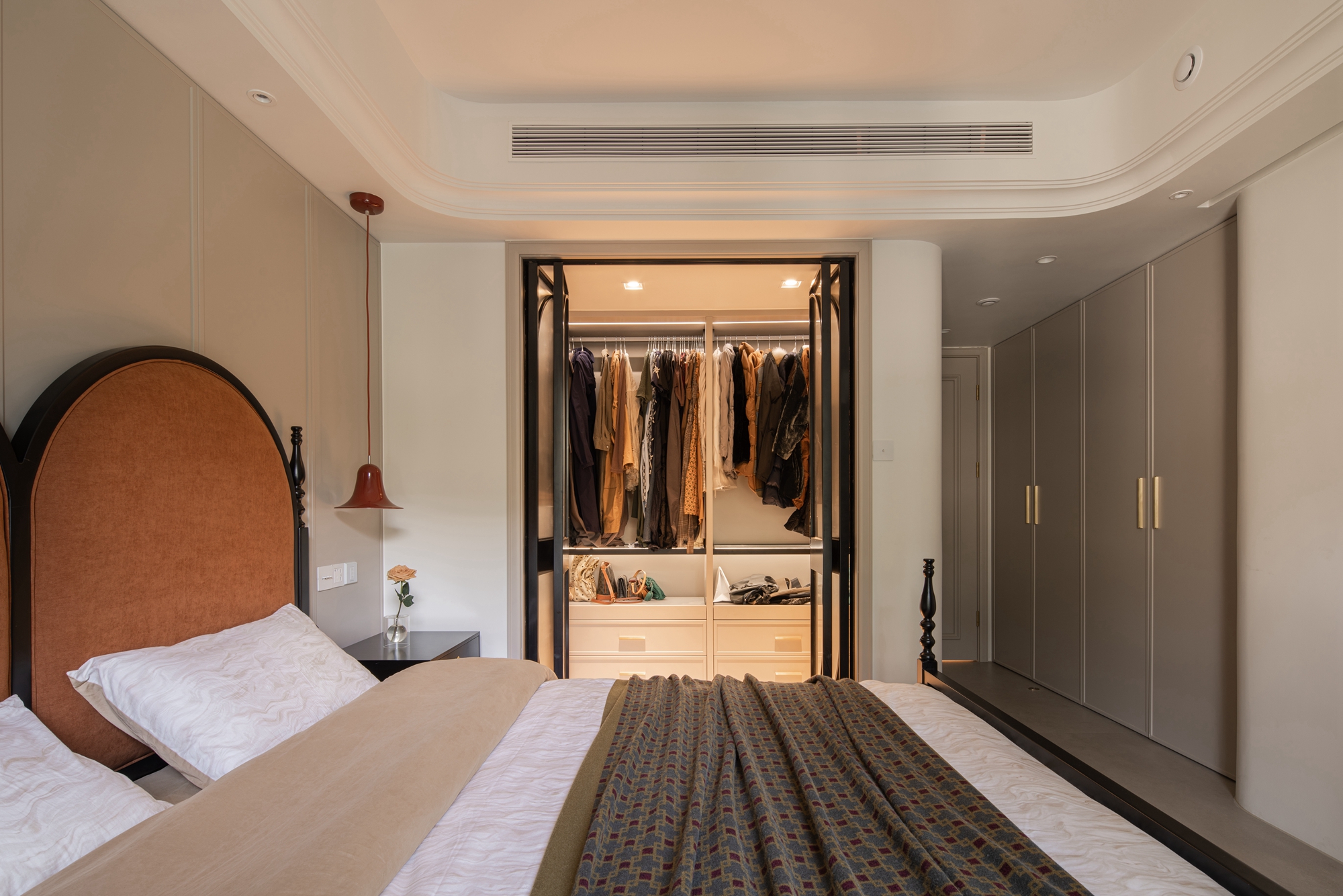 拆除了主卧和次卧之间的25公分厚的墙,让主卧衣帽间和次卧衣柜背靠背,有效节约了空间,为李老师打造了一个面积更大的步入式衣帽间。