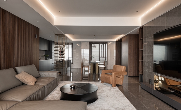 错层结构让客厅具备了包裹感,用斜面方式处理高低差,用双层吊顶形成高低差处理餐厅顶面,增加视觉高度。