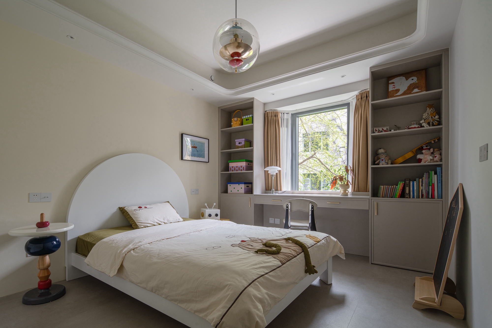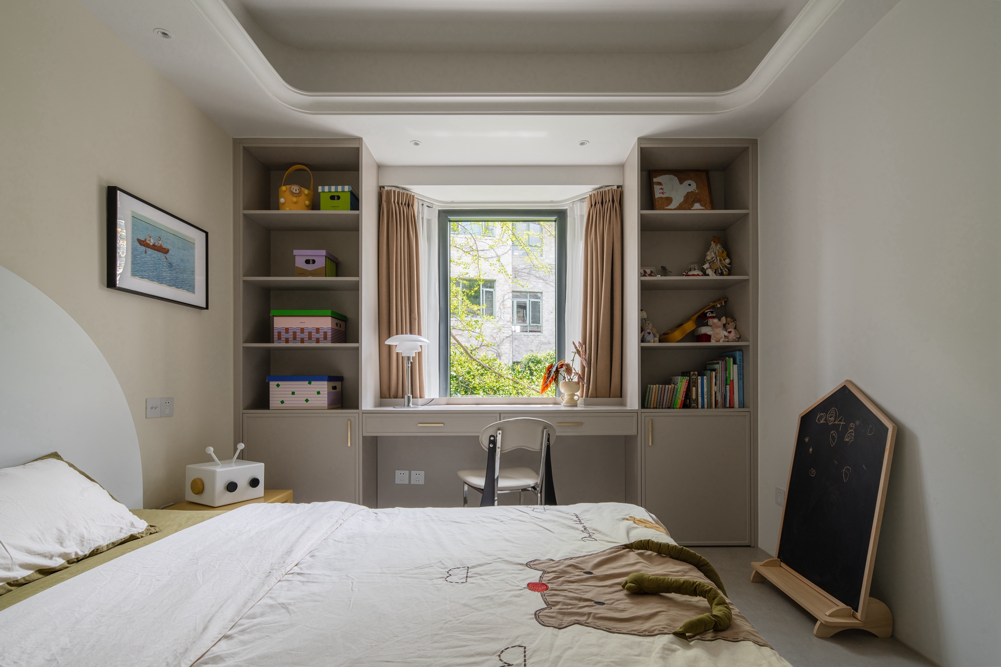 儿童房,利用飘窗位置定制书桌和书柜,扩展功能,细节上还将飘窗延长35公分,方便放脚。现在犇犇才两岁多,李老师会在这陪他看绘本。
