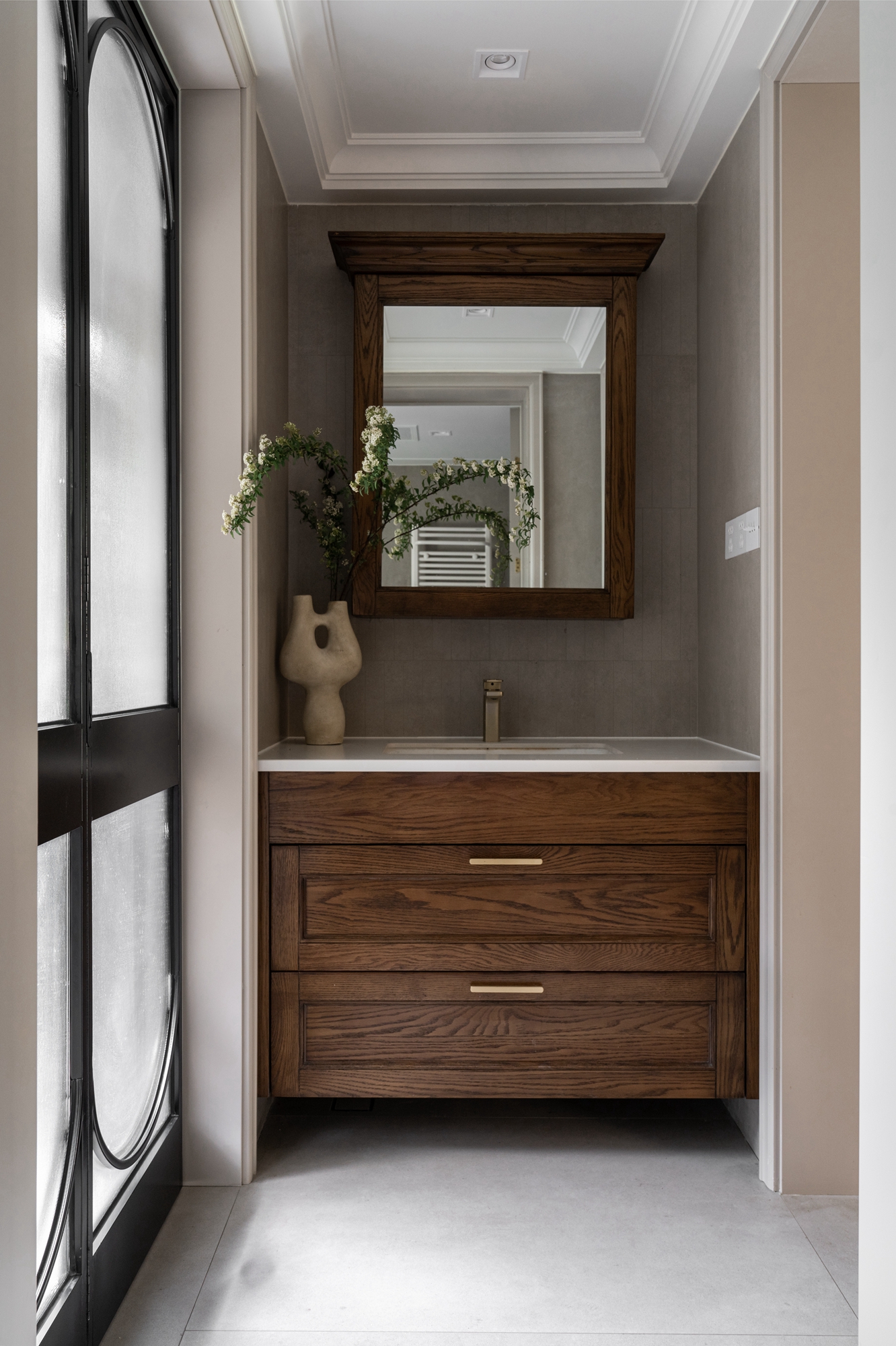 空间意境:拒绝从某一种限定的风格上去铺陈元素,而是从业主审美细节上去总结梳理并形成这个家的独特风格,三分法式,三分现代,四分自然。