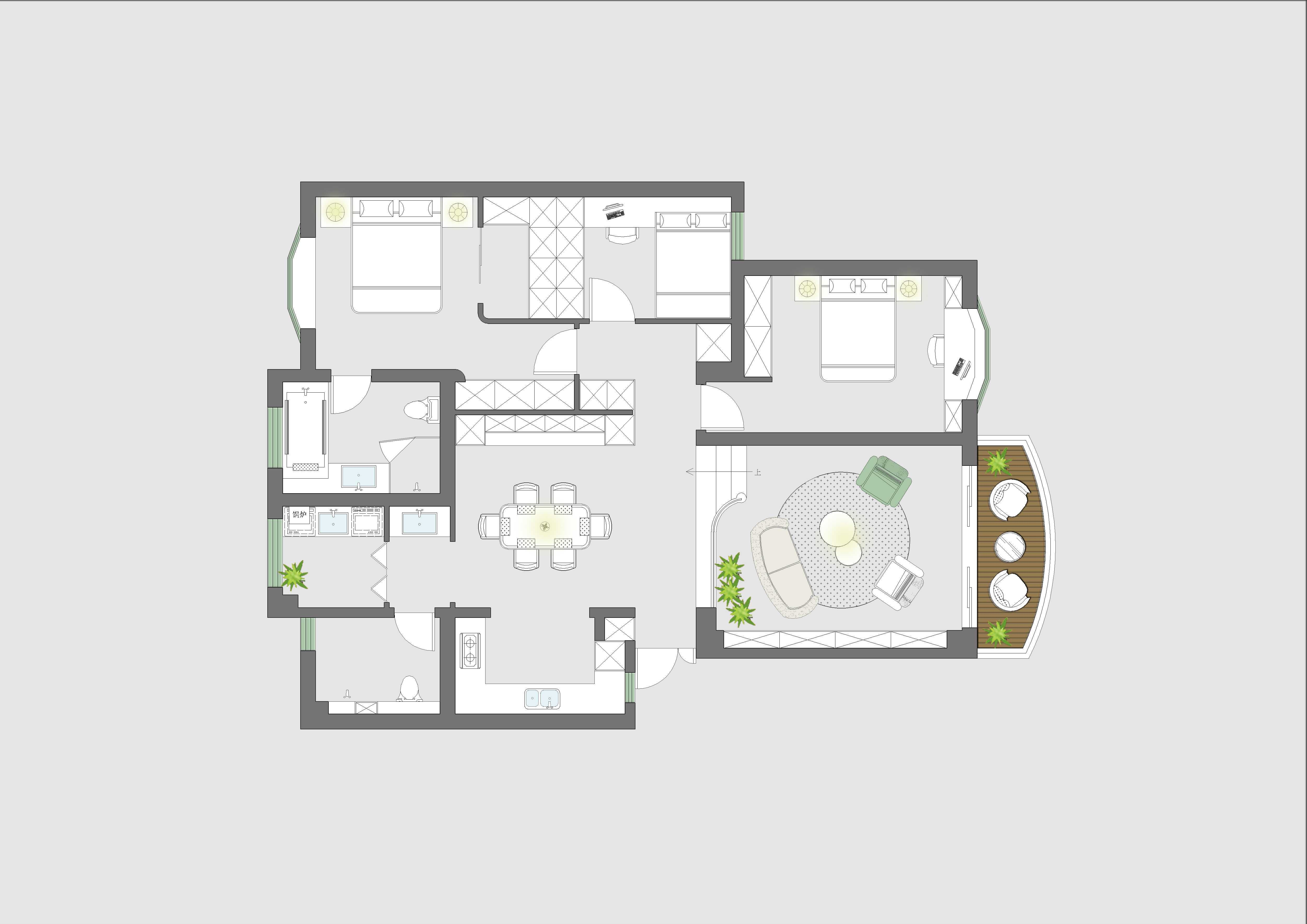 平面设计图 ①拆除入户左边的墙,定制一面鞋柜,解决日常收纳问题,并把弱电箱隐藏其中,更美观; ② 将原本次卫与过道进行整合,得到一个设备配置齐全、动线操作便捷的U型开放式厨房; ③ 将原来的厨房和生活阳台位置重新整合,得到三个功能区:生活阳台、卫生间、洗漱区; ④ 整合餐厅背后主卧的过道,得到一个完整的西厨、男主人的衣柜、一米八五的公共储物柜; ⑤ 餐厅与客厅为错层结构,将原本的直栏杆变成弧形玻璃扶手,楼梯加宽坡度变缓; ⑥ 客厅靠墙定制整排书柜,嵌入壁炉,沙发以非常规方式围坐,用巨幕投影代替电视; ⑦ 重新分配原本非常浪费的三间卧室的过道,调整进门位置,让过道有了两个公共储物柜; ⑧ 拆除主卧和次卧之间25公分厚的墙,让主卧衣帽间和次卧衣柜背靠背,有效节约空间; ⑨ 儿童房合理利用飘窗位置定制书桌和书柜,扩展儿童房功能,飘窗延长35公分方便放脚。