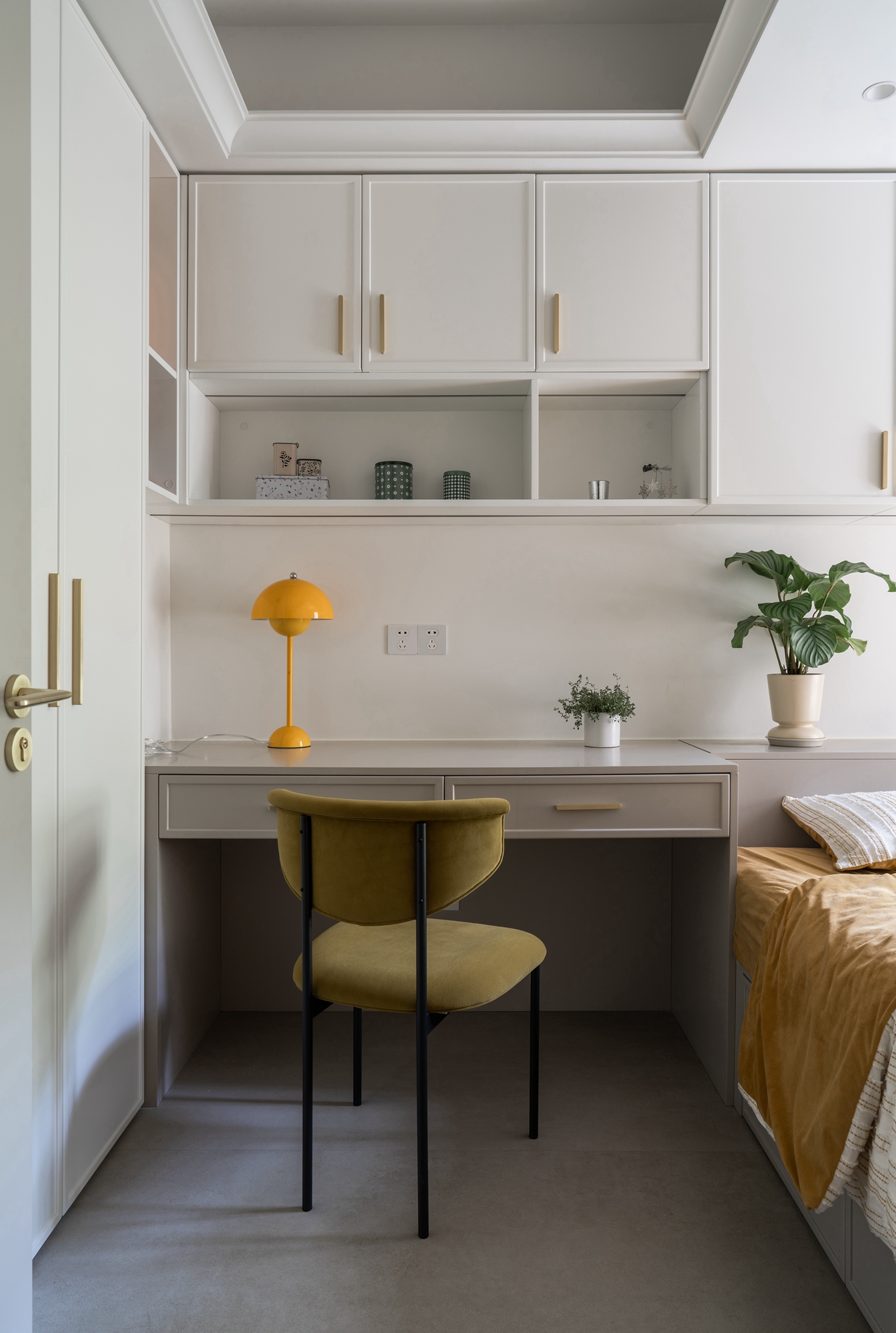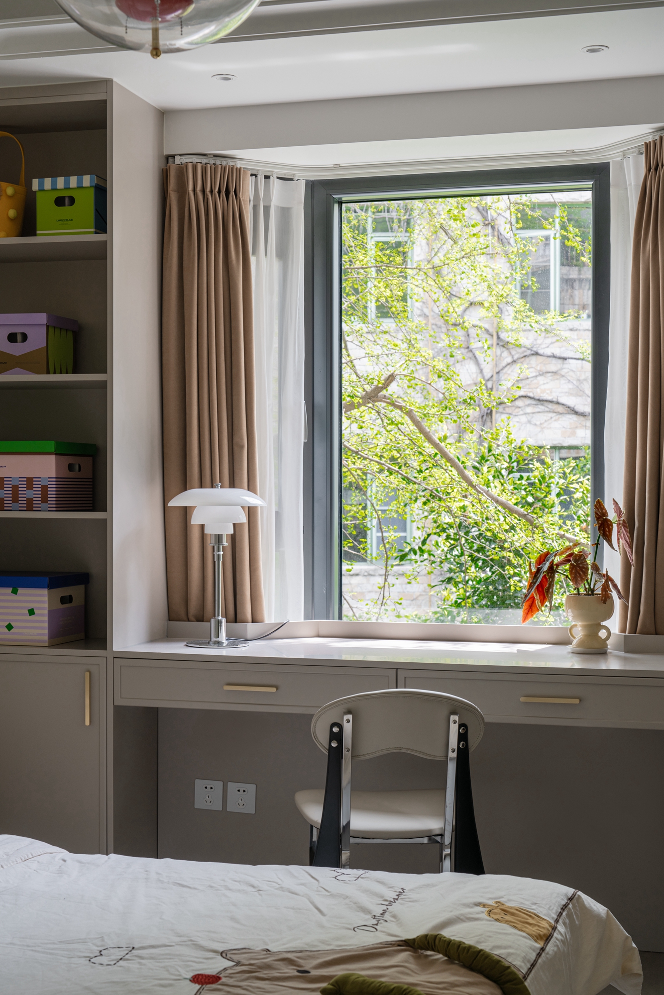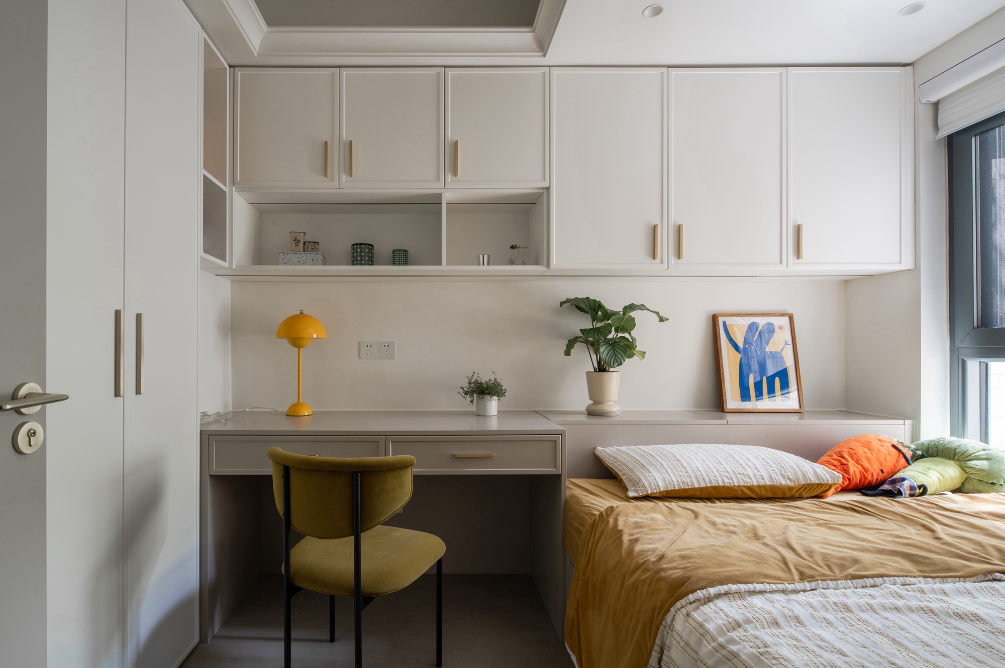 走廊正对着的是间多功能房,靠墙靠飘窗定制了一体式的床+收纳柜+书桌,可以作为客房和书房使用,李老师偶尔会在这里办公。