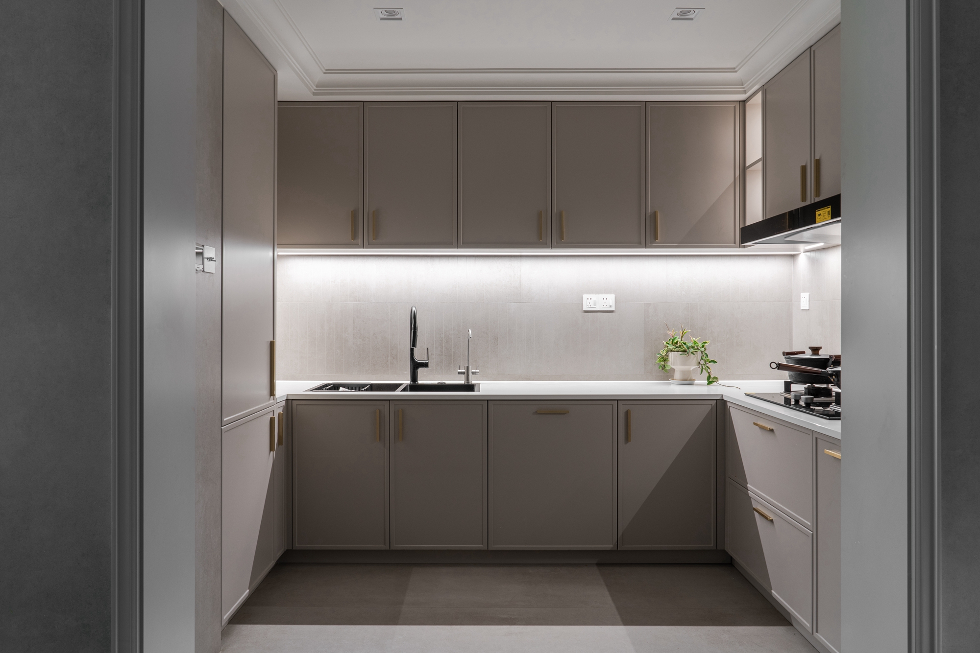 老房子的入户都不够宽阔,把左边的墙规划定制成了整面鞋柜,解决日常收纳问题,并把弱电箱隐藏其中,将原本次卫与过道进行整合,得到一个设备配置齐全、动线操作便捷的U型开放式厨房。