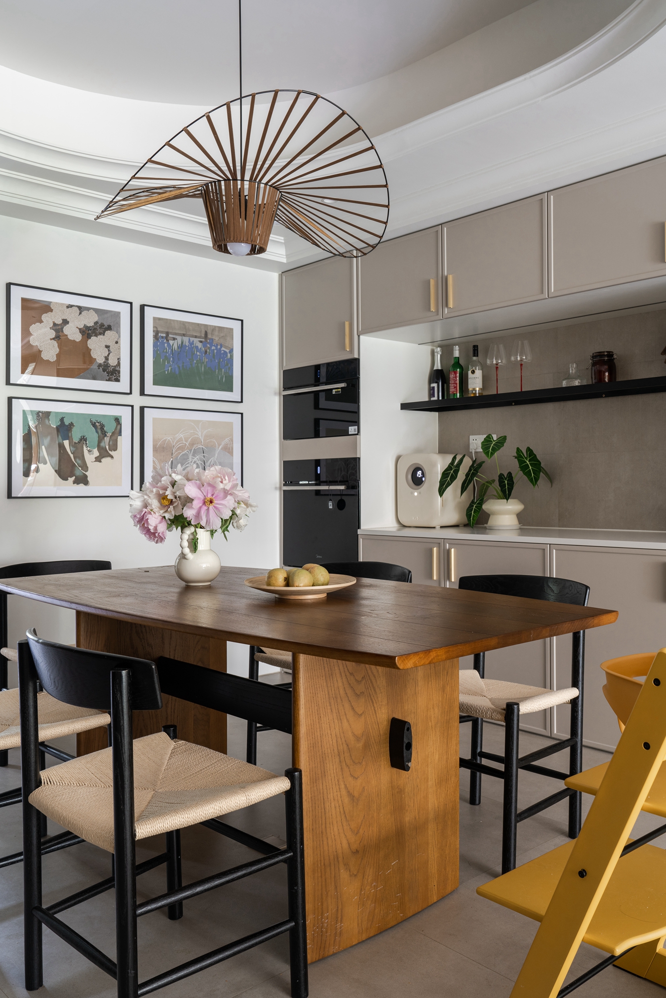 西厨不仅承载了蒸烤箱、收纳柜、茶水台,还有一台嵌入式冰箱,平常李老师的各式烘焙西点,茶水咖啡,以及犇犇的奶粉冲泡,都能在这里完成。