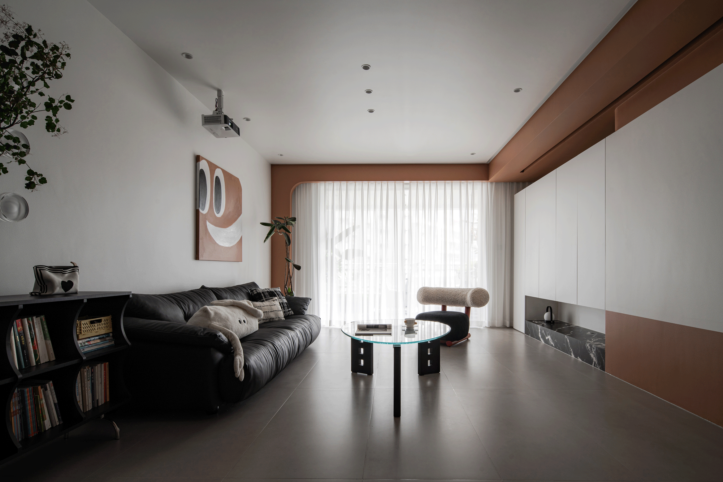 设计选材:女主李老师很喜欢自然的材质,男主赖先生是瓷砖品牌主理人,我们综合二人的喜好,并兼顾家有孩子的日常情况,选择全屋用安藤清水模800*2400大板,专业薄贴工艺呈现,墙面配合柔光白大岩板以及防水抗污的小羊皮纹涂料,带给家不动声色的力量。